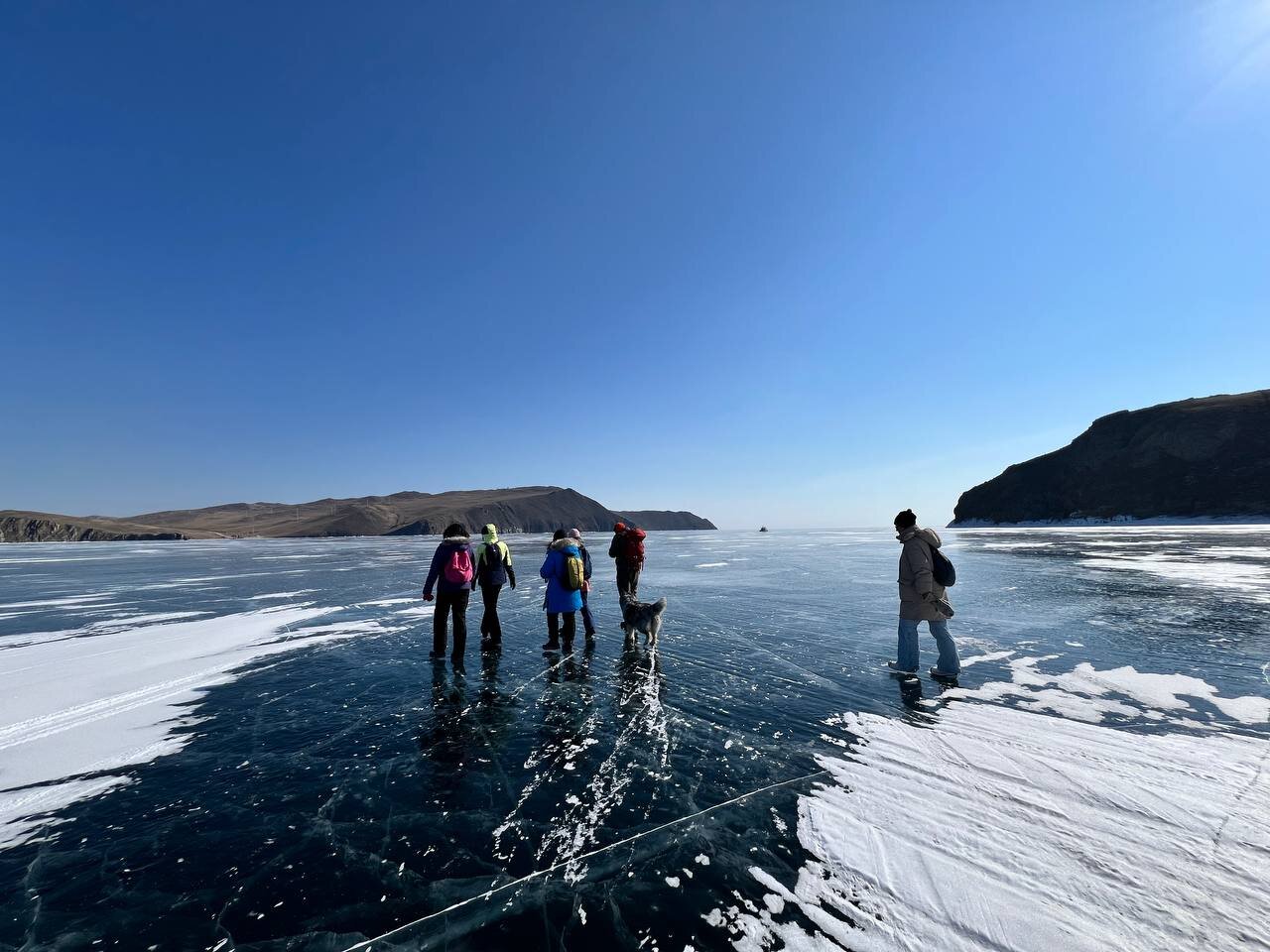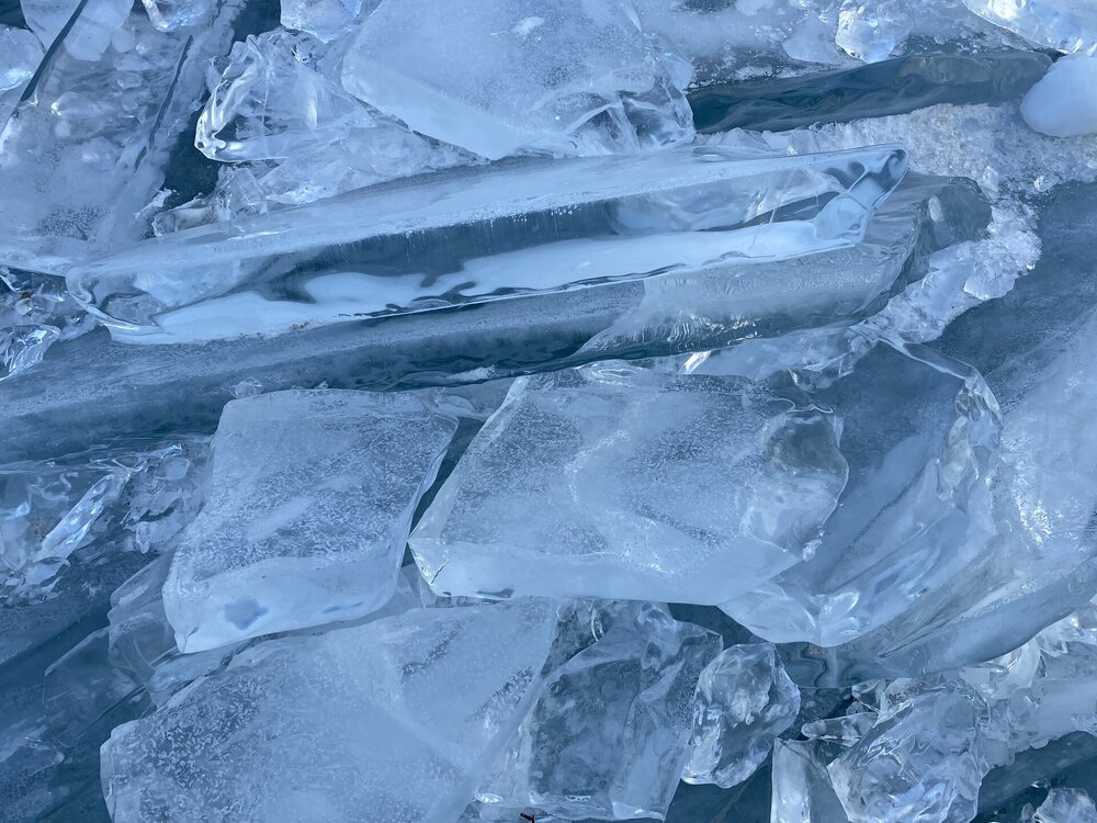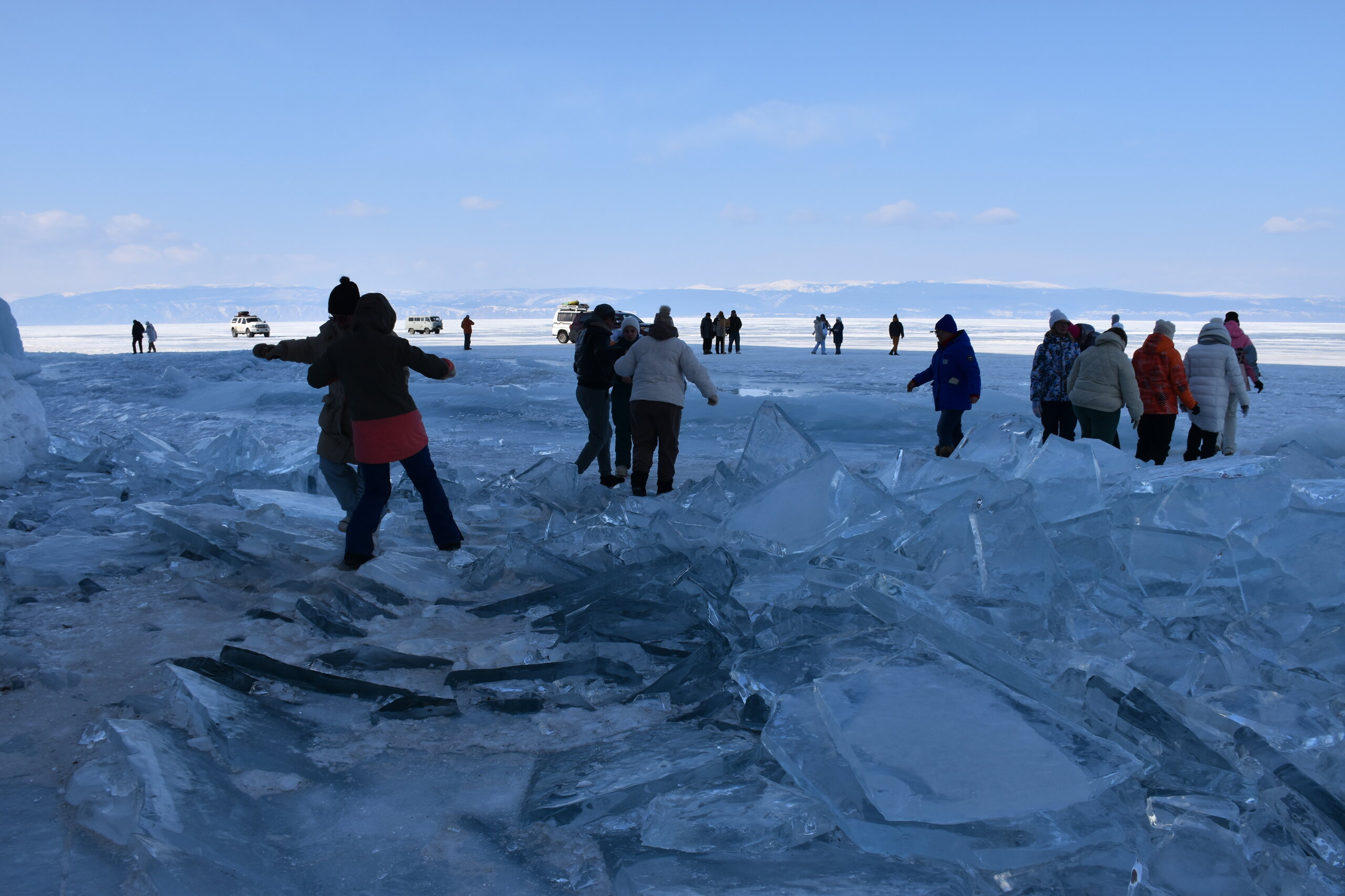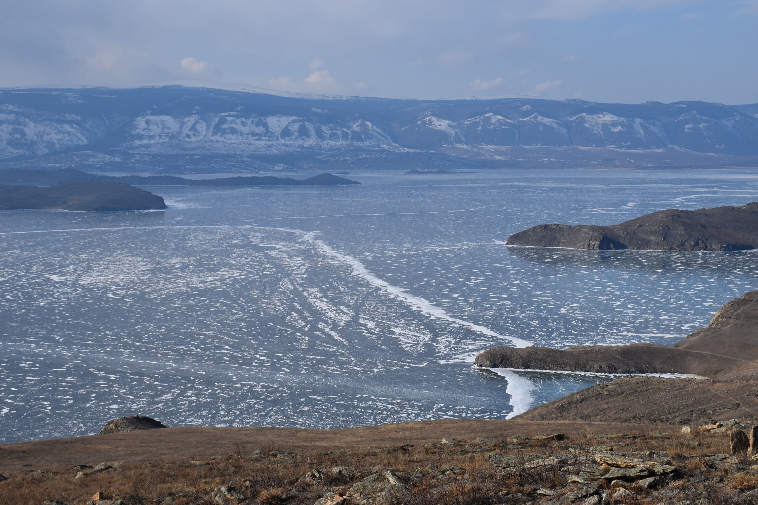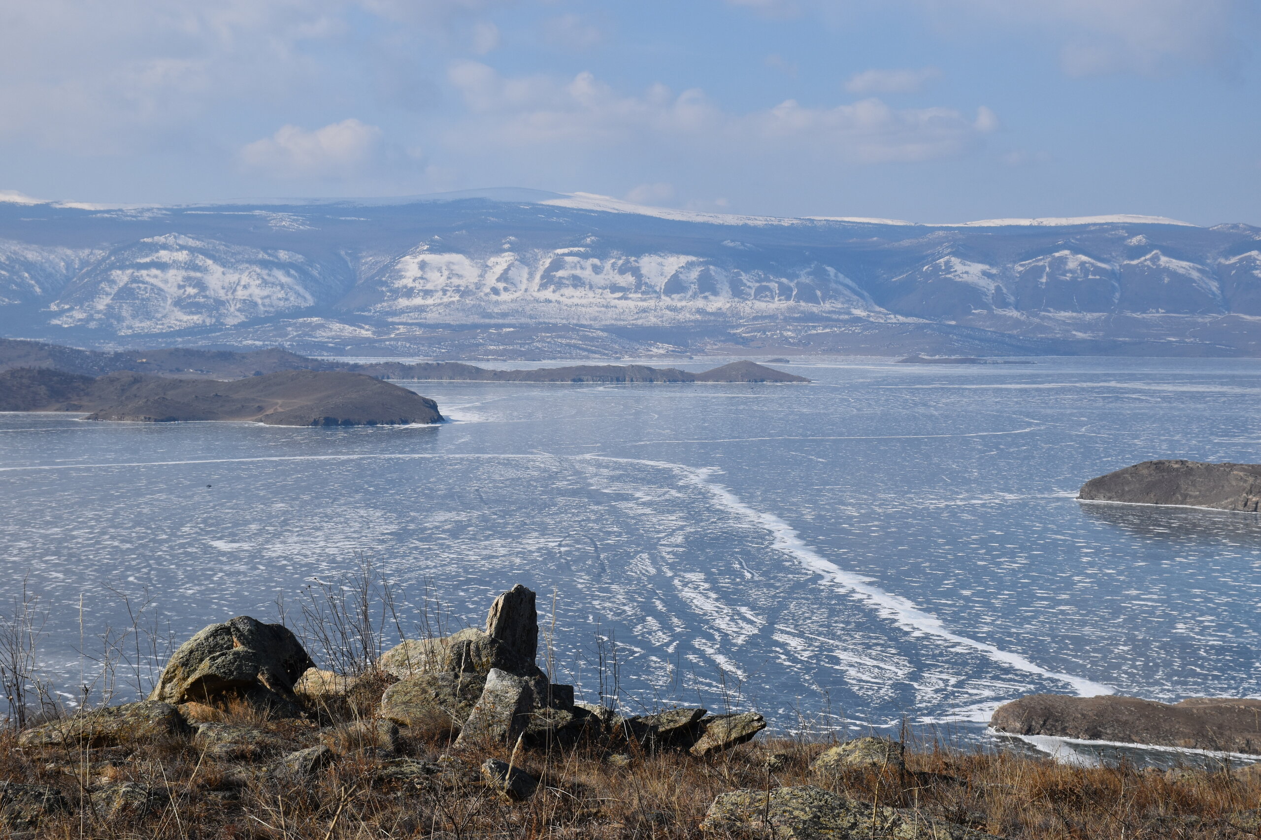 День 4. 12.03.2025 Сегодня наш день снова посвящен Льду! Вчерашний ветер Сарма сдул со льда снег. И если в первый выход было много снежных участков, то сейчас – перед нами почти идеальное зеркальное полотно! Хотя снежные участки для первого выхода – это больше плюс. Они помогали мне не скользить и побороть свой страх. В программе - поход на Мыс Уншуй острова Ольхон, Большое море. Гуляем по новым, весьма живописным окрестностям, а также поднимемся на скалу, что расположена над мысом Уншуй – с её вершины будет очередной, потрясающий вид на ледовую гладь Байкала. Активная часть треккинга: 20,1 км пешком, перепад высот 450-500 м, продолжительность похода 6-7 часов. В этом году лед образовался поздно, он тоньше и больше пропарин, поэтому в Большое море мы не выходим. Но вечером мы взяли дополнительную экскурсию на хивусе, который с легкостью вывез нас на большую глубину. Лед там отличается от Малого моря. Идем мы по проливу Ольхонские ворота. Это небольшой по ширине пролив, разделяющий материк и остров Ольхон. С одной стороны, он уходит в Малое море, с другой – в основную часть Байкала. На бурятском пролив называется Аман, что в переводе означает «рот» или «зёв». Иногда ещё можно встретить старое название – Ольхонский зунд. Длина пролива составляет 8,3 километра – это расстояние от мысов Улан и Кобылья голова до выхода в Большое море Байкала. Ширина наиболее узкого участка Ольхонских ворот – 1,2 километра. Именно на этом отрезке и находится паромная переправа на Ольхон. Средняя глубина пролива составляет 30-40 метров, а у южного входа, в окрестностях мысов Уншуй и Крест, она может достигать 100 метров. Течение здесь не такое, как на остальном Байкале. С северо-западной стороны находится Сарминское ущелье, откуда буйными порывами вырывается сильнейший одноименный ветер. Поэтому вода здесь находится в непрерывном движении, а волны порой могут достигать 5 метров высотой. В 2005 году на дне вдоль пролива Аман был проложен высоковольтный кабель, по которому на остров Ольхон поступает электричество. Ольхонские ворота – необычайно красивое и опасное место. Берега здесь круты и обрывисты, а вокруг них постоянно гоняет ветер и бьются волны. Зимой прибрежные скалы покрываются льдом и превращаются действительно нечто, похожее на сказочные ворота. Не удивительно, что туристы из года в год делают на Ольхонских воротах памятные, красочные фото. На побережье пролива Аман много узких заливов и небольших бухточек. Некоторые из бухт покрупнее – длиной 3-4 километра, но большинство все же совсем маленькие. На материковой части стоит посетить такие бухты, как: Тутай; Куркутская; Базарная. Со стороны Ольхона наибольший интерес представляют заливы Хул и Загли. Они закрыты от ветра и прекрасно подходит для стоянки судов в плохую погоду. Сегодня я выискиваю на льду необычные фигуры.