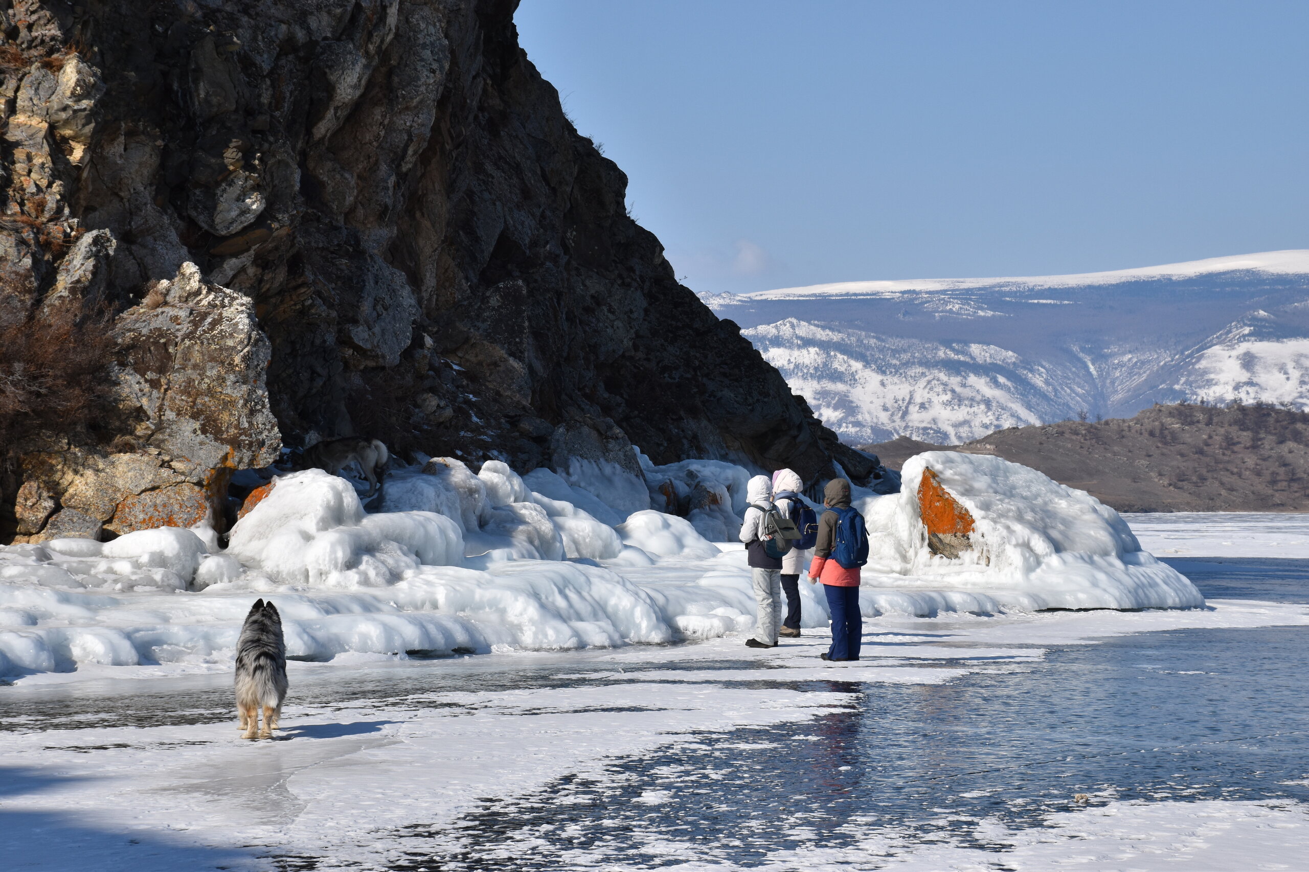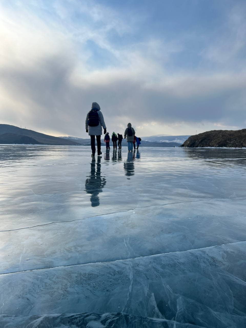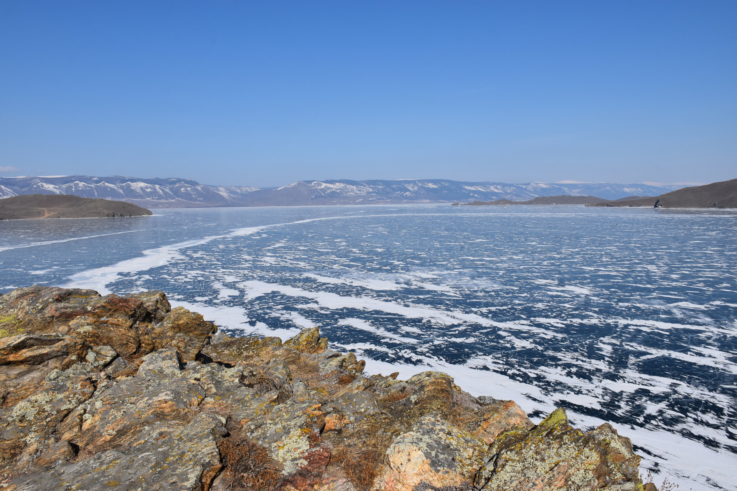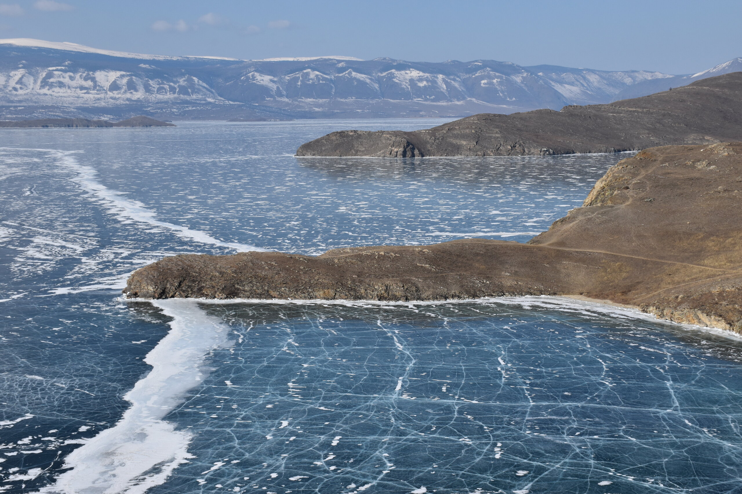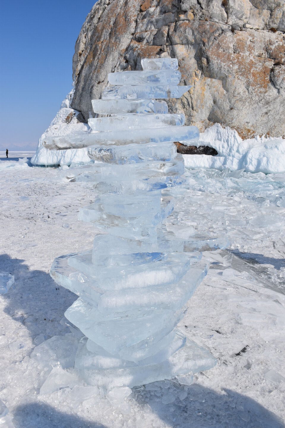 День 4. 12.03.2025 Сегодня наш день снова посвящен Льду! Вчерашний ветер Сарма сдул со льда снег. И если в первый выход было много снежных участков, то сейчас – перед нами почти идеальное зеркальное полотно! Хотя снежные участки для первого выхода – это больше плюс. Они помогали мне не скользить и побороть свой страх. В программе - поход на Мыс Уншуй острова Ольхон, Большое море. Гуляем по новым, весьма живописным окрестностям, а также поднимемся на скалу, что расположена над мысом Уншуй – с её вершины будет очередной, потрясающий вид на ледовую гладь Байкала. Активная часть треккинга: 20,1 км пешком, перепад высот 450-500 м, продолжительность похода 6-7 часов. В этом году лед образовался поздно, он тоньше и больше пропарин, поэтому в Большое море мы не выходим. Но вечером мы взяли дополнительную экскурсию на хивусе, который с легкостью вывез нас на большую глубину. Лед там отличается от Малого моря. Идем мы по проливу Ольхонские ворота. Это небольшой по ширине пролив, разделяющий материк и остров Ольхон. С одной стороны, он уходит в Малое море, с другой – в основную часть Байкала. На бурятском пролив называется Аман, что в переводе означает «рот» или «зёв». Иногда ещё можно встретить старое название – Ольхонский зунд. Длина пролива составляет 8,3 километра – это расстояние от мысов Улан и Кобылья голова до выхода в Большое море Байкала. Ширина наиболее узкого участка Ольхонских ворот – 1,2 километра. Именно на этом отрезке и находится паромная переправа на Ольхон. Средняя глубина пролива составляет 30-40 метров, а у южного входа, в окрестностях мысов Уншуй и Крест, она может достигать 100 метров. Течение здесь не такое, как на остальном Байкале. С северо-западной стороны находится Сарминское ущелье, откуда буйными порывами вырывается сильнейший одноименный ветер. Поэтому вода здесь находится в непрерывном движении, а волны порой могут достигать 5 метров высотой. В 2005 году на дне вдоль пролива Аман был проложен высоковольтный кабель, по которому на остров Ольхон поступает электричество. Ольхонские ворота – необычайно красивое и опасное место. Берега здесь круты и обрывисты, а вокруг них постоянно гоняет ветер и бьются волны. Зимой прибрежные скалы покрываются льдом и превращаются действительно нечто, похожее на сказочные ворота. Не удивительно, что туристы из года в год делают на Ольхонских воротах памятные, красочные фото. На побережье пролива Аман много узких заливов и небольших бухточек. Некоторые из бухт покрупнее – длиной 3-4 километра, но большинство все же совсем маленькие. На материковой части стоит посетить такие бухты, как: Тутай; Куркутская; Базарная. Со стороны Ольхона наибольший интерес представляют заливы Хул и Загли. Они закрыты от ветра и прекрасно подходит для стоянки судов в плохую погоду. Сегодня я выискиваю на льду необычные фигуры.