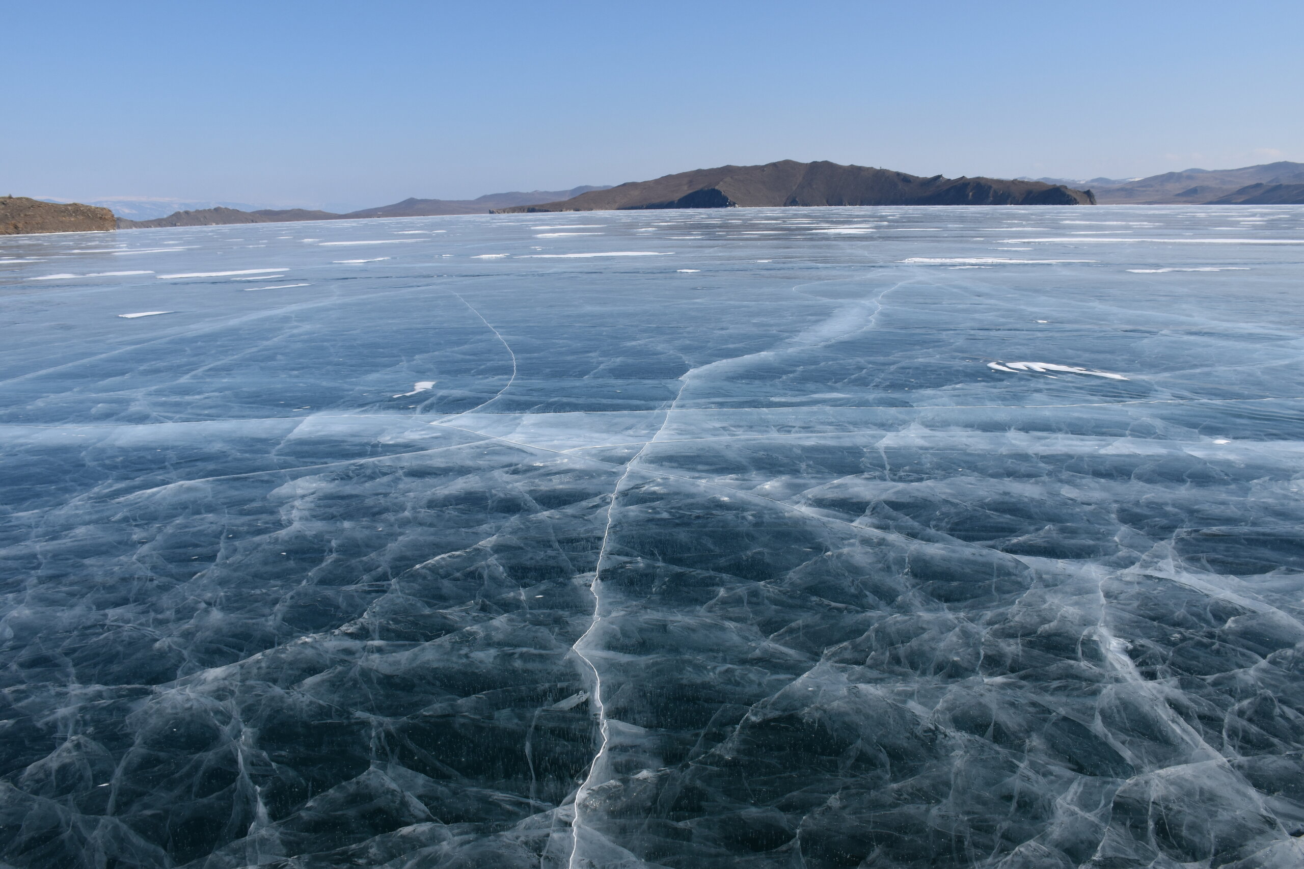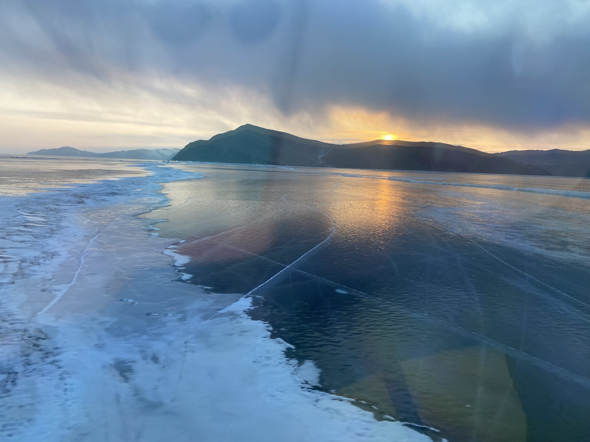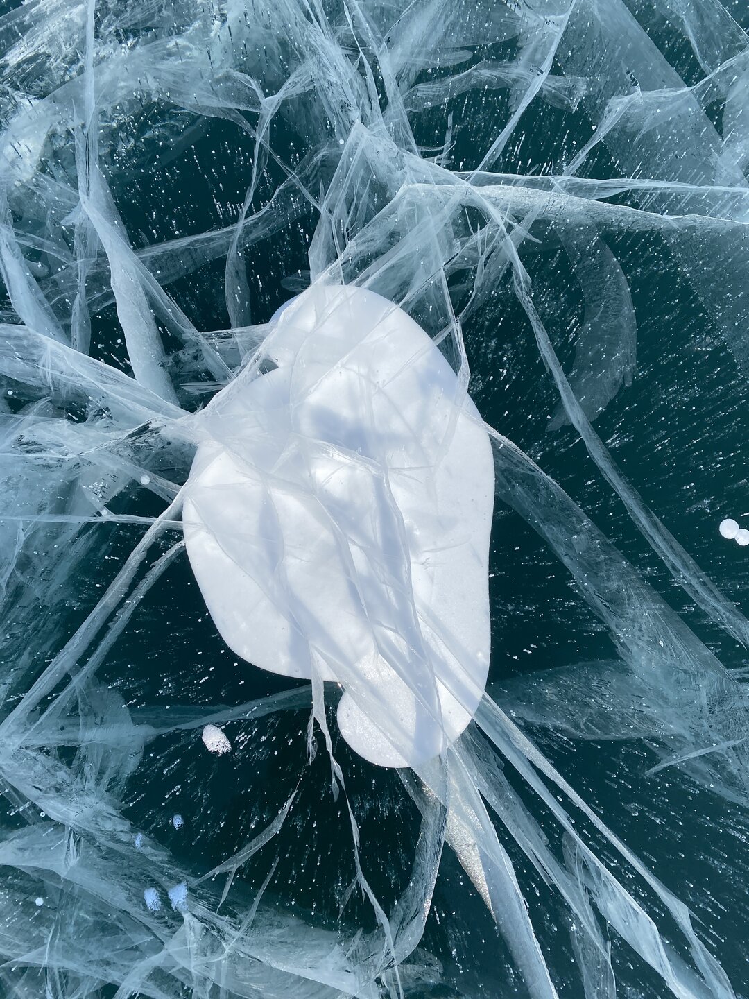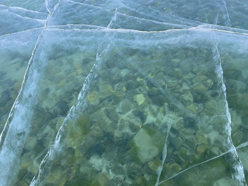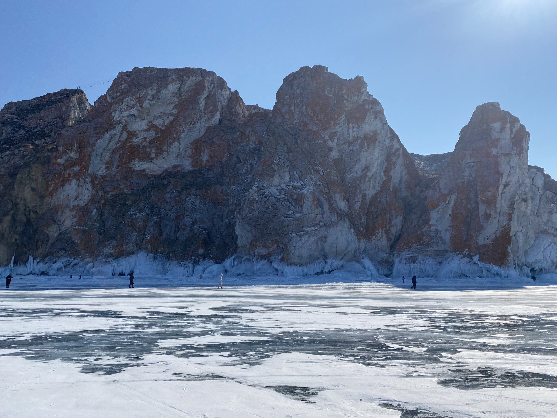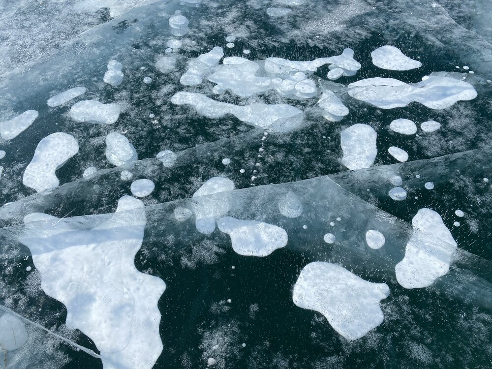 День 4. 12.03.2025 Сегодня наш день снова посвящен Льду! Вчерашний ветер Сарма сдул со льда снег. И если в первый выход было много снежных участков, то сейчас – перед нами почти идеальное зеркальное полотно! Хотя снежные участки для первого выхода – это больше плюс. Они помогали мне не скользить и побороть свой страх. В программе - поход на Мыс Уншуй острова Ольхон, Большое море. Гуляем по новым, весьма живописным окрестностям, а также поднимемся на скалу, что расположена над мысом Уншуй – с её вершины будет очередной, потрясающий вид на ледовую гладь Байкала. Активная часть треккинга: 20,1 км пешком, перепад высот 450-500 м, продолжительность похода 6-7 часов. В этом году лед образовался поздно, он тоньше и больше пропарин, поэтому в Большое море мы не выходим. Но вечером мы взяли дополнительную экскурсию на хивусе, который с легкостью вывез нас на большую глубину. Лед там отличается от Малого моря. Идем мы по проливу Ольхонские ворота. Это небольшой по ширине пролив, разделяющий материк и остров Ольхон. С одной стороны, он уходит в Малое море, с другой – в основную часть Байкала. На бурятском пролив называется Аман, что в переводе означает «рот» или «зёв». Иногда ещё можно встретить старое название – Ольхонский зунд. Длина пролива составляет 8,3 километра – это расстояние от мысов Улан и Кобылья голова до выхода в Большое море Байкала. Ширина наиболее узкого участка Ольхонских ворот – 1,2 километра. Именно на этом отрезке и находится паромная переправа на Ольхон. Средняя глубина пролива составляет 30-40 метров, а у южного входа, в окрестностях мысов Уншуй и Крест, она может достигать 100 метров. Течение здесь не такое, как на остальном Байкале. С северо-западной стороны находится Сарминское ущелье, откуда буйными порывами вырывается сильнейший одноименный ветер. Поэтому вода здесь находится в непрерывном движении, а волны порой могут достигать 5 метров высотой. В 2005 году на дне вдоль пролива Аман был проложен высоковольтный кабель, по которому на остров Ольхон поступает электричество. Ольхонские ворота – необычайно красивое и опасное место. Берега здесь круты и обрывисты, а вокруг них постоянно гоняет ветер и бьются волны. Зимой прибрежные скалы покрываются льдом и превращаются действительно нечто, похожее на сказочные ворота. Не удивительно, что туристы из года в год делают на Ольхонских воротах памятные, красочные фото. На побережье пролива Аман много узких заливов и небольших бухточек. Некоторые из бухт покрупнее – длиной 3-4 километра, но большинство все же совсем маленькие. На материковой части стоит посетить такие бухты, как: Тутай; Куркутская; Базарная. Со стороны Ольхона наибольший интерес представляют заливы Хул и Загли. Они закрыты от ветра и прекрасно подходит для стоянки судов в плохую погоду. Сегодня я выискиваю на льду необычные фигуры.