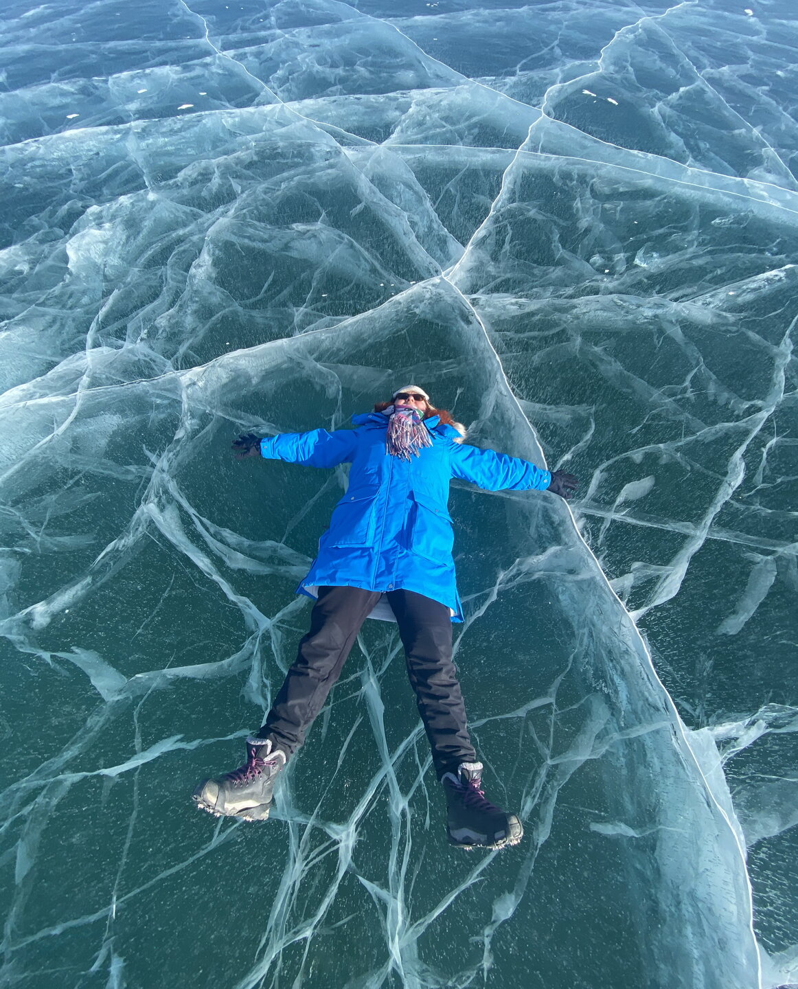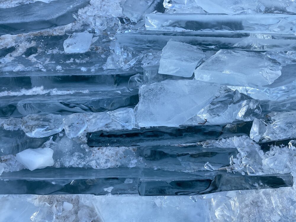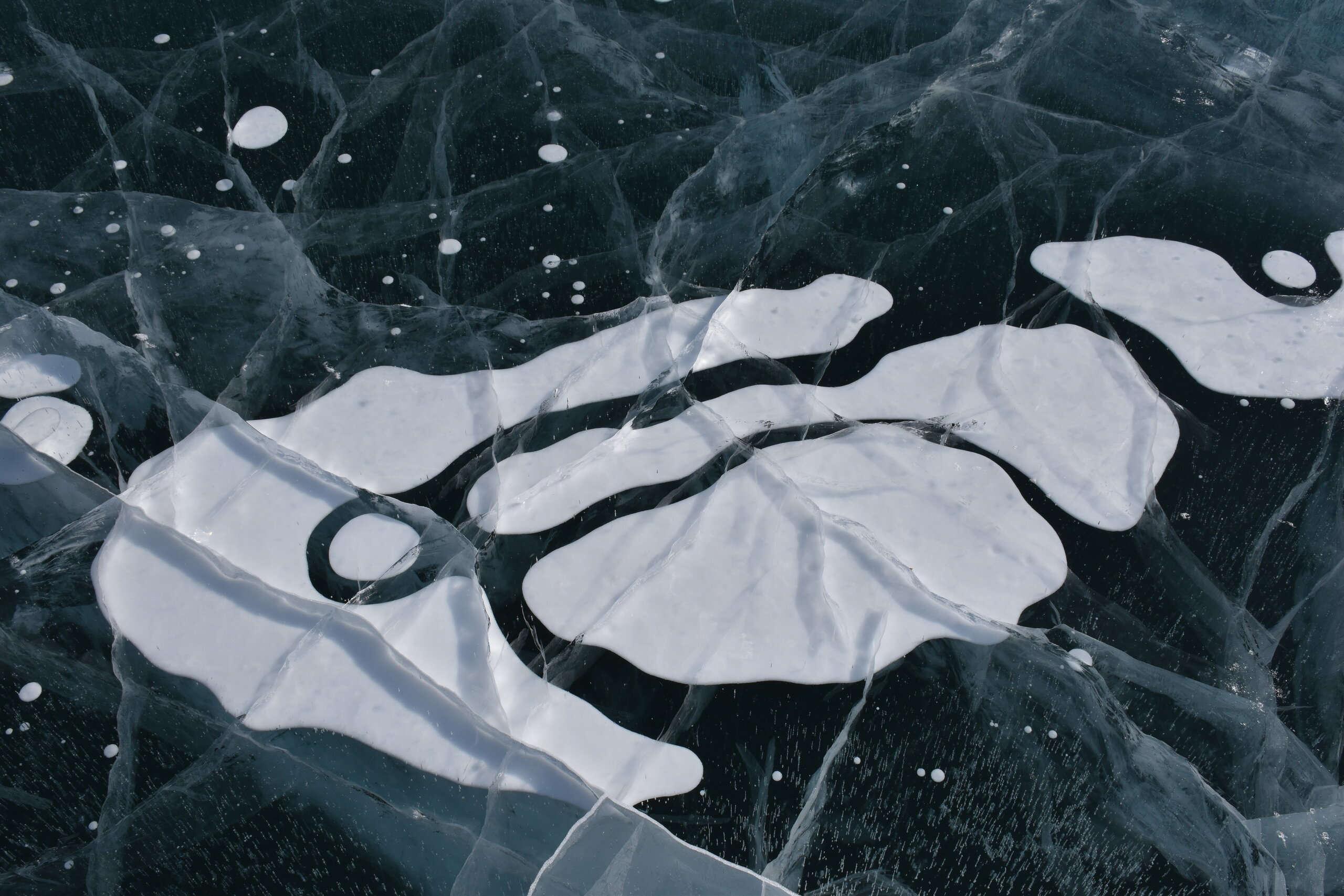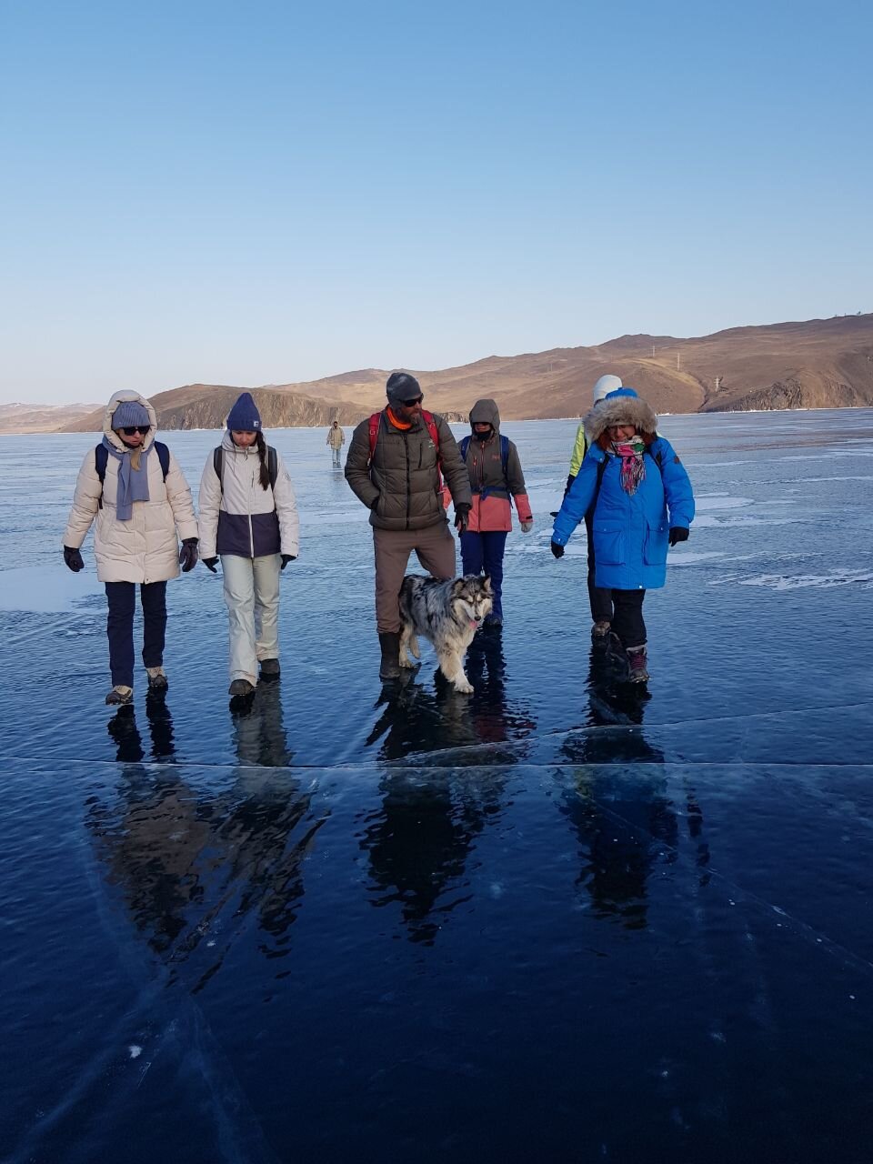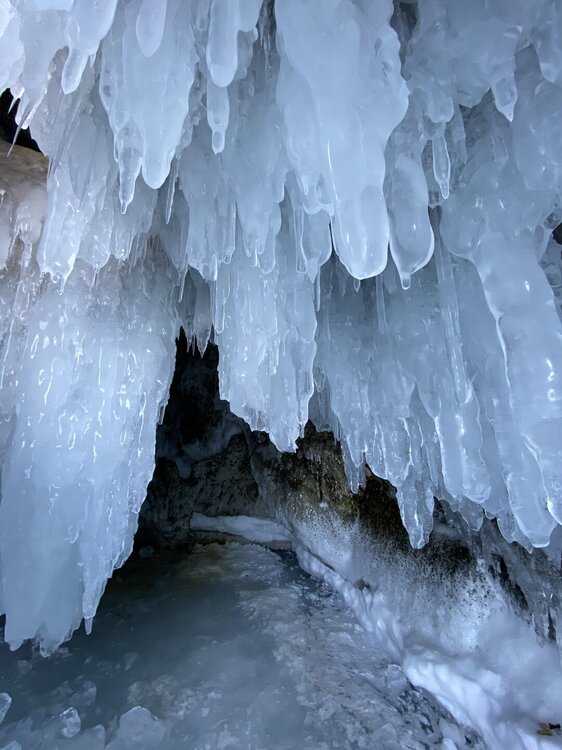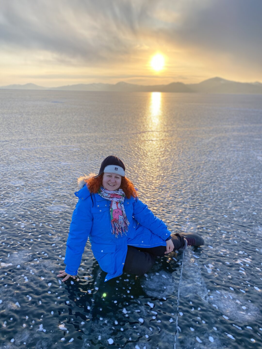 День 4. 12.03.2025 Сегодня наш день снова посвящен Льду! Вчерашний ветер Сарма сдул со льда снег. И если в первый выход было много снежных участков, то сейчас – перед нами почти идеальное зеркальное полотно! Хотя снежные участки для первого выхода – это больше плюс. Они помогали мне не скользить и побороть свой страх. В программе - поход на Мыс Уншуй острова Ольхон, Большое море. Гуляем по новым, весьма живописным окрестностям, а также поднимемся на скалу, что расположена над мысом Уншуй – с её вершины будет очередной, потрясающий вид на ледовую гладь Байкала. Активная часть треккинга: 20,1 км пешком, перепад высот 450-500 м, продолжительность похода 6-7 часов. В этом году лед образовался поздно, он тоньше и больше пропарин, поэтому в Большое море мы не выходим. Но вечером мы взяли дополнительную экскурсию на хивусе, который с легкостью вывез нас на большую глубину. Лед там отличается от Малого моря. Идем мы по проливу Ольхонские ворота. Это небольшой по ширине пролив, разделяющий материк и остров Ольхон. С одной стороны, он уходит в Малое море, с другой – в основную часть Байкала. На бурятском пролив называется Аман, что в переводе означает «рот» или «зёв». Иногда ещё можно встретить старое название – Ольхонский зунд. Длина пролива составляет 8,3 километра – это расстояние от мысов Улан и Кобылья голова до выхода в Большое море Байкала. Ширина наиболее узкого участка Ольхонских ворот – 1,2 километра. Именно на этом отрезке и находится паромная переправа на Ольхон. Средняя глубина пролива составляет 30-40 метров, а у южного входа, в окрестностях мысов Уншуй и Крест, она может достигать 100 метров. Течение здесь не такое, как на остальном Байкале. С северо-западной стороны находится Сарминское ущелье, откуда буйными порывами вырывается сильнейший одноименный ветер. Поэтому вода здесь находится в непрерывном движении, а волны порой могут достигать 5 метров высотой. В 2005 году на дне вдоль пролива Аман был проложен высоковольтный кабель, по которому на остров Ольхон поступает электричество. Ольхонские ворота – необычайно красивое и опасное место. Берега здесь круты и обрывисты, а вокруг них постоянно гоняет ветер и бьются волны. Зимой прибрежные скалы покрываются льдом и превращаются действительно нечто, похожее на сказочные ворота. Не удивительно, что туристы из года в год делают на Ольхонских воротах памятные, красочные фото. На побережье пролива Аман много узких заливов и небольших бухточек. Некоторые из бухт покрупнее – длиной 3-4 километра, но большинство все же совсем маленькие. На материковой части стоит посетить такие бухты, как: Тутай; Куркутская; Базарная. Со стороны Ольхона наибольший интерес представляют заливы Хул и Загли. Они закрыты от ветра и прекрасно подходит для стоянки судов в плохую погоду. Сегодня я выискиваю на льду необычные фигуры.