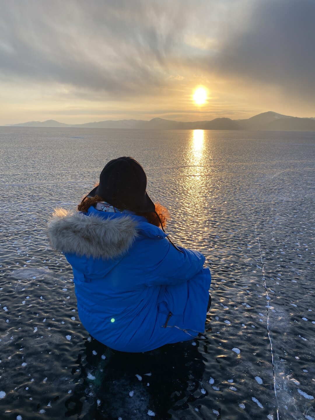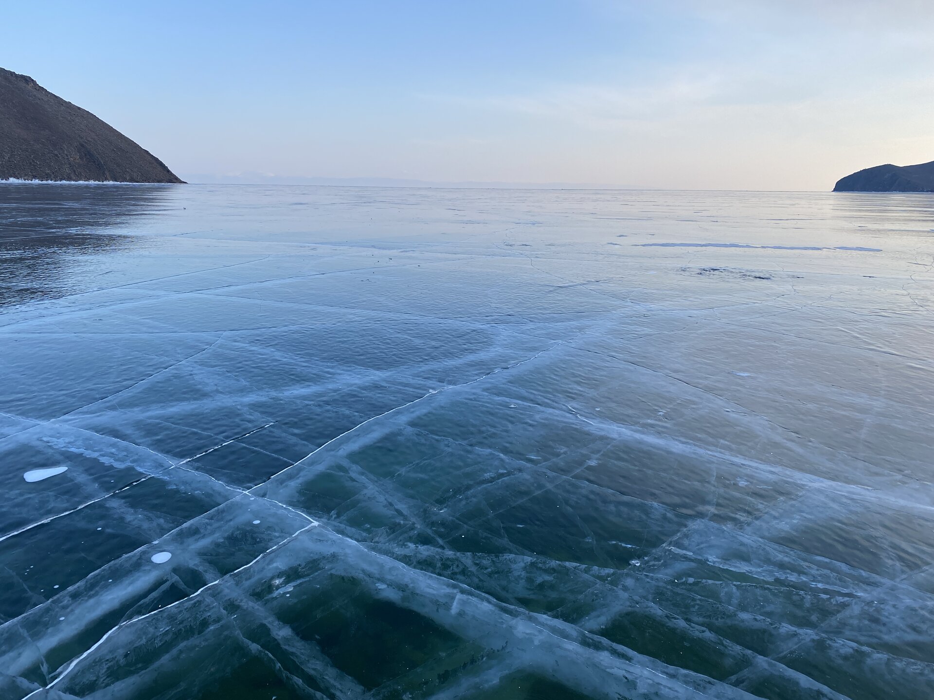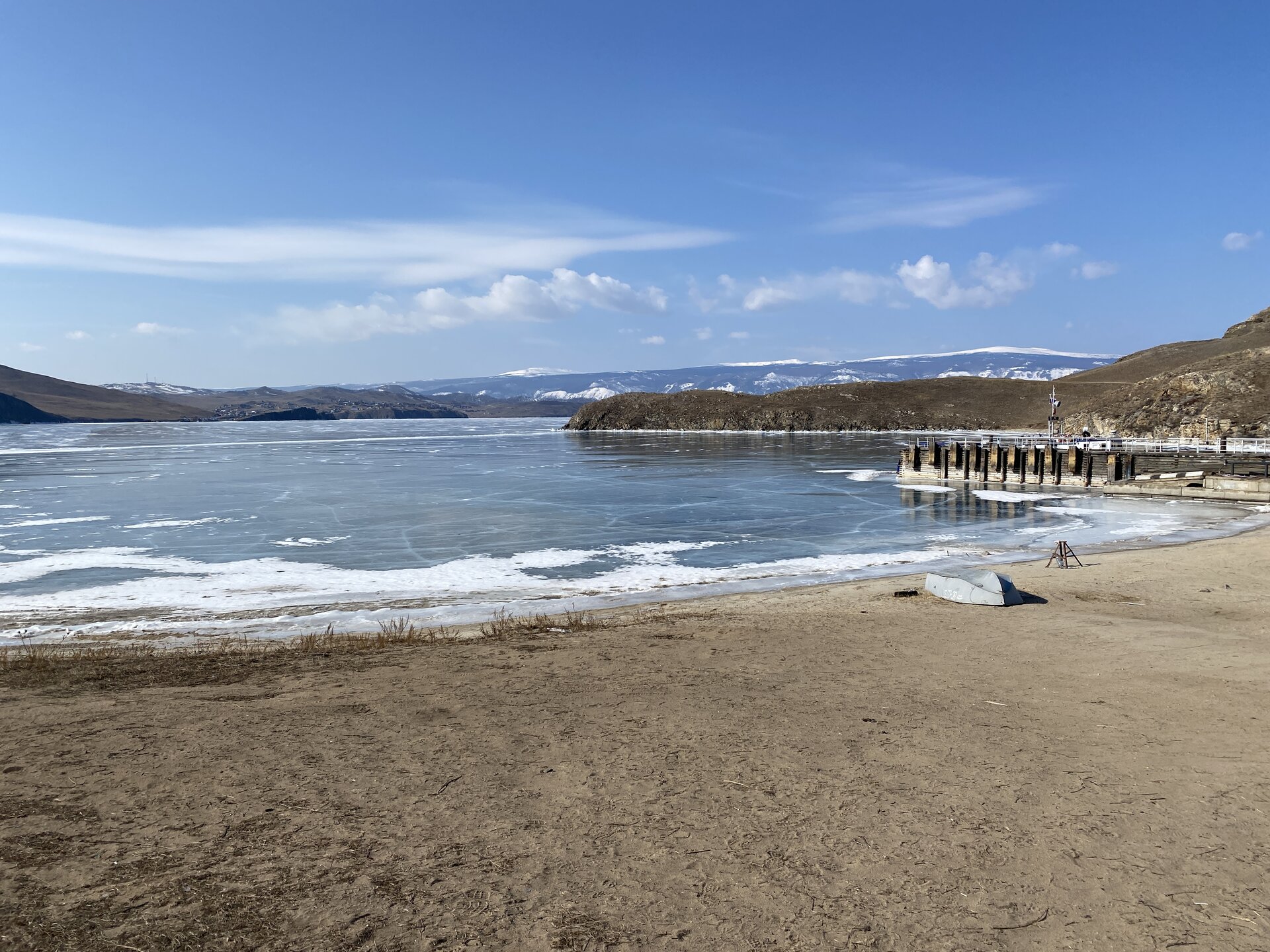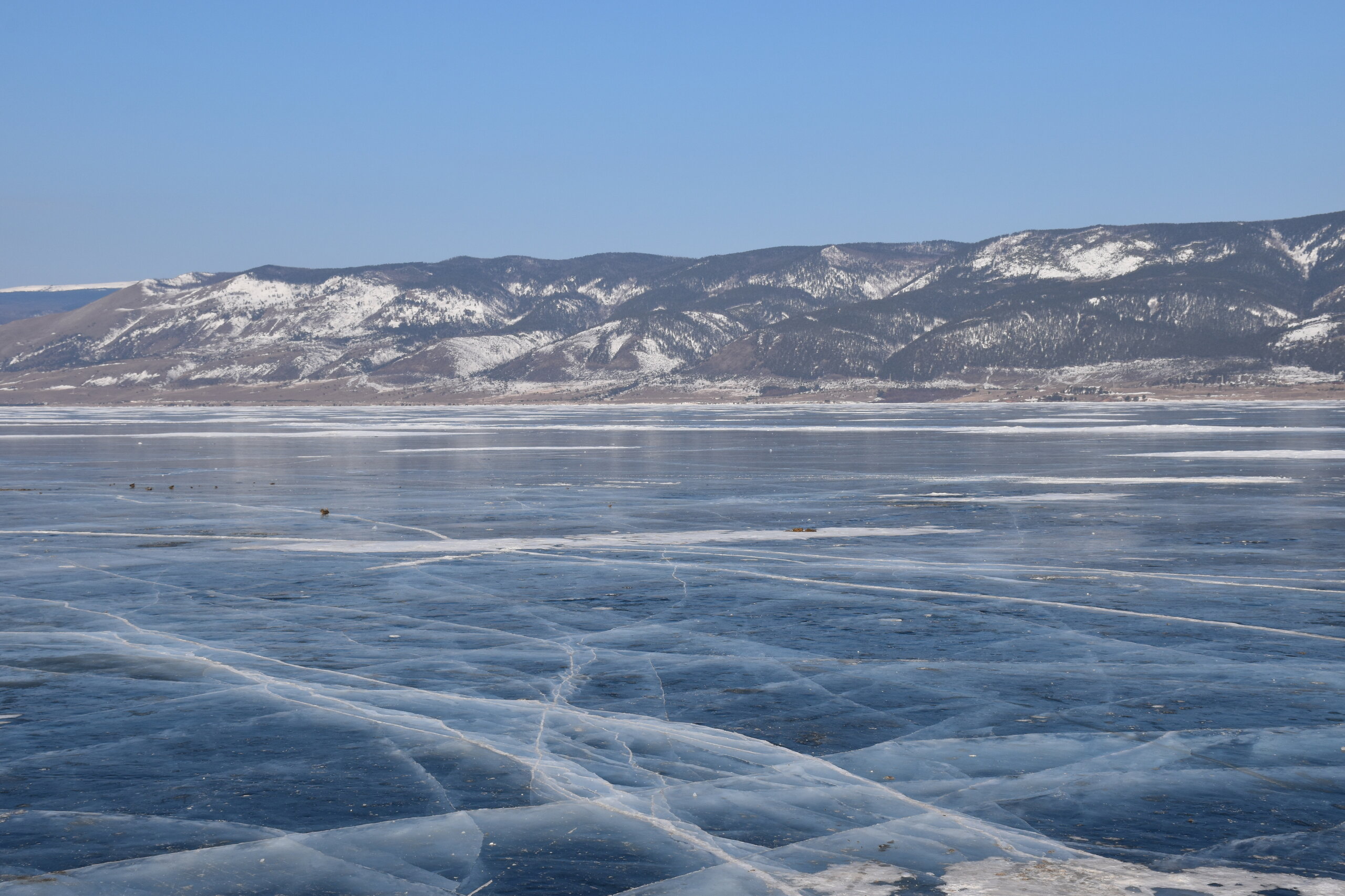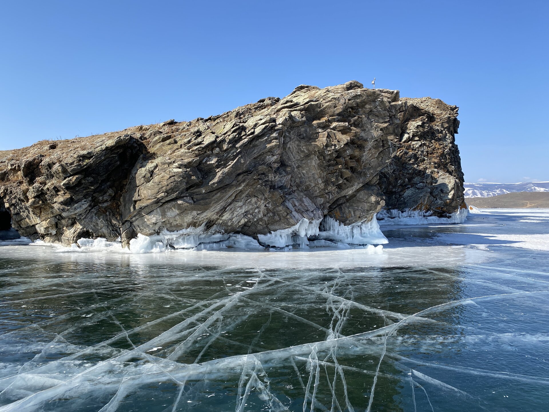 День 4. 12.03.2025 Сегодня наш день снова посвящен Льду! Вчерашний ветер Сарма сдул со льда снег. И если в первый выход было много снежных участков, то сейчас – перед нами почти идеальное зеркальное полотно! Хотя снежные участки для первого выхода – это больше плюс. Они помогали мне не скользить и побороть свой страх. В программе - поход на Мыс Уншуй острова Ольхон, Большое море. Гуляем по новым, весьма живописным окрестностям, а также поднимемся на скалу, что расположена над мысом Уншуй – с её вершины будет очередной, потрясающий вид на ледовую гладь Байкала. Активная часть треккинга: 20,1 км пешком, перепад высот 450-500 м, продолжительность похода 6-7 часов. В этом году лед образовался поздно, он тоньше и больше пропарин, поэтому в Большое море мы не выходим. Но вечером мы взяли дополнительную экскурсию на хивусе, который с легкостью вывез нас на большую глубину. Лед там отличается от Малого моря. Идем мы по проливу Ольхонские ворота. Это небольшой по ширине пролив, разделяющий материк и остров Ольхон. С одной стороны, он уходит в Малое море, с другой – в основную часть Байкала. На бурятском пролив называется Аман, что в переводе означает «рот» или «зёв». Иногда ещё можно встретить старое название – Ольхонский зунд. Длина пролива составляет 8,3 километра – это расстояние от мысов Улан и Кобылья голова до выхода в Большое море Байкала. Ширина наиболее узкого участка Ольхонских ворот – 1,2 километра. Именно на этом отрезке и находится паромная переправа на Ольхон. Средняя глубина пролива составляет 30-40 метров, а у южного входа, в окрестностях мысов Уншуй и Крест, она может достигать 100 метров. Течение здесь не такое, как на остальном Байкале. С северо-западной стороны находится Сарминское ущелье, откуда буйными порывами вырывается сильнейший одноименный ветер. Поэтому вода здесь находится в непрерывном движении, а волны порой могут достигать 5 метров высотой. В 2005 году на дне вдоль пролива Аман был проложен высоковольтный кабель, по которому на остров Ольхон поступает электричество. Ольхонские ворота – необычайно красивое и опасное место. Берега здесь круты и обрывисты, а вокруг них постоянно гоняет ветер и бьются волны. Зимой прибрежные скалы покрываются льдом и превращаются действительно нечто, похожее на сказочные ворота. Не удивительно, что туристы из года в год делают на Ольхонских воротах памятные, красочные фото. На побережье пролива Аман много узких заливов и небольших бухточек. Некоторые из бухт покрупнее – длиной 3-4 километра, но большинство все же совсем маленькие. На материковой части стоит посетить такие бухты, как: Тутай; Куркутская; Базарная. Со стороны Ольхона наибольший интерес представляют заливы Хул и Загли. Они закрыты от ветра и прекрасно подходит для стоянки судов в плохую погоду. Сегодня я выискиваю на льду необычные фигуры.