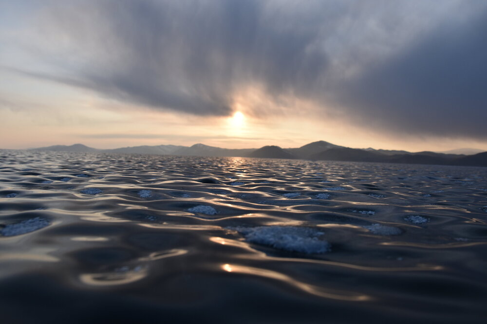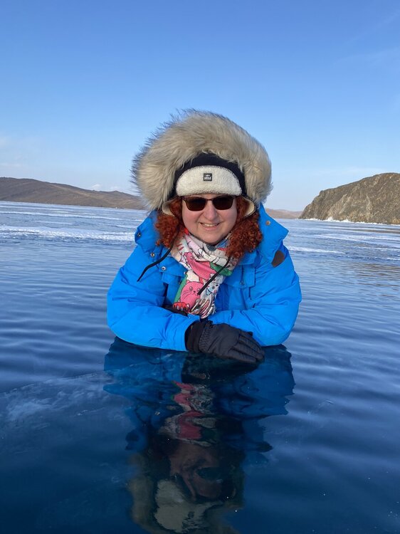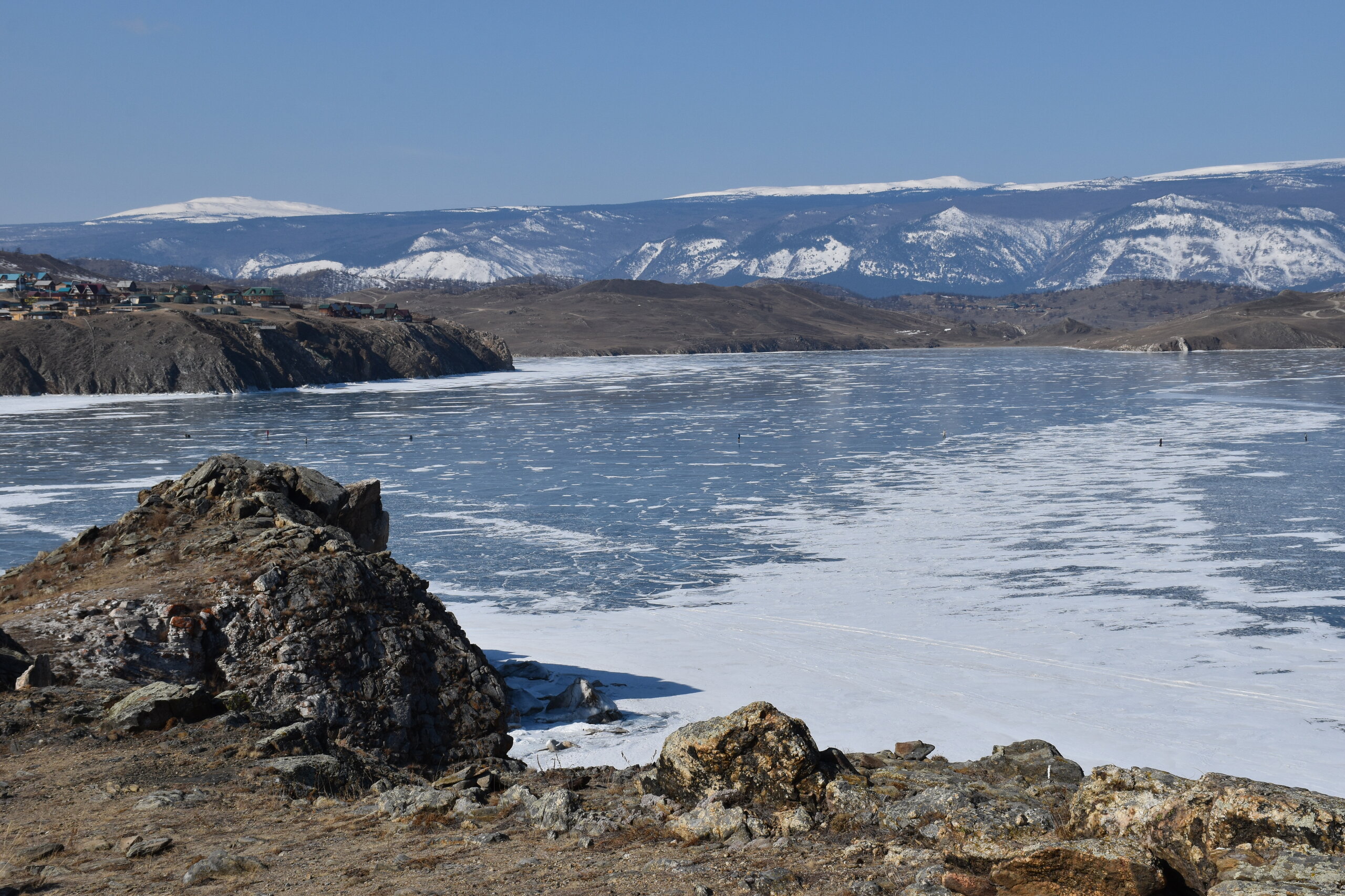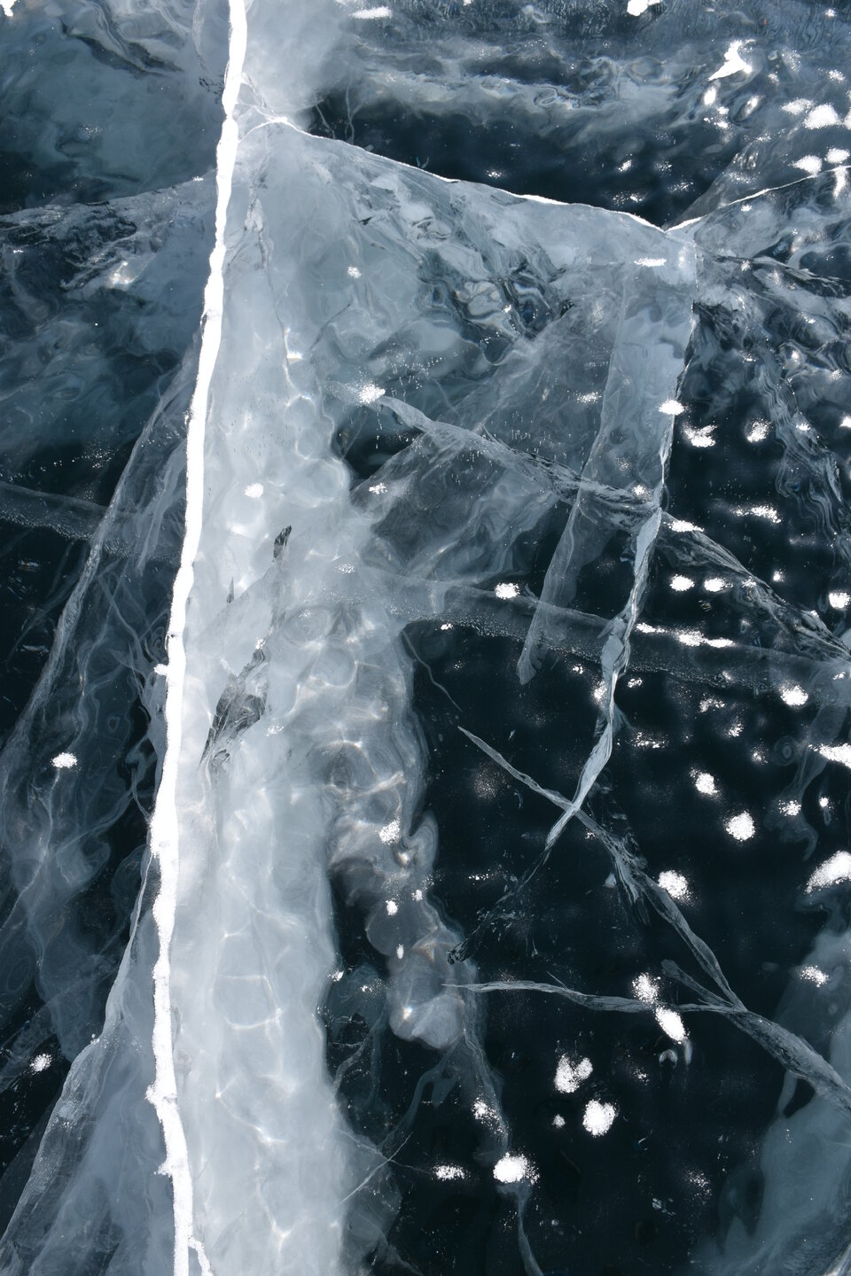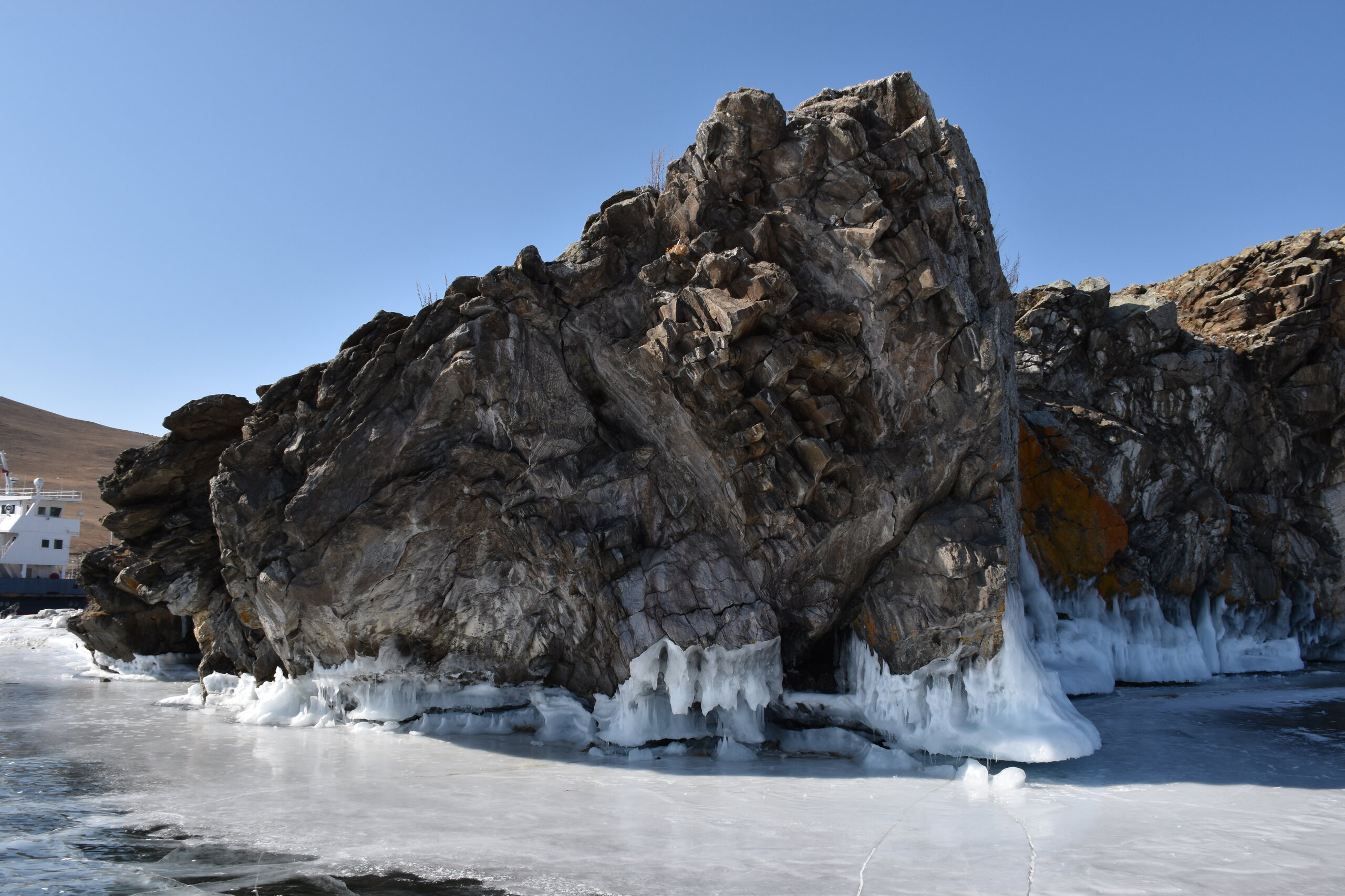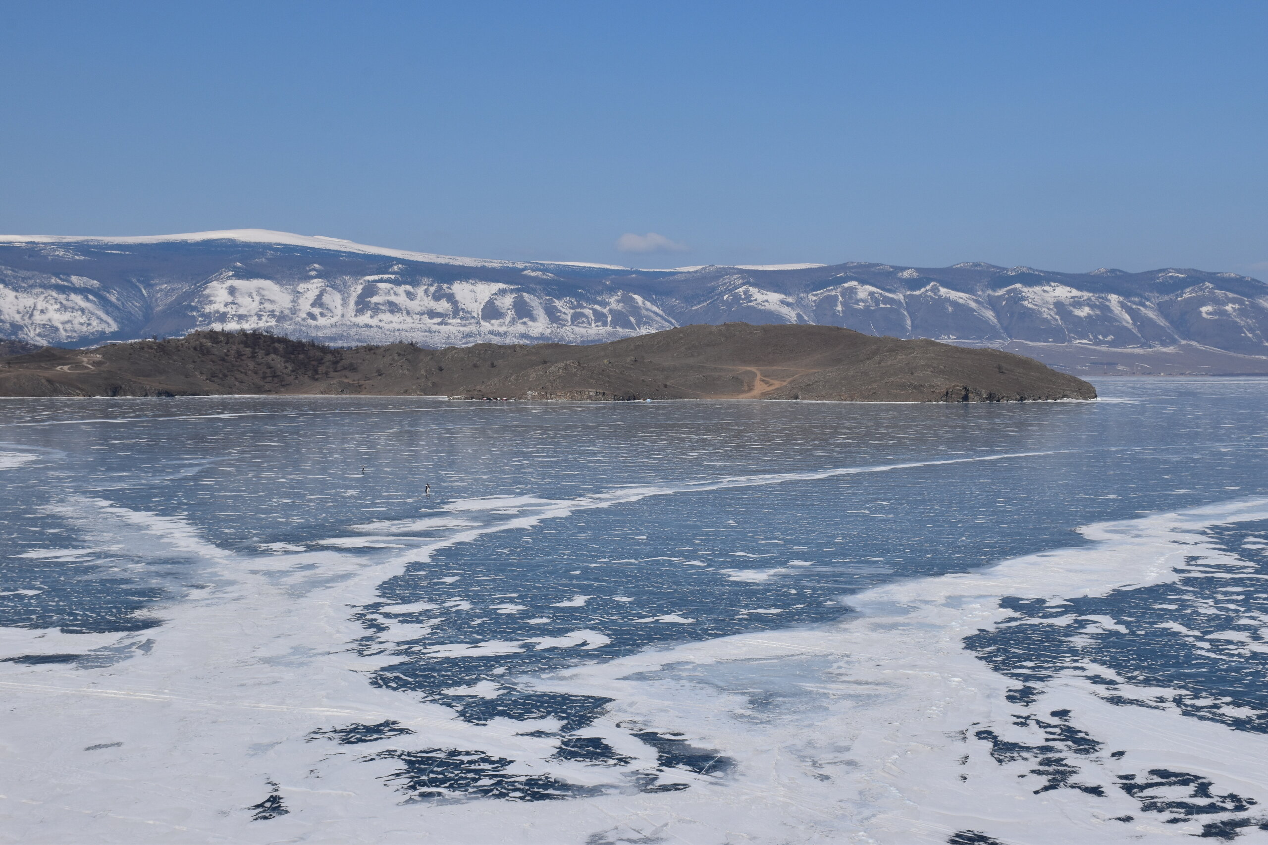 День 4. 12.03.2025 Сегодня наш день снова посвящен Льду! Вчерашний ветер Сарма сдул со льда снег. И если в первый выход было много снежных участков, то сейчас – перед нами почти идеальное зеркальное полотно! Хотя снежные участки для первого выхода – это больше плюс. Они помогали мне не скользить и побороть свой страх. В программе - поход на Мыс Уншуй острова Ольхон, Большое море. Гуляем по новым, весьма живописным окрестностям, а также поднимемся на скалу, что расположена над мысом Уншуй – с её вершины будет очередной, потрясающий вид на ледовую гладь Байкала. Активная часть треккинга: 20,1 км пешком, перепад высот 450-500 м, продолжительность похода 6-7 часов. В этом году лед образовался поздно, он тоньше и больше пропарин, поэтому в Большое море мы не выходим. Но вечером мы взяли дополнительную экскурсию на хивусе, который с легкостью вывез нас на большую глубину. Лед там отличается от Малого моря. Идем мы по проливу Ольхонские ворота. Это небольшой по ширине пролив, разделяющий материк и остров Ольхон. С одной стороны, он уходит в Малое море, с другой – в основную часть Байкала. На бурятском пролив называется Аман, что в переводе означает «рот» или «зёв». Иногда ещё можно встретить старое название – Ольхонский зунд. Длина пролива составляет 8,3 километра – это расстояние от мысов Улан и Кобылья голова до выхода в Большое море Байкала. Ширина наиболее узкого участка Ольхонских ворот – 1,2 километра. Именно на этом отрезке и находится паромная переправа на Ольхон. Средняя глубина пролива составляет 30-40 метров, а у южного входа, в окрестностях мысов Уншуй и Крест, она может достигать 100 метров. Течение здесь не такое, как на остальном Байкале. С северо-западной стороны находится Сарминское ущелье, откуда буйными порывами вырывается сильнейший одноименный ветер. Поэтому вода здесь находится в непрерывном движении, а волны порой могут достигать 5 метров высотой. В 2005 году на дне вдоль пролива Аман был проложен высоковольтный кабель, по которому на остров Ольхон поступает электричество. Ольхонские ворота – необычайно красивое и опасное место. Берега здесь круты и обрывисты, а вокруг них постоянно гоняет ветер и бьются волны. Зимой прибрежные скалы покрываются льдом и превращаются действительно нечто, похожее на сказочные ворота. Не удивительно, что туристы из года в год делают на Ольхонских воротах памятные, красочные фото. На побережье пролива Аман много узких заливов и небольших бухточек. Некоторые из бухт покрупнее – длиной 3-4 километра, но большинство все же совсем маленькие. На материковой части стоит посетить такие бухты, как: Тутай; Куркутская; Базарная. Со стороны Ольхона наибольший интерес представляют заливы Хул и Загли. Они закрыты от ветра и прекрасно подходит для стоянки судов в плохую погоду. Сегодня я выискиваю на льду необычные фигуры.