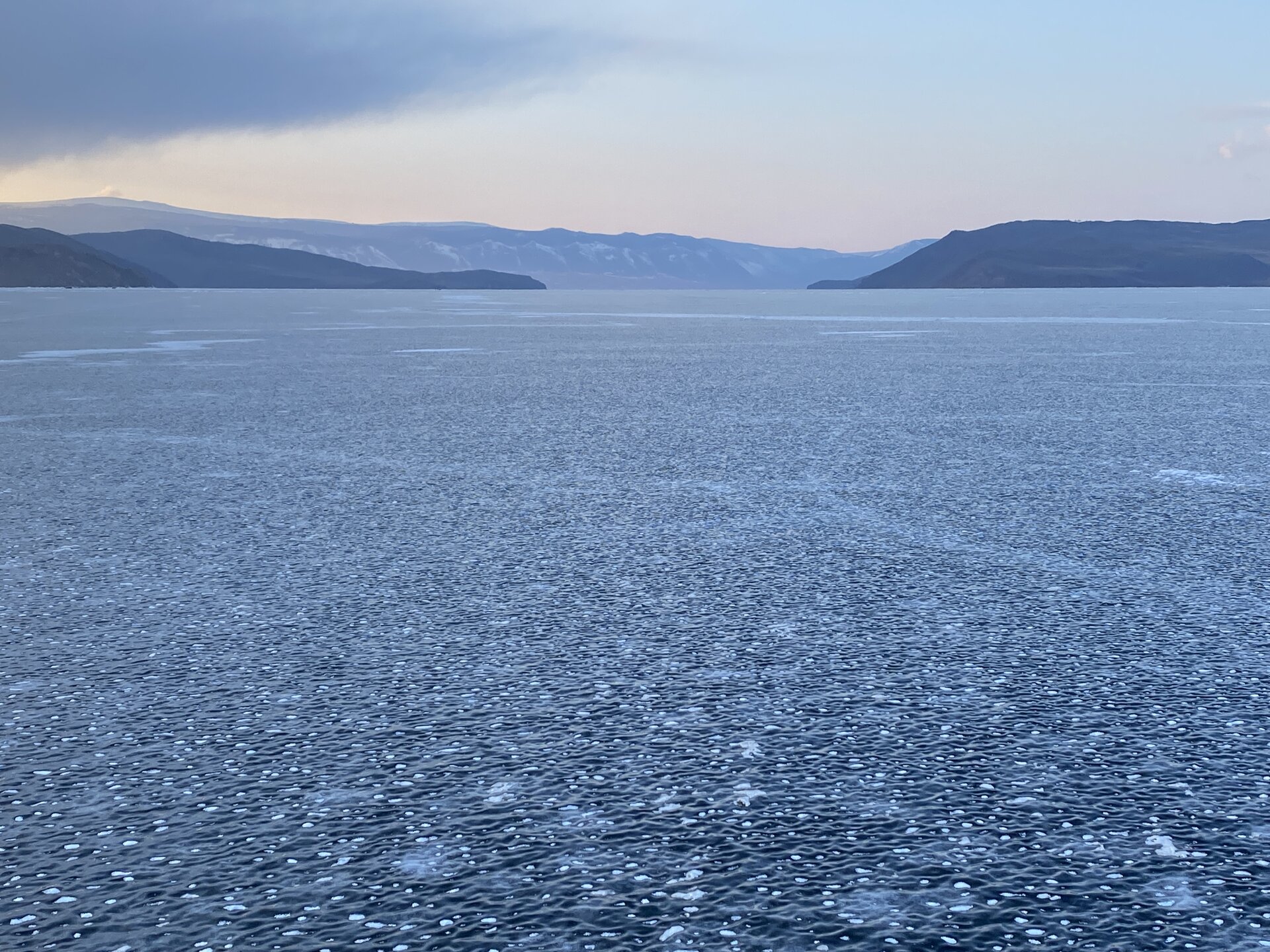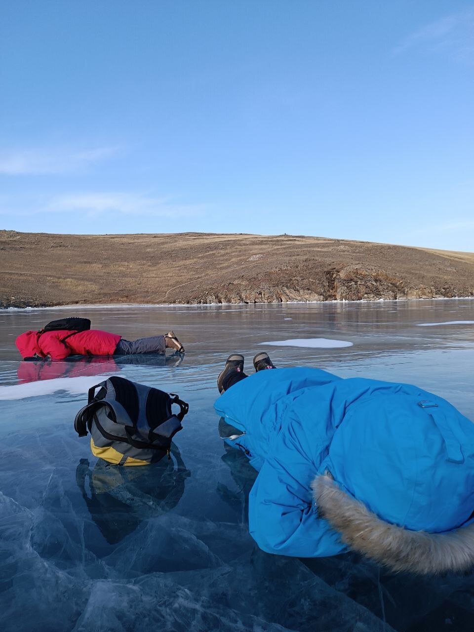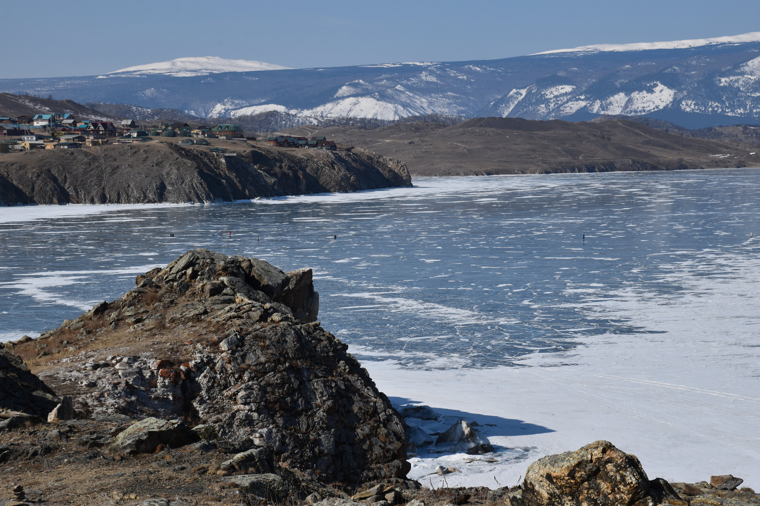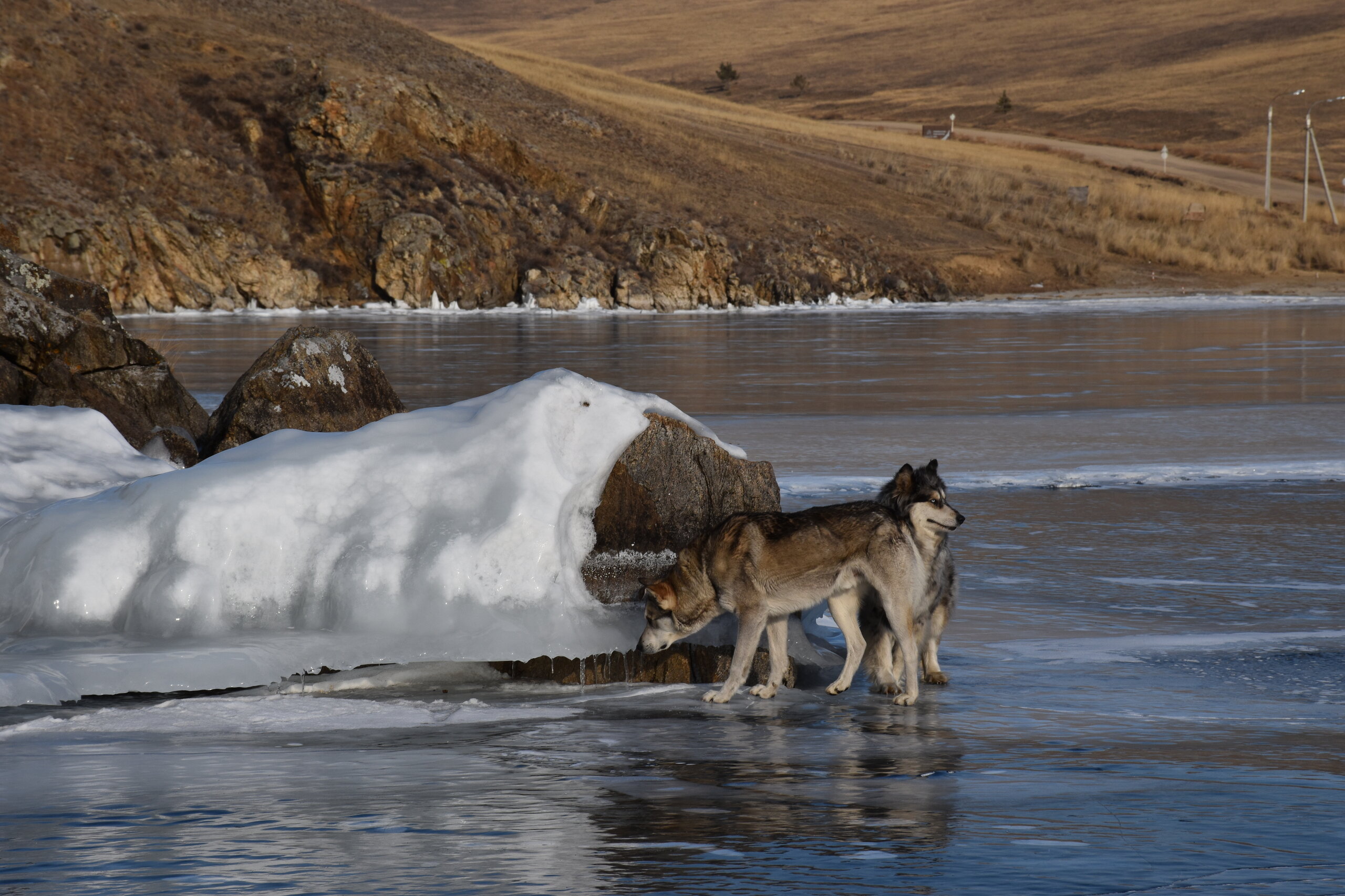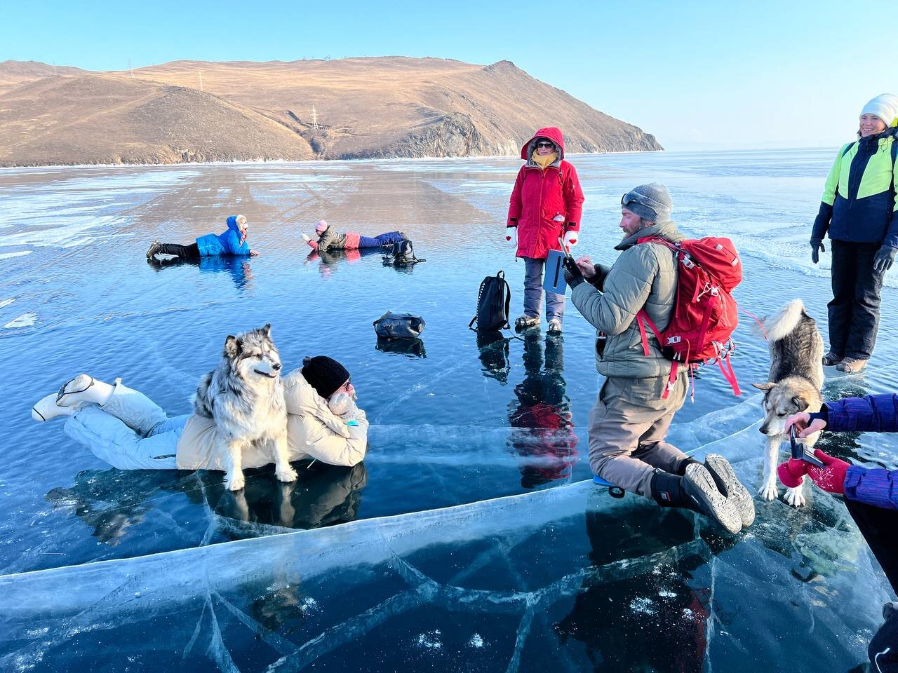 День 4. 12.03.2025 Сегодня наш день снова посвящен Льду! Вчерашний ветер Сарма сдул со льда снег. И если в первый выход было много снежных участков, то сейчас – перед нами почти идеальное зеркальное полотно! Хотя снежные участки для первого выхода – это больше плюс. Они помогали мне не скользить и побороть свой страх. В программе - поход на Мыс Уншуй острова Ольхон, Большое море. Гуляем по новым, весьма живописным окрестностям, а также поднимемся на скалу, что расположена над мысом Уншуй – с её вершины будет очередной, потрясающий вид на ледовую гладь Байкала. Активная часть треккинга: 20,1 км пешком, перепад высот 450-500 м, продолжительность похода 6-7 часов. В этом году лед образовался поздно, он тоньше и больше пропарин, поэтому в Большое море мы не выходим. Но вечером мы взяли дополнительную экскурсию на хивусе, который с легкостью вывез нас на большую глубину. Лед там отличается от Малого моря. Идем мы по проливу Ольхонские ворота. Это небольшой по ширине пролив, разделяющий материк и остров Ольхон. С одной стороны, он уходит в Малое море, с другой – в основную часть Байкала. На бурятском пролив называется Аман, что в переводе означает «рот» или «зёв». Иногда ещё можно встретить старое название – Ольхонский зунд. Длина пролива составляет 8,3 километра – это расстояние от мысов Улан и Кобылья голова до выхода в Большое море Байкала. Ширина наиболее узкого участка Ольхонских ворот – 1,2 километра. Именно на этом отрезке и находится паромная переправа на Ольхон. Средняя глубина пролива составляет 30-40 метров, а у южного входа, в окрестностях мысов Уншуй и Крест, она может достигать 100 метров. Течение здесь не такое, как на остальном Байкале. С северо-западной стороны находится Сарминское ущелье, откуда буйными порывами вырывается сильнейший одноименный ветер. Поэтому вода здесь находится в непрерывном движении, а волны порой могут достигать 5 метров высотой. В 2005 году на дне вдоль пролива Аман был проложен высоковольтный кабель, по которому на остров Ольхон поступает электричество. Ольхонские ворота – необычайно красивое и опасное место. Берега здесь круты и обрывисты, а вокруг них постоянно гоняет ветер и бьются волны. Зимой прибрежные скалы покрываются льдом и превращаются действительно нечто, похожее на сказочные ворота. Не удивительно, что туристы из года в год делают на Ольхонских воротах памятные, красочные фото. На побережье пролива Аман много узких заливов и небольших бухточек. Некоторые из бухт покрупнее – длиной 3-4 километра, но большинство все же совсем маленькие. На материковой части стоит посетить такие бухты, как: Тутай; Куркутская; Базарная. Со стороны Ольхона наибольший интерес представляют заливы Хул и Загли. Они закрыты от ветра и прекрасно подходит для стоянки судов в плохую погоду. Сегодня я выискиваю на льду необычные фигуры.