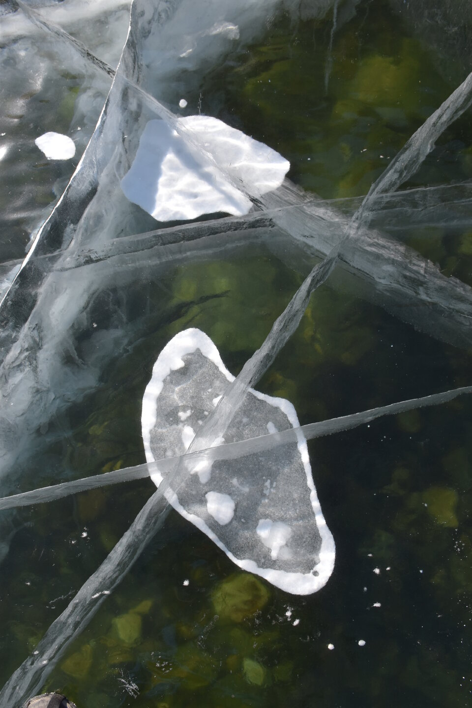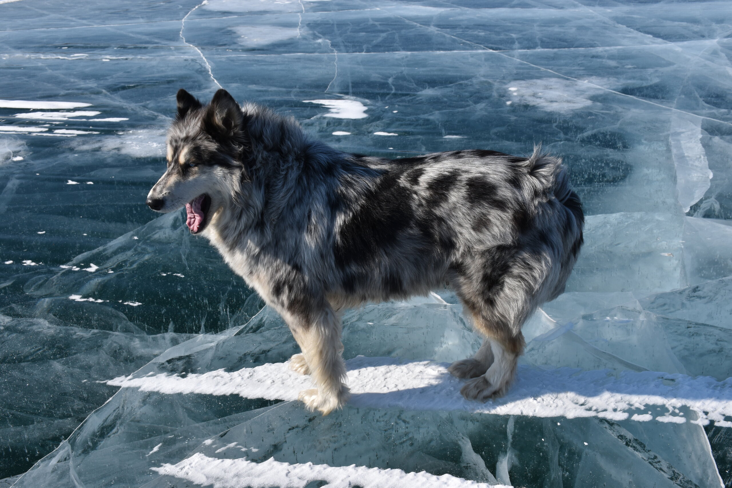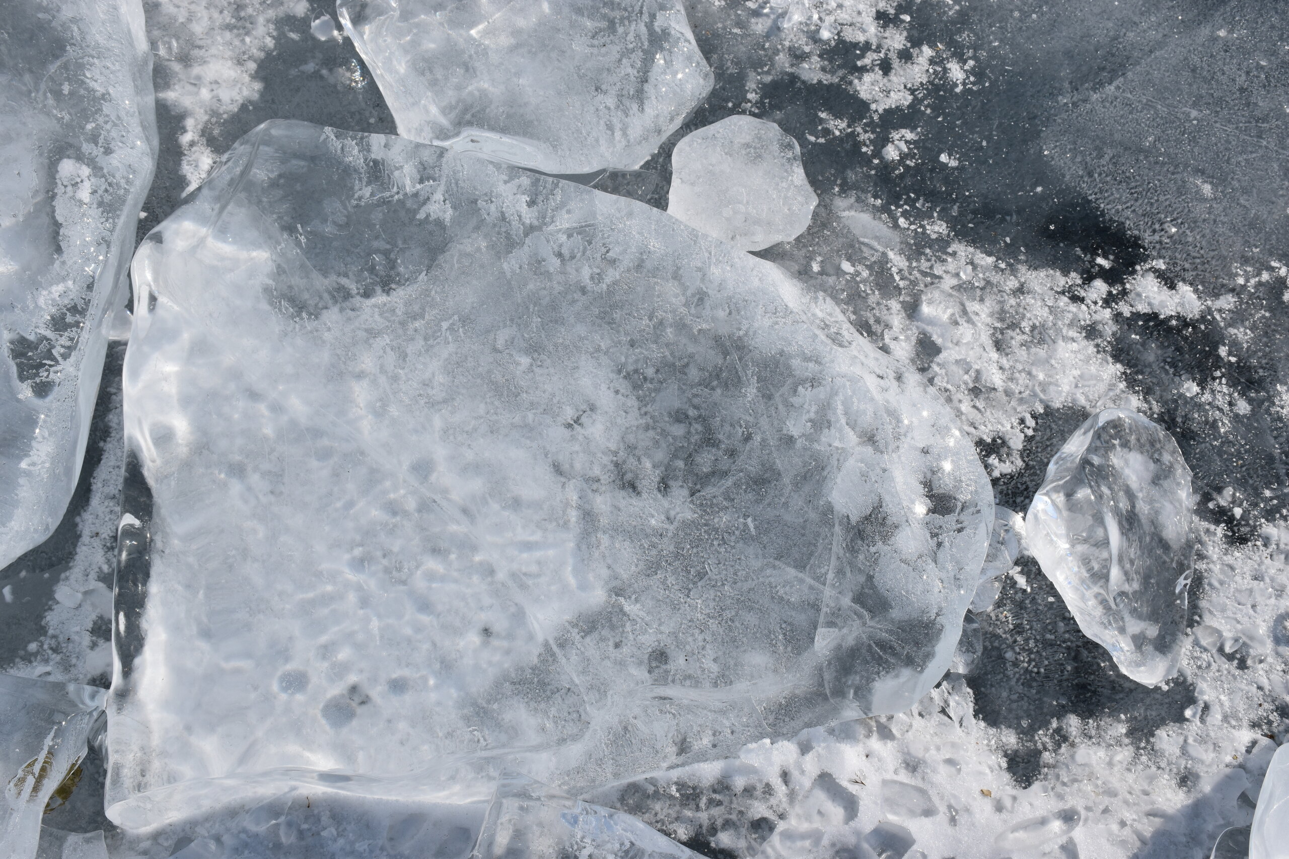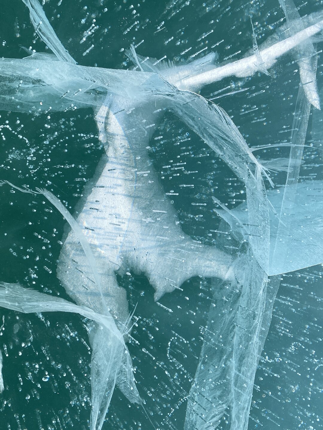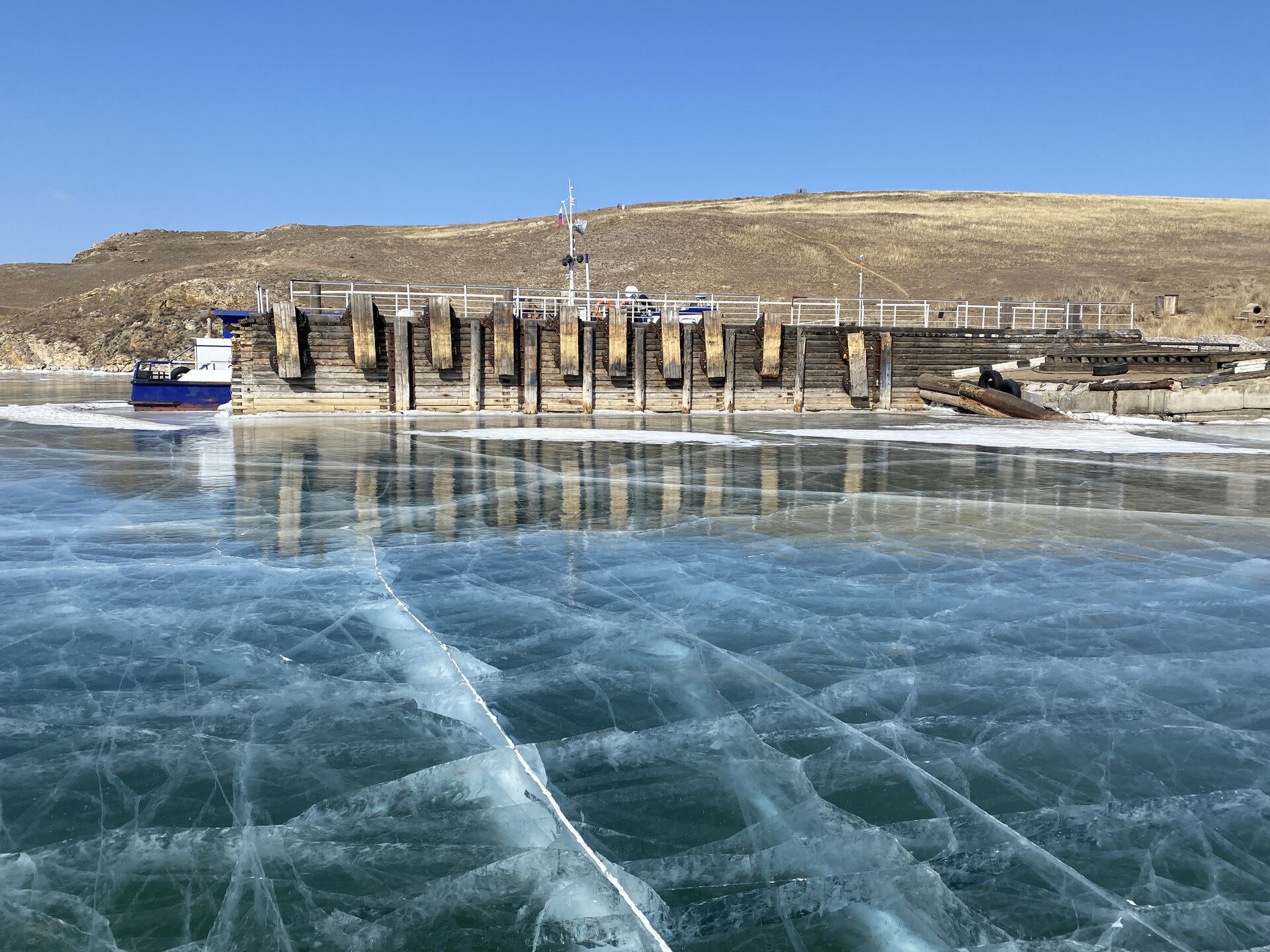 День 4. 12.03.2025 Сегодня наш день снова посвящен Льду! Вчерашний ветер Сарма сдул со льда снег. И если в первый выход было много снежных участков, то сейчас – перед нами почти идеальное зеркальное полотно! Хотя снежные участки для первого выхода – это больше плюс. Они помогали мне не скользить и побороть свой страх. В программе - поход на Мыс Уншуй острова Ольхон, Большое море. Гуляем по новым, весьма живописным окрестностям, а также поднимемся на скалу, что расположена над мысом Уншуй – с её вершины будет очередной, потрясающий вид на ледовую гладь Байкала. Активная часть треккинга: 20,1 км пешком, перепад высот 450-500 м, продолжительность похода 6-7 часов. В этом году лед образовался поздно, он тоньше и больше пропарин, поэтому в Большое море мы не выходим. Но вечером мы взяли дополнительную экскурсию на хивусе, который с легкостью вывез нас на большую глубину. Лед там отличается от Малого моря. Идем мы по проливу Ольхонские ворота. Это небольшой по ширине пролив, разделяющий материк и остров Ольхон. С одной стороны, он уходит в Малое море, с другой – в основную часть Байкала. На бурятском пролив называется Аман, что в переводе означает «рот» или «зёв». Иногда ещё можно встретить старое название – Ольхонский зунд. Длина пролива составляет 8,3 километра – это расстояние от мысов Улан и Кобылья голова до выхода в Большое море Байкала. Ширина наиболее узкого участка Ольхонских ворот – 1,2 километра. Именно на этом отрезке и находится паромная переправа на Ольхон. Средняя глубина пролива составляет 30-40 метров, а у южного входа, в окрестностях мысов Уншуй и Крест, она может достигать 100 метров. Течение здесь не такое, как на остальном Байкале. С северо-западной стороны находится Сарминское ущелье, откуда буйными порывами вырывается сильнейший одноименный ветер. Поэтому вода здесь находится в непрерывном движении, а волны порой могут достигать 5 метров высотой. В 2005 году на дне вдоль пролива Аман был проложен высоковольтный кабель, по которому на остров Ольхон поступает электричество. Ольхонские ворота – необычайно красивое и опасное место. Берега здесь круты и обрывисты, а вокруг них постоянно гоняет ветер и бьются волны. Зимой прибрежные скалы покрываются льдом и превращаются действительно нечто, похожее на сказочные ворота. Не удивительно, что туристы из года в год делают на Ольхонских воротах памятные, красочные фото. На побережье пролива Аман много узких заливов и небольших бухточек. Некоторые из бухт покрупнее – длиной 3-4 километра, но большинство все же совсем маленькие. На материковой части стоит посетить такие бухты, как: Тутай; Куркутская; Базарная. Со стороны Ольхона наибольший интерес представляют заливы Хул и Загли. Они закрыты от ветра и прекрасно подходит для стоянки судов в плохую погоду. Сегодня я выискиваю на льду необычные фигуры.