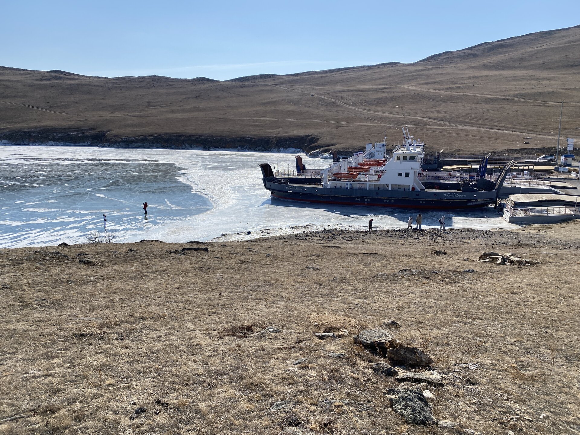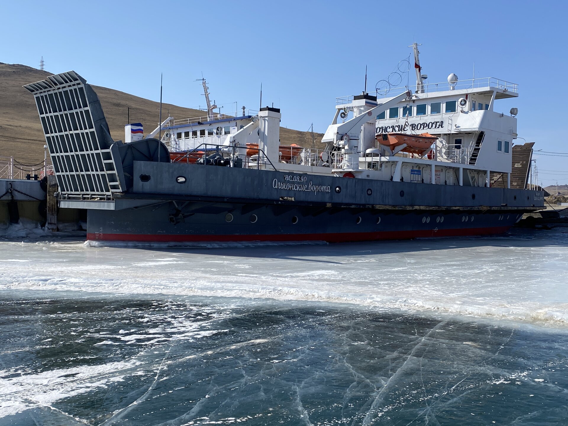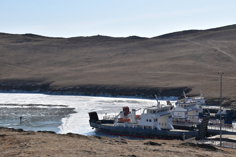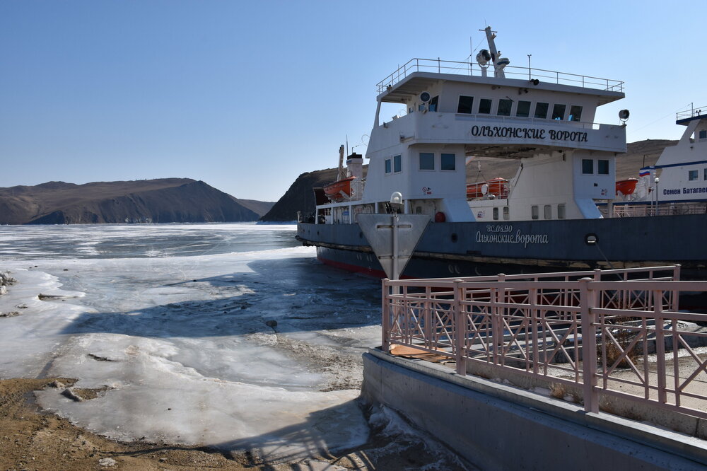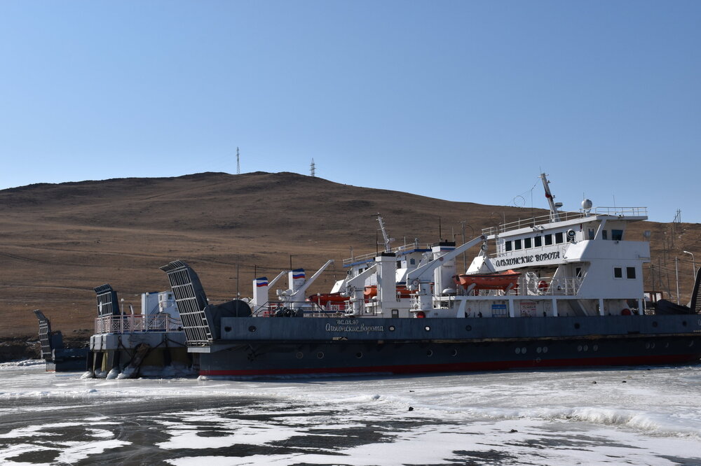 В средней части пролива, возле поселка Сахюрта, находится Маломорская речная станция (МРС). На ней установлена паромная переправа «МРС – Остров Ольхон», по которой каждый год курсируют туристы. Длина переправы – 2,1 километра, что занимает около получаса пути. Если вам назвали цену парома на Ольхон – стоит насторожиться, ведь переправа совершенно бесплатна! Летом работают два парома: «Ольхонские ворота» и «Дорожник». Первый, построенный в 2008 году, покрупнее и вмещает в себя до 100 человек и 16 автомобилей. А вот «Дорожник» совсем старенький, выпущен в 1992 году и может вместить только 50 человек. Зато по количеству автомобилей он почти не отстает от своего старшего собрата – на «Дорожнике» помещается 12 авто. Переправа на пароме через Ольхонские ворота – идеальная возможность рассмотреть окружающие красоты. Отсюда отлично видно оба берега и все их многочисленные бухты и заливы. По пути можно рассмотреть обелиск. Это памятный знак, установленный в честь воздухоплавателей, преодолевших пролив много десятилетий назад. Здесь мы сняли свои ледоступы и забрались на сопку. Виды с нее за заливы шикарные!