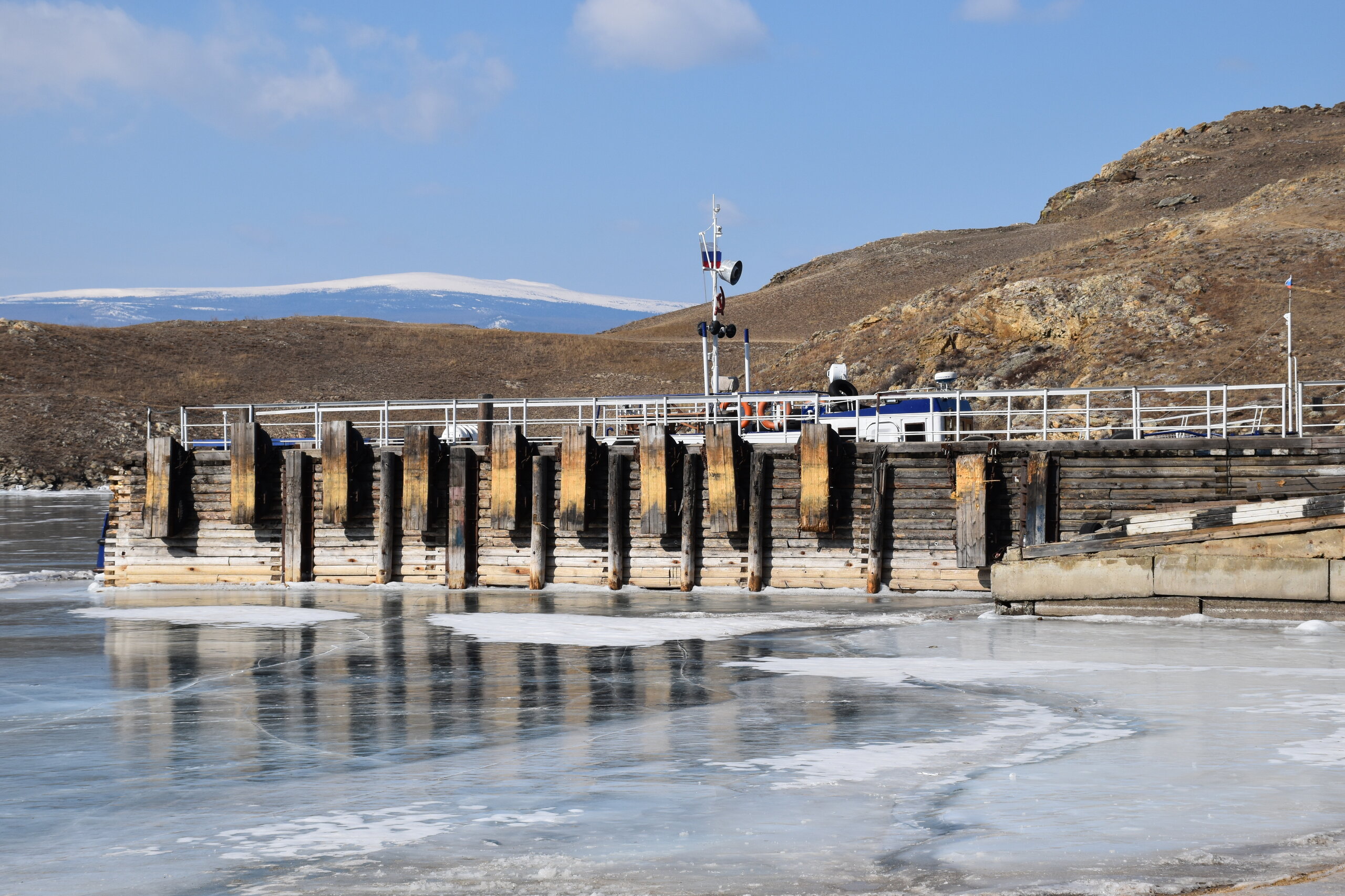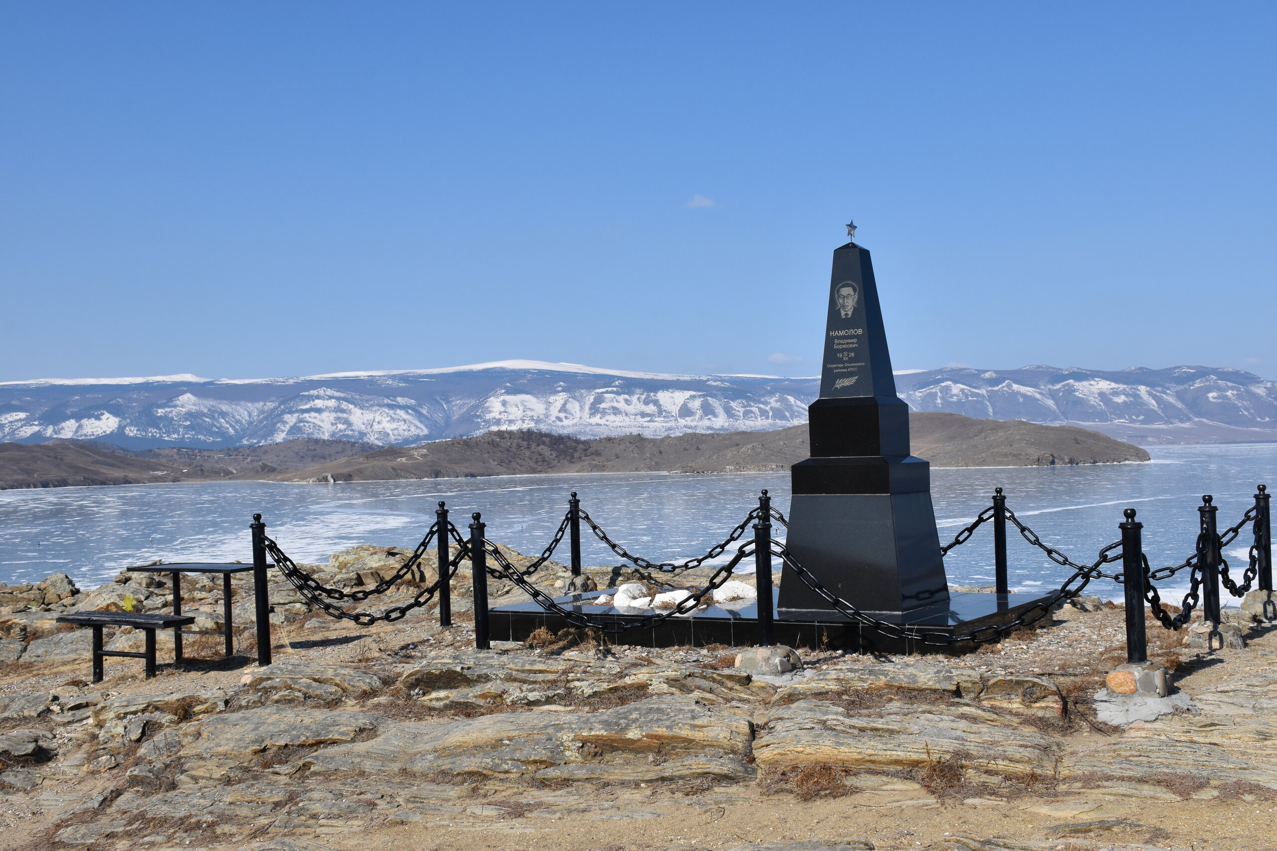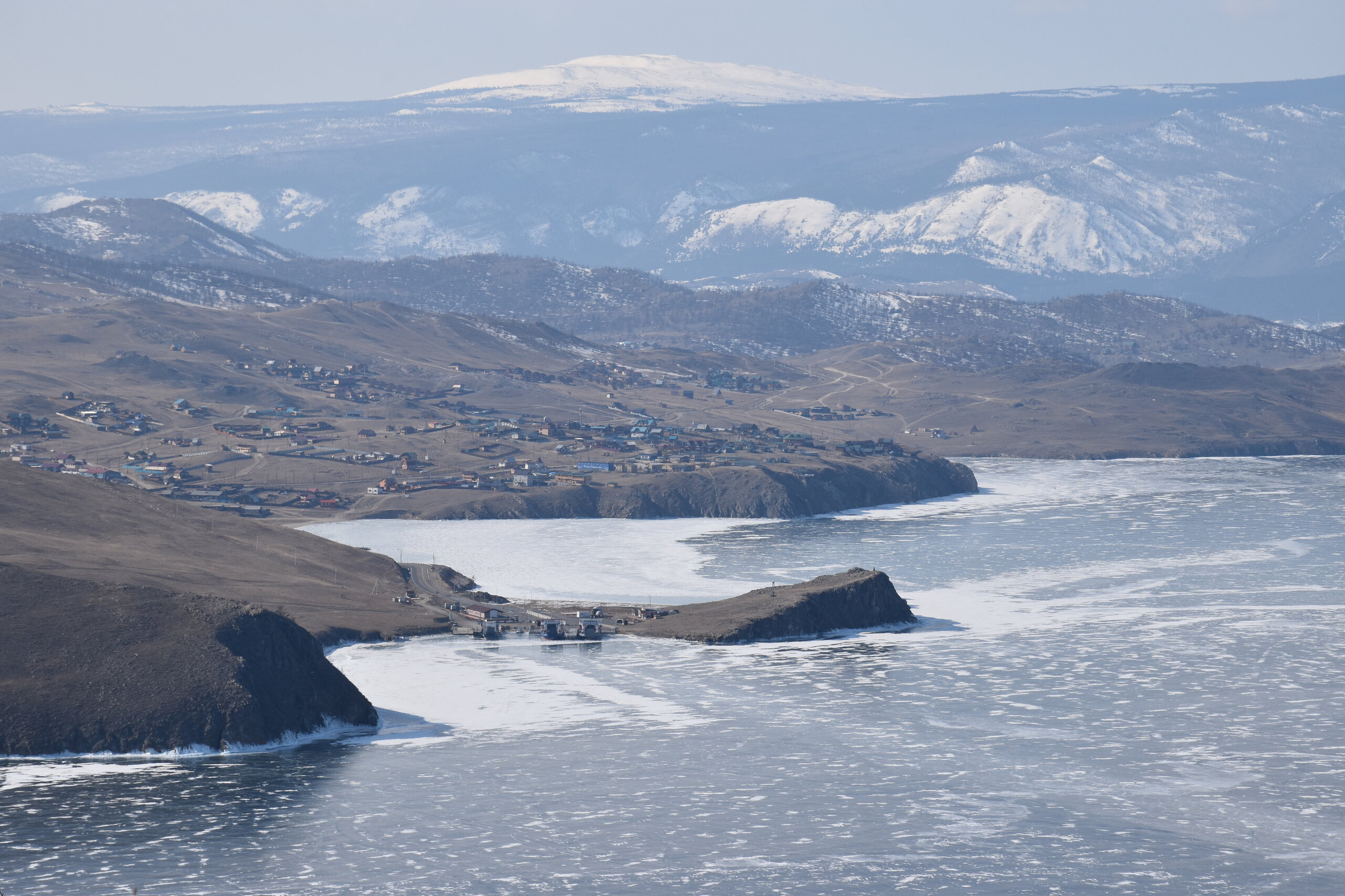 В средней части пролива, возле поселка Сахюрта, находится Маломорская речная станция (МРС). На ней установлена паромная переправа «МРС – Остров Ольхон», по которой каждый год курсируют туристы. Длина переправы – 2,1 километра, что занимает около получаса пути. Если вам назвали цену парома на Ольхон – стоит насторожиться, ведь переправа совершенно бесплатна! Летом работают два парома: «Ольхонские ворота» и «Дорожник». Первый, построенный в 2008 году, покрупнее и вмещает в себя до 100 человек и 16 автомобилей. А вот «Дорожник» совсем старенький, выпущен в 1992 году и может вместить только 50 человек. Зато по количеству автомобилей он почти не отстает от своего старшего собрата – на «Дорожнике» помещается 12 авто. Переправа на пароме через Ольхонские ворота – идеальная возможность рассмотреть окружающие красоты. Отсюда отлично видно оба берега и все их многочисленные бухты и заливы. По пути можно рассмотреть обелиск. Это памятный знак, установленный в честь воздухоплавателей, преодолевших пролив много десятилетий назад. Здесь мы сняли свои ледоступы и забрались на сопку. Виды с нее за заливы шикарные!