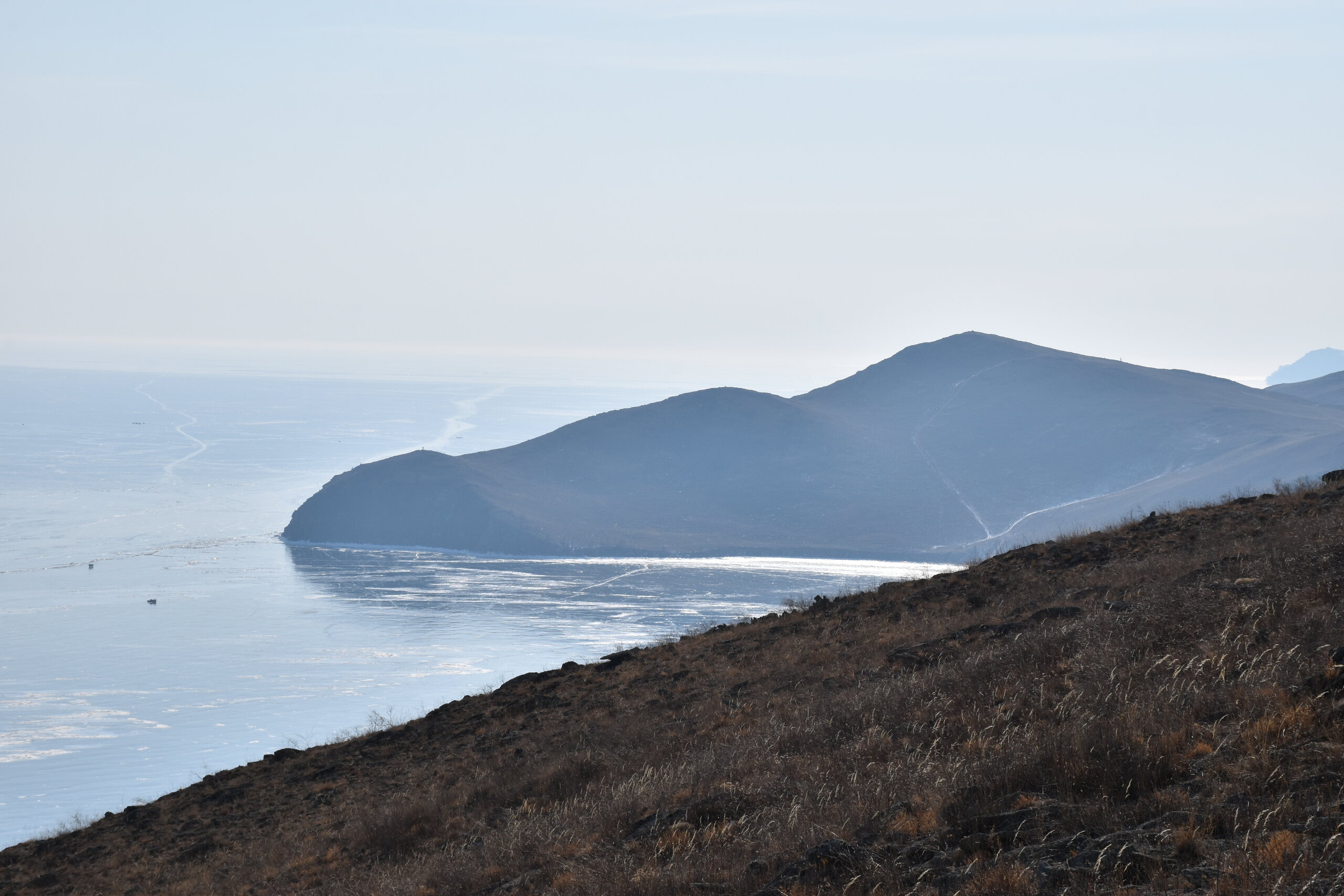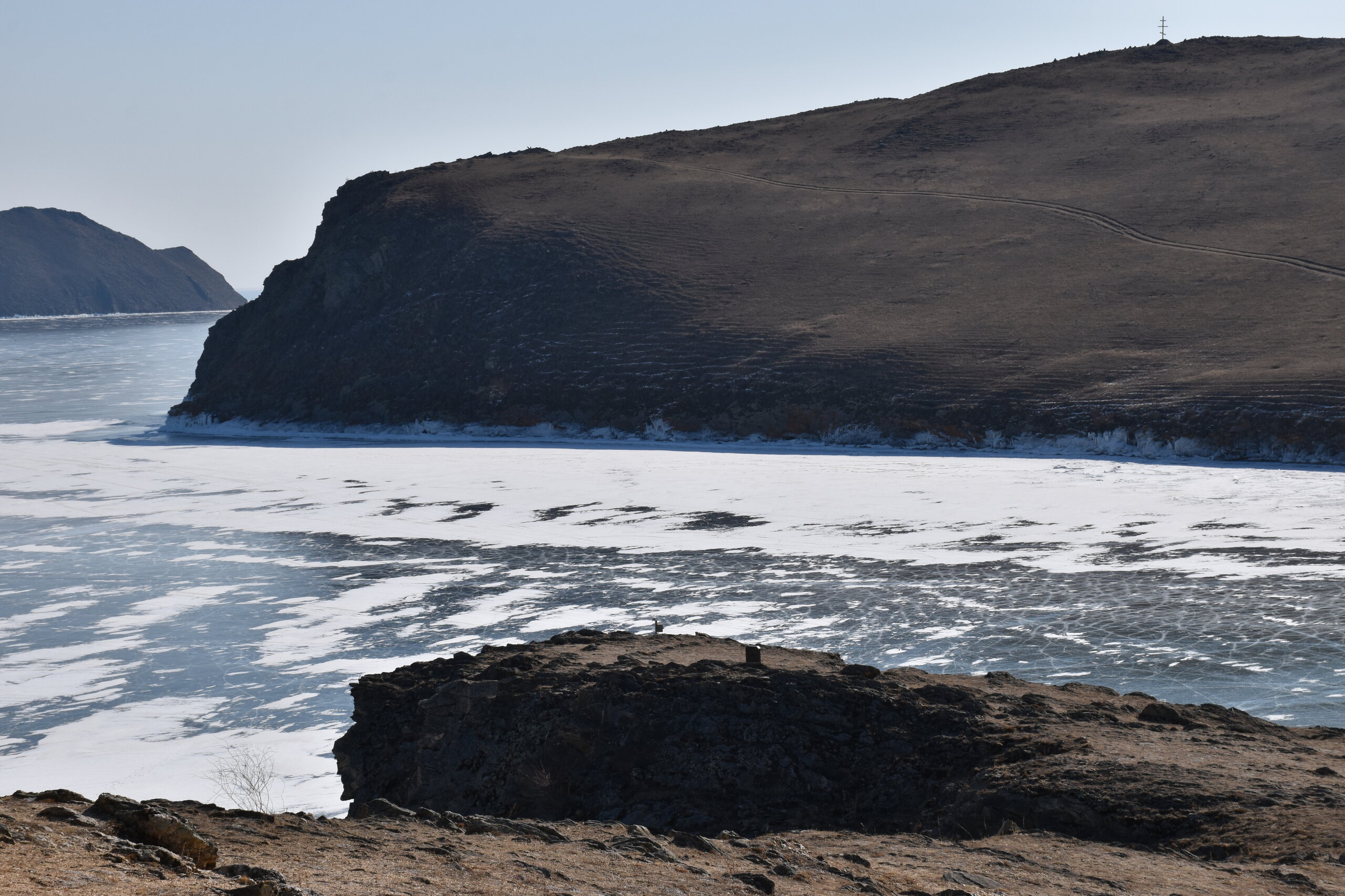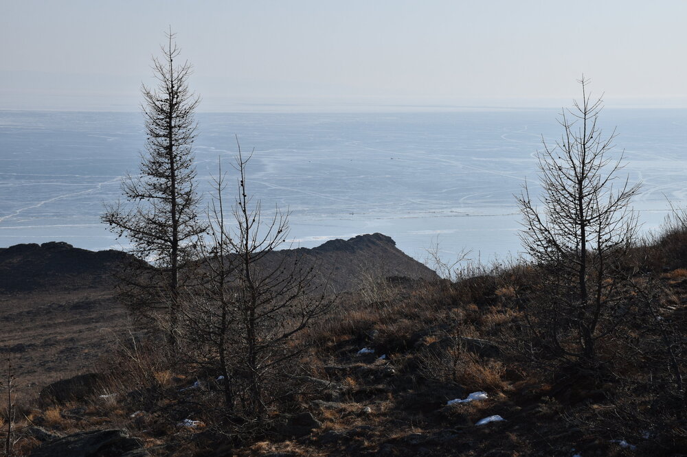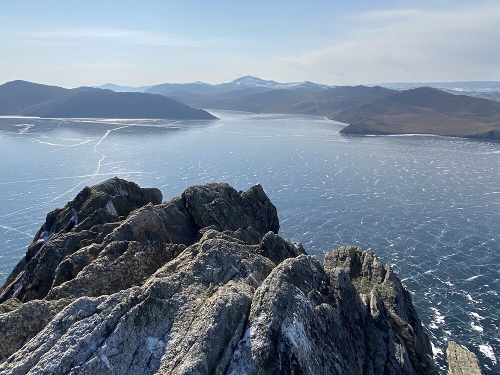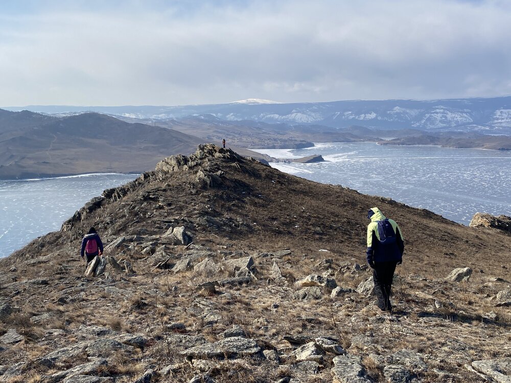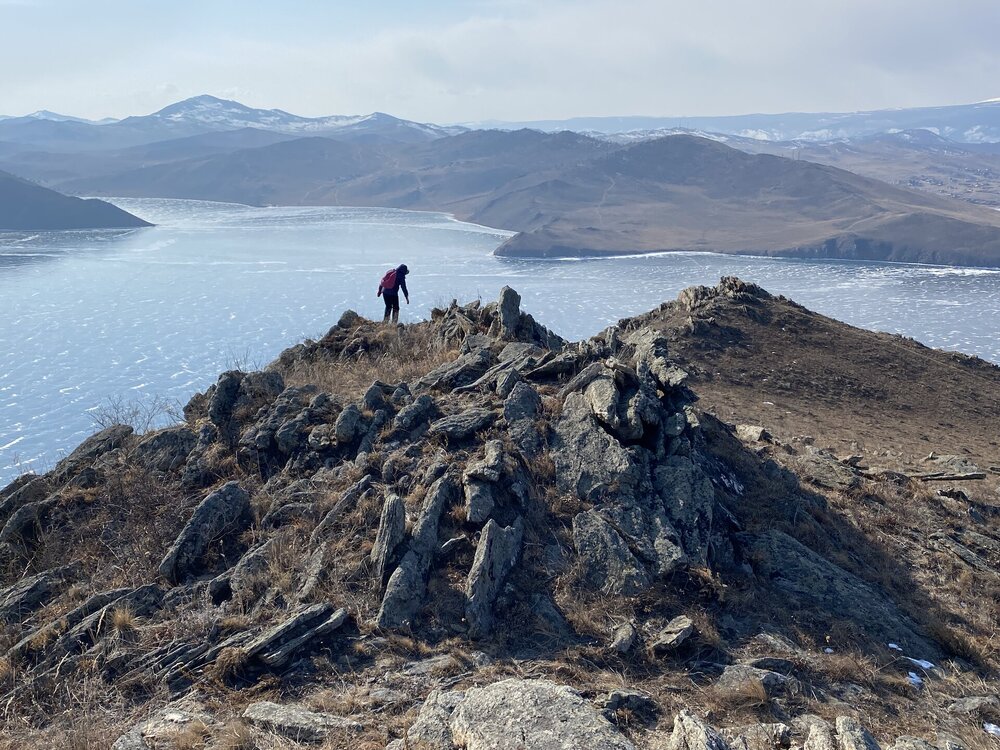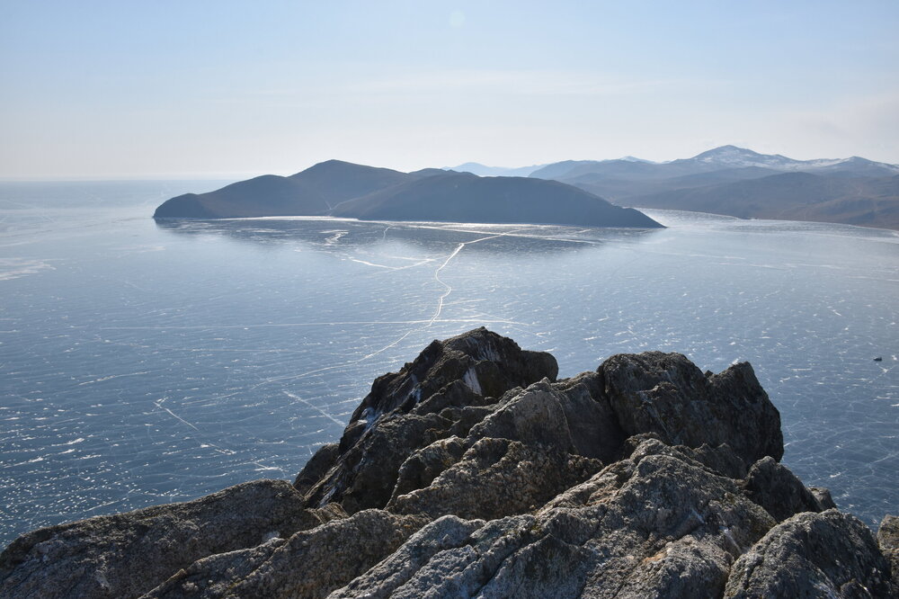 И вот мы по льду дошли до острова Ольхон. Летом именно здесь переправа и жизнь кипит. Сейчас же тишина! Полезли в горку ради красивых видов! Подъем небольшой, для меня совсем несложный (после треккингов на Кавказе).