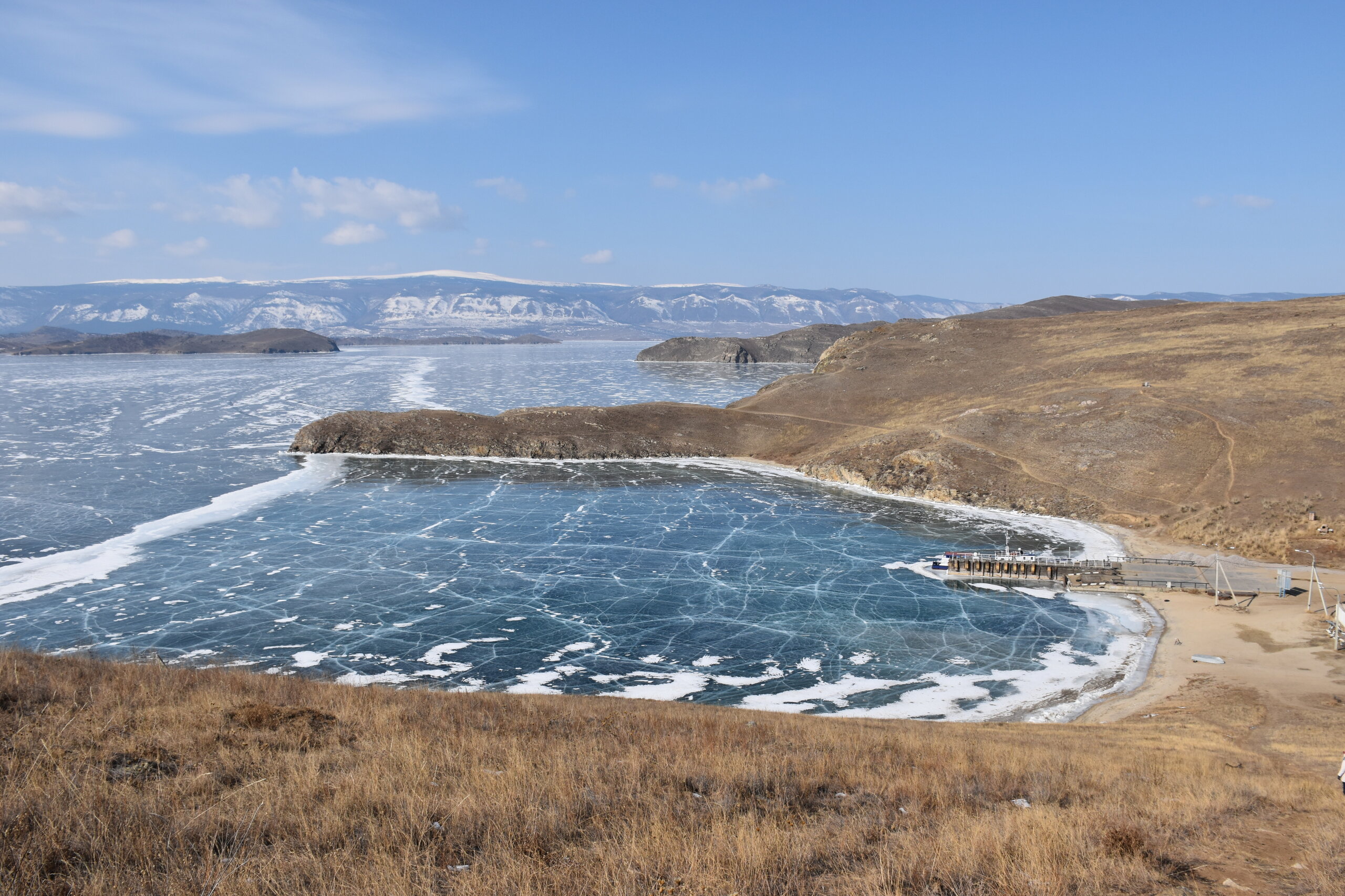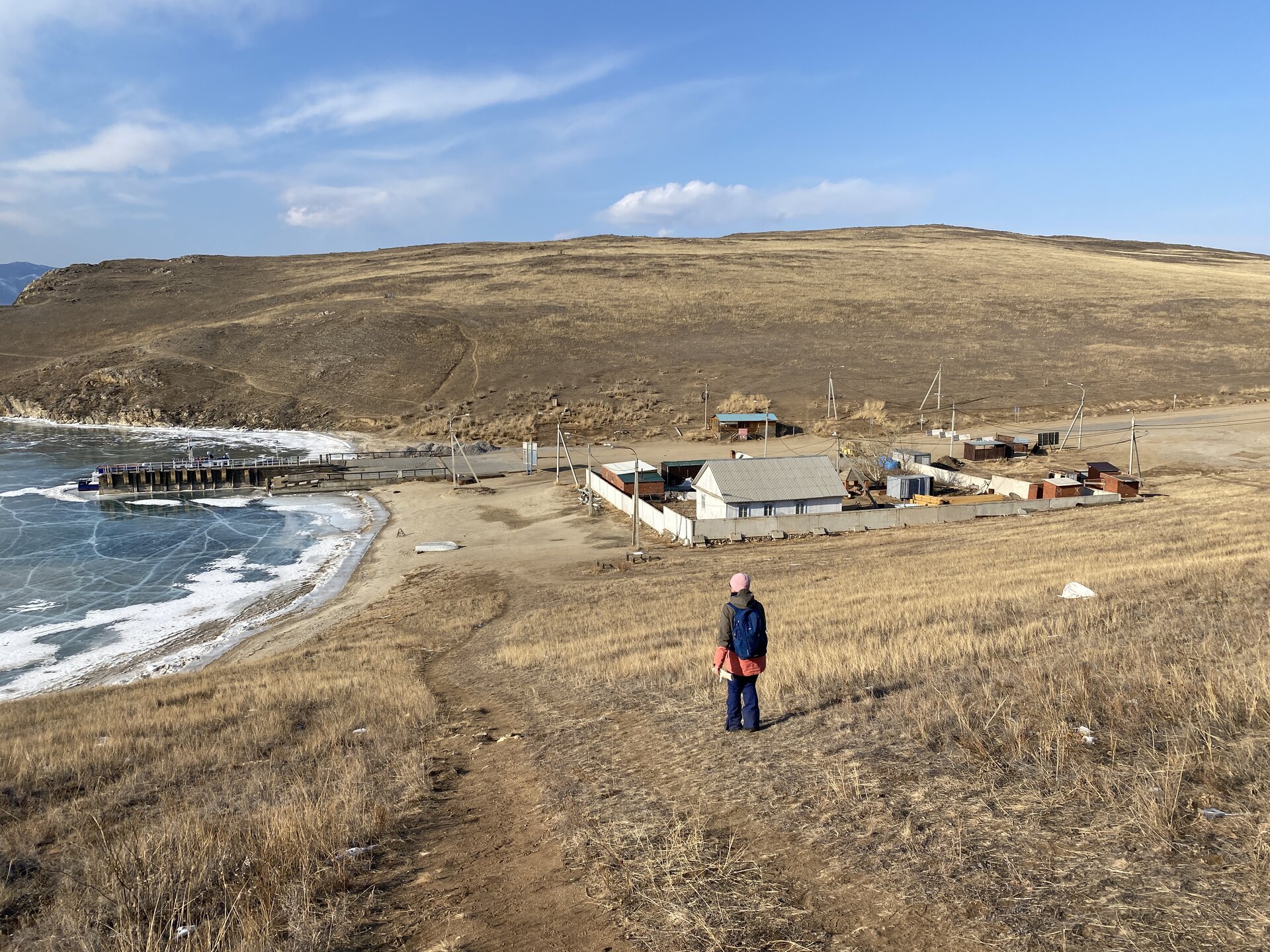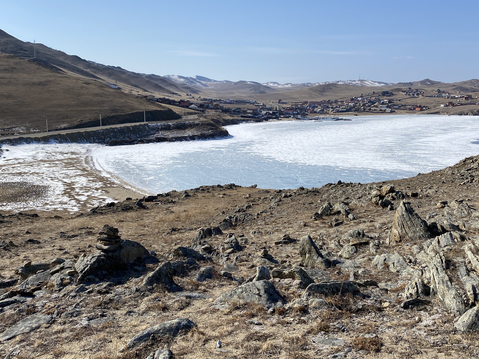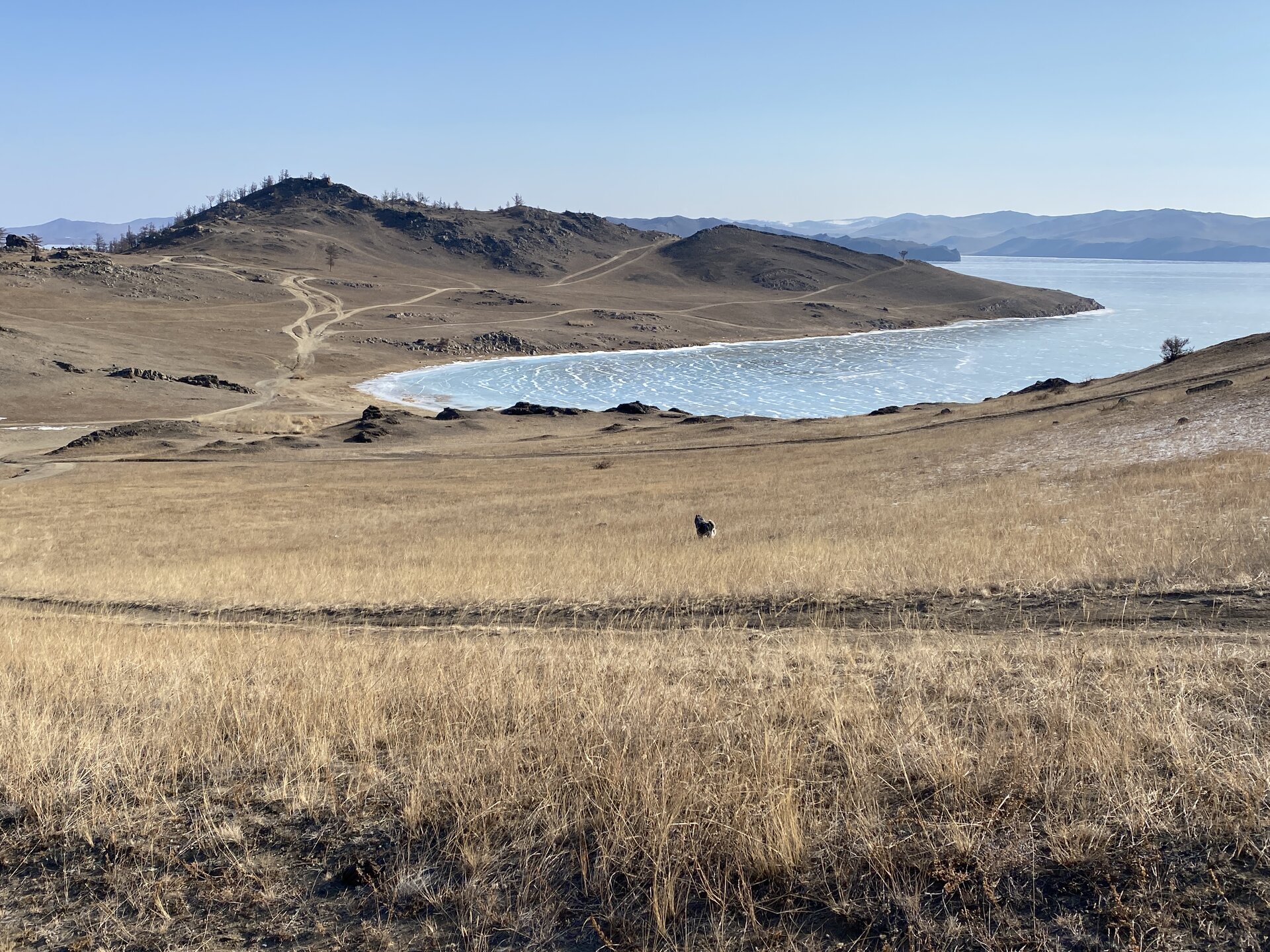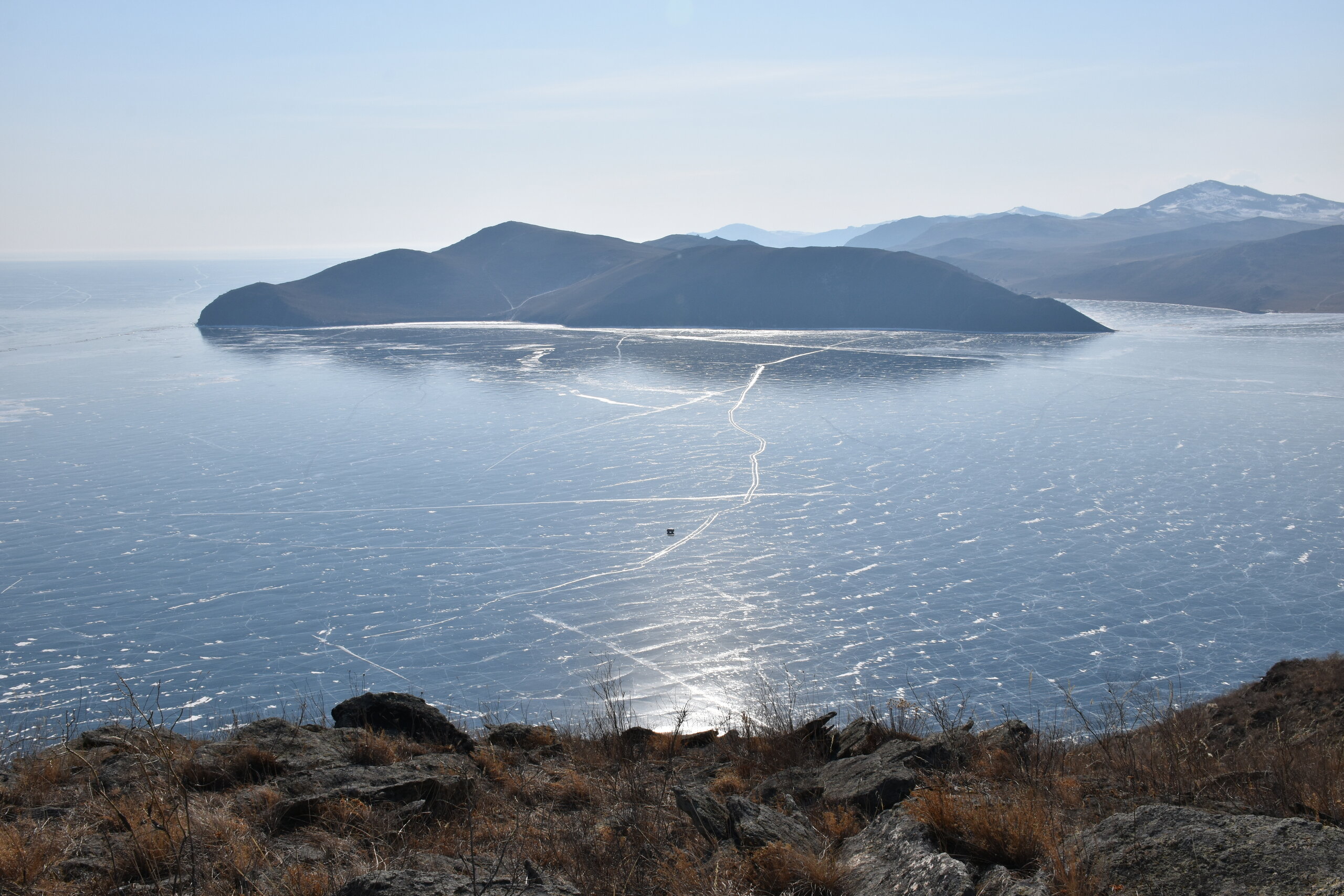 И вот мы по льду дошли до острова Ольхон. Летом именно здесь переправа и жизнь кипит. Сейчас же тишина! Полезли в горку ради красивых видов! Подъем небольшой, для меня совсем несложный (после треккингов на Кавказе).