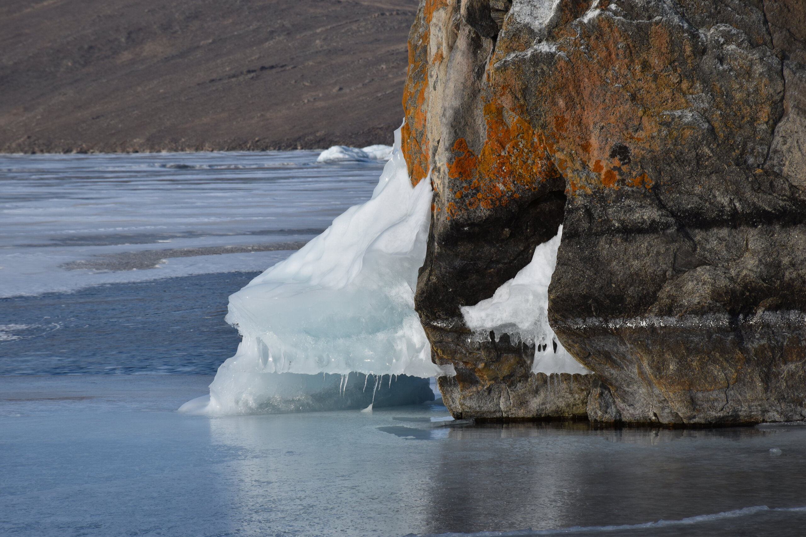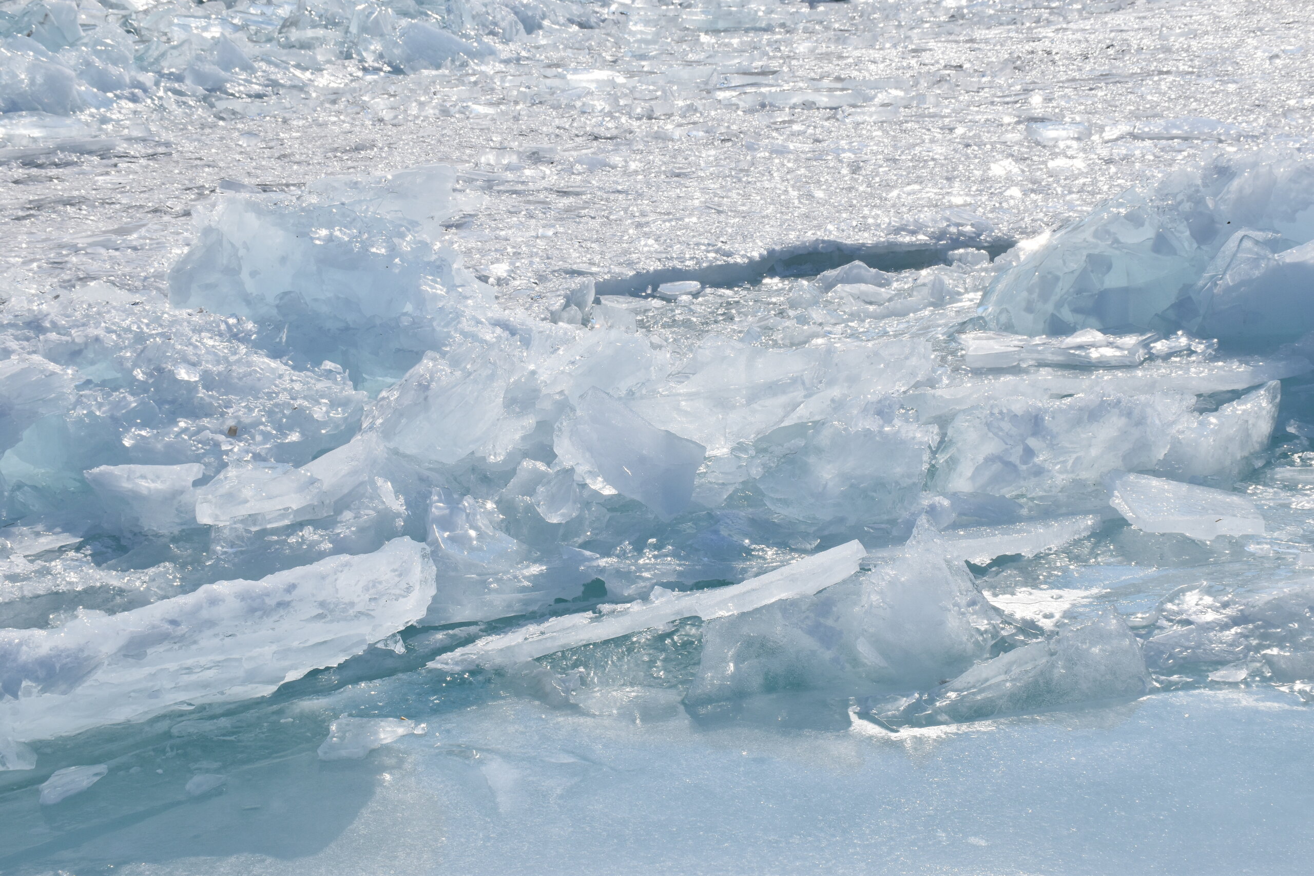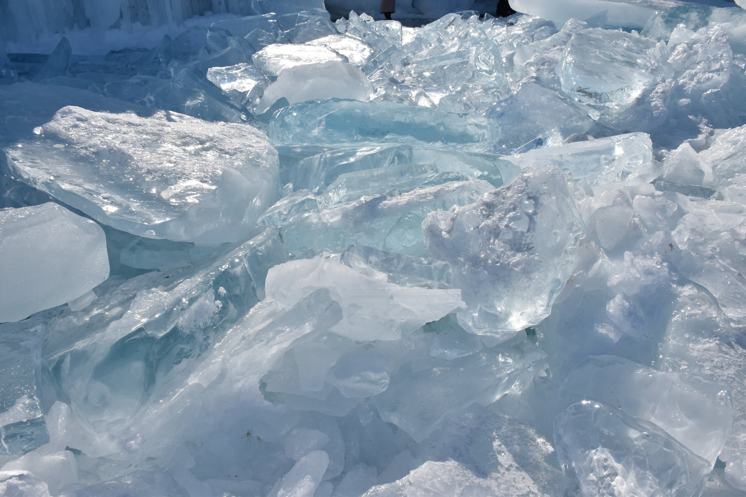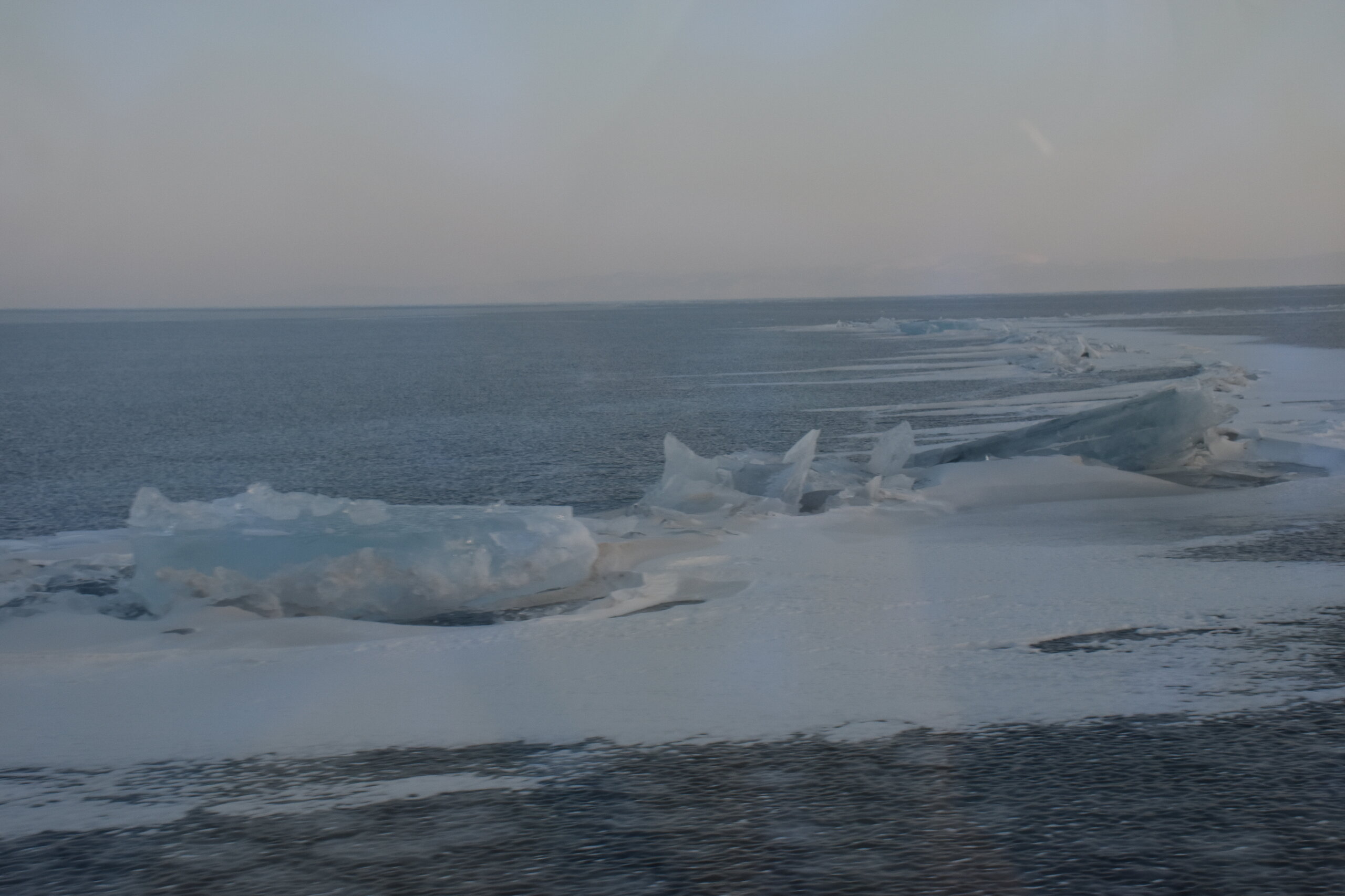 Здесь мы впервые увидели ледяные торосы — нагромождения льдин высотой до 10–20 метров. Торосы состоят из крупных кусков льдин и мелких осколков. На закате глыбы окрашиваются в розовые и золотые оттенки, ночью становятся серебристыми. Каждая плита имеет уникальную форму: от ровных кубов до причудливых обломков, напоминающих скульптуры. Торосы появляются, в основном, в начале зимы и ближе к весне. При этом, глыбы, сформированные зимой, крупнее весенних. Иногда можно встретить торосы изумительного бирюзового цвета, но чаще всего они имеют легкий, голубой оттенок.