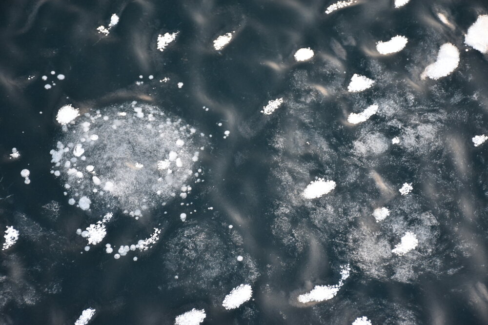 На обратном пути снова подошли к скалам. Я забрела в вязкое место и почувствовала себя на этой пропалине не очень комфортно. Быстренько вернулась на гладкий и твердый лед. По плану мы должны были вернуться в залив и пересесть там на хивус. Но капитан хивус созвонился с гидом и забрал нас на полпути. На хивусе мы подъехали к выходу из залива, где можно увидеть камни и рыбок.