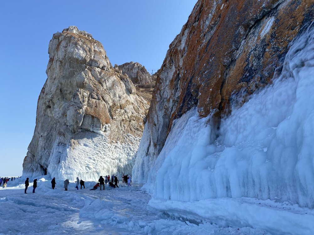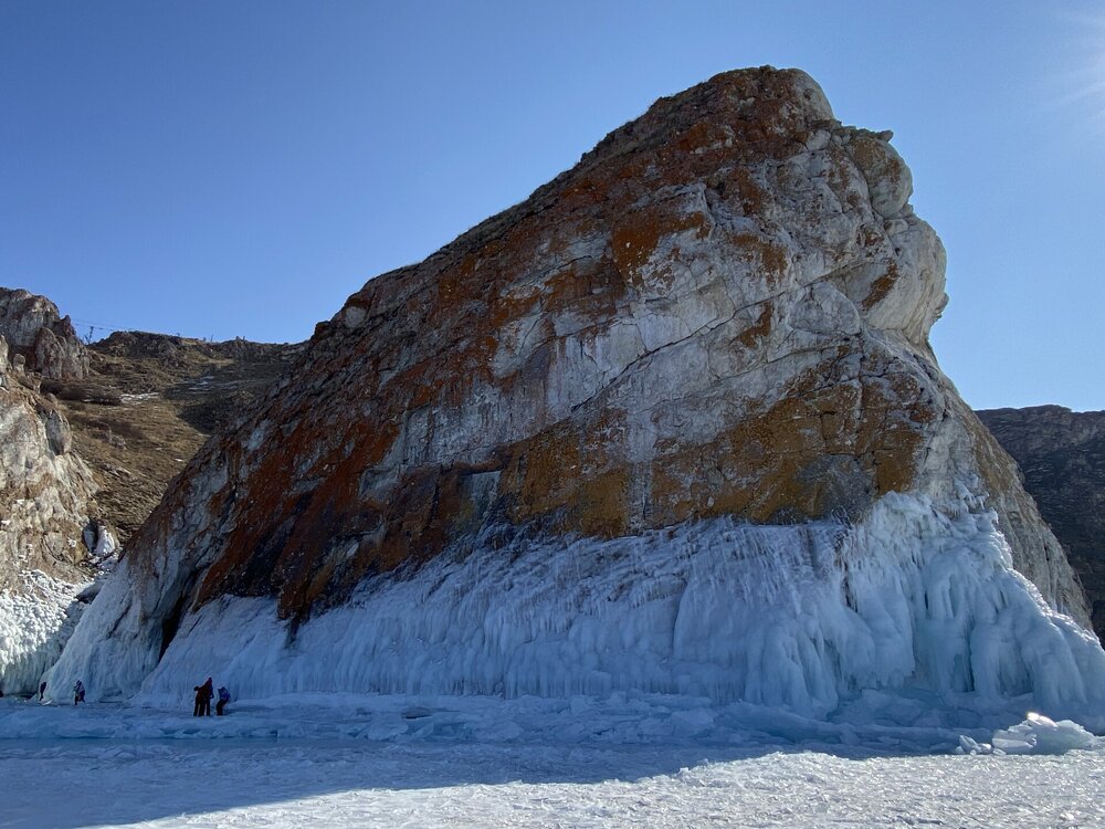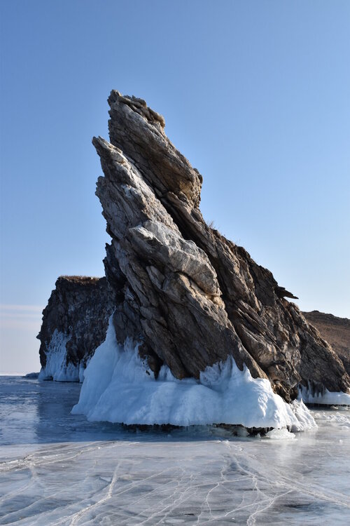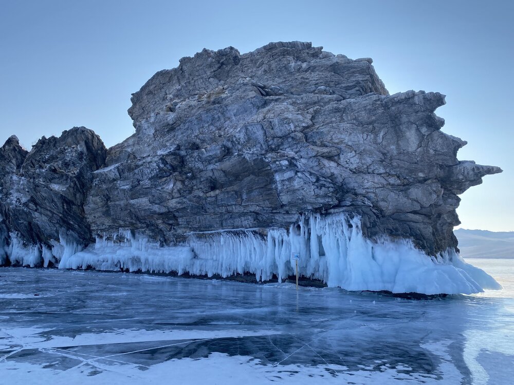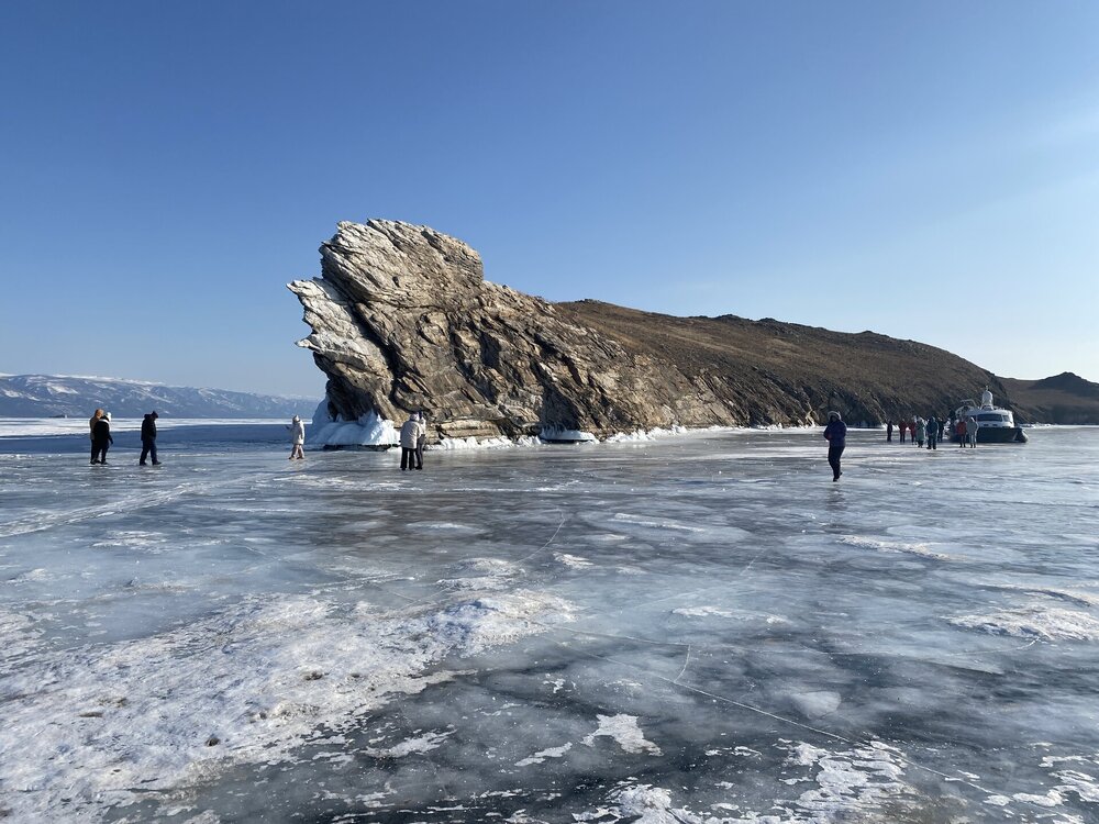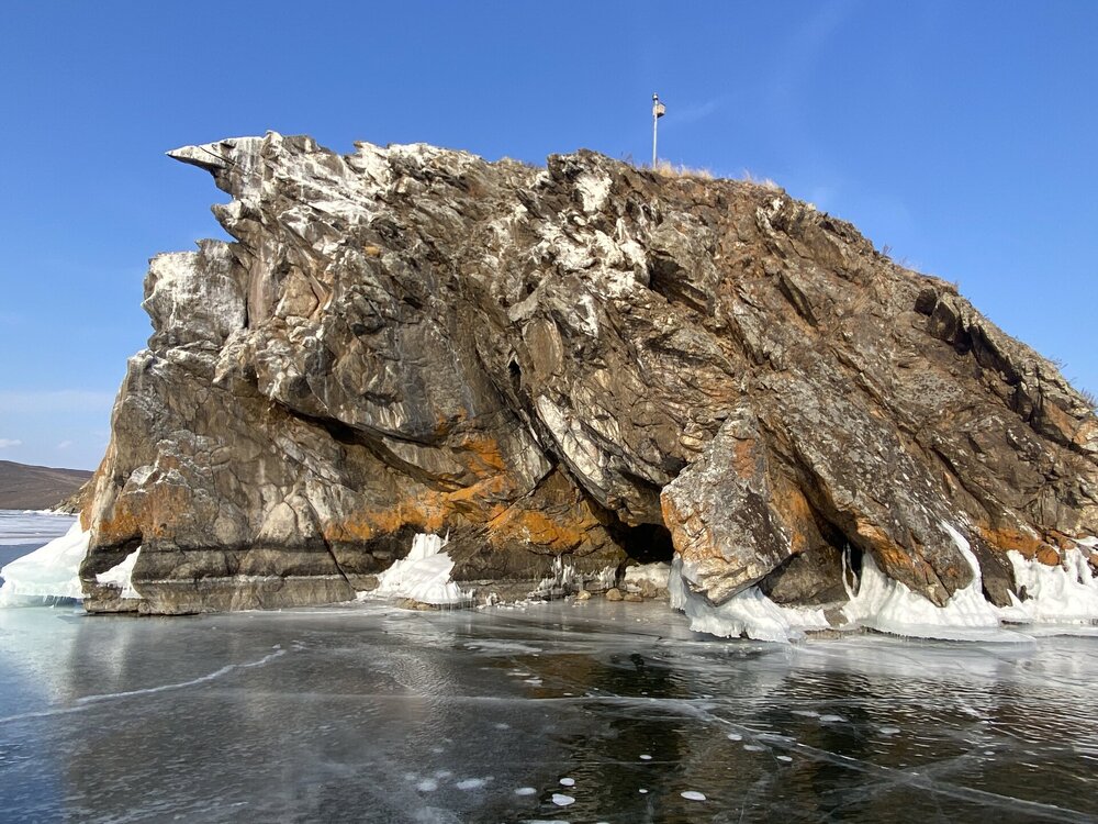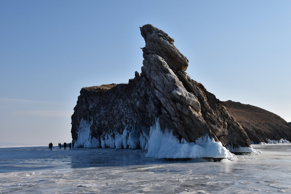 День 5. 13.03.2025 В программе этого дня - мыс Хобой (остров Ольхон), а также скалы «Три Брата», мыс Дракон (остров Огой), катание на фигурных коньках, «поцелуй Байкала» и очередной шикарный закат! Мыс Хобой – обязательный пункт зимнего путешествия на Байкал. Туры в это место невероятно популярны! Он находится на самом севере острова Ольхон. Это место окутано древними легендами и преданиями. «Музей Льда», «Царство Снежной королевы» – как только не называют наши туристы этот поход! Сегодня посетим ледяные замки и гроты, заглянем в ледяные пещеры и сфотографируем причудливые наплески на скалах. Также на мысе Хобой увидим знаменитые, голубые громадины-льдины Байкала. Это невероятное зрелище!! Активная часть треккинга: 5,2 км пешком, перепад высот 450-510 м, продолжительность похода 8 часов. Сегодня много времени провели в дороге, а вот ходили совсем мало. Мне это не очень понравилось, но по-другому красоты севера Ольхона не увидишь. Длина острова – 73,5 км, наш отель у его южного конца, так что добираться до северного конца прилично. Как добираются до мыса Хобой зимой: по льду или суше? Это вопрос заинтересовал меня при подготовке к туру, четкую информацию так и не нашла. Поэтому отвечаю для таких же любопытных. На хивусах - по льду (причем даже от Листвянки), они безопасны. А вот на буханках в зависимости от ледовой обстановки. Если лед ненадежный (много торосов, пропарин, тонкий лед) то едут по земле, если уверены в надежности льда – по льду. Ледовую обстановку водители узнают от своих коллег, местные все знают и сообщают друг другу о появлении торосов и прочих проблем. Нам повезло, и мы ехали по гладкому льду: до Хужира по официальной ледовой дороге, потом через поселок по земле. Выехали на землю недалеко от причала, до мыса Бурхан, и обратно на лед вернулись немного дальше Хужира (предполагаю у поселка Харанцы). И до мыса Хобой уже ехали по льду, дальше берег имеет высокие скалы. Передвигались по Малому морю. Обратно тем же путем. Наш транспорт на сегодня – буханка. На ней мы ездили во всех 2 поездках на Ольхон. Первая остановка у мыса Дракона. Это самая западная точка острова Огой. Выступающие породы кварца, гранита и известняка расположились таким образом, что образовали голову и фигуру фантастического существа. О Драконе рассказывают легенды и предания, что якобы застыл он, пытаясь вырваться из овладевшего им камнем, но так и замер в полете. Теперь величественный Дракон охраняет близлежащие населенные пункты, и местные жители с большим уважением относятся к своему хранителю. Огромное каменное чудовище возлегает среди холодных льдов Байкала, недоверчиво наблюдая за суетой туристов сквозь прикрытые веки. Ощущение, что Дракон вот-вот проснётся! И даст всем жару. Картинка как из какого-то фэнтези. Очень зловеще и красиво одновременно. А зная, что на спине Дракона стоит та самая Белая ступа с запечатанной древней энергией, сюжет становится ещё интереснее.
