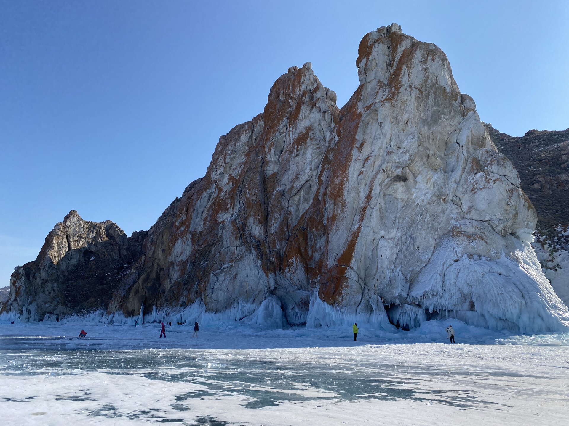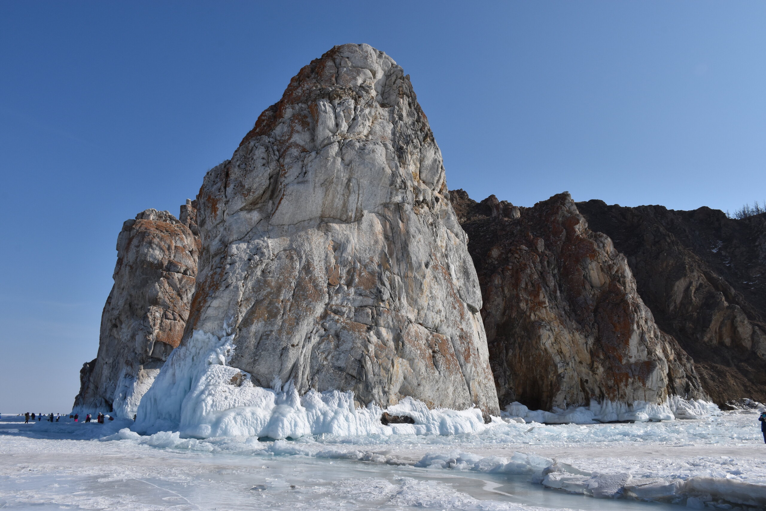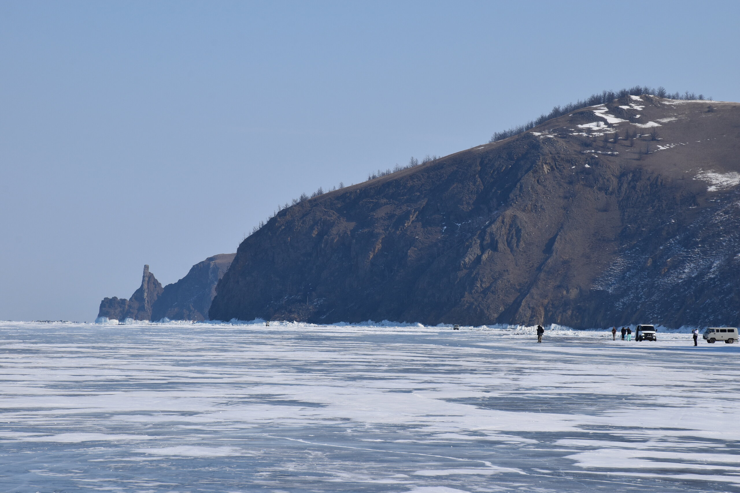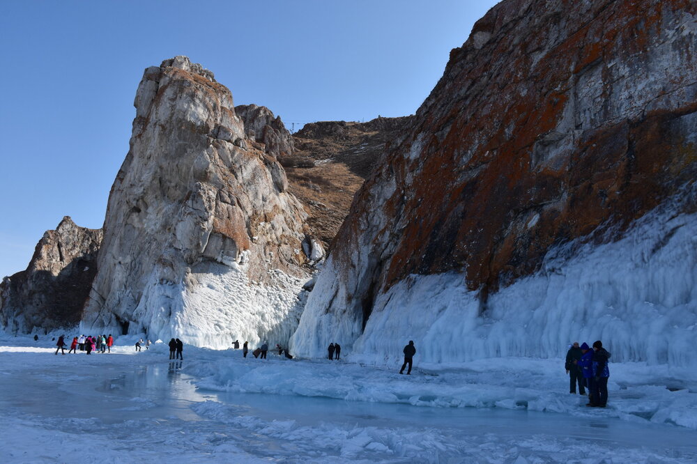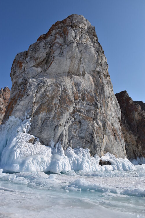 День 5. 13.03.2025 В программе этого дня - мыс Хобой (остров Ольхон), а также скалы «Три Брата», мыс Дракон (остров Огой), катание на фигурных коньках, «поцелуй Байкала» и очередной шикарный закат! Мыс Хобой – обязательный пункт зимнего путешествия на Байкал. Туры в это место невероятно популярны! Он находится на самом севере острова Ольхон. Это место окутано древними легендами и преданиями. «Музей Льда», «Царство Снежной королевы» – как только не называют наши туристы этот поход! Сегодня посетим ледяные замки и гроты, заглянем в ледяные пещеры и сфотографируем причудливые наплески на скалах. Также на мысе Хобой увидим знаменитые, голубые громадины-льдины Байкала. Это невероятное зрелище!! Активная часть треккинга: 5,2 км пешком, перепад высот 450-510 м, продолжительность похода 8 часов. Сегодня много времени провели в дороге, а вот ходили совсем мало. Мне это не очень понравилось, но по-другому красоты севера Ольхона не увидишь. Длина острова – 73,5 км, наш отель у его южного конца, так что добираться до северного конца прилично. Как добираются до мыса Хобой зимой: по льду или суше? Это вопрос заинтересовал меня при подготовке к туру, четкую информацию так и не нашла. Поэтому отвечаю для таких же любопытных. На хивусах - по льду (причем даже от Листвянки), они безопасны. А вот на буханках в зависимости от ледовой обстановки. Если лед ненадежный (много торосов, пропарин, тонкий лед) то едут по земле, если уверены в надежности льда – по льду. Ледовую обстановку водители узнают от своих коллег, местные все знают и сообщают друг другу о появлении торосов и прочих проблем. Нам повезло, и мы ехали по гладкому льду: до Хужира по официальной ледовой дороге, потом через поселок по земле. Выехали на землю недалеко от причала, до мыса Бурхан, и обратно на лед вернулись немного дальше Хужира (предполагаю у поселка Харанцы). И до мыса Хобой уже ехали по льду, дальше берег имеет высокие скалы. Передвигались по Малому морю. Обратно тем же путем. Наш транспорт на сегодня – буханка. На ней мы ездили во всех 2 поездках на Ольхон. Первая остановка у мыса Дракона. Это самая западная точка острова Огой. Выступающие породы кварца, гранита и известняка расположились таким образом, что образовали голову и фигуру фантастического существа. О Драконе рассказывают легенды и предания, что якобы застыл он, пытаясь вырваться из овладевшего им камнем, но так и замер в полете. Теперь величественный Дракон охраняет близлежащие населенные пункты, и местные жители с большим уважением относятся к своему хранителю. Огромное каменное чудовище возлегает среди холодных льдов Байкала, недоверчиво наблюдая за суетой туристов сквозь прикрытые веки. Ощущение, что Дракон вот-вот проснётся! И даст всем жару. Картинка как из какого-то фэнтези. Очень зловеще и красиво одновременно. А зная, что на спине Дракона стоит та самая Белая ступа с запечатанной древней энергией, сюжет становится ещё интереснее.