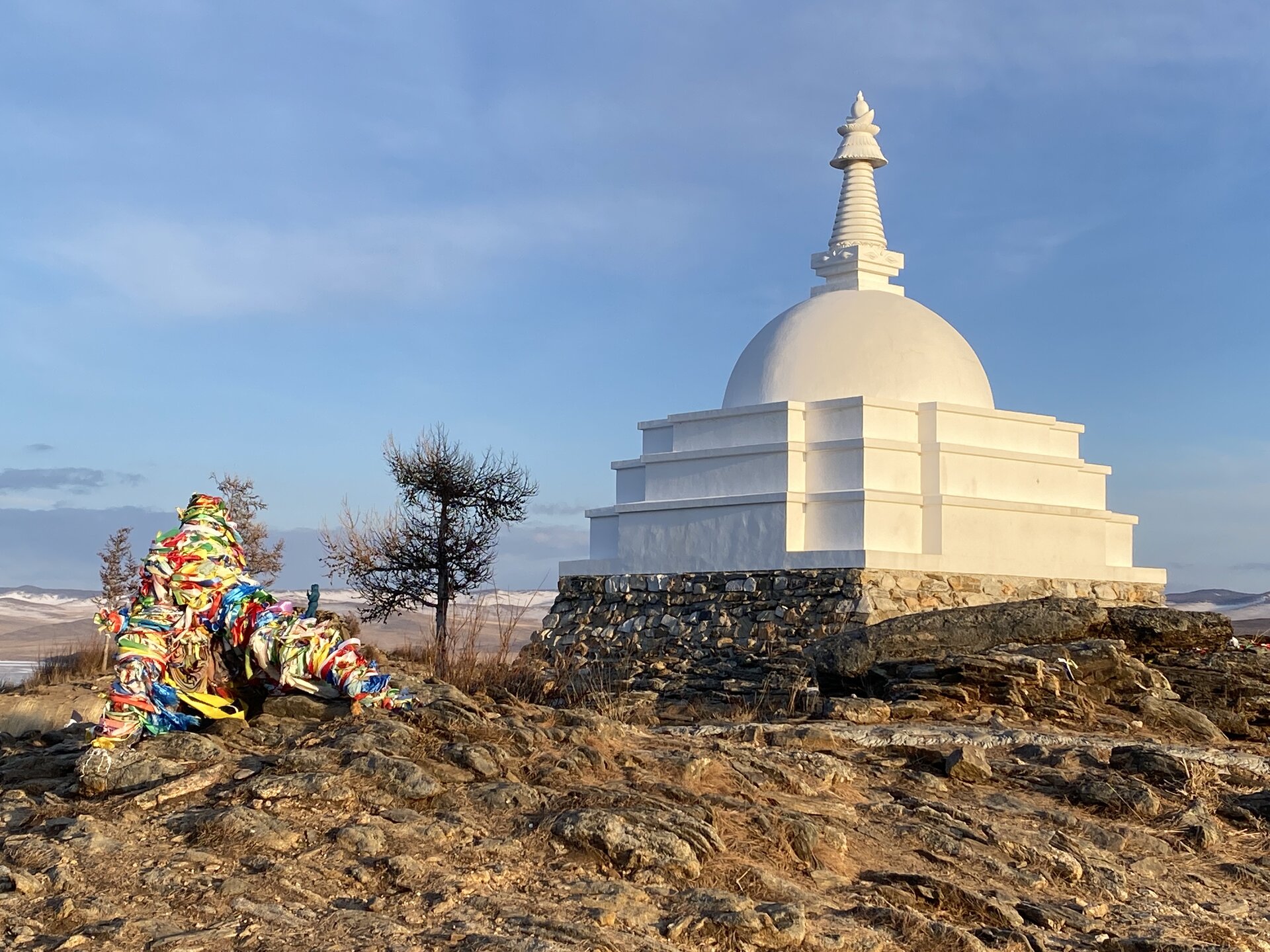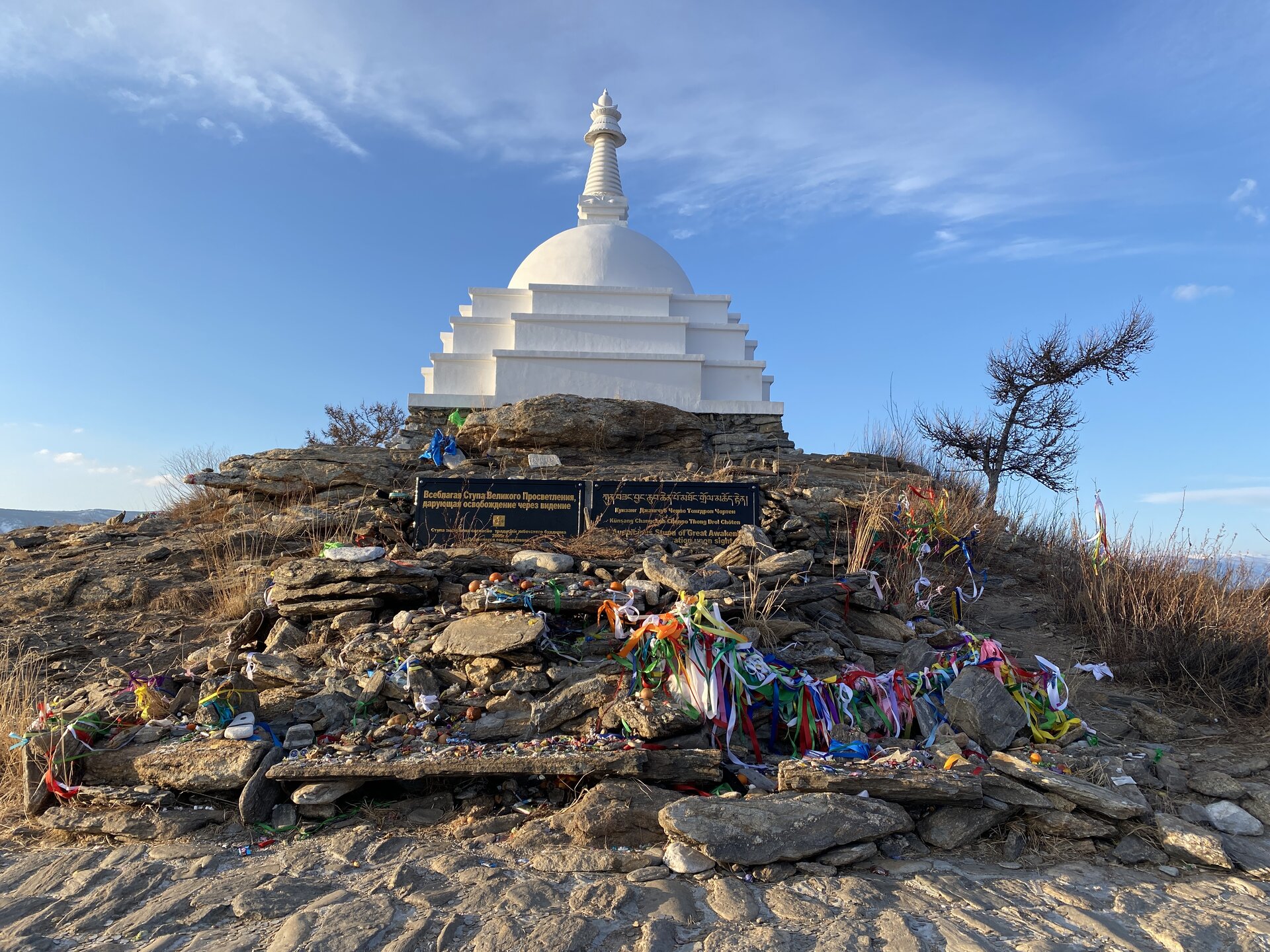 В 2005 г. по инициативе московского буддийского центра на острове Огой возвели Ступу Просветления, посвященную самой гневной дакине — женскому духу, носительнице тайных учений — Трома Нагмо. В переводе с санскрита «ступа» обозначает «вершина», «верхушка». Считается, что прототипом ступы были могильные курганы, которые стоили в честь умерших. В строительстве пагоды участвовали волонтеры со всего мира: Екатеринбурга, Москвы, Лондона, Нью-Йорка. Руководил возведением лама из Бутана, строивший пагоду в Бутане по заказу бутанского короля. В основание Ступы было заложено 750 кг буддийских текстов, 2,5 тонны мантр, частицы волос и крови Будды Шакьямуни, частицы мощей сорока тибетских тантристов, горсти земли из Иордании, Египта, Израиля, Мексики, России, вода всех океанов, бронзовая статуэтка Трома Нагмо, зерна пшеницы, гречки и даже элементы ржавых корпусов авиабомб времен мировой войны. Считается, что это делает пагоду своеобразной башней-излучателем энергии тонкого мира. Ступа имеет пять составляющих частей. Каждая их них соответствует фундаментальным элементам. Основание Ступы символизирует землю, ступени — воду, купол — огонь, шпиль — ветер, навершие — пространство. Рядом со Ступой есть небольшой диванчик из камней с наброшенным на него одеялом и смотровая площадка с небольшим маяком. По центру каменной площадки на глыбе вырезан буддистский символ. Здесь туристы оставляют подношения духам острова. По дорожке, ведущей к Ступе Просветления, можно увидеть небольшие каменные пирамидки желаний. Это дело рук туристов, приезжающих на остров. Каждая пирамидка самобытна и неповторима. Есть те, что сложены из больших камней, есть такие, в которых большие чередуются с маленькими, а есть и просто сложенные «стопочкой» каменные пластины. Считается, что, когда пирамидка разрушается порывом ветра, желание, загаданное при ее строительстве, сбывается. Правда, есть и обратная сторона романтического поверья: многие приезжие для постройки пирамидки выкапывают камни из земли, что наносит вред природе острова. 107 раз вокруг Ступы мы не ходили. По туристическому преданию, если вокруг Ступы пройти три круга и загадать желание, оно обязательно сбудется.