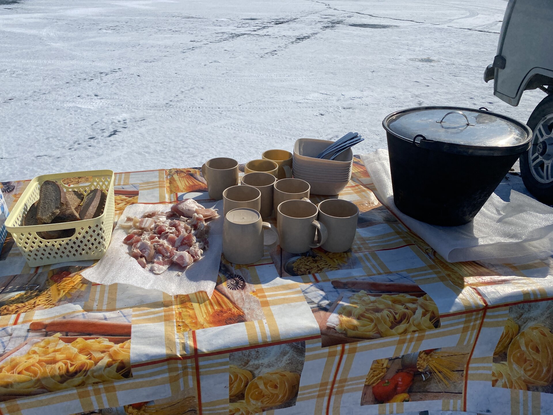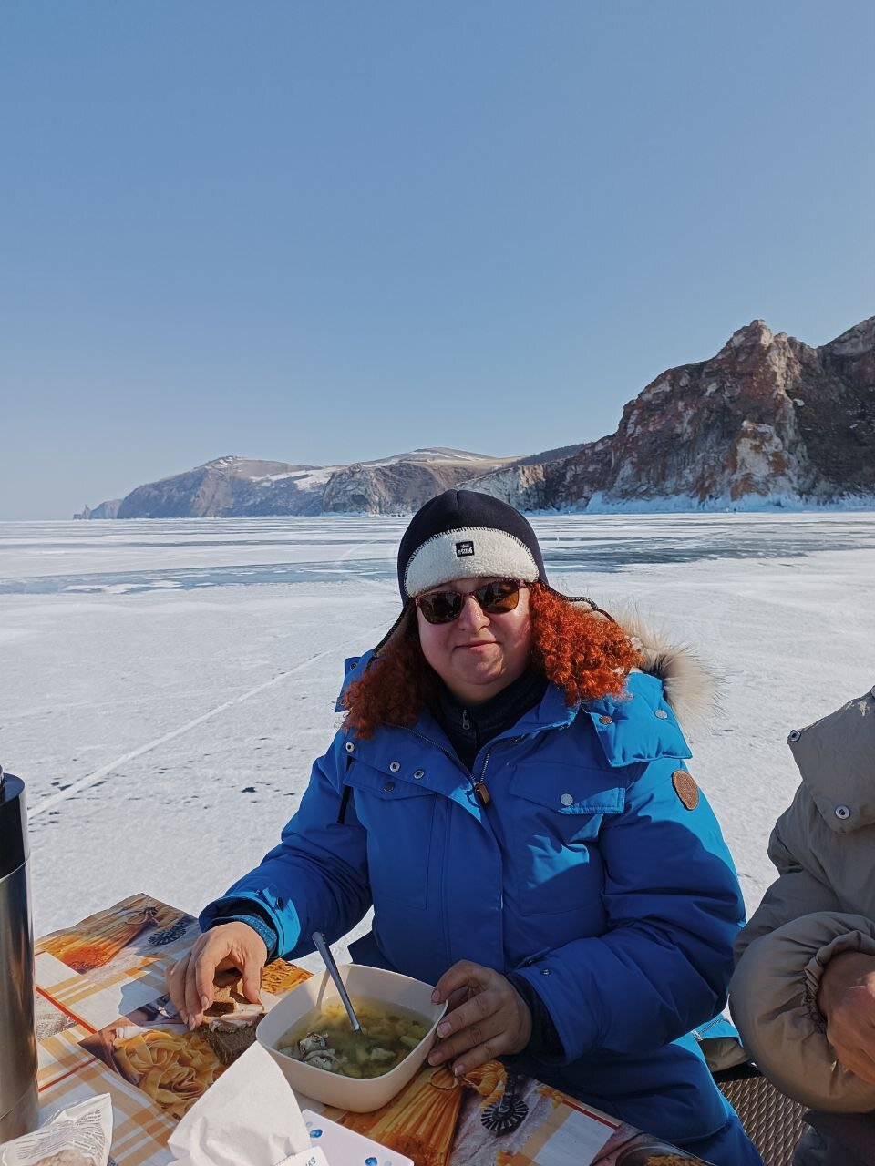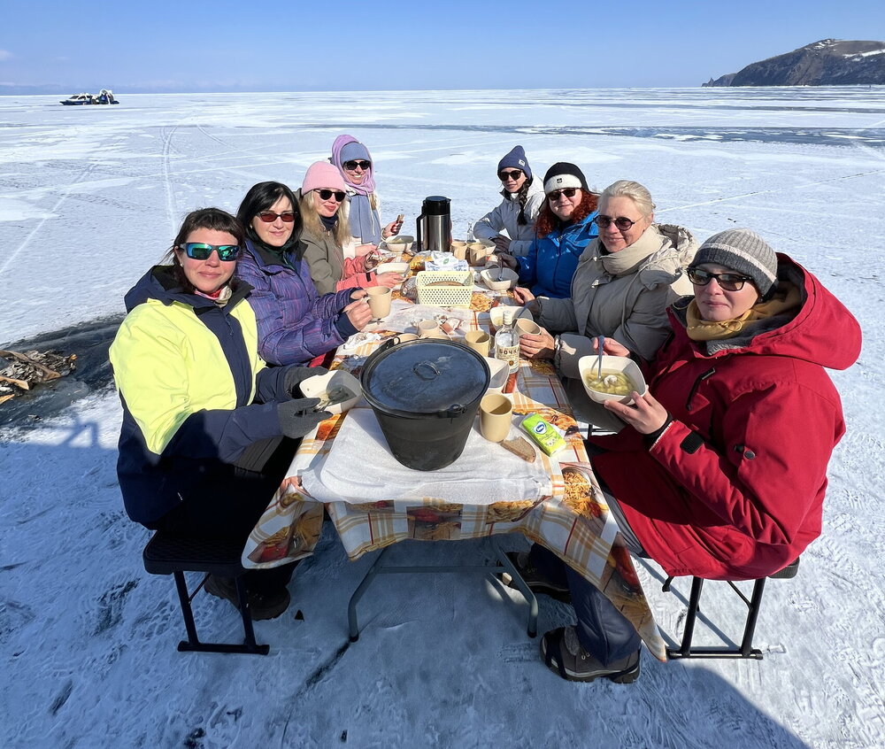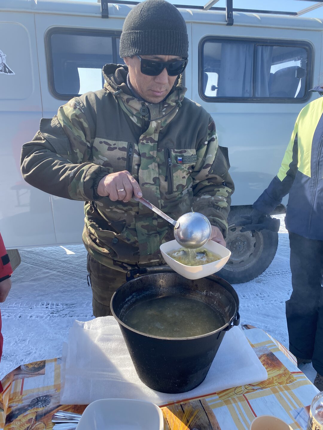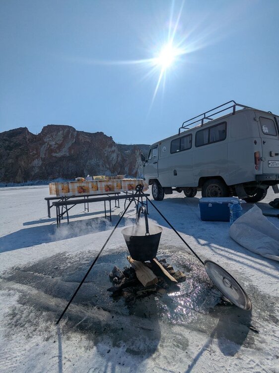 На обед сегодня уха. Ее традиционно готовят водители буханок на экскурсиях к мысу Хобой. Горячий суп на морозе - лучший обед! Вкусно!!!