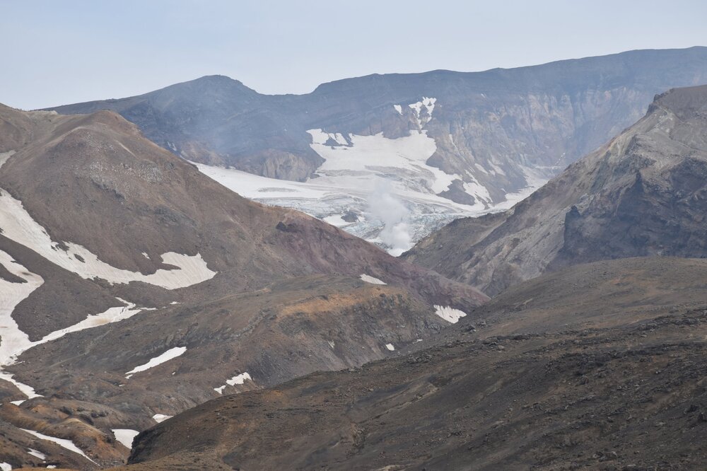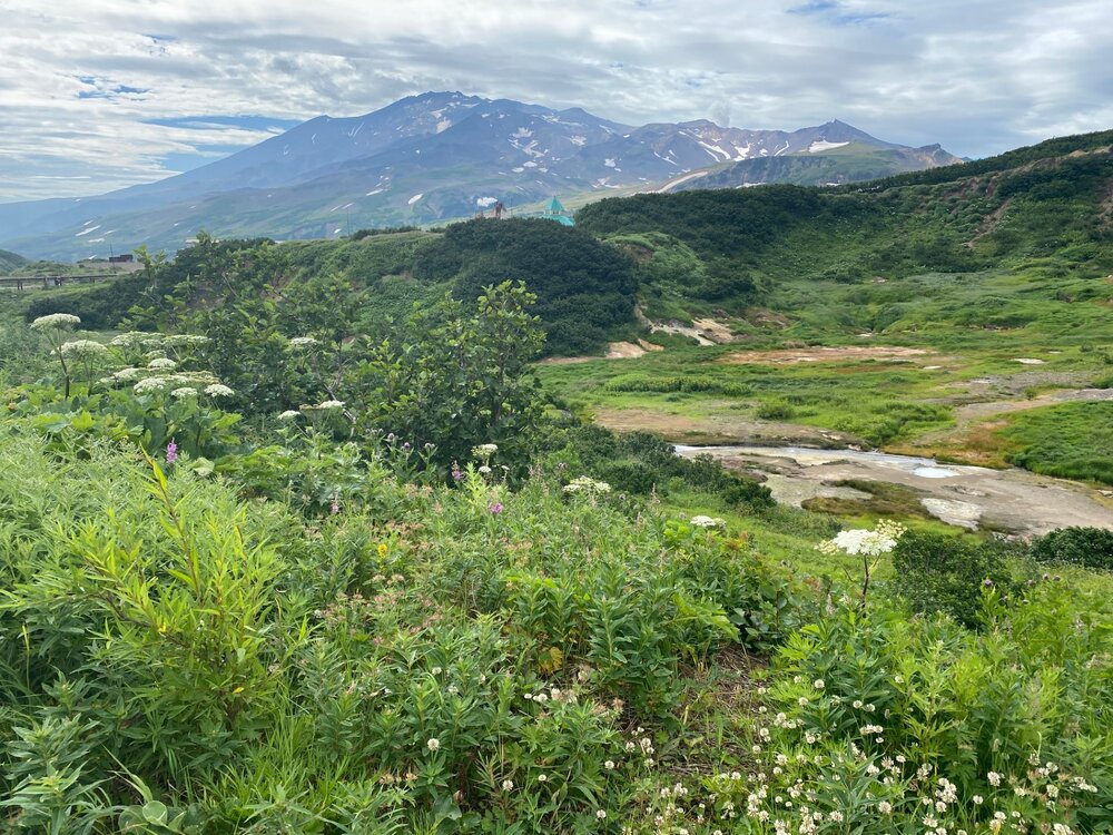 День 4. 17.08.2023. Горный турприют - Малая долина гейзеров - переезд в Паратунку Программа: «После завтрака выезжаем к Мутновской геотермальной электростанции, рядом с которой находится Малая долина гейзеров (Дачные горячие источники). Здесь вдоль горного ручья из-под земли бьют множество горячих ключей и фумарол. При желании можно принять ванну в купальне с голубой глиной. Осмотрев кратеры, спускаемся к машине и едем к водопаду "Косы Вероники", после его осмотра возвращаемся на турбазу пообедать, после чего переезжаем в гостиницу в курортной зоне Паратунка, купание в бассейне с термальной водой». Сегодня у нас приятные и легкие прогулки, но треккинговые палки гид все равно советует брать с собой. После завтрака отправляемся к вулкану Мутновский, в этот раз к другому его боку. Дачные горячие источники или Малая долина гейзеров – это не замена вертолетной экскурсии в долину гейзеров! Здесь у Мутновки нет гейзеров, хотя непрофессионалу сложно увидеть разницу. Действительно эта долина немного напоминает знаменитую долину гейзеров и кальдеру Узон, но масштаб совсем другой, миниатюрный. Мне понравились Дачные горячие источники, особенно впечатлили изумрудно-зеленые склоны гор, снег на вершинах и красавец вулкан Мутновский!!! Но я не буду сравнивать две совершенно разные экскурсии. Если уж забрался так далеко на восток страны, то стоит увидеть все своими глазами и составить собственное мнение! Я была счастлива во всех местах Камчатки!!! И совершенно не жалею о потраченных деньгах. Еще мы побывали на водопаде «Косы Вероники», также его еще называют «Спокойный». Он находится недалеко от нашей базы у вулкана Вилючинский. После небольшой прогулки отправились на обед. А после обеда был переезд в цивилизацию – в отель Гелиос Паратунки. Отличный вечер – термальные источники, вино/коньяк…, задушевные разговоры. В отели нас накормили вкусным ужином, а на следующий день и завтраком. Гиды ночевали у себя дома, но отдохнуть им не удалось. Они собирали вещи на Толбачик – палатки, спальники (для себя и тех, кто не взял свой), пенки, газовые болоны, продукты питания, питьевая вода… Наш день: 08.00 – завтрак 09.00 – выезд с вещами (на базу в обед заехала новая группа, поэтому комнаты мы освободили утром, все загрузили в нашу вахтовку, но на обед вернулись на базу). 09.40 – приехали на Дачные источники. Здесь имеется хороший туалет. Цивилизация! Провели в Малой долине гейзеров около 2 часов, погуляли, посмотрели на выходы фумарол. Здесь имеется небольшой участок резкого подъема, так что палки с собой лучше брать. Хотя большую часть пути, я их заталкивала в рюкзак. Еще желающие искупались в купальне. Я не стала мочить купальник ради 10 мин. Вечером нас ждали более комфортные бассейны. 12.15 – выехали с Дачных источников. По дороге сделали остановку на фотопаузу с видом на Вилючинский вулкан. 13.10 – 14.10 – прогулка к водопаду «Косы Вероники». Далее вернулись на базу. 14.30 - обед на базе Мутновка, прощание с базой. Едем в цивилизацию! На подъезде к Паратунке появилась связь, и все кинулись писать, звонить родным и читать новости) 15.00 – выехали с базы Мутновка. По дороге сделали остановку у продуктового магазина. 16.15 – в отеле «Гелиос». Заселение здесь без всяких формальностей, никаких паспортов и прочих глупостей в виде анкет. Называешь свою фамилию, а тебе номер комнаты, ключи в д