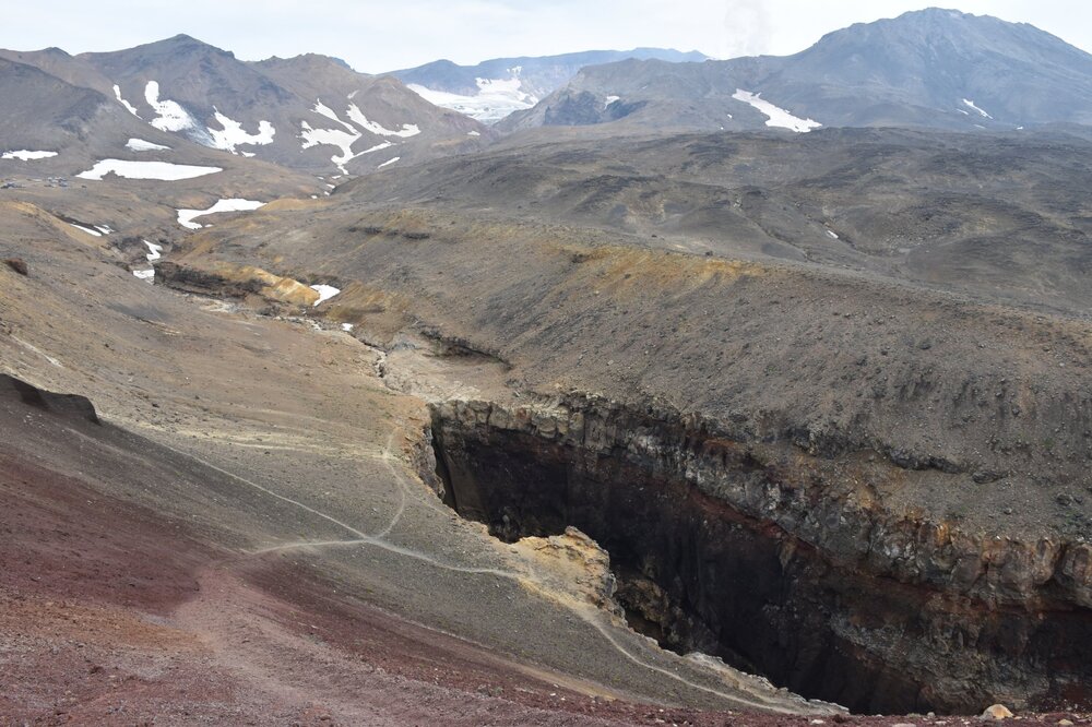 Каньон Опасный Одним из самых красивых и впечатляющих природных памятников, связанных с Мутновским, является каньон «Опасный». Из ледников вулкана берет свое начало река Вулканная. Она течет вниз, захватывая по пути и растворяя в себе множество элементов, образовавшихся в результате вулканизма. Ее русло образовано из лавовых материалов. Вулканная затем втекает в реку Мутную, которая, в свою очередь, несет воды в океан. От подножия вулкана надо пройти вниз по течению реки Вулканной. Стекая по склону, она образует 80-метровый водопад, формируя глубокий овраг, в котором большая наледь. Глубина каньона — около 120 метров.