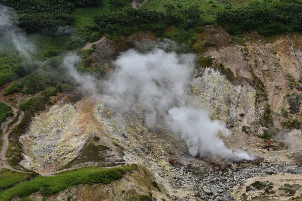 Дачные горячие источники или Малой долиной гейзеров Дачные горячие источники расположены районе вулкана Мутновский, в нескольких километрах к востоку от перевала между горами Скалистая и Двугорбая. Здесь, на горных ландшафтах, открываются живописные панорамные виды на вулканы, луга и снежники. Одной из главных достопримечательностей этих мест является Мутновская Геотермальная электростанция — местный ориентир для похода к месту назначения. Мутновская сопка или просто Мутновка является действующим вулканом с огромным выбросом энергии в виде фумарольных полей. Фумаролы в свою очередь — это трещины или отверстия в земной коре, созданные природой, через которые происходит выход горячего пара и газов, растворенных в расплавленной магме. Данный процесс практически всегда сопровождается шумом и свистом, т.к. парогазовая смесь выходит наружу с температурой около 95°С. Этим большим термальным месторождением питаются и Дачные горячие источники. Свою известность источники приобрели с 60х годов XX века, когда и были обнаружены экспедицией вулканологов Т.П. Кирсановых. К тому времени были известны четыре группы выходов термальных вод. Третья по счету потеряла свой функционал, её воды остыли. Остальные горячие источники попали под строительство ГеоЭС и считаются утраченными. На сегодняшний день во всех свои красках «работает» лишь крайняя четвертая группа, расположившаяся к западу, которая и носит название Дачных термальных источников на Камчатке. Представляет она собой активное фумарольное поле из пяти групп. Все они растянулись вдоль крутых склонов вулканического разрушенного оврага на сотни метров. Его левый обрыв содержит нагретые площадки, паровые котлы и маленькие струи пара. Самый мощный фонтан находится в круглой котловине с обрывистыми стенками высотой до 30 м и относится к группе Активной (Котел). Остальные четыре разбросаны по ровным и заболоченным участкам. Среди этого раздолья выделяется больше 100 струй пара. Второе название термальных выходов — Малая Долина Гейзеров. Возникло оно благодаря горячим газам, проходящим сквозь холодные ручьи, создающие эффект фонтанирования и парящей земной поверхности. Однако настоящих гейзеров в этом месте нет. Химический состав парогазовый струй достаточно разнообразный и содержит медь, марганец, цинк, мышьяк, сурьму и радон. Последний элемент особо концентрирован в выбросах самой северной группы под названием Медвежья. Путь к источникам пролегает по тропе в обход электростанции. Сначала мы попадем на "Утиную группу" Дачных горячих источников, где вдоль небольшого ручья бьют множество горячих ключей. Затем, продолжая путь, пройдем мимо купальни с голубой глиной, в которой при желании можно будет искупаться на обратном пути. Далее переходим через глубокий распадок и попадаем на Активную воронку - самую мощную группу Дачных источников, которую и называют Малой или Мини Долиной гейзеров. Купаемся, затем возвращаемся к машине, обедаем. Рядом с вулканом Мутновским, у северо-восточной его части располагается мутновская геотермальная электростанция (ГеоЭС). Используя природное тепло земли (энергию вулкана), станция вырабатывает электрическую энергию мощностью 50 МВт. На полуострове располагается несколько геотермальных электростанций, которые покрывают до 30% потребностей эне
