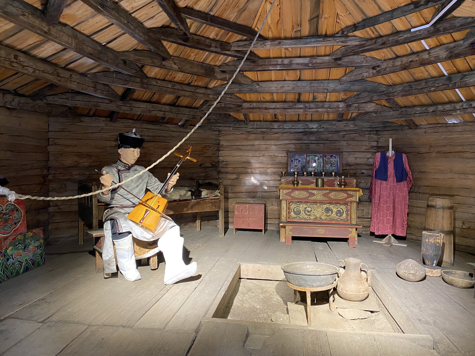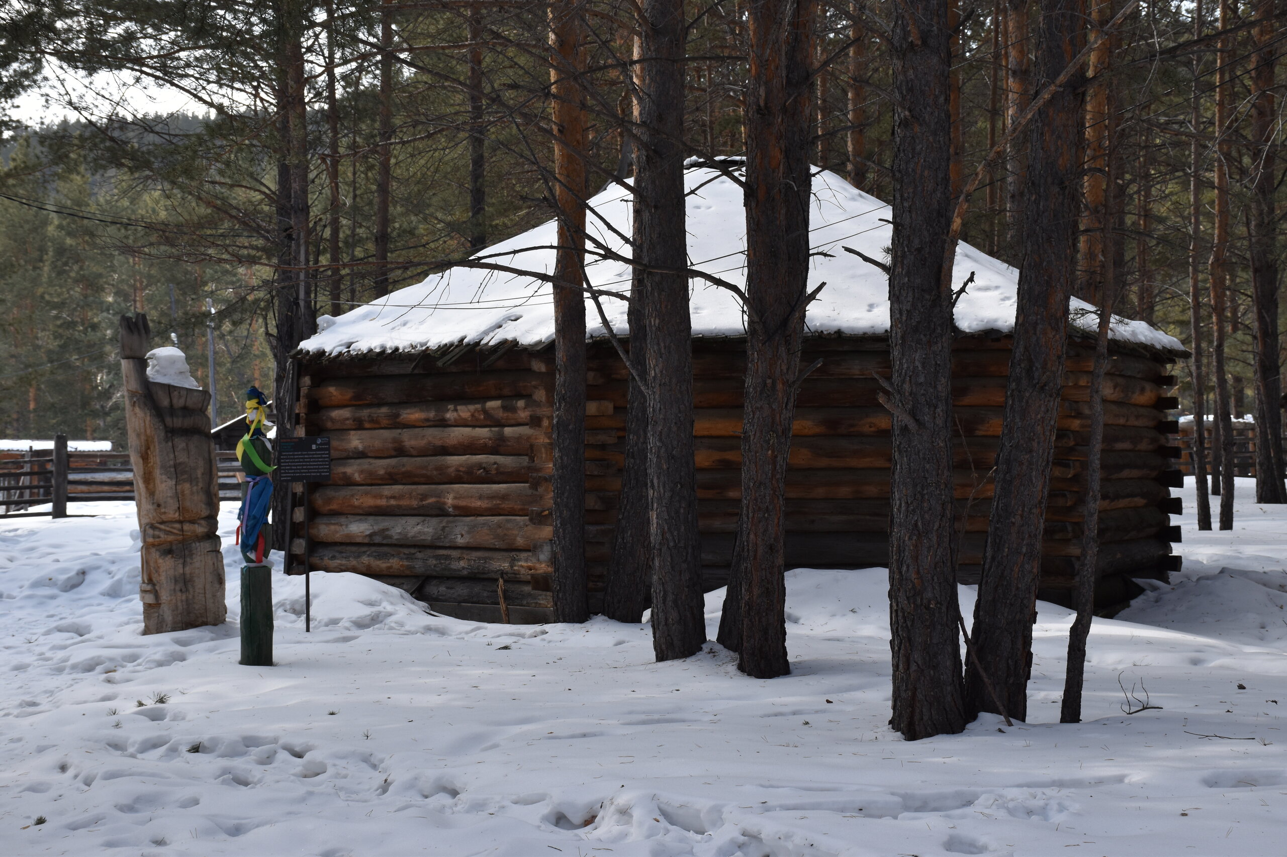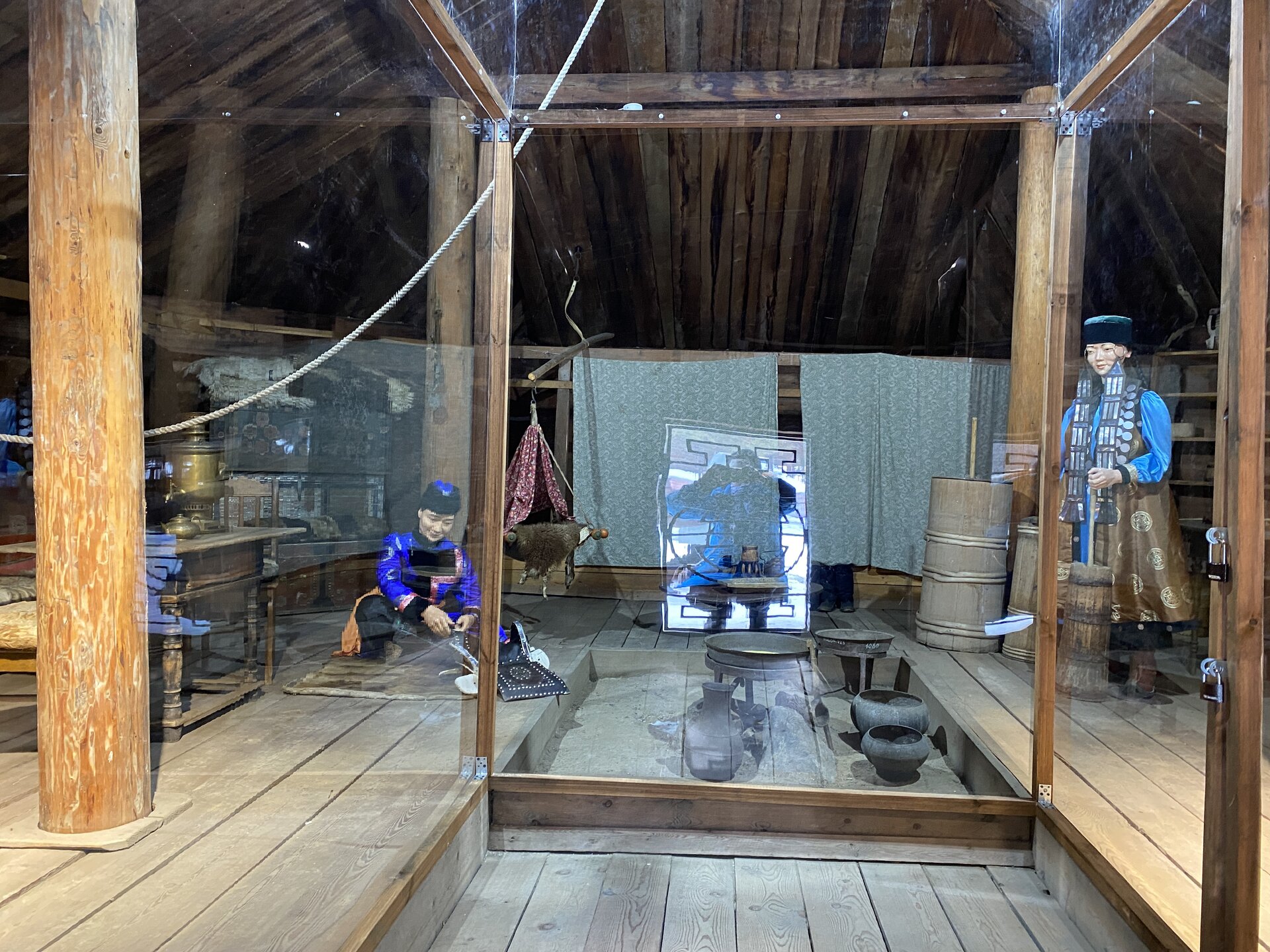 Бурятский комплекс состоит из предбайкальского и забайкальского секторов. Экспозиции Бурятского предбайкальского комплекса включают в себя зимнюю усадьбу богатого бурята, состоящую из жилой избы, двухкамерного амбара, четырехстенной деревянной юрты, навеса, летней кухни, завозни, а также зимнюю усадьбу бедного бурята (зимний дом, амбар, четырехстенная юрта и загоны для скота). Кроме того, в этом секторе представлены традиционные типы деревянных юрт. В центре двора стоит четырехстенная летняя юрта с открывающимся дымоходом, которая являлась обязательным компонентом любого двора. Зимой юрта могла служить амбаром, кладовкой, а ранней весной в нее семья переселялась жить до перекочевки на летники. Жили в летней юрте и осенью после перекочевки с летников до наступления холодов. Сейчас в юрте восстановлен традиционный интерьер. В восточном углу усадьбы расположена еще одна восьмистенная юрта, служившая кухней в летнее время. Между этими юртами расположен летний крытый навес с кожемялками разного вида. Одежда, обувь, постельные принадлежности, предметы домашнего обихода шились из кожи после их тщательной обработки по давно сложившейся технологии. Мы посмотрели на внутреннее убранство летней кухни (лупаарин) и летней юрты.