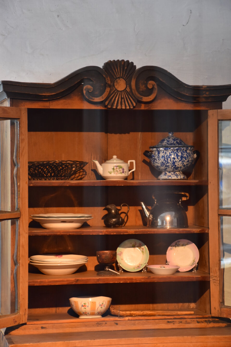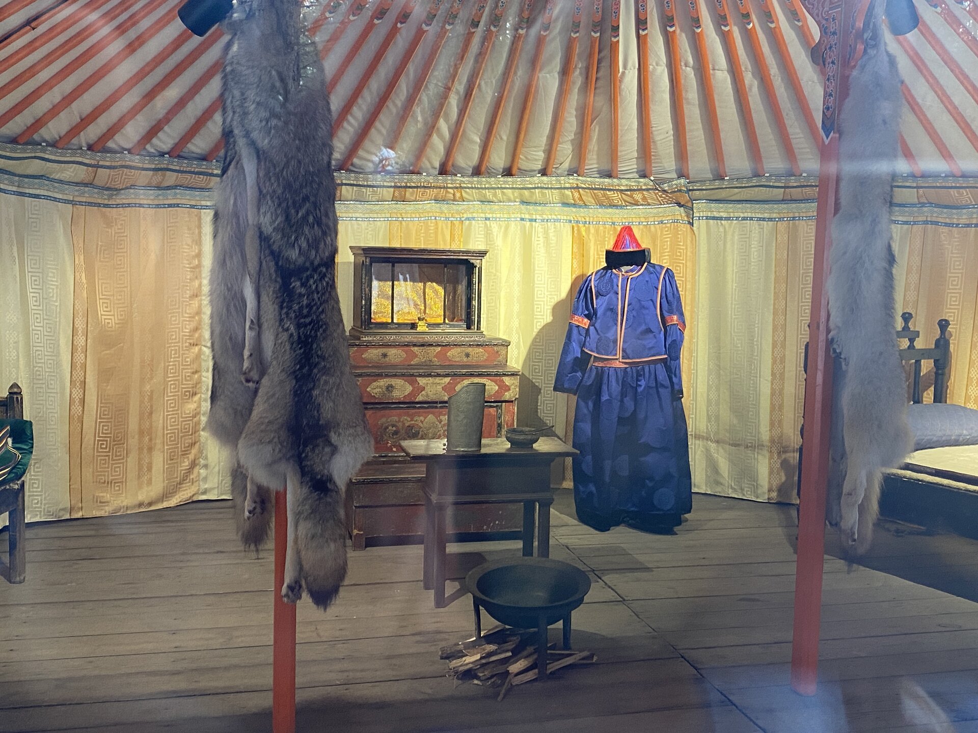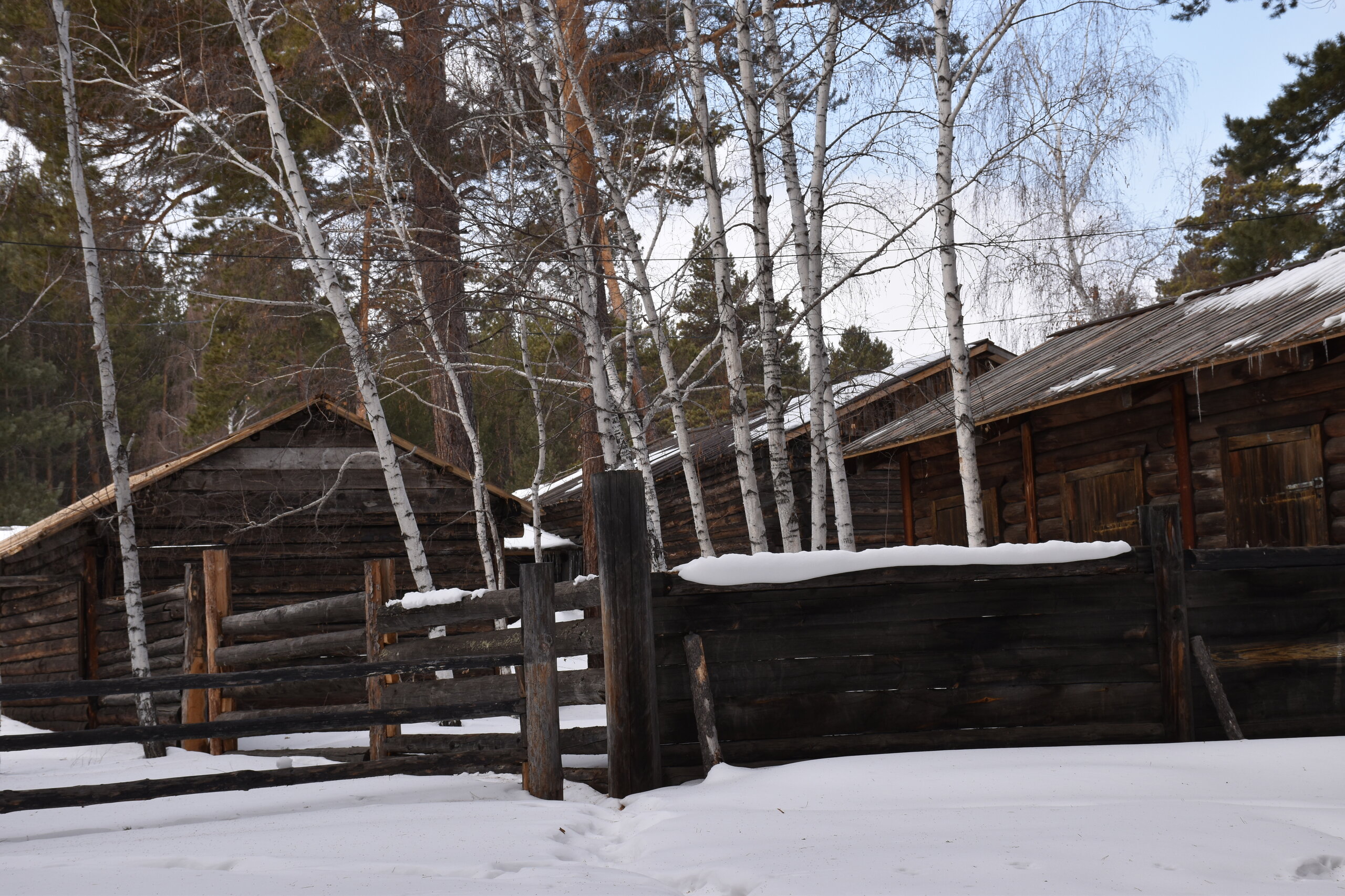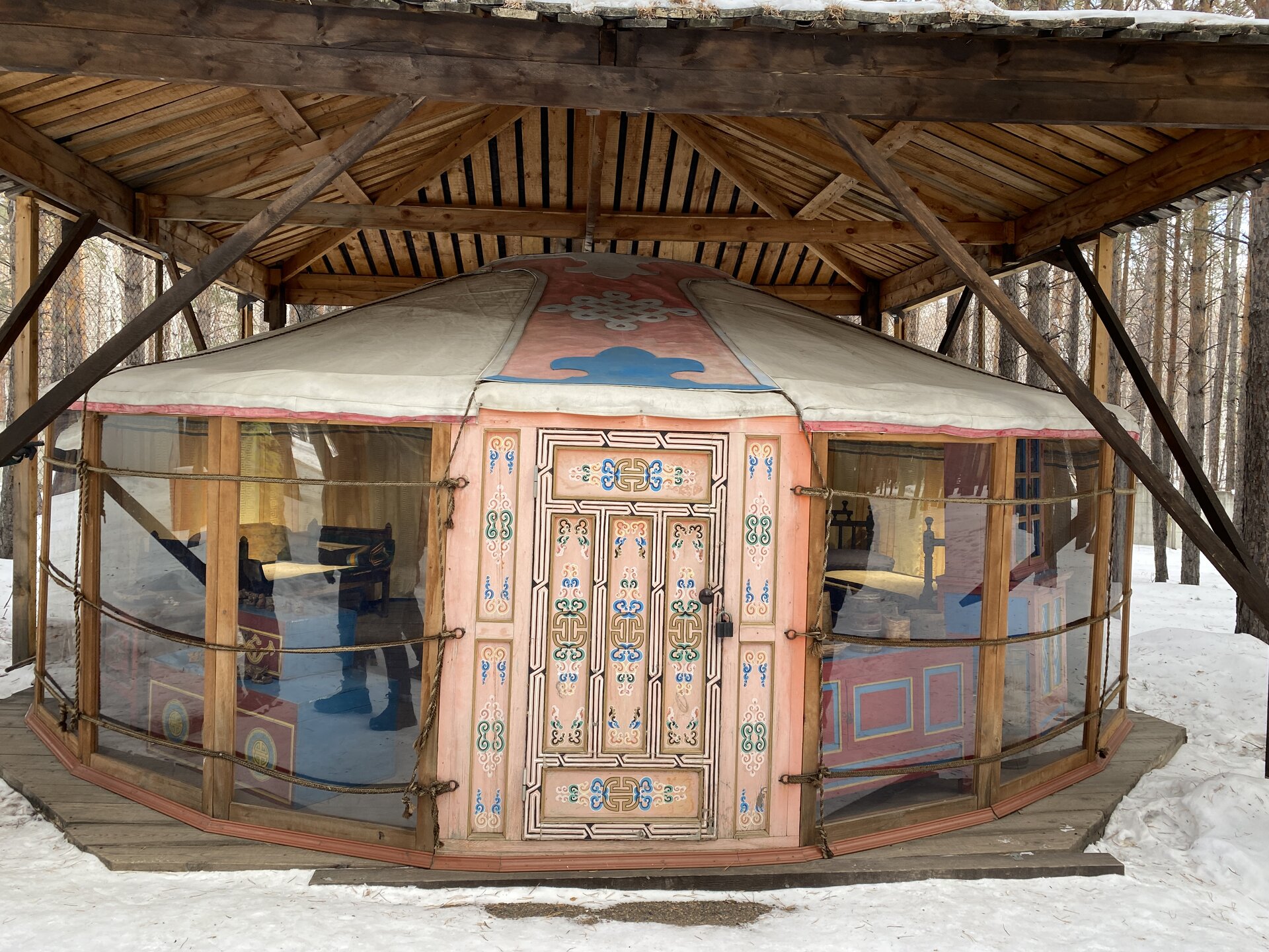 Бурятский комплекс состоит из предбайкальского и забайкальского секторов. Экспозиции Бурятского предбайкальского комплекса включают в себя зимнюю усадьбу богатого бурята, состоящую из жилой избы, двухкамерного амбара, четырехстенной деревянной юрты, навеса, летней кухни, завозни, а также зимнюю усадьбу бедного бурята (зимний дом, амбар, четырехстенная юрта и загоны для скота). Кроме того, в этом секторе представлены традиционные типы деревянных юрт. В центре двора стоит четырехстенная летняя юрта с открывающимся дымоходом, которая являлась обязательным компонентом любого двора. Зимой юрта могла служить амбаром, кладовкой, а ранней весной в нее семья переселялась жить до перекочевки на летники. Жили в летней юрте и осенью после перекочевки с летников до наступления холодов. Сейчас в юрте восстановлен традиционный интерьер. В восточном углу усадьбы расположена еще одна восьмистенная юрта, служившая кухней в летнее время. Между этими юртами расположен летний крытый навес с кожемялками разного вида. Одежда, обувь, постельные принадлежности, предметы домашнего обихода шились из кожи после их тщательной обработки по давно сложившейся технологии. Мы посмотрели на внутреннее убранство летней кухни (лупаарин) и летней юрты.