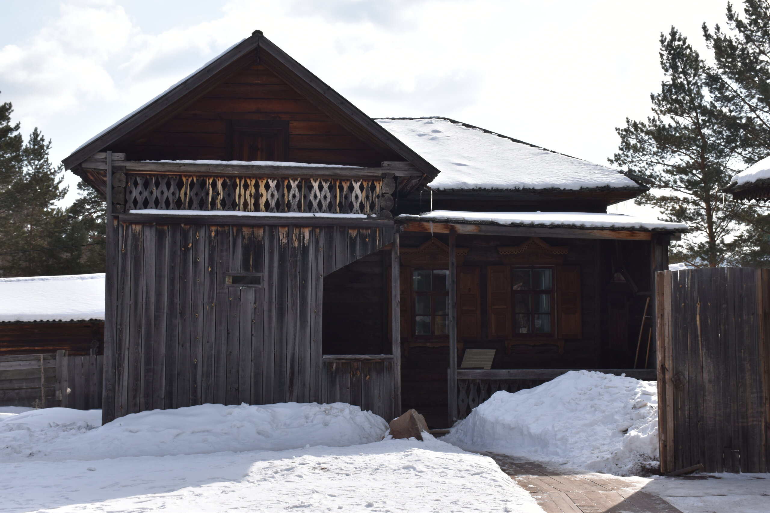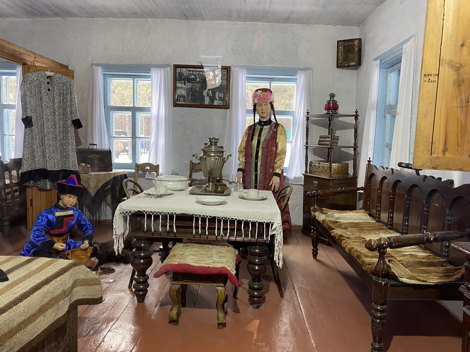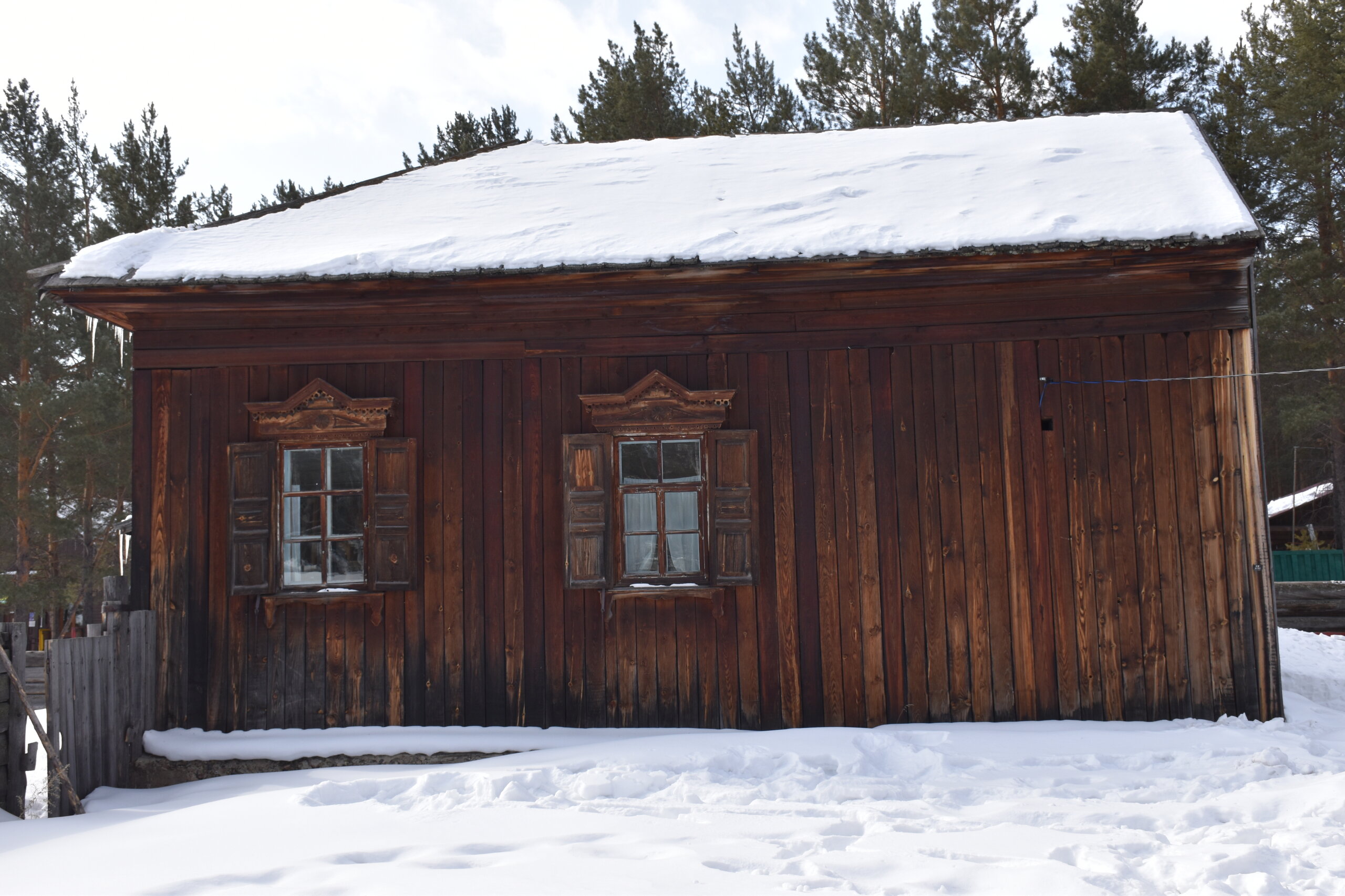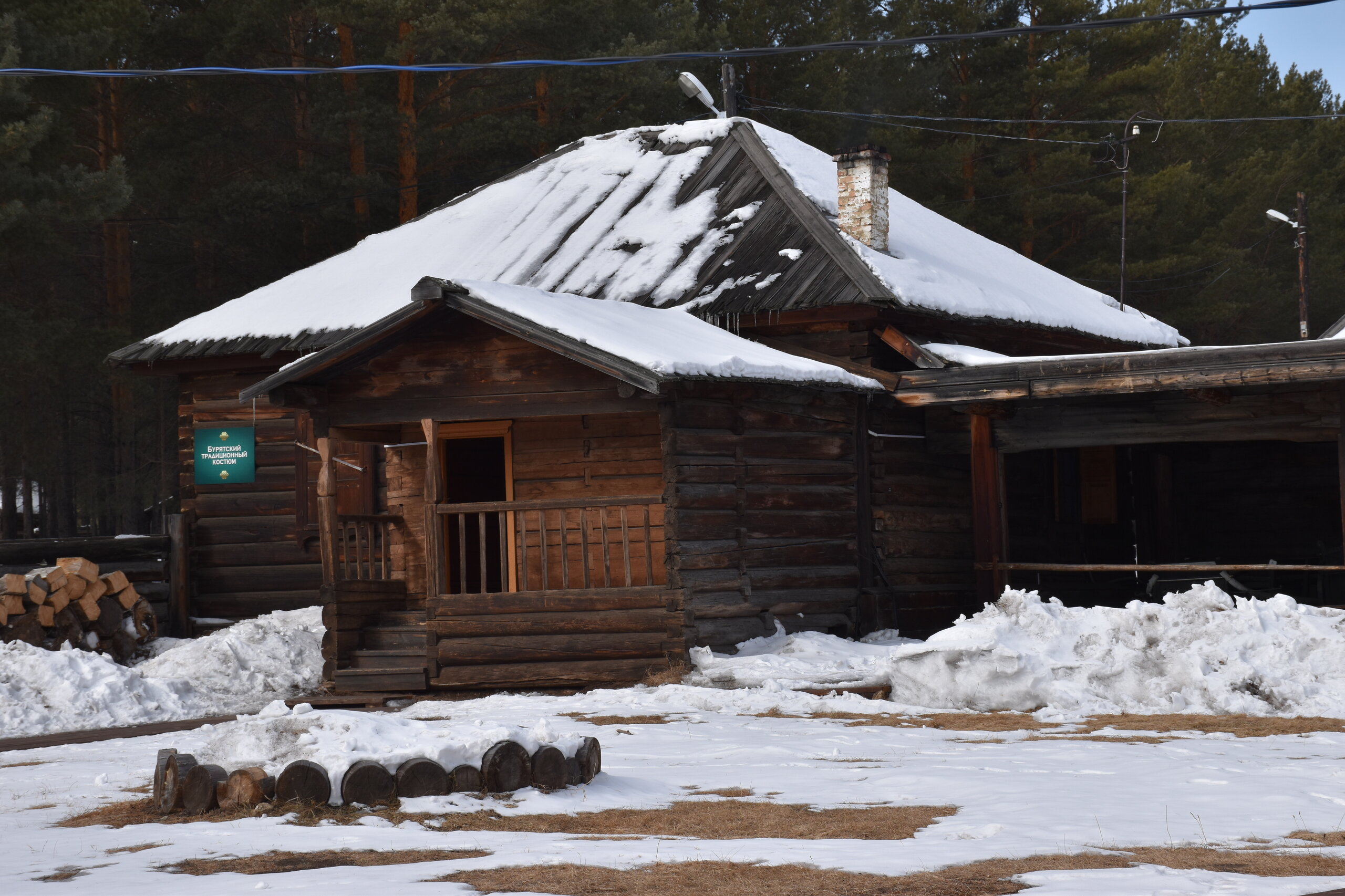 Усадьба Сафронова. Дом-зимник был построен в 1892 г. Он является широко распространенным типом жилищ зажиточных крестьян-бурят, занимавшихся земледелием наряду со скотоводством. Интерьер дома характеризует как традиционный бытовой уклад, так и значительные новшества, привнесенные русскими крестьянами: русская печь, самовары, посуда из фарфора и фаянса, образцы мебели – добротные шкафы, стол из дуба, этажерки, «венские» стулья. На стенах дома вывешены семейные фотографии в рамке, в углу висит христианская икона. На столе представлена традиционная кухня бурят: буузы, бухлер, саламат, боовы. На самодельных деревянных диванах (сапа) лежат хубсары – коврики, сшитые из камусов диких и домашних животных – телячьих, жеребячьих, овечьих, оленьих. На сундуке лежит необычный ковер, сотканный на ручном станке из конских волос – таар, с полосатым орнаментом. Рядом находится седло, богато украшенное кораллами. Бурятский традиционный костюм: