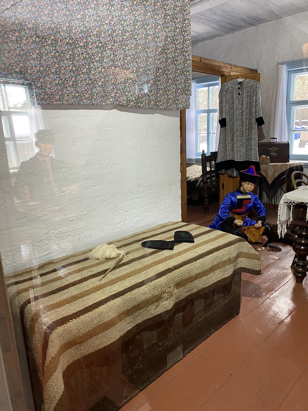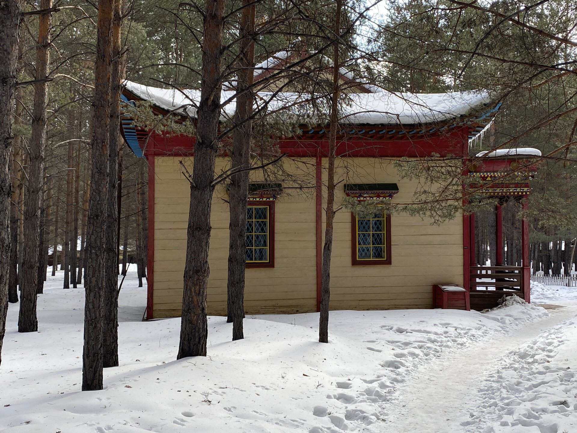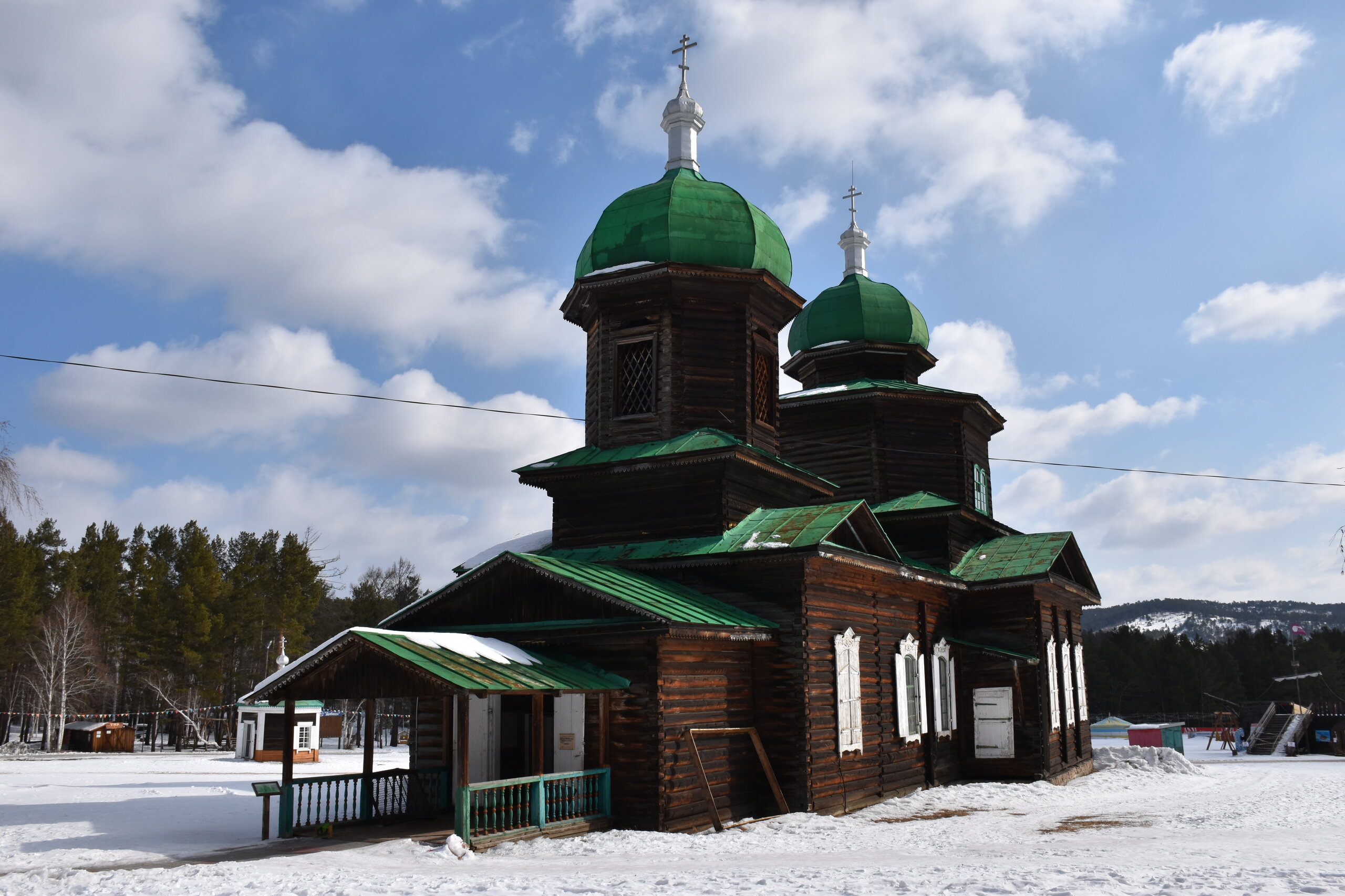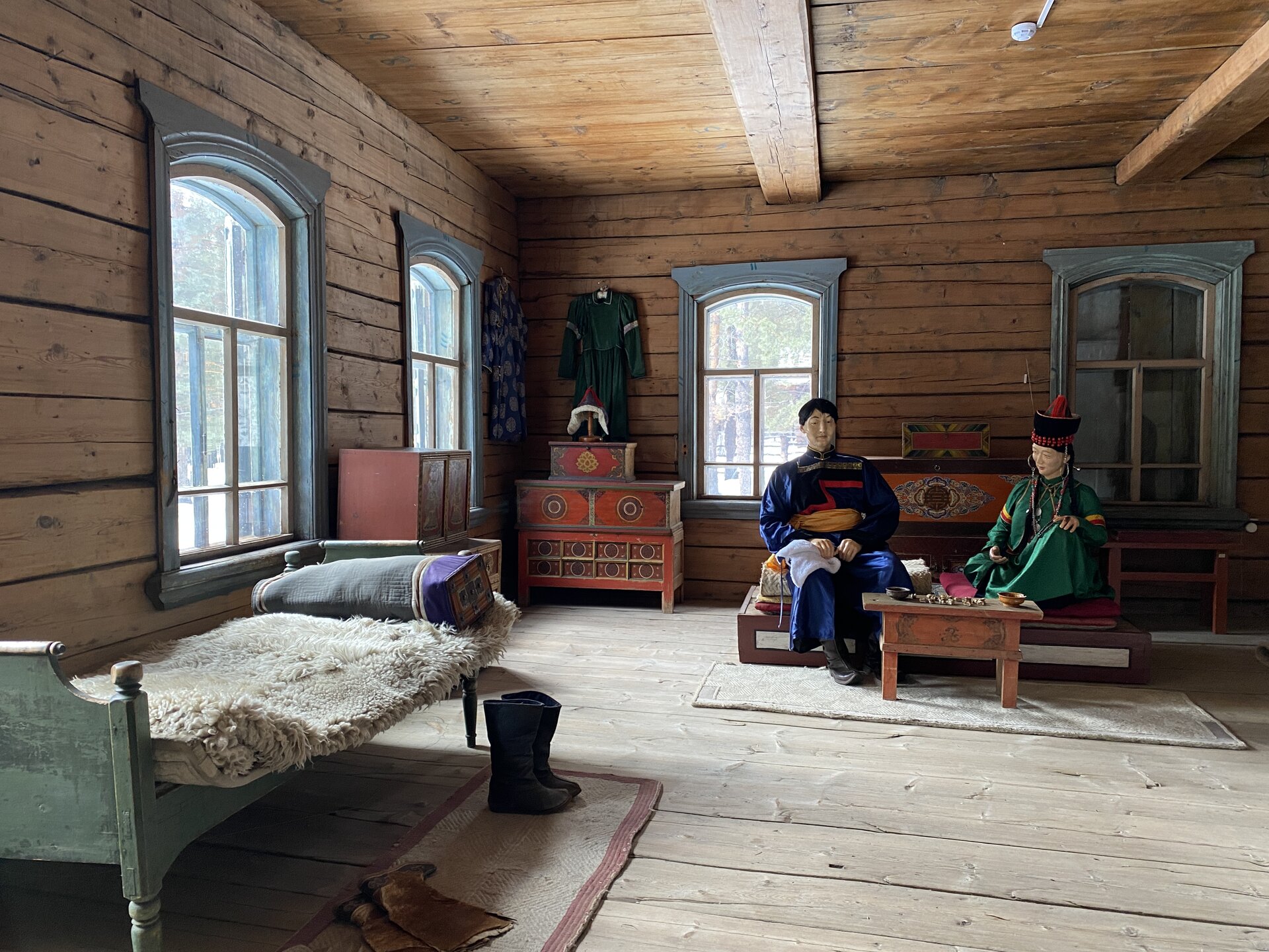 Дом-зимник Забайкальский был построен в 1912 г. русским плотником Степаном Зуевым и хозяином дома Ринчином Цыремпиловым. Перевезен из села Арбижил Заиграевского района. Зимник представляет собой большое прямоугольное помещение с окнами, выходящими на юг и запад. К дому пристроена вторая изба, имеющая подсобное значение, меньшая по размеру и соединенная с первым холодными сенями. Высокое крытое крыльцо с навесом и перилами пристроено ко входу дома с южной стороны. Такие дома, рубленые по русскому образцу, становятся основным типом жилищ забайкальских зажиточных бурят в конце XIX – начале XX вв. В зимнике воссоздан интерьер избы зажиточного бурята конца XIX – начала XX вв. Кирпичная печь русского образца, разделяющая дом на две условные половины, являлась новшеством для того времени. В северном углу дома расположена сакральная часть жилища забайкальских бурят – буддийская божница (гунгарбаа), состоящая из комплекта деревянных шкафов и столов с яркой красочной росписью по лицевой части. В застекленном шкафу находятся иконы на ткани (танка) с изображением разных божеств. На алтарный стол выставлены культовые атрибуты, необходимые при исполнении буддийских ритуалов. Западная часть дома (барун тала) – почетная часть, где встречают гостей. Здесь находятся сундуки с красочной росписью по лицевой стороне. Это «мужская» половина дома, где должен восседать хозяин дома и гости, которых усаживали на «жабдан» – низкое и удобное сидение с множеством шерстяных потников (шэрдэк). За сундуками расположена кровать хозяев дома. Все постельные принадлежности – овчинные одеяла (хунжэл), катаные из шерсти потники (шэрдэк), подголовник (дэрэ) – были изготовлены руками хозяйки дома, что требовало большого усердия и терпения. Заглядываем в различные юрты. Казачий или русский старожильческий рассказывает о типичной жизни Бурятии в XIX веке, когда общество расслоилось на пашенных крестьян и казачье сословие. Небольшой комплекс, состоящий всего из двух усадеб, некогда принадлежащих пашенному крестьянину и атаману местных казаков. Оба дома были вывезены из Батурина и Клочнёва вместе с хозяйственными постройками. Усадьбы датированы 1880 – 1919 годами. В этом музейном секторе также виднеется небольшая церквушка с конусообразной малахитовой крышей и жемчужно-серым куполом, увенчанным огромным крестом.