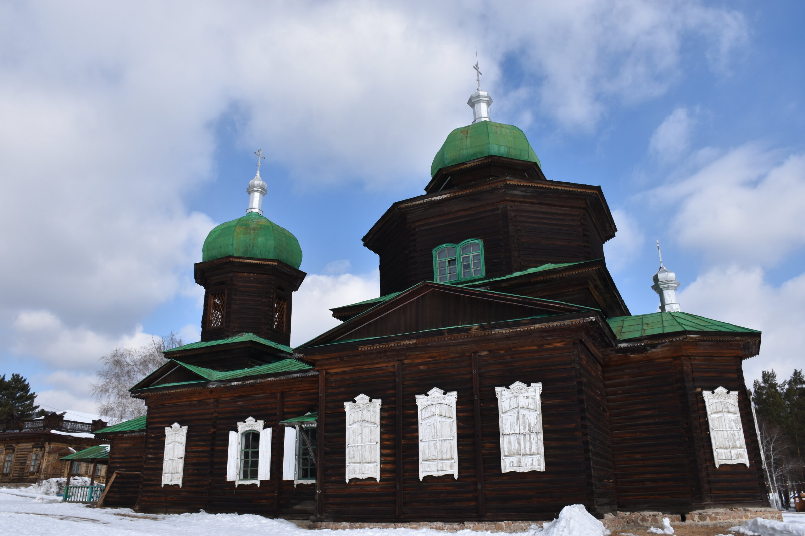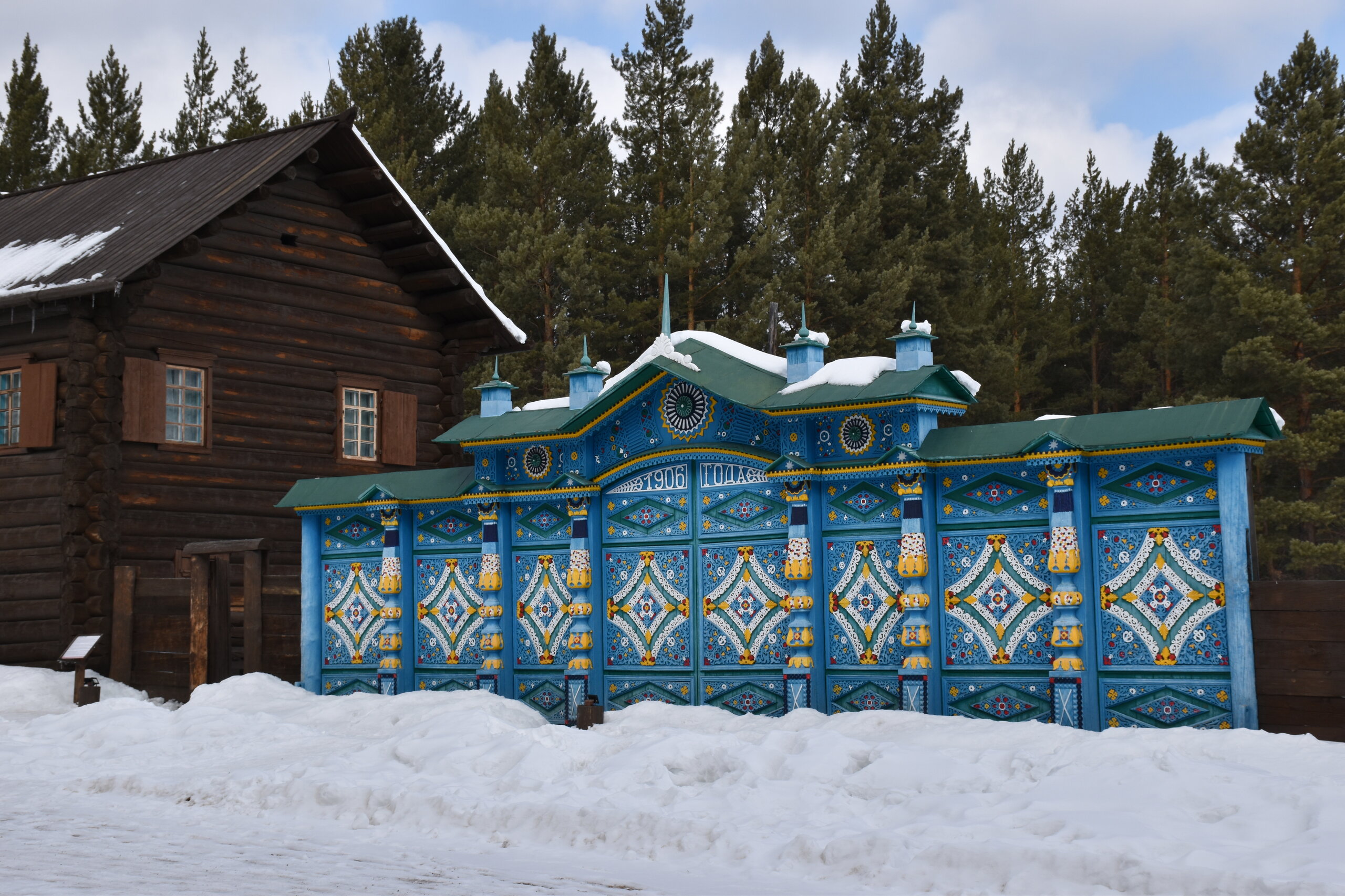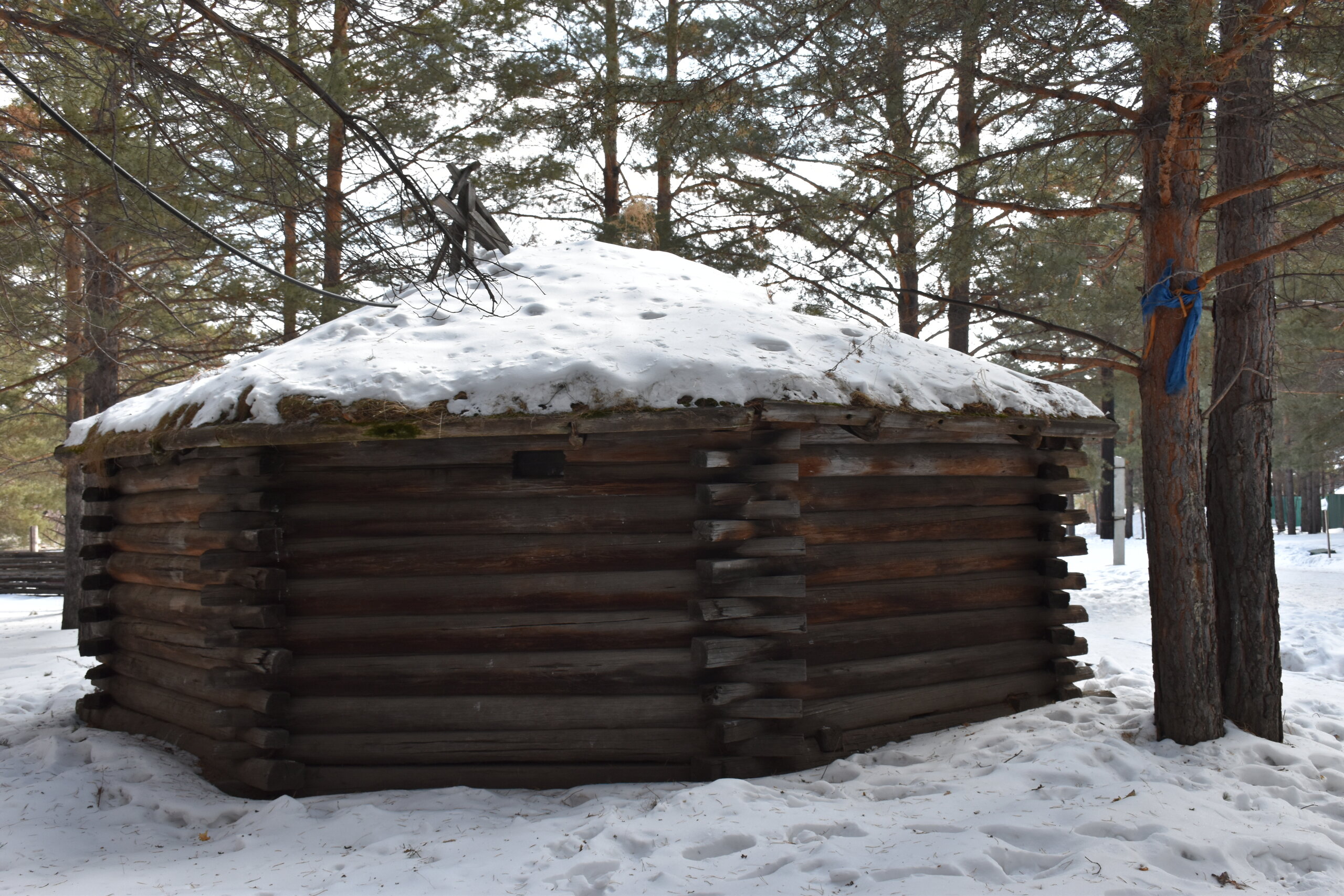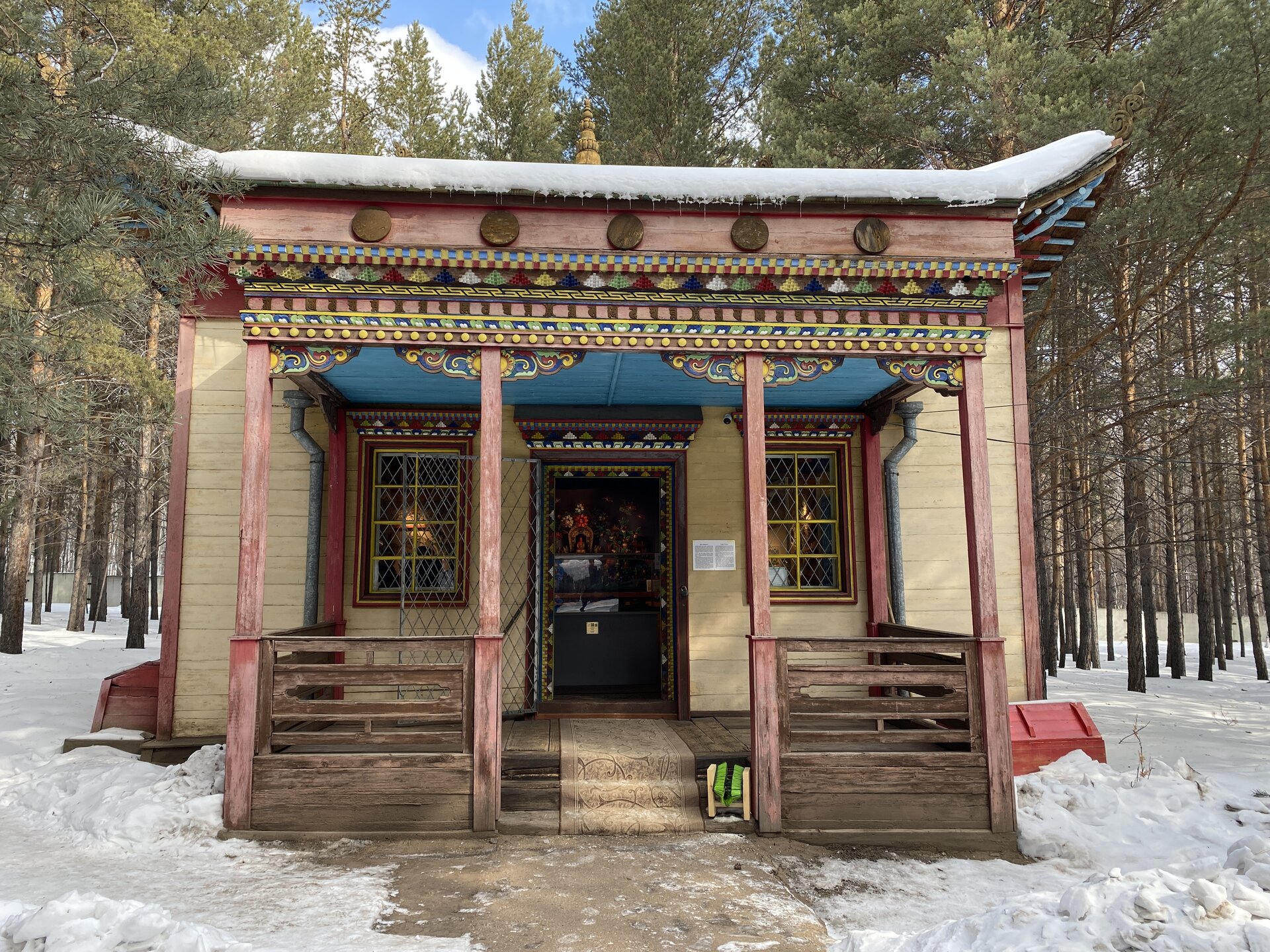 Дом-зимник Забайкальский был построен в 1912 г. русским плотником Степаном Зуевым и хозяином дома Ринчином Цыремпиловым. Перевезен из села Арбижил Заиграевского района. Зимник представляет собой большое прямоугольное помещение с окнами, выходящими на юг и запад. К дому пристроена вторая изба, имеющая подсобное значение, меньшая по размеру и соединенная с первым холодными сенями. Высокое крытое крыльцо с навесом и перилами пристроено ко входу дома с южной стороны. Такие дома, рубленые по русскому образцу, становятся основным типом жилищ забайкальских зажиточных бурят в конце XIX – начале XX вв. В зимнике воссоздан интерьер избы зажиточного бурята конца XIX – начала XX вв. Кирпичная печь русского образца, разделяющая дом на две условные половины, являлась новшеством для того времени. В северном углу дома расположена сакральная часть жилища забайкальских бурят – буддийская божница (гунгарбаа), состоящая из комплекта деревянных шкафов и столов с яркой красочной росписью по лицевой части. В застекленном шкафу находятся иконы на ткани (танка) с изображением разных божеств. На алтарный стол выставлены культовые атрибуты, необходимые при исполнении буддийских ритуалов. Западная часть дома (барун тала) – почетная часть, где встречают гостей. Здесь находятся сундуки с красочной росписью по лицевой стороне. Это «мужская» половина дома, где должен восседать хозяин дома и гости, которых усаживали на «жабдан» – низкое и удобное сидение с множеством шерстяных потников (шэрдэк). За сундуками расположена кровать хозяев дома. Все постельные принадлежности – овчинные одеяла (хунжэл), катаные из шерсти потники (шэрдэк), подголовник (дэрэ) – были изготовлены руками хозяйки дома, что требовало большого усердия и терпения. Заглядываем в различные юрты. Казачий или русский старожильческий рассказывает о типичной жизни Бурятии в XIX веке, когда общество расслоилось на пашенных крестьян и казачье сословие. Небольшой комплекс, состоящий всего из двух усадеб, некогда принадлежащих пашенному крестьянину и атаману местных казаков. Оба дома были вывезены из Батурина и Клочнёва вместе с хозяйственными постройками. Усадьбы датированы 1880 – 1919 годами. В этом музейном секторе также виднеется небольшая церквушка с конусообразной малахитовой крышей и жемчужно-серым куполом, увенчанным огромным крестом.