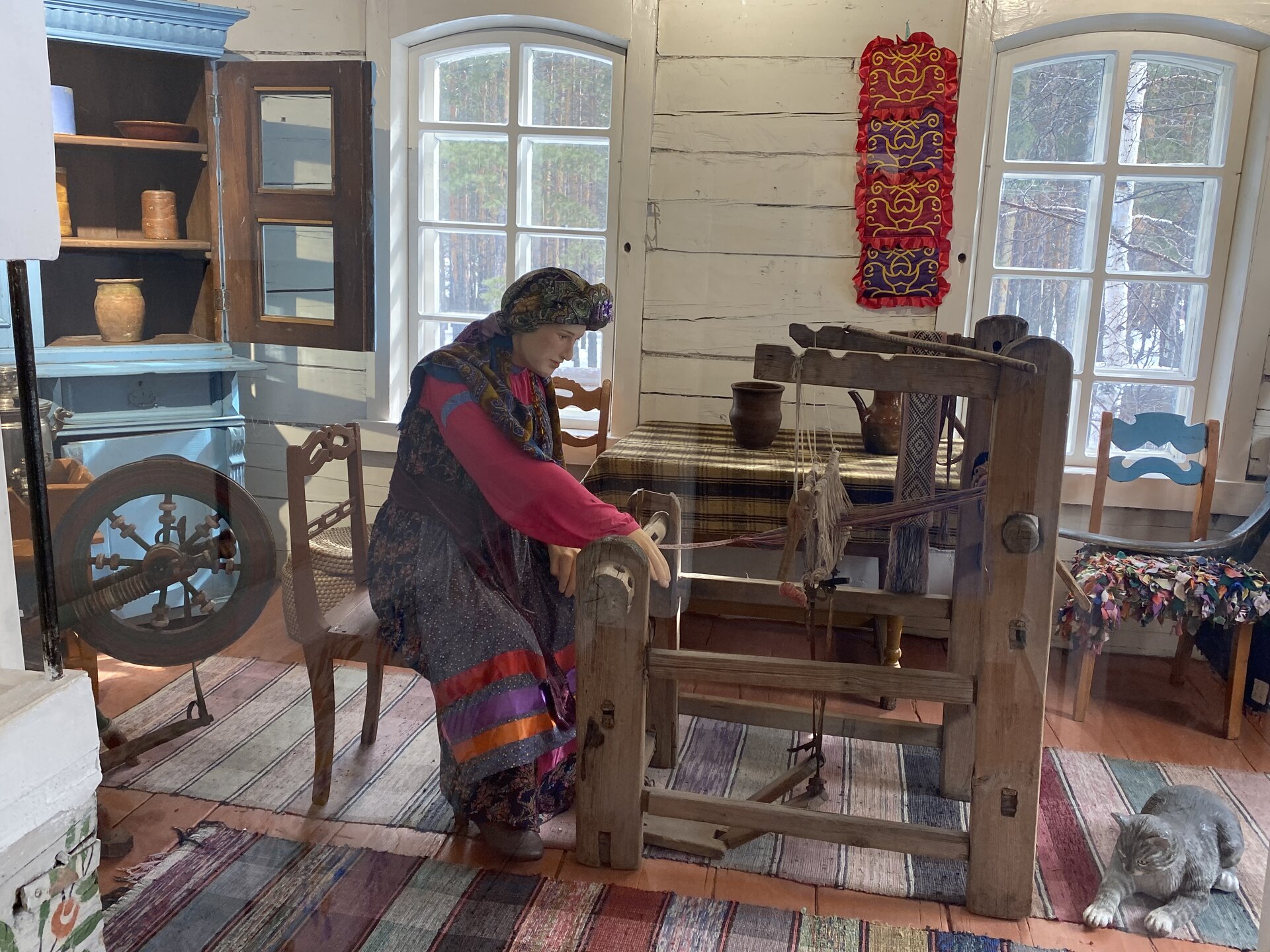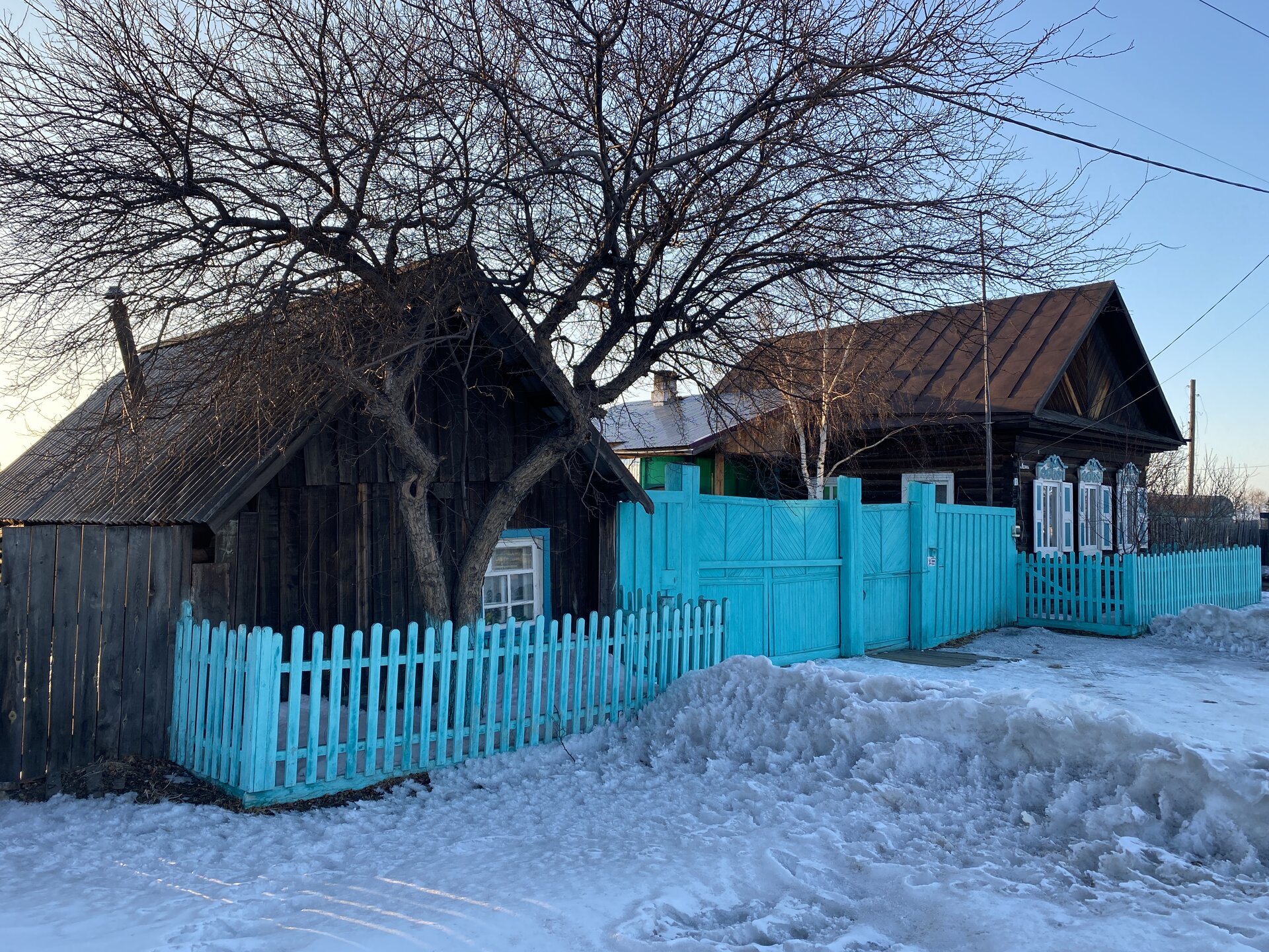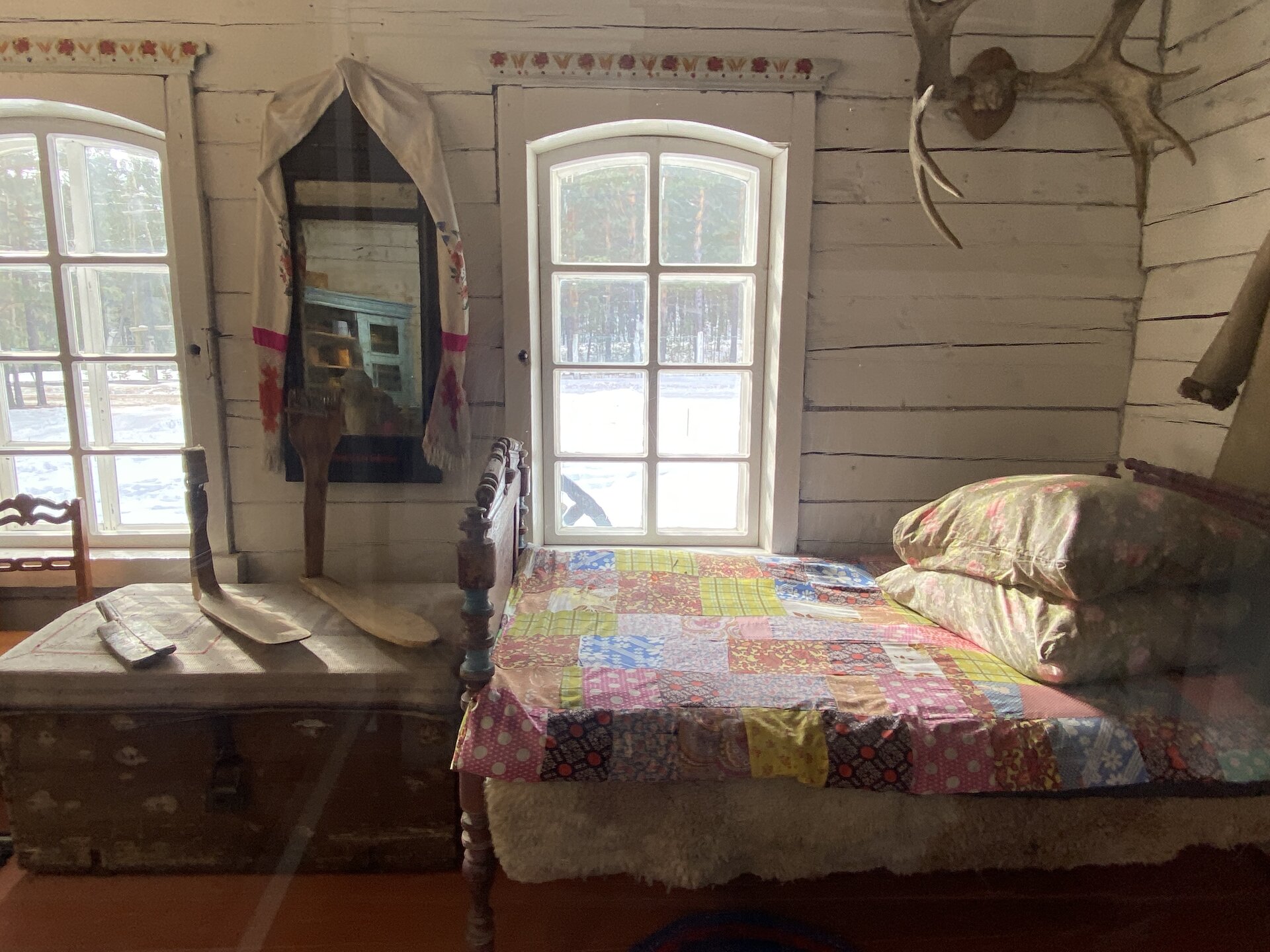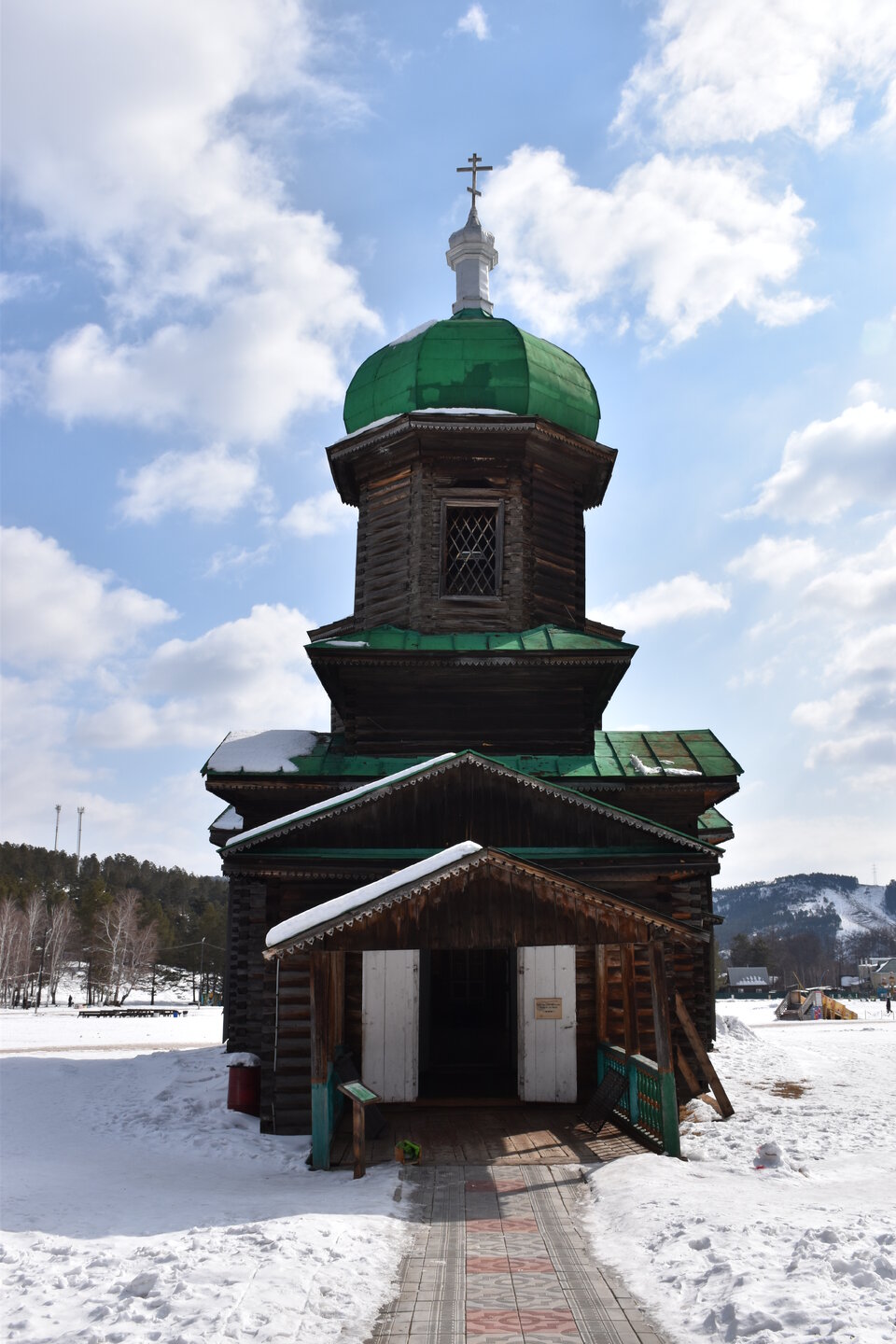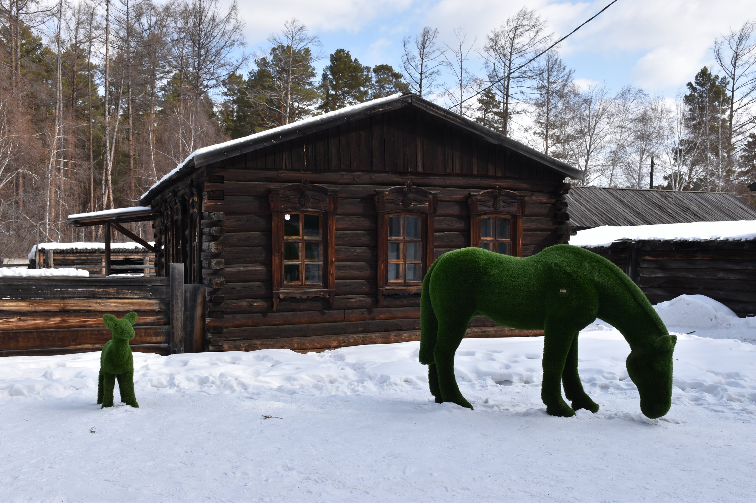 Дом-зимник Забайкальский был построен в 1912 г. русским плотником Степаном Зуевым и хозяином дома Ринчином Цыремпиловым. Перевезен из села Арбижил Заиграевского района. Зимник представляет собой большое прямоугольное помещение с окнами, выходящими на юг и запад. К дому пристроена вторая изба, имеющая подсобное значение, меньшая по размеру и соединенная с первым холодными сенями. Высокое крытое крыльцо с навесом и перилами пристроено ко входу дома с южной стороны. Такие дома, рубленые по русскому образцу, становятся основным типом жилищ забайкальских зажиточных бурят в конце XIX – начале XX вв. В зимнике воссоздан интерьер избы зажиточного бурята конца XIX – начала XX вв. Кирпичная печь русского образца, разделяющая дом на две условные половины, являлась новшеством для того времени. В северном углу дома расположена сакральная часть жилища забайкальских бурят – буддийская божница (гунгарбаа), состоящая из комплекта деревянных шкафов и столов с яркой красочной росписью по лицевой части. В застекленном шкафу находятся иконы на ткани (танка) с изображением разных божеств. На алтарный стол выставлены культовые атрибуты, необходимые при исполнении буддийских ритуалов. Западная часть дома (барун тала) – почетная часть, где встречают гостей. Здесь находятся сундуки с красочной росписью по лицевой стороне. Это «мужская» половина дома, где должен восседать хозяин дома и гости, которых усаживали на «жабдан» – низкое и удобное сидение с множеством шерстяных потников (шэрдэк). За сундуками расположена кровать хозяев дома. Все постельные принадлежности – овчинные одеяла (хунжэл), катаные из шерсти потники (шэрдэк), подголовник (дэрэ) – были изготовлены руками хозяйки дома, что требовало большого усердия и терпения. Заглядываем в различные юрты. Казачий или русский старожильческий рассказывает о типичной жизни Бурятии в XIX веке, когда общество расслоилось на пашенных крестьян и казачье сословие. Небольшой комплекс, состоящий всего из двух усадеб, некогда принадлежащих пашенному крестьянину и атаману местных казаков. Оба дома были вывезены из Батурина и Клочнёва вместе с хозяйственными постройками. Усадьбы датированы 1880 – 1919 годами. В этом музейном секторе также виднеется небольшая церквушка с конусообразной малахитовой крышей и жемчужно-серым куполом, увенчанным огромным крестом.