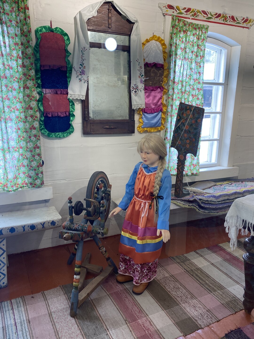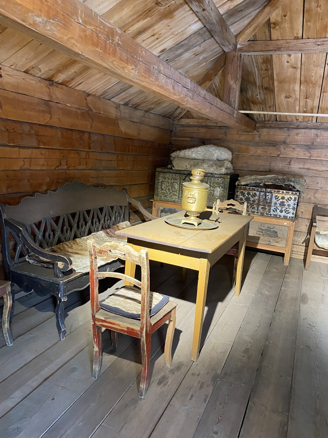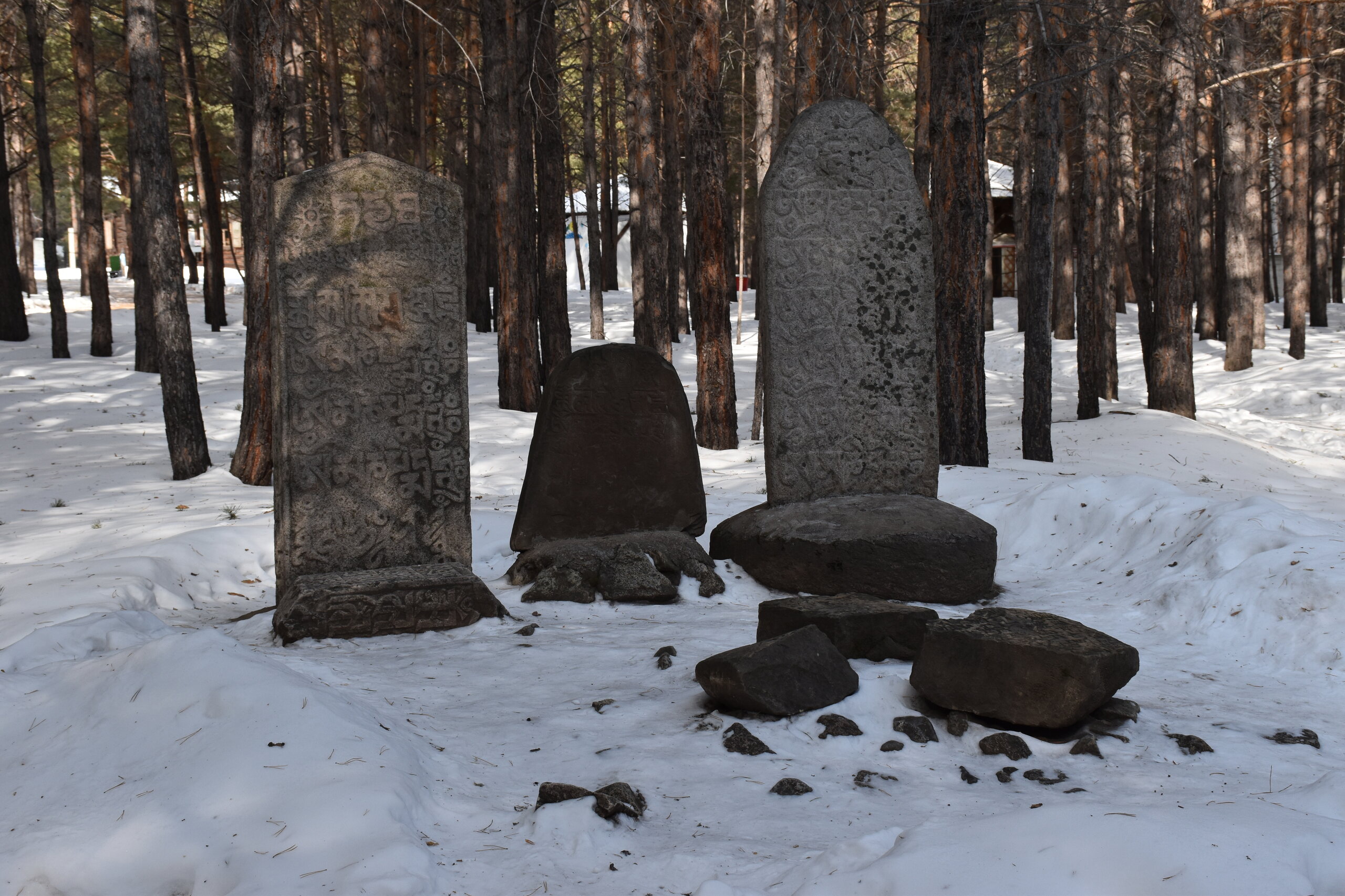 Идем дальше. Камни с молитвами (мани). В экспозицию Бурятского забайкальского комплекса входит войлочная юрта, зимний дом, амбары, хозяйственный навес. Также здесь представлено культовое здание – дуган «деважин» из Тамчинского дацана, в настоящее время оборудованный в качестве выставочного зала. Традиционным для России является тибетский буддизм школы Гелуг, к которой принадлежит большинство буддистов России. Республика Бурятия является центром буддизма в России. Дуган «Деважин» был построен в 1890 г. для размещения в нем модели «рая Сукхавати» и первоначально располагался на территории Тамчинского дацана (Селенгинский район). В 1973 году его перевезли в этнографический музей народов Забайкалья. Этот необыкновенный храм отличается экзотическим внешним видом и немного похож на тайскую пагоду, а в окраске преобладает приглушенный желтый цвет (любимый оттенок течения ламаизма). Дэважин-дуган посвящён Западному Раю – согласно буддийским традициям, обидели блаженства. Это чистая Земля, где обитает Будда Амитабхи на своём троне из лотосов. Считается, что человеческое сознание при определённых условиях может быть перенесено в это умиротворенное место. Внутри дугана размещена выставка деревянных резных деталей Янгажинского (Оронгойского) дацана, среди которых особый интерес представляет панно «Туншэ», выполненное в технике плоскорельефной резьбы, иллюстрирует индийскую сказку о четырех животных, разумно решивших спор о том, как достать плоды с высокого дерева.