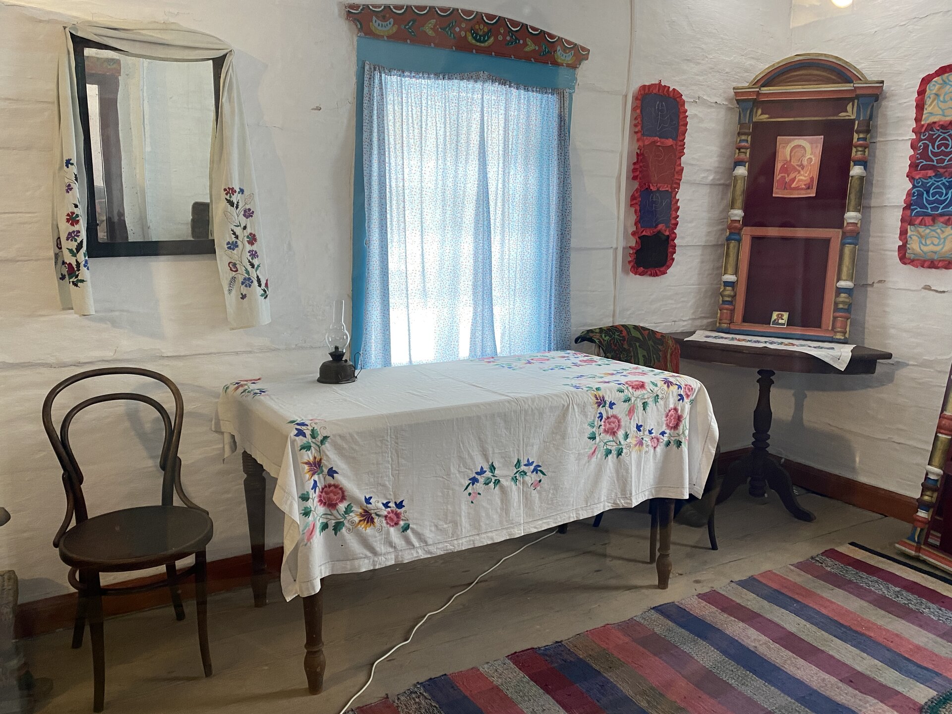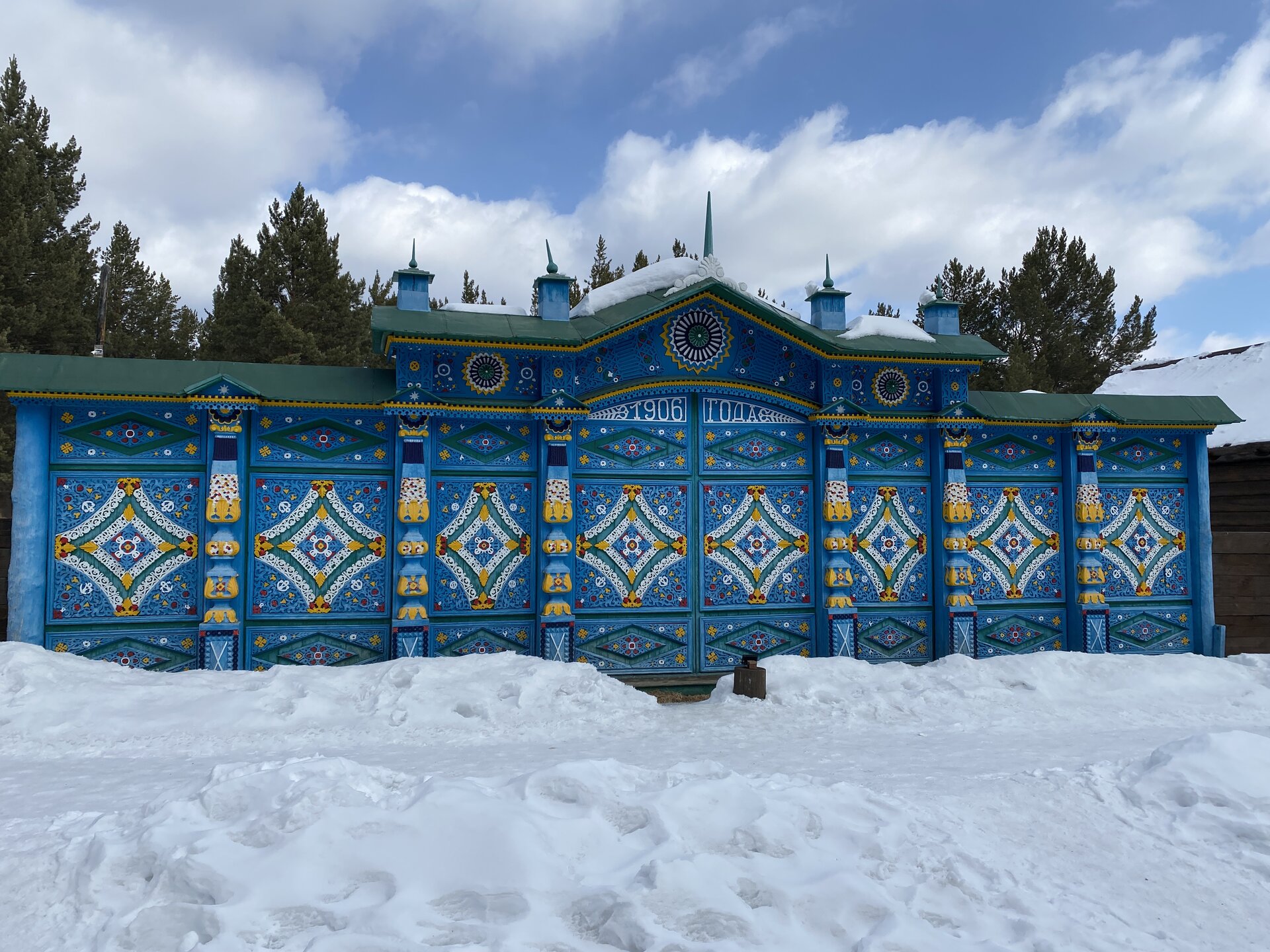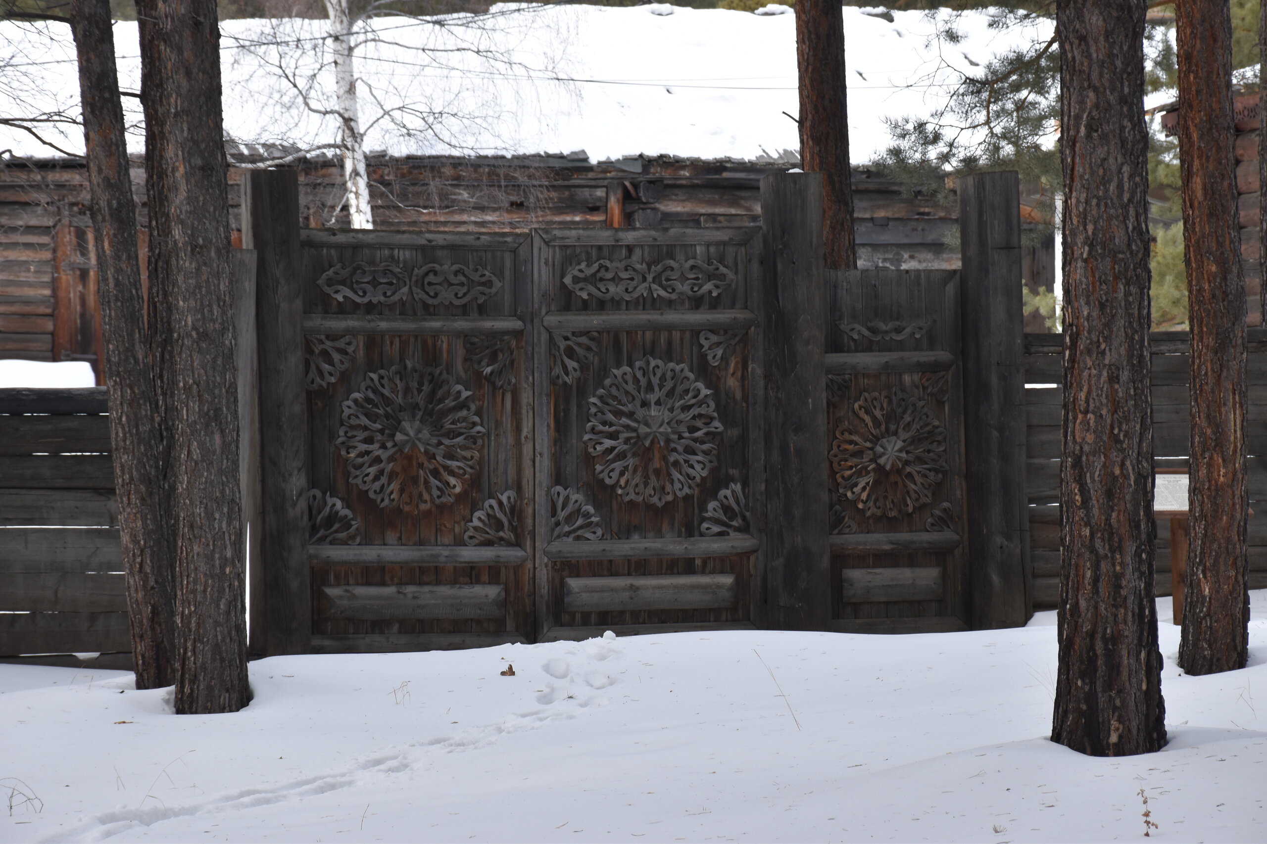 Возле дома Борисова находятся самое узнаваемое строение Этнографического музея – уникальные въездные ворота, вывезенные в 1978 году из с. Новая Брянь. Они были построены в 1906 году пришлыми и местными мастерами по заказу Афанасия Савельевича Родионова. На них указан год рождения его дочери Анны. Ворота и прилегающий забор богато украшены рельефной и пропильной резьбой, расцвеченной красно-розовой, синей и желтой масляными красками. Полотнища въездных ворот и забора, подкрышные проемы покрыты сплошным накладным ковром пропильной резьбы с ромбическими, четырехугольными и круглыми центральными розетками. Каждый из мастеров вносил в резное украшение что-то из своей культуры: буряты символы буддизма – четырехконечную ваджру, цветок лотоса, семейские – ромбы, квадраты, как символ крестьянского поля. Здесь же можно увидеть влияние язычества – ножницы, которые по приданию закапывали под порог так, чтобы острые концы смотрели на входящего, тем самым оберегая дом от дурного сглаза. Устройство и украшение ворот были показателем благополучия и исправности хозяев. Чем массивнее и красивее были ворота – тем благополучнее был и сам хозяин. Интерьер Дом Борисова традиционен, но здесь можно увидеть мебель городского типа, дорогую фарфоровую и фаянсовую посуду, часы и большие сундуки, окованные жестью, с музыкальными замками. Одна из характерных особенностей интерьера семейских – домовая роспись, которую можно разделить на наружную и внутреннюю. Роспись интерьеров была женским занятием. Многие вещи в доме были украшены руками хозяев: сундуки, прялки, посуда, наличники и многое другое. Хозяйка, умевшая украсить свой дом росписью, пользовалась большим уважением у семейских.