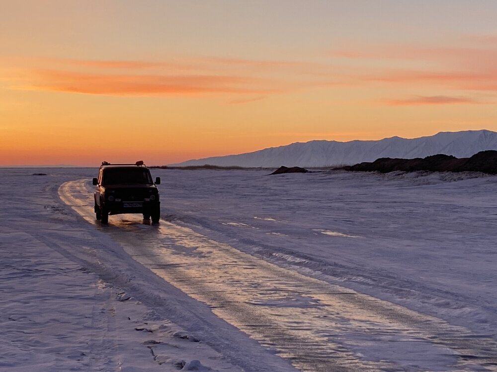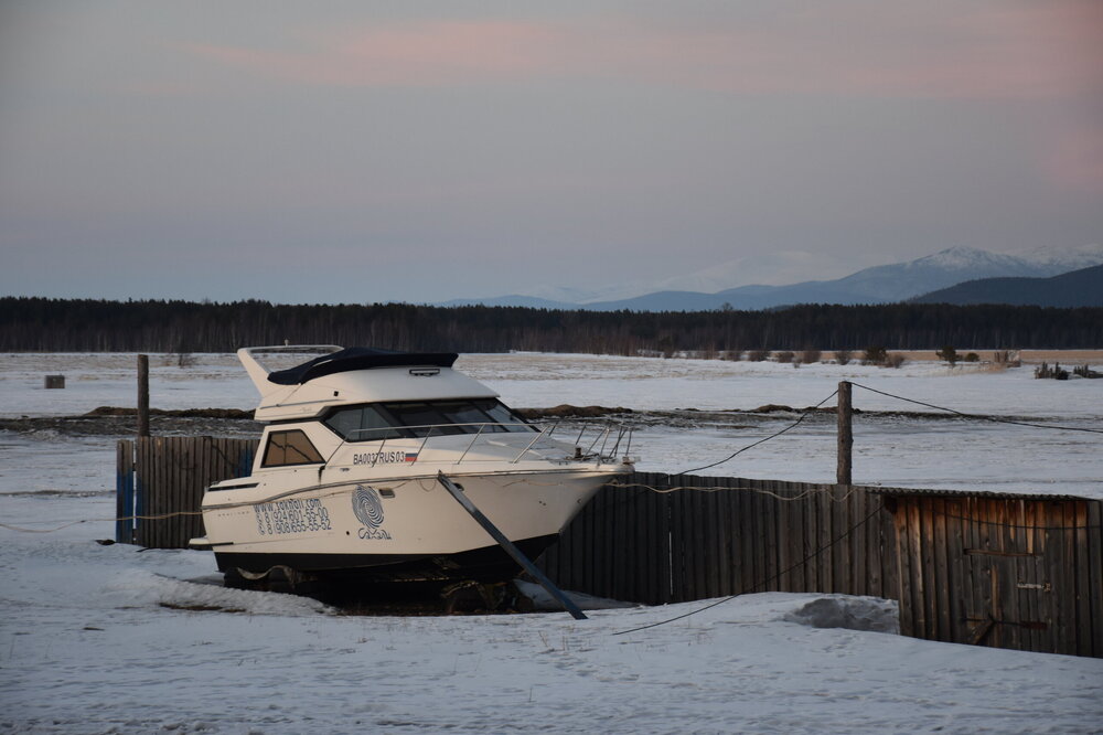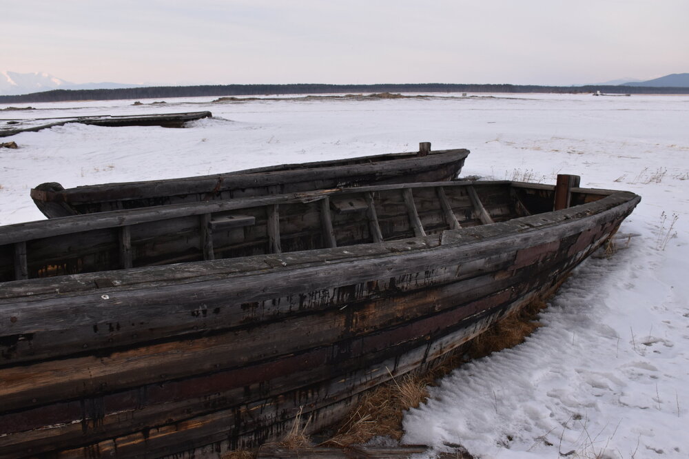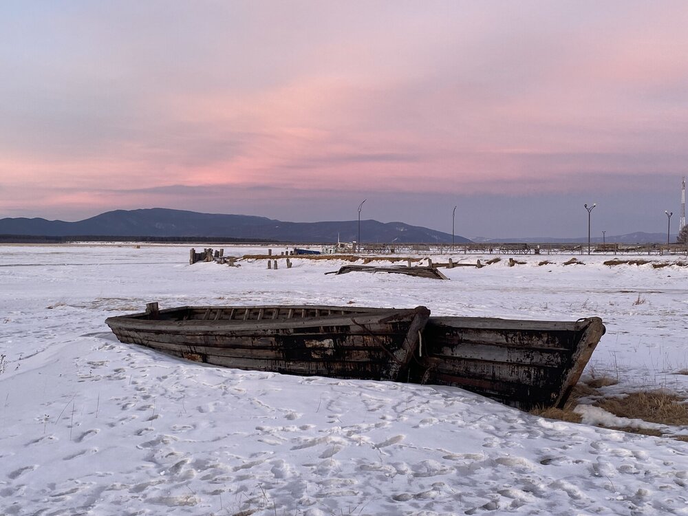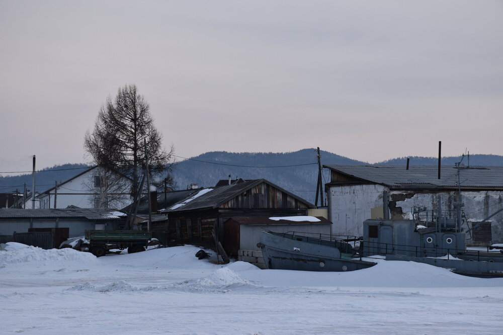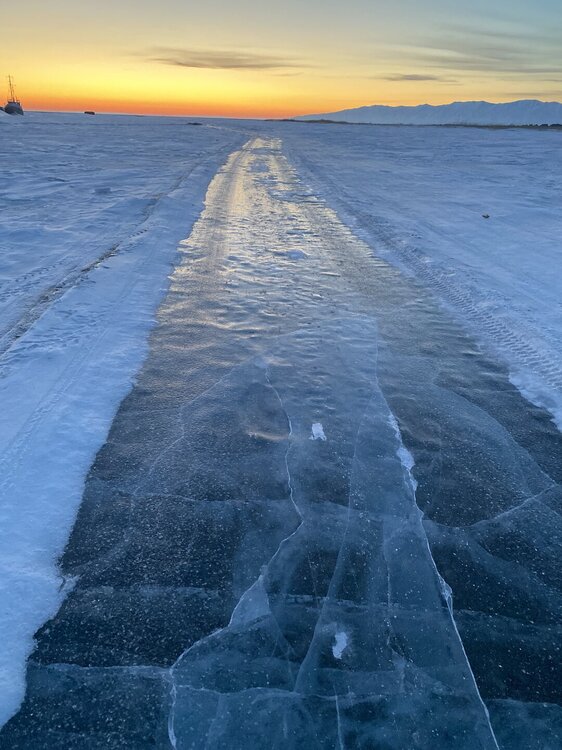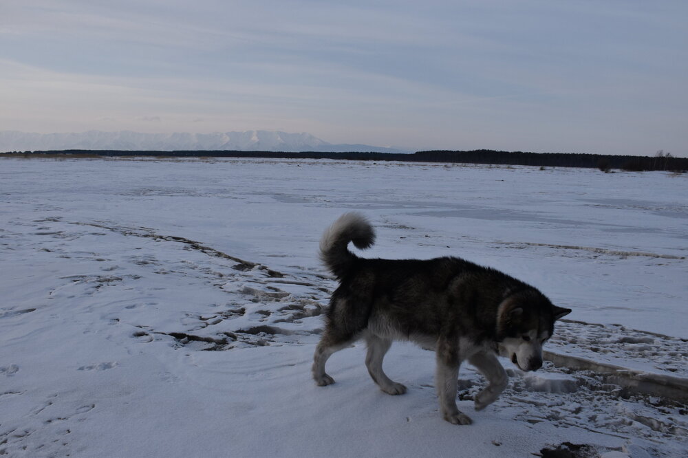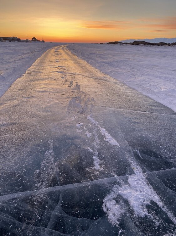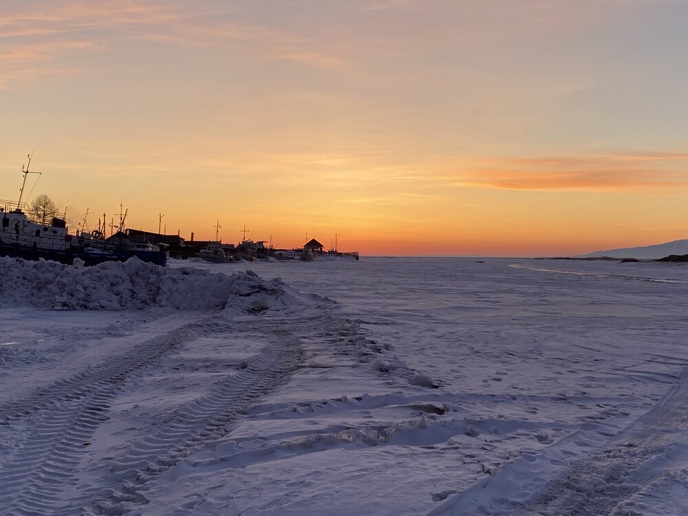 Лед Байкала здесь тоже можно увидеть, только придется поискать. Мы шли по дороге и находили куски без снега. И собака с нами гуляла. В поселке Усть-Баргузин также много собак, которые к нам прибивались. «Местный житель» провел нам экскурсию и показал красивый закат.