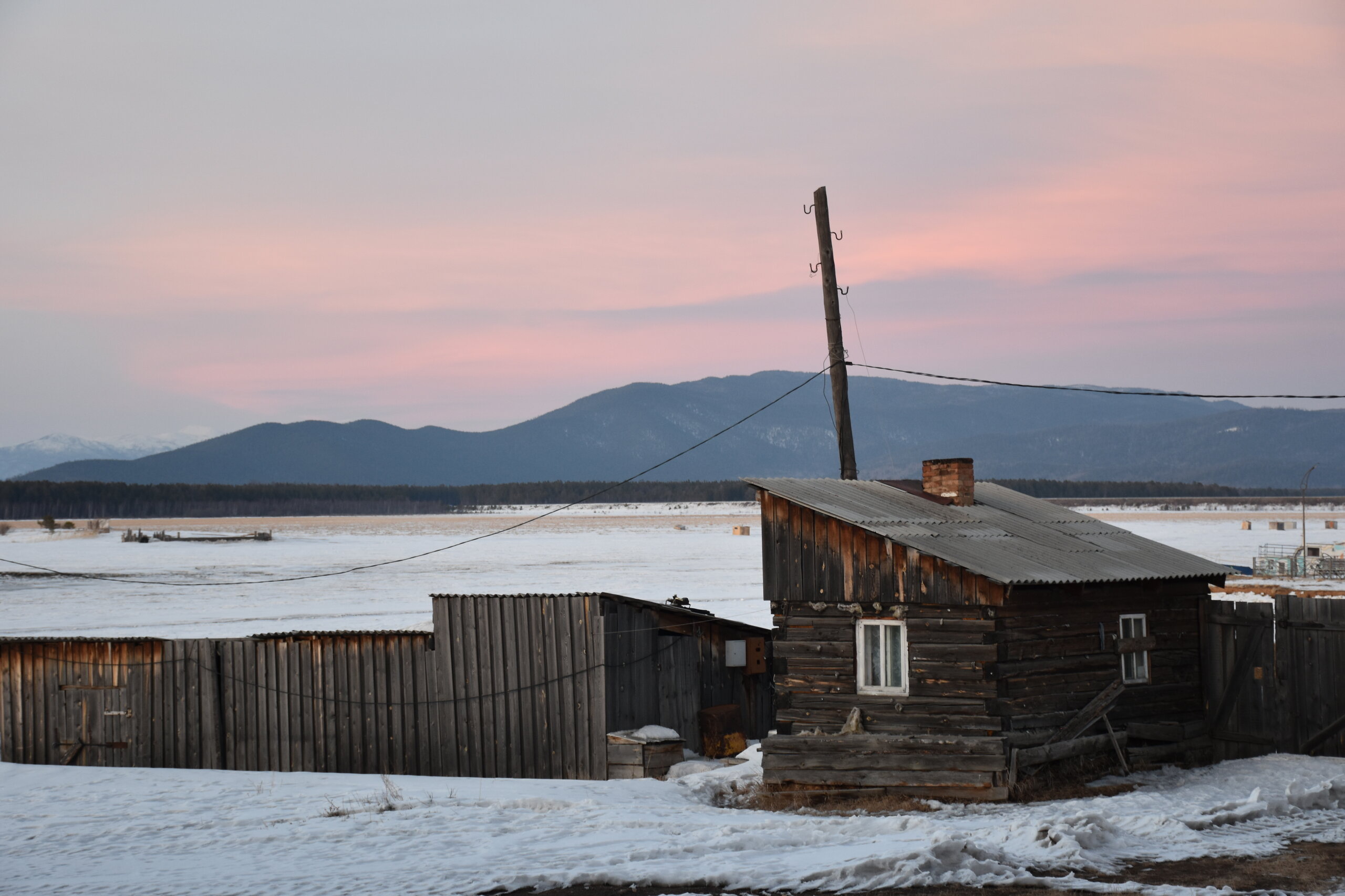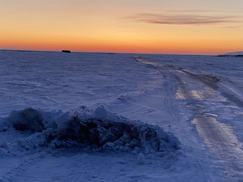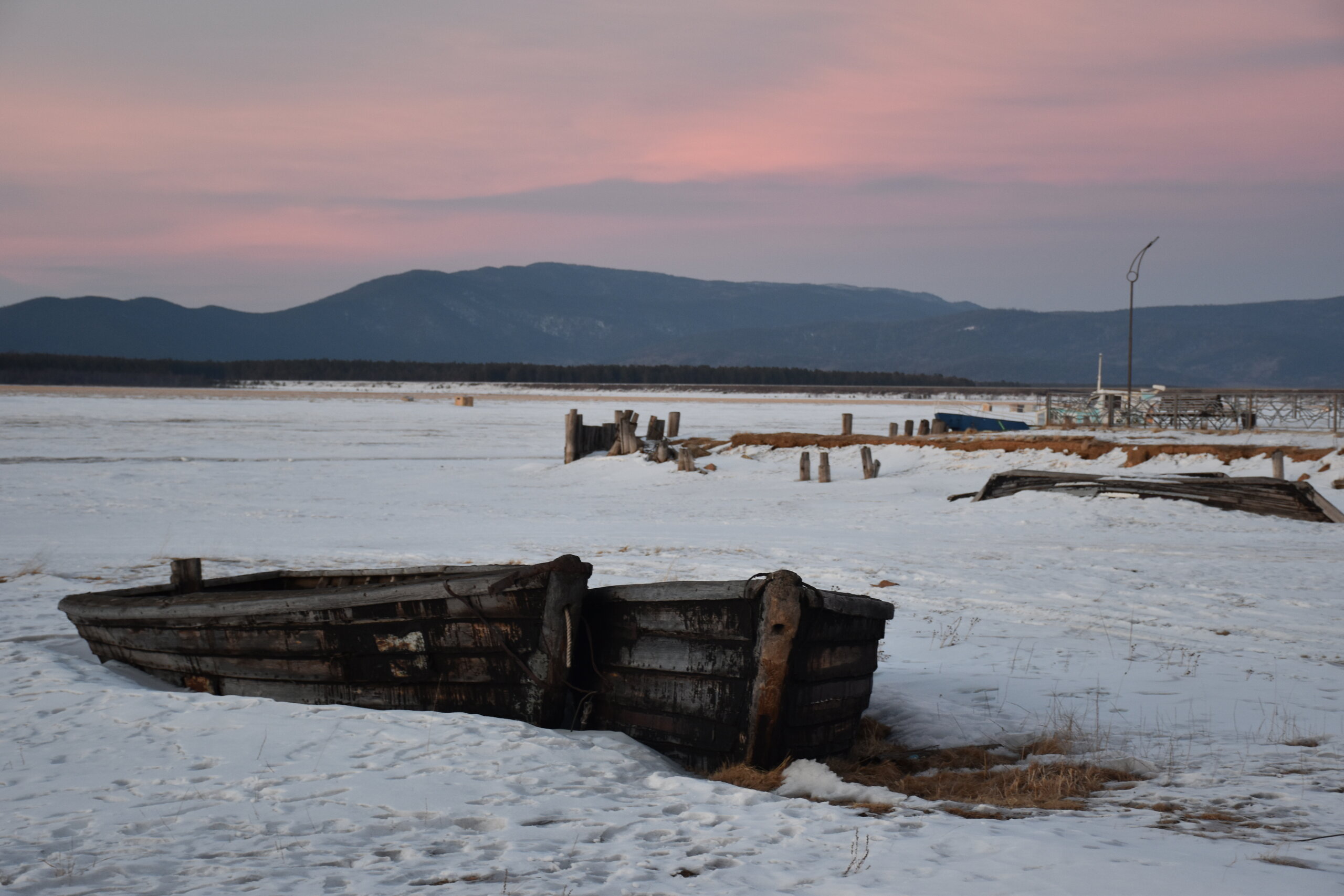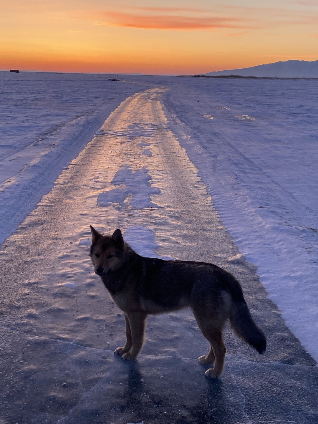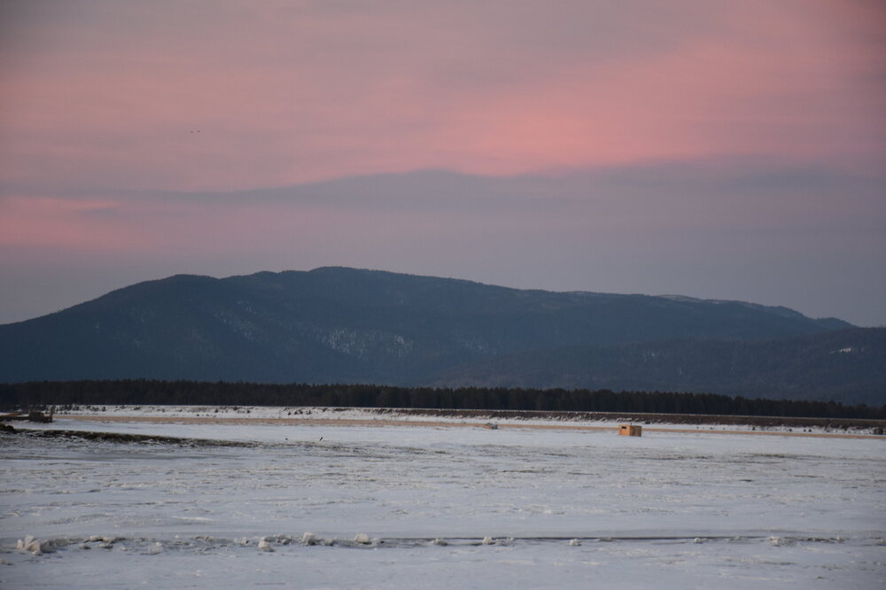 Лед Байкала здесь тоже можно увидеть, только придется поискать. Мы шли по дороге и находили куски без снега. И собака с нами гуляла. В поселке Усть-Баргузин также много собак, которые к нам прибивались. «Местный житель» провел нам экскурсию и показал красивый закат.