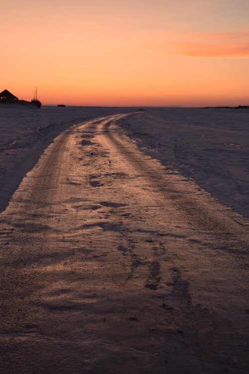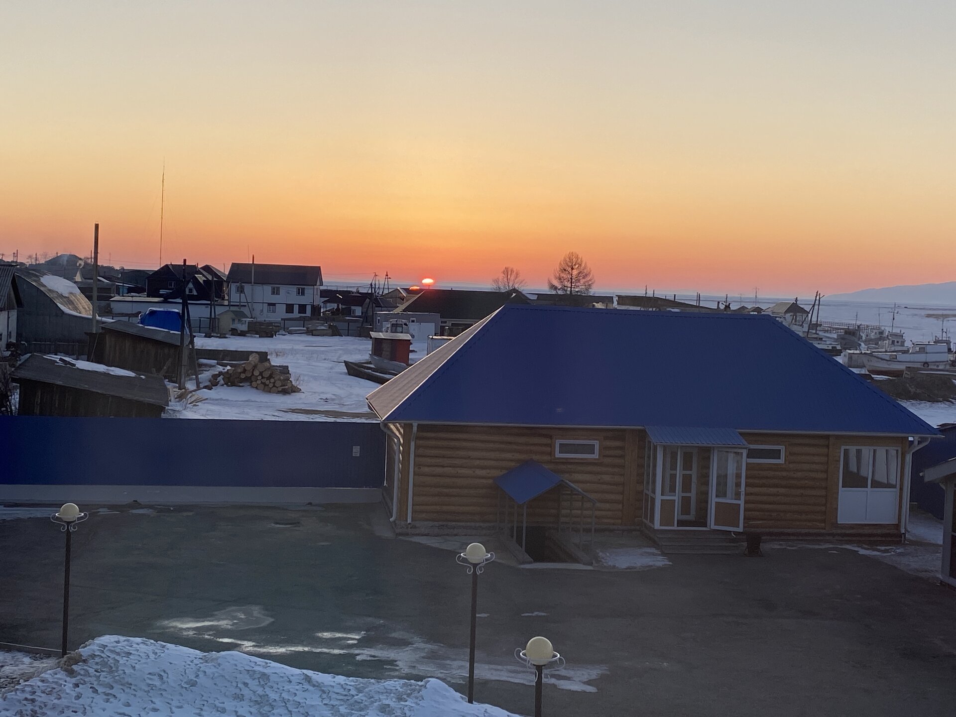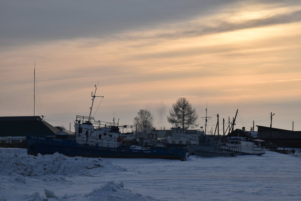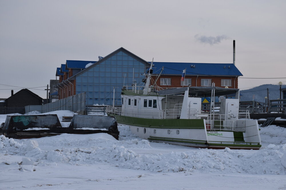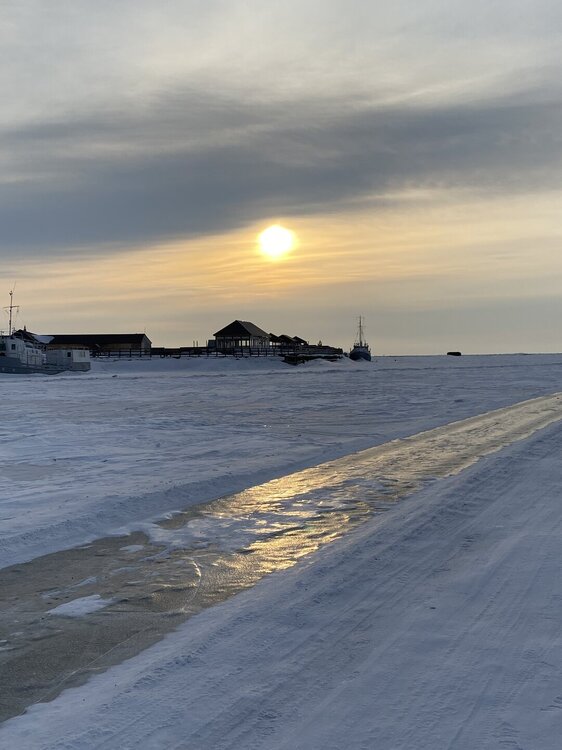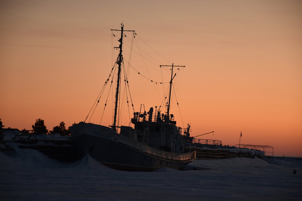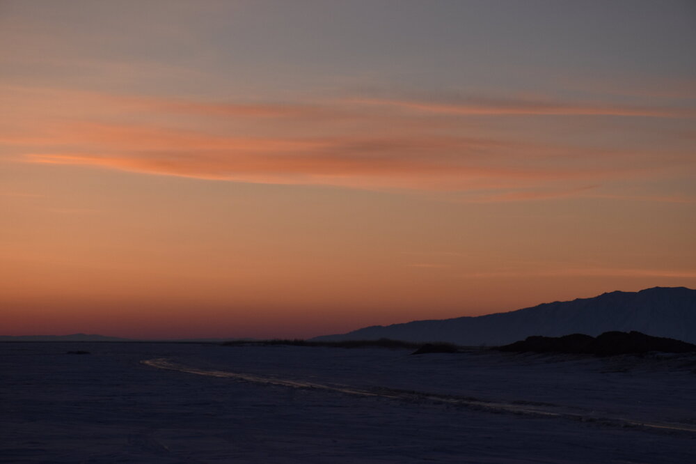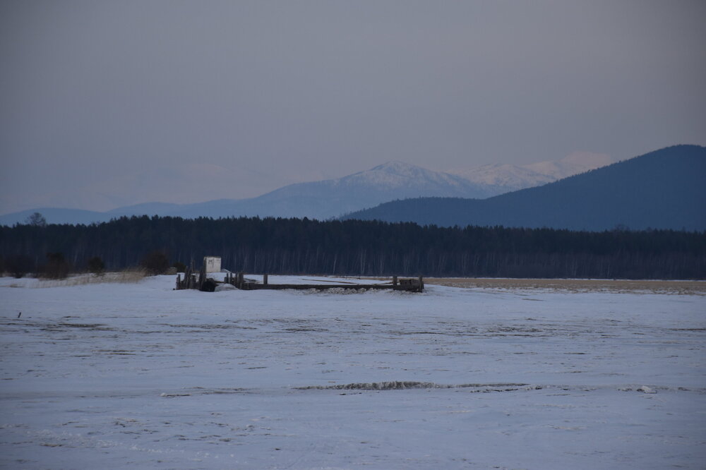 Лед Байкала здесь тоже можно увидеть, только придется поискать. Мы шли по дороге и находили куски без снега. И собака с нами гуляла. В поселке Усть-Баргузин также много собак, которые к нам прибивались. «Местный житель» провел нам экскурсию и показал красивый закат.