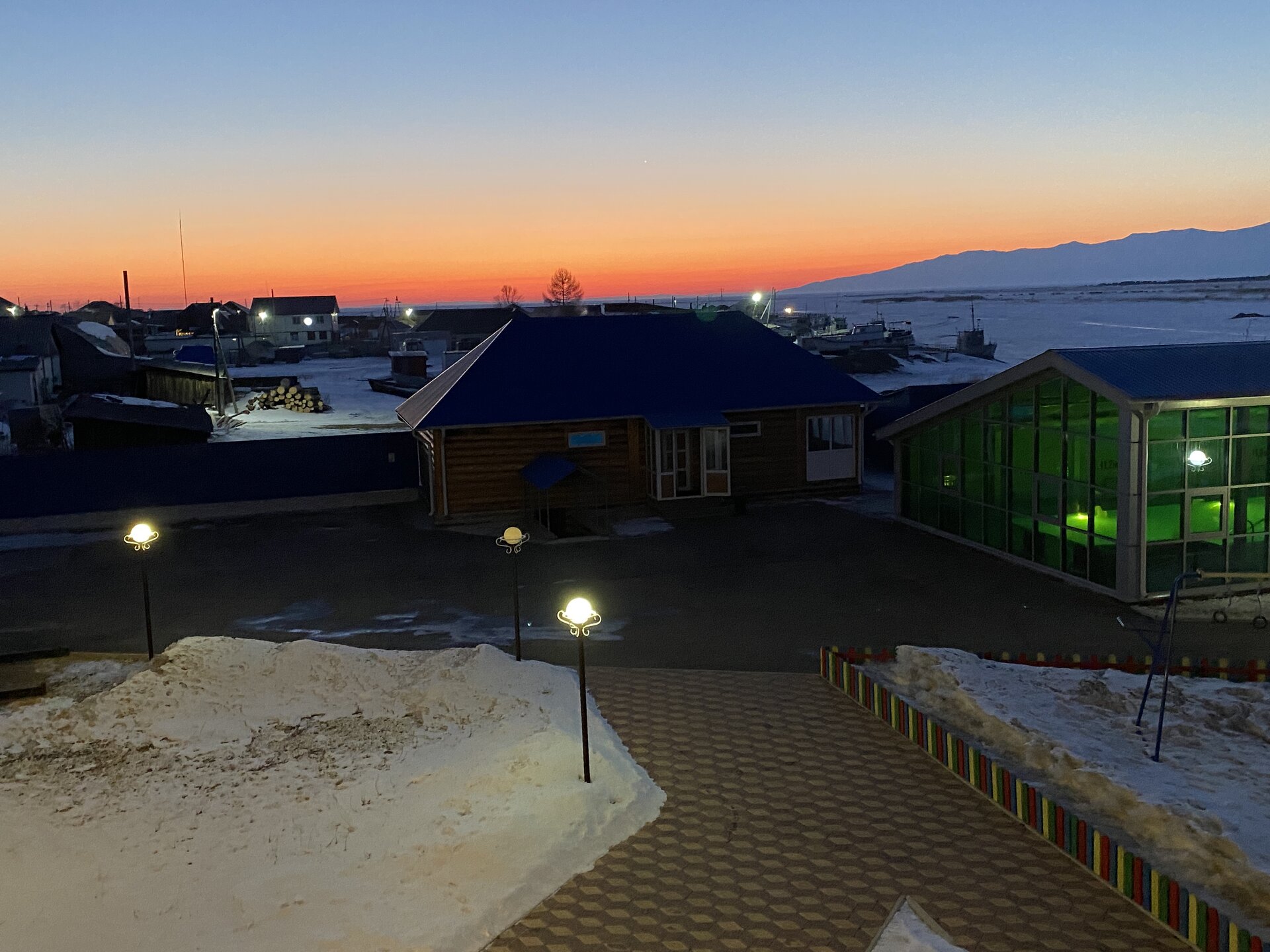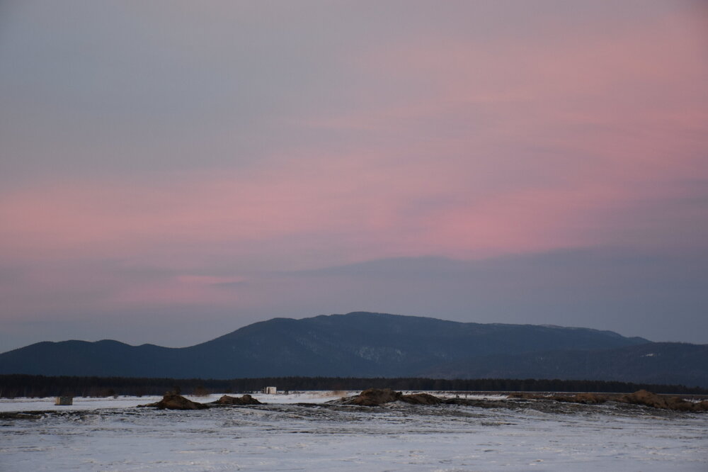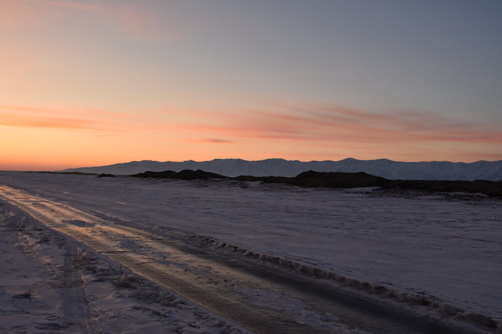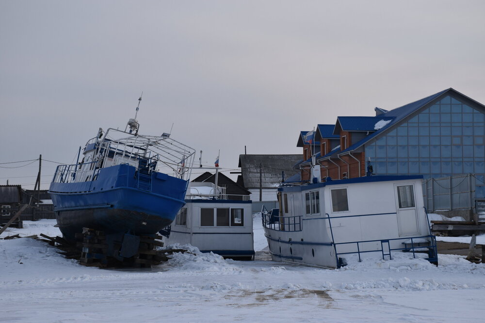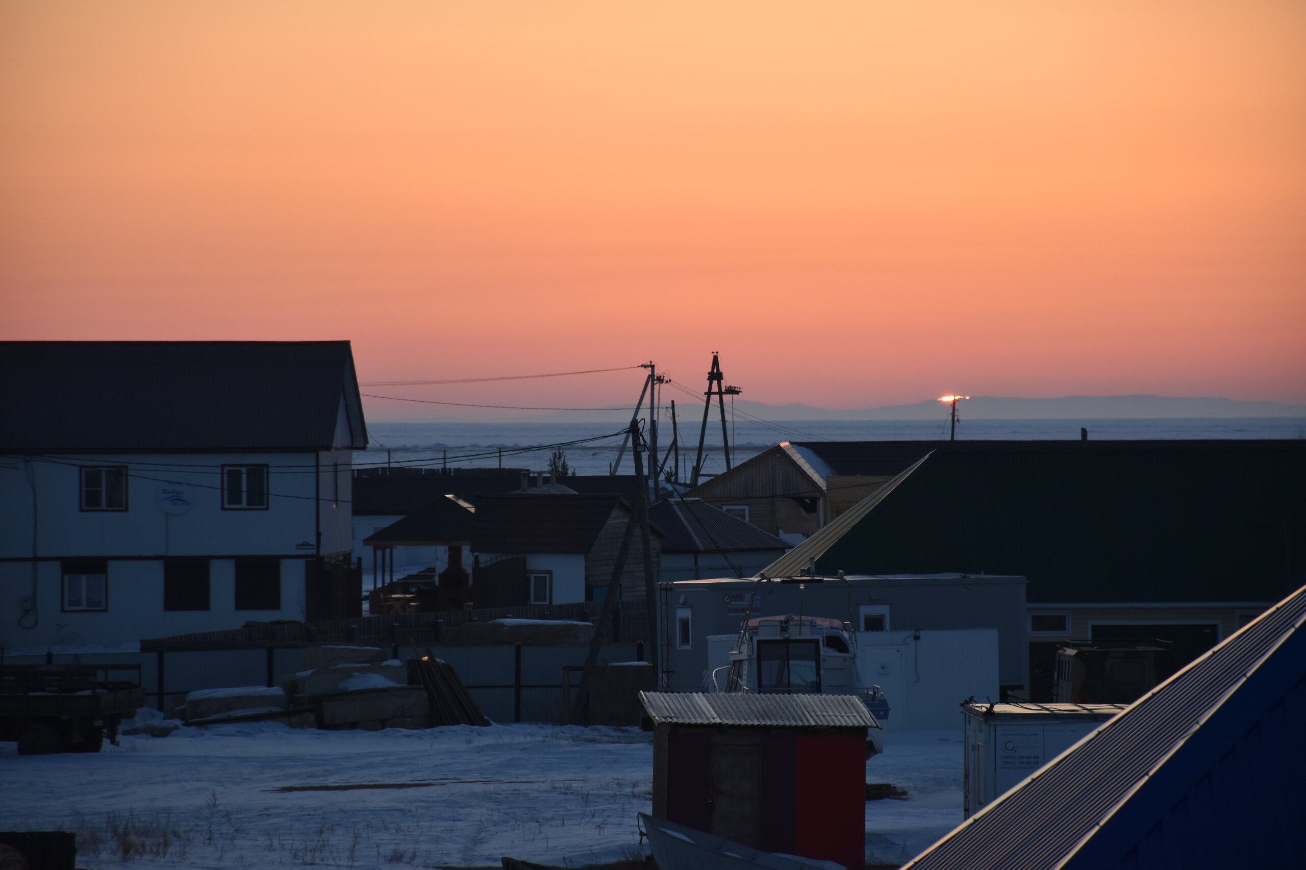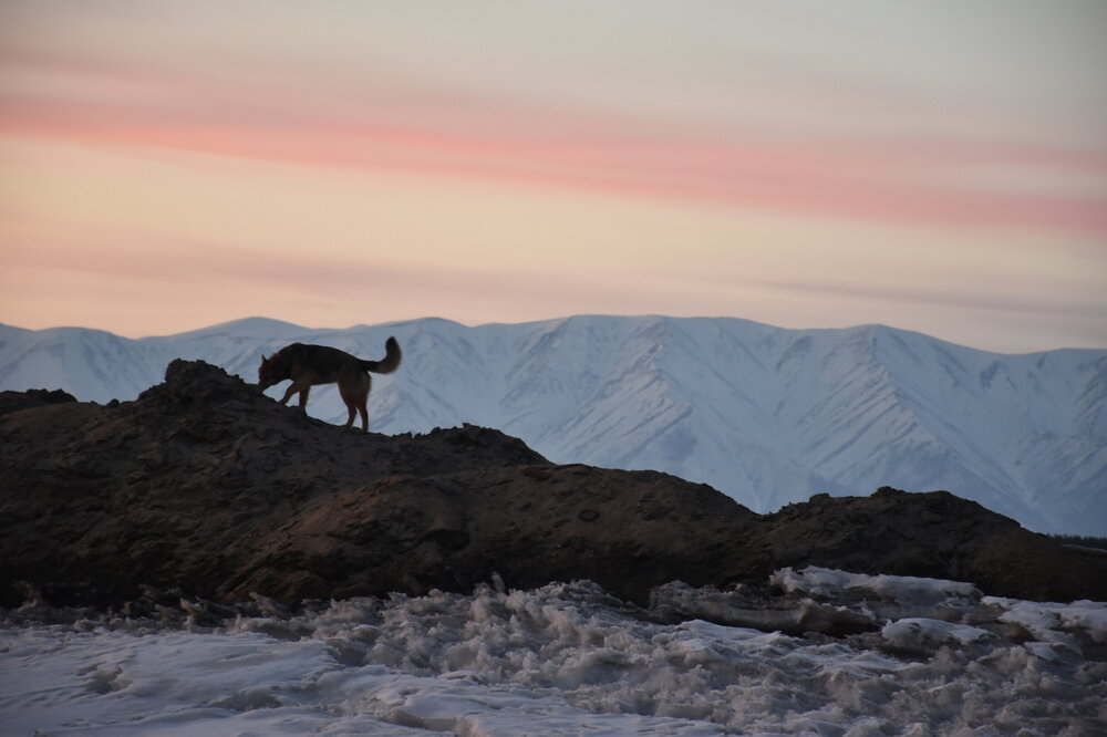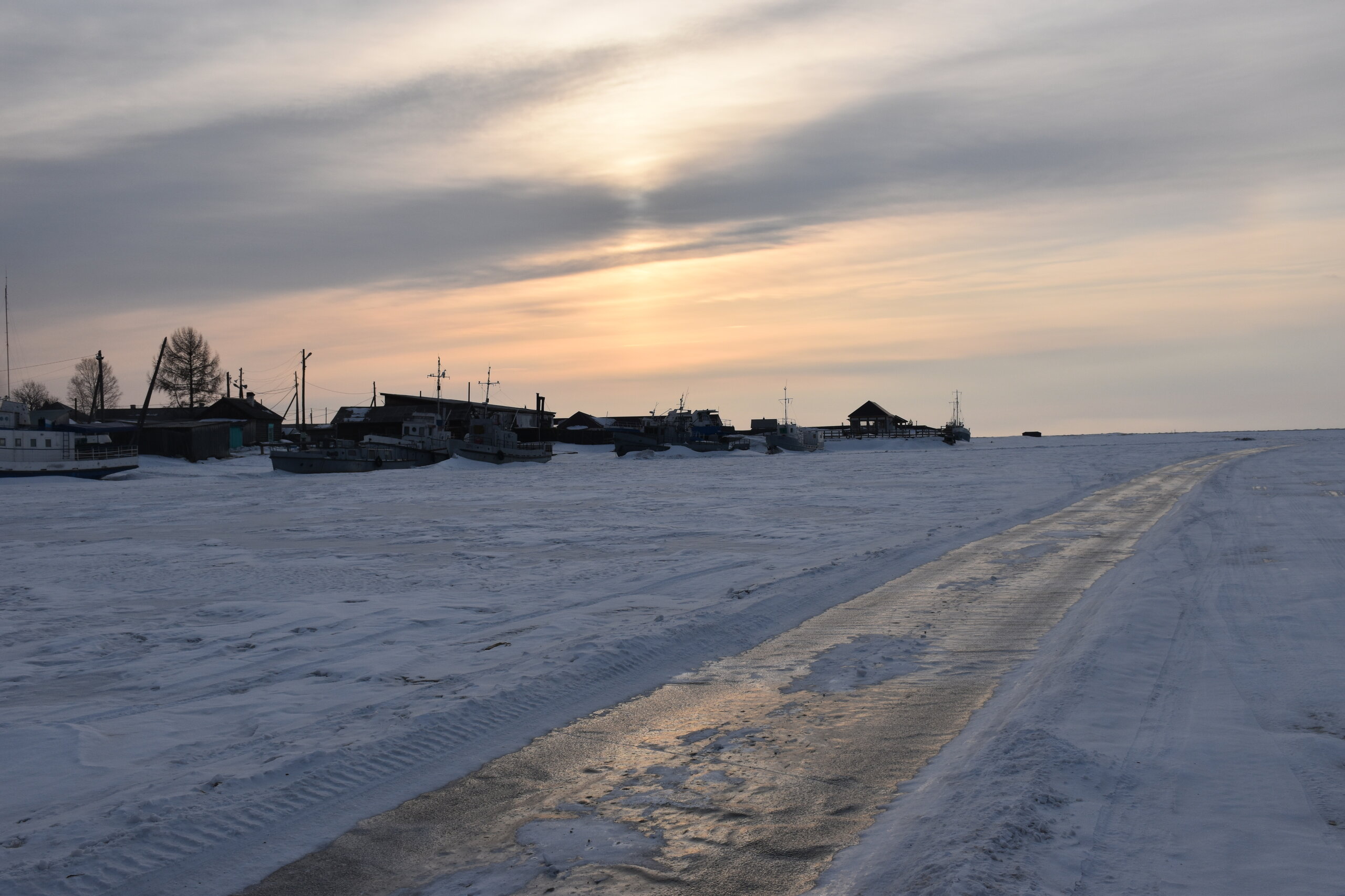 Лед Байкала здесь тоже можно увидеть, только придется поискать. Мы шли по дороге и находили куски без снега. И собака с нами гуляла. В поселке Усть-Баргузин также много собак, которые к нам прибивались. «Местный житель» провел нам экскурсию и показал красивый закат.