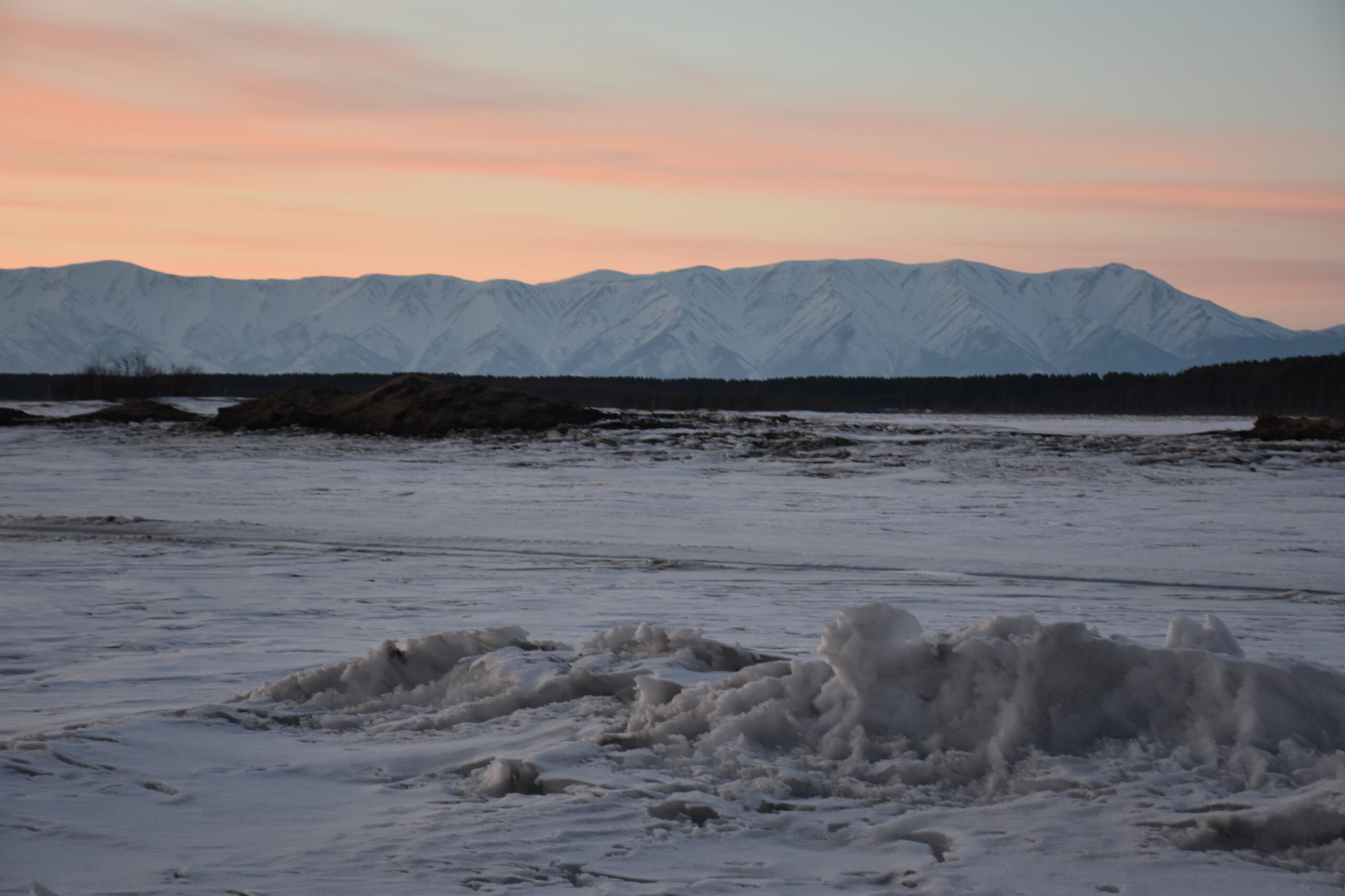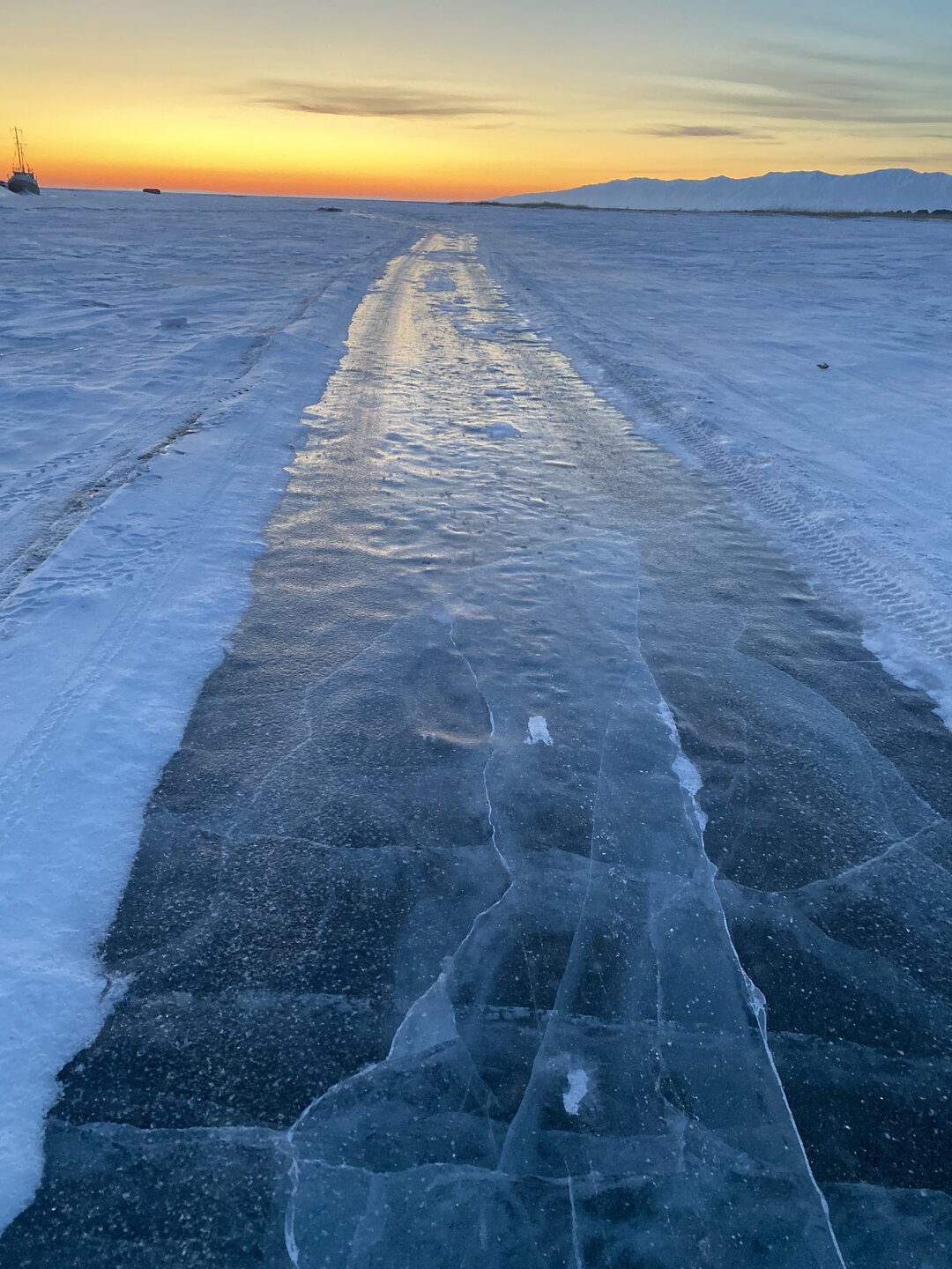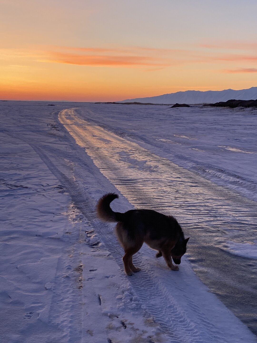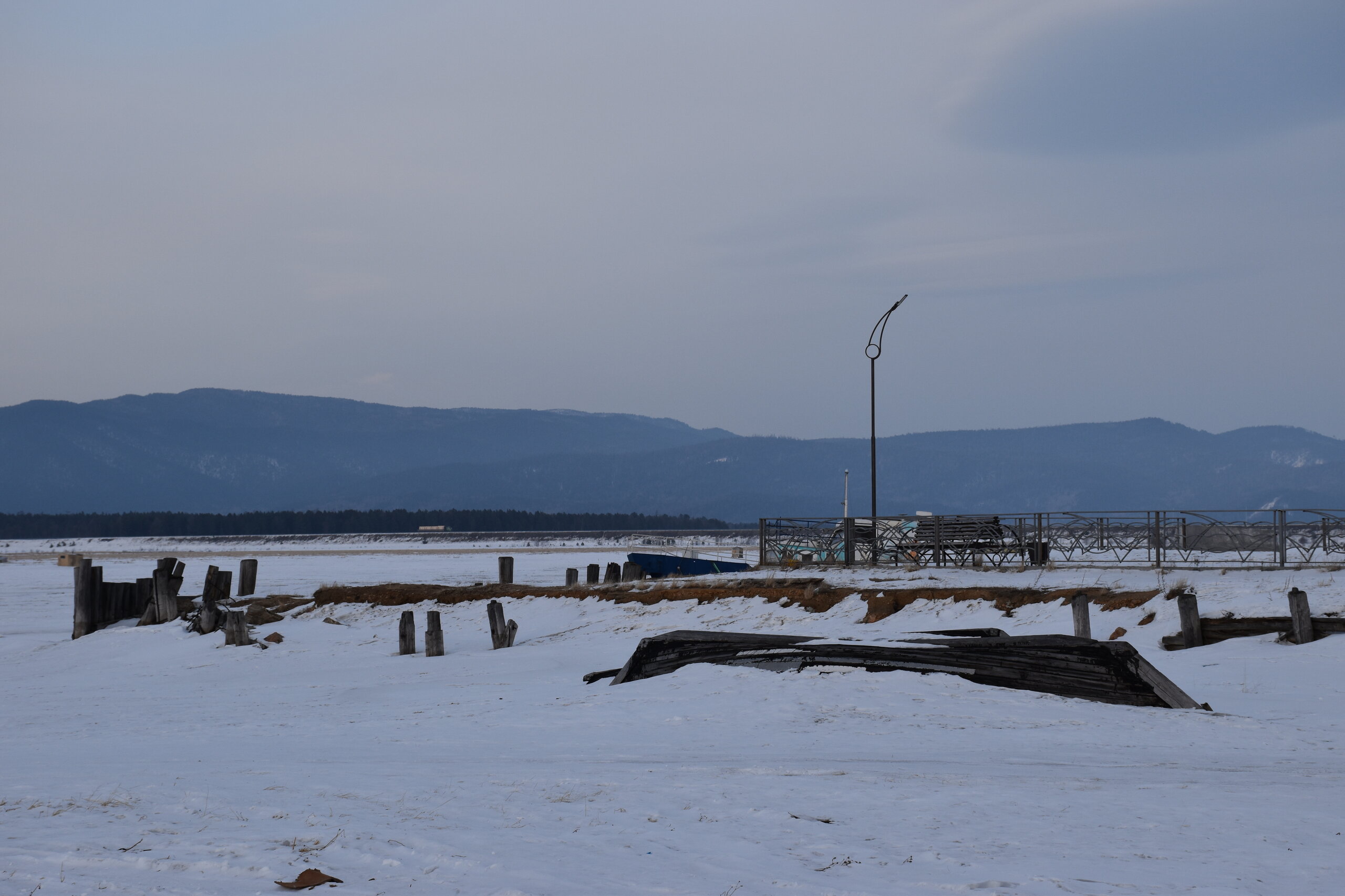 Лед Байкала здесь тоже можно увидеть, только придется поискать. Мы шли по дороге и находили куски без снега. И собака с нами гуляла. В поселке Усть-Баргузин также много собак, которые к нам прибивались. «Местный житель» провел нам экскурсию и показал красивый закат.