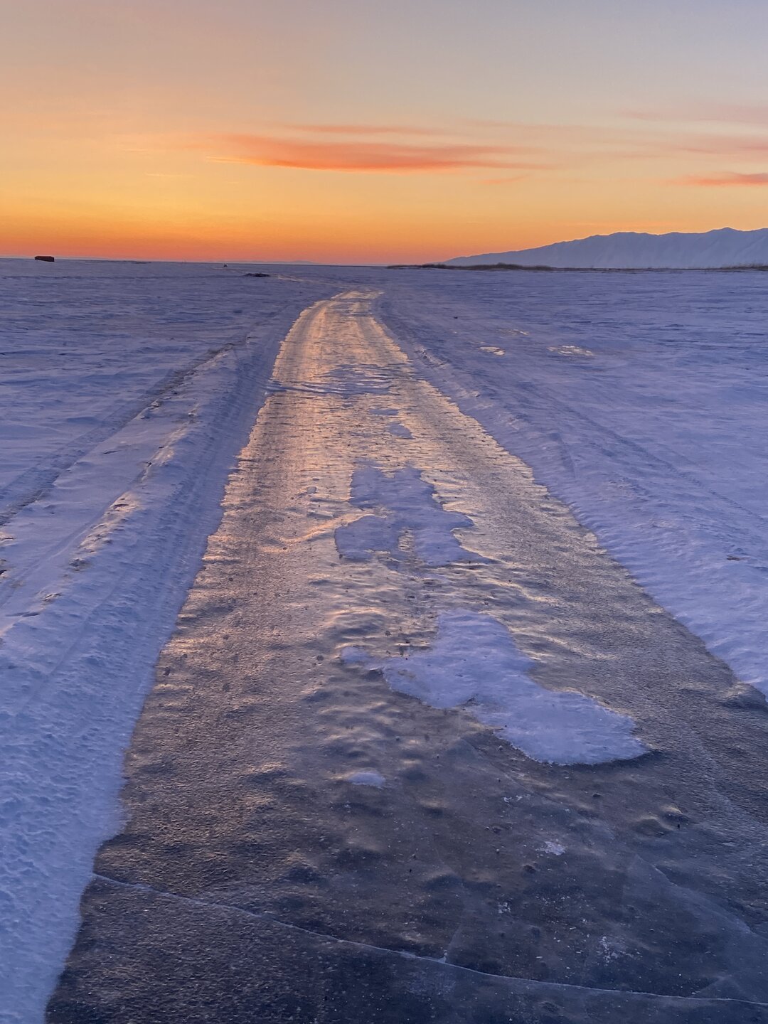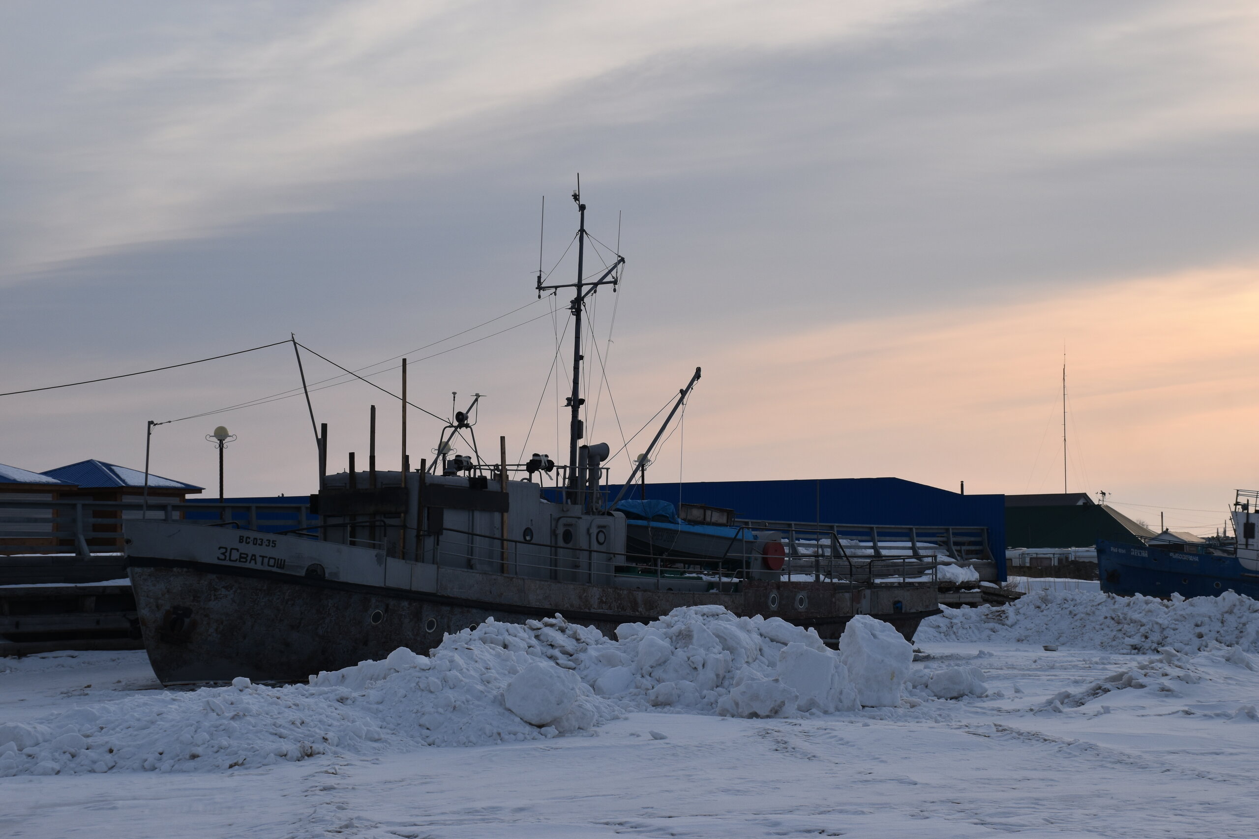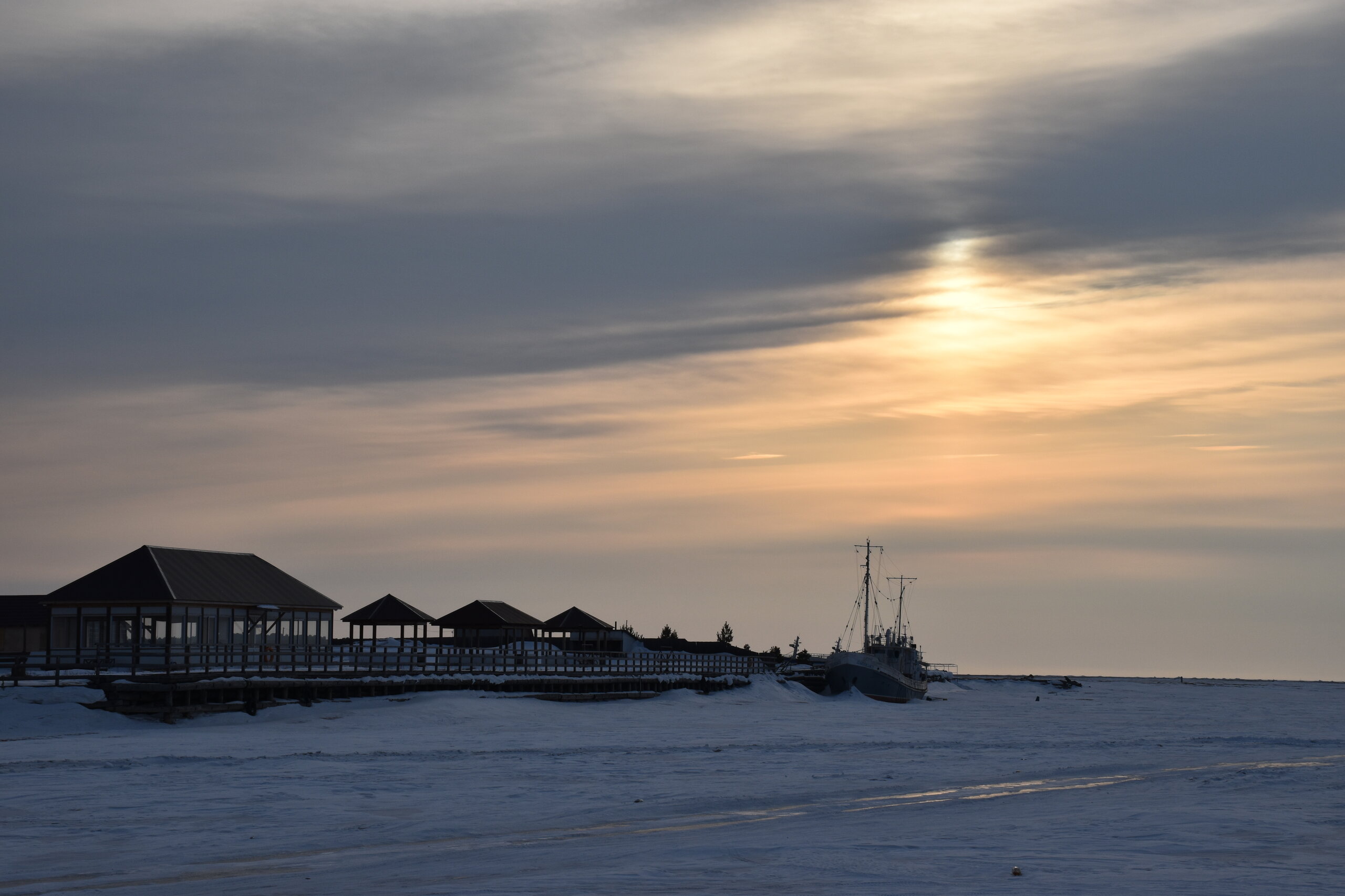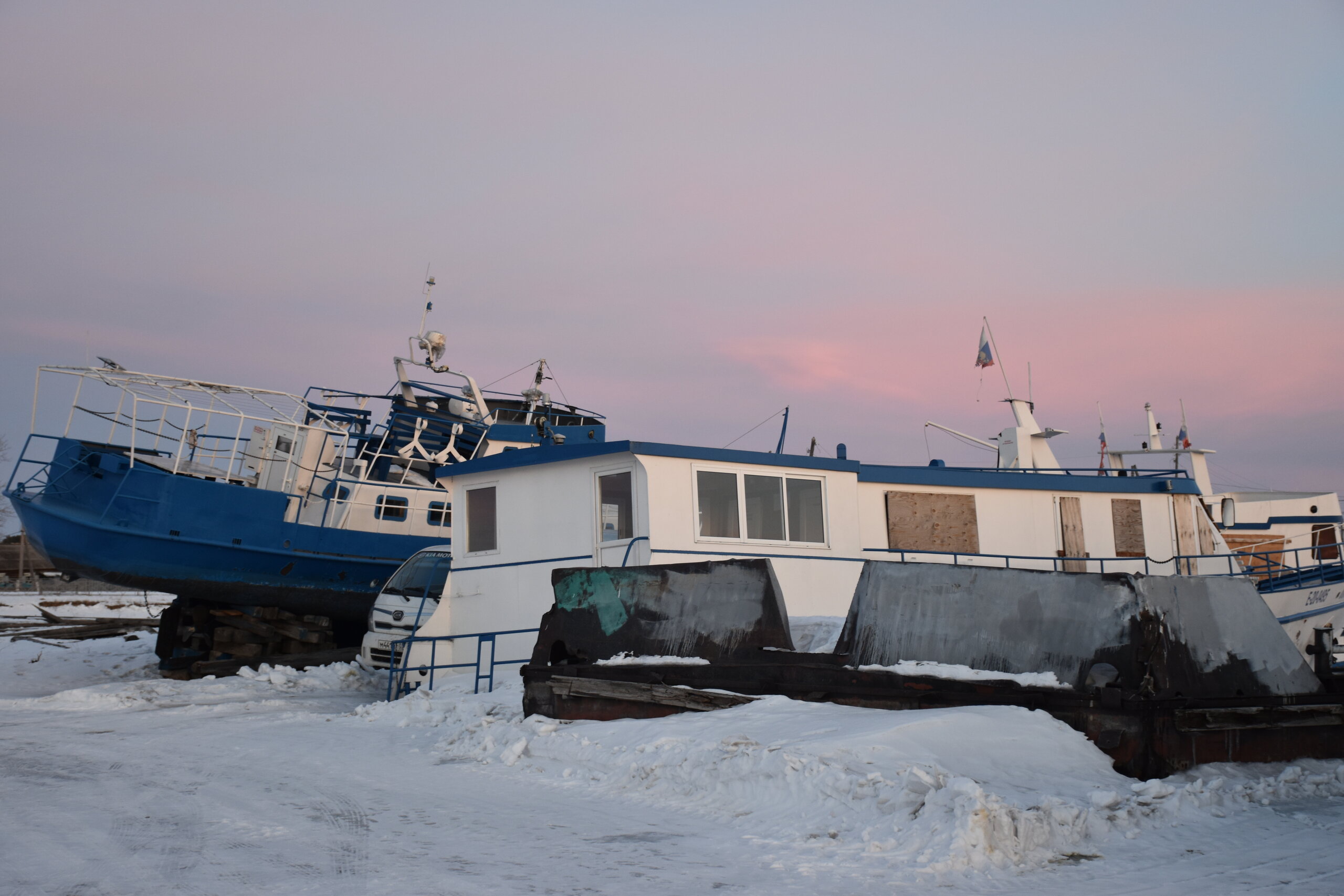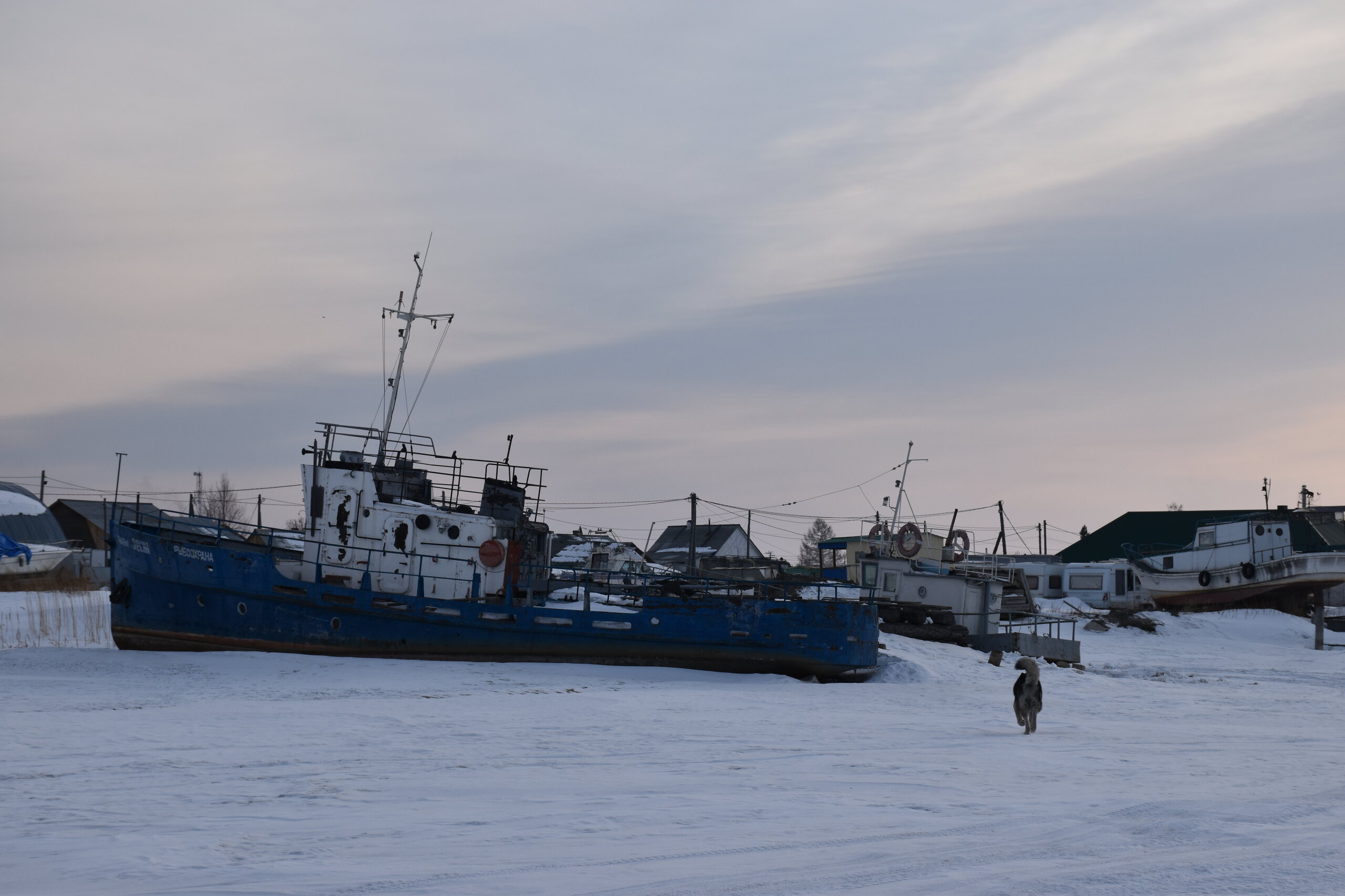 Лед Байкала здесь тоже можно увидеть, только придется поискать. Мы шли по дороге и находили куски без снега. И собака с нами гуляла. В поселке Усть-Баргузин также много собак, которые к нам прибивались. «Местный житель» провел нам экскурсию и показал красивый закат.