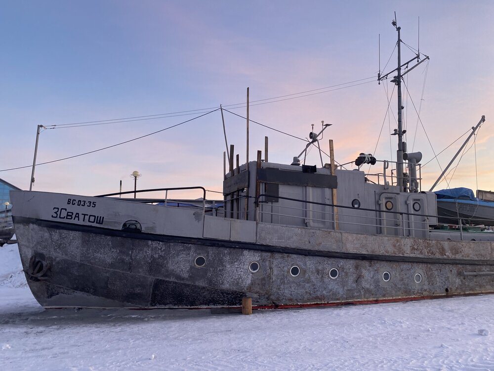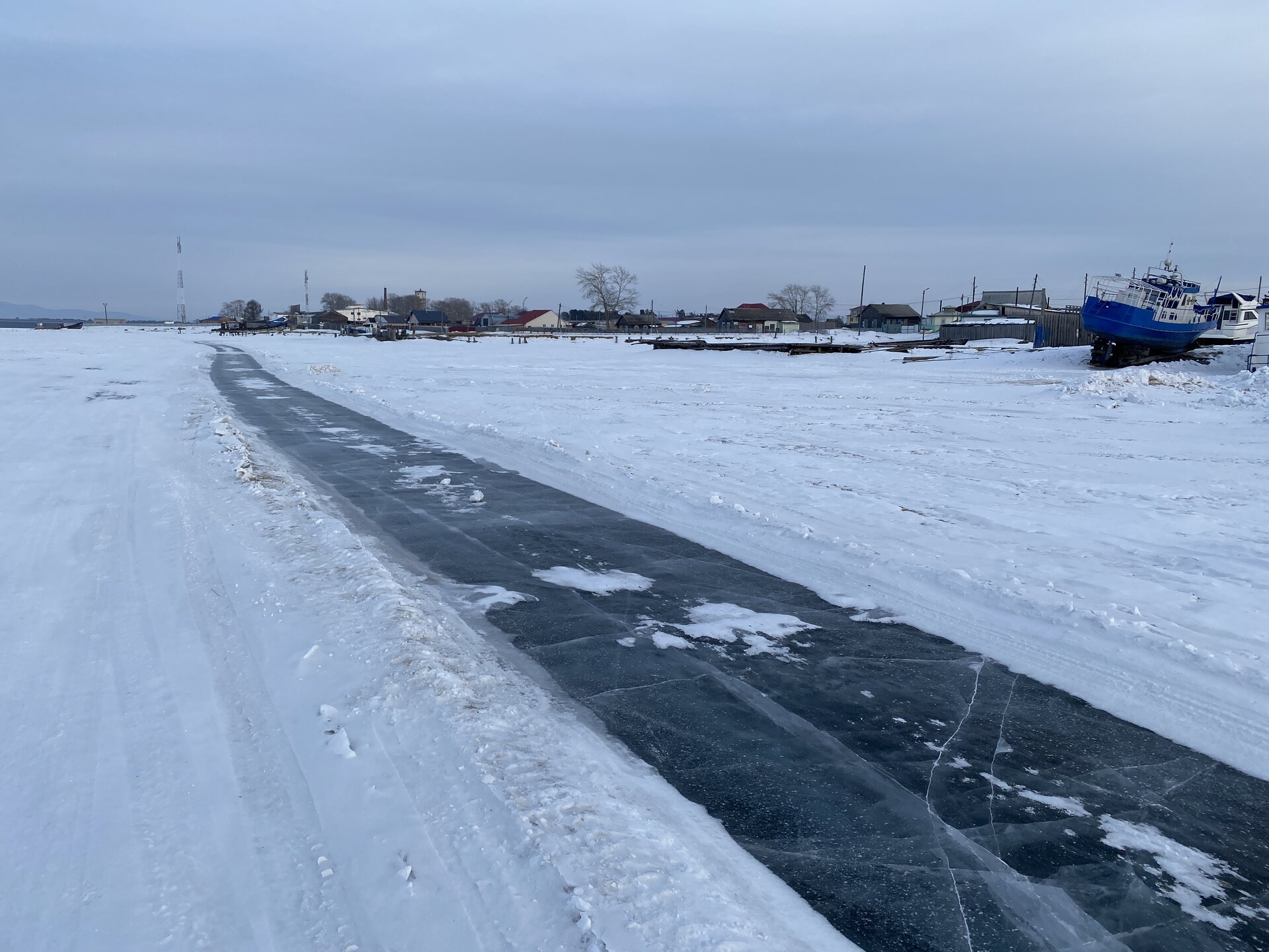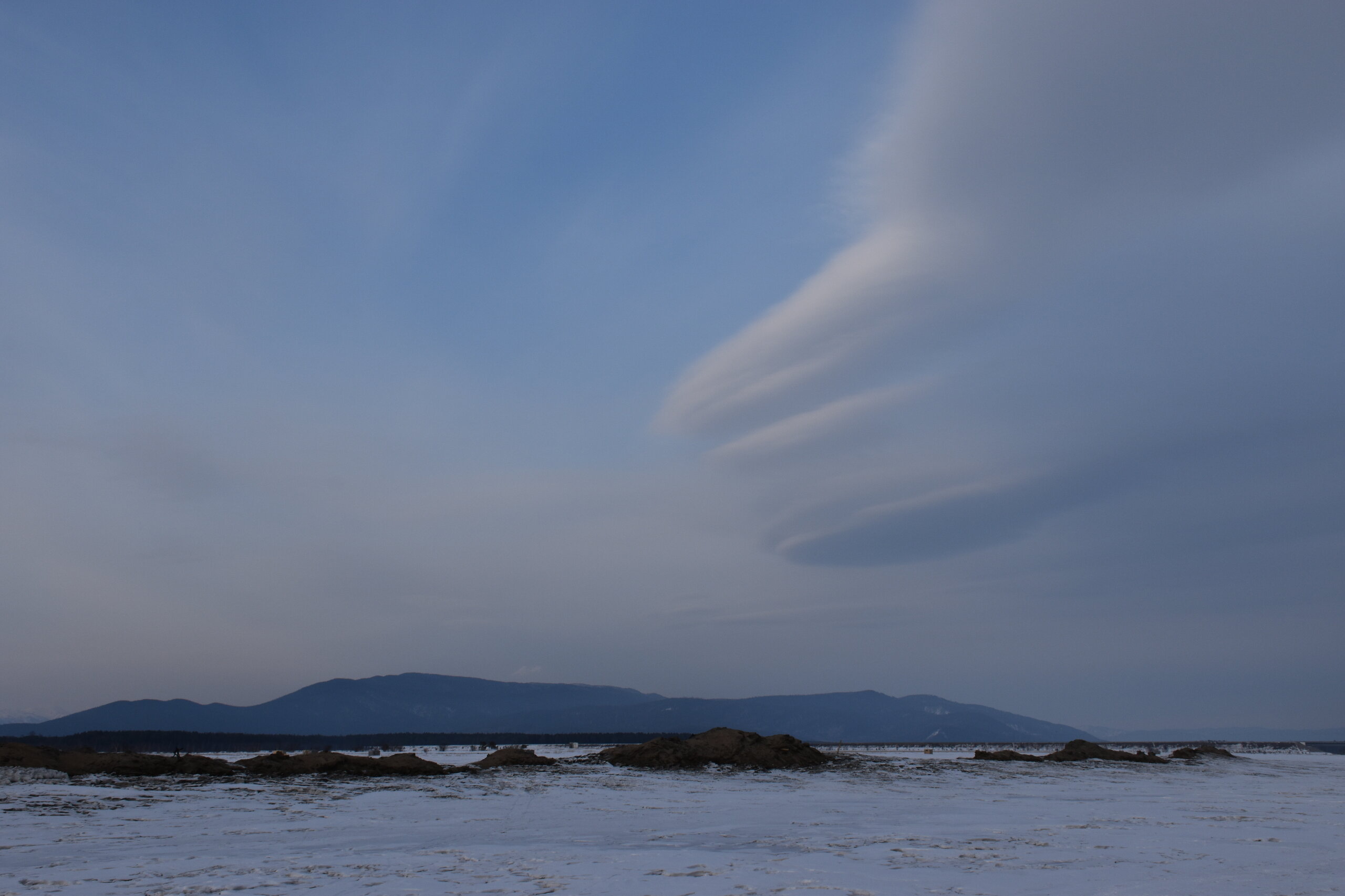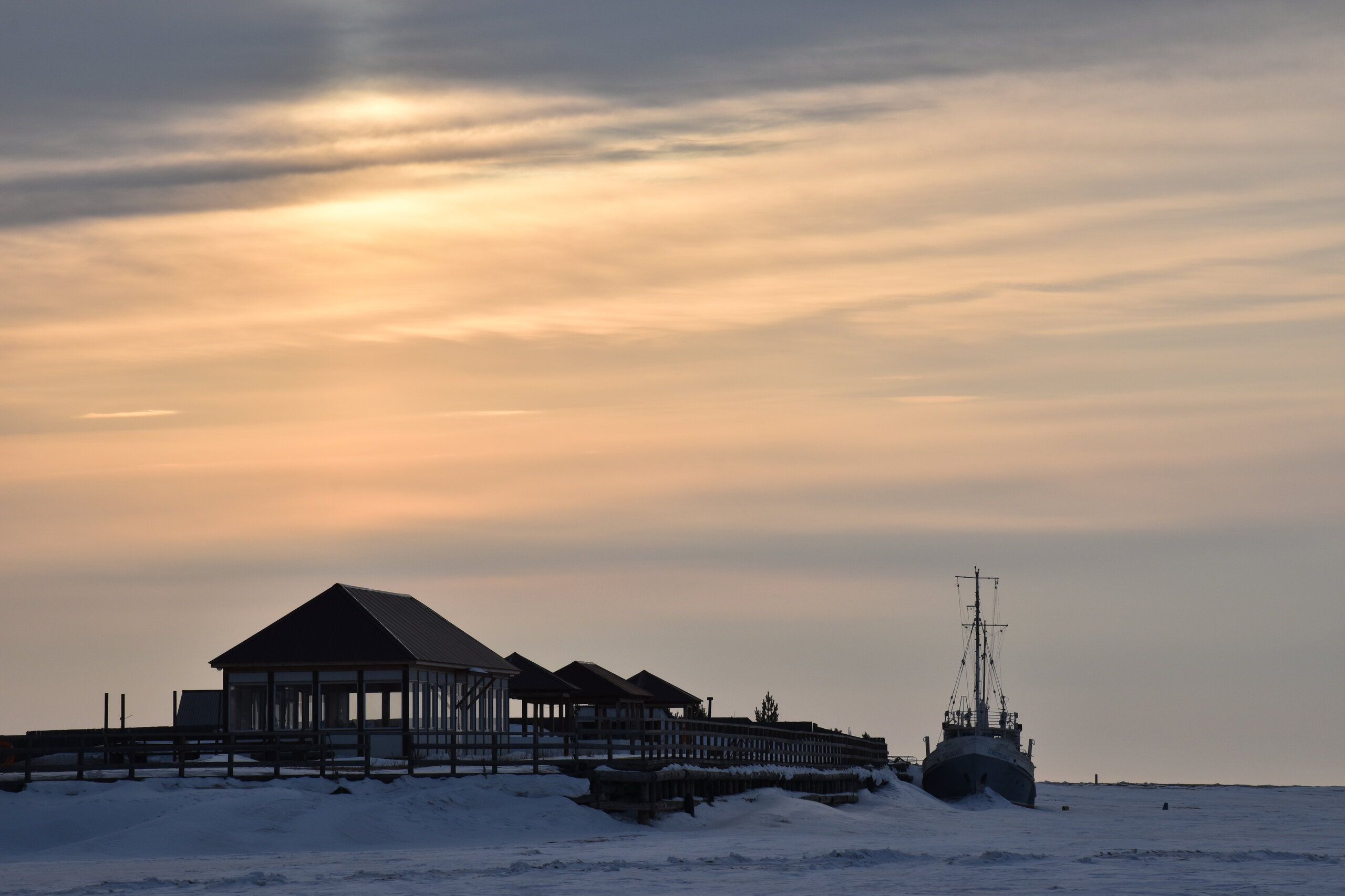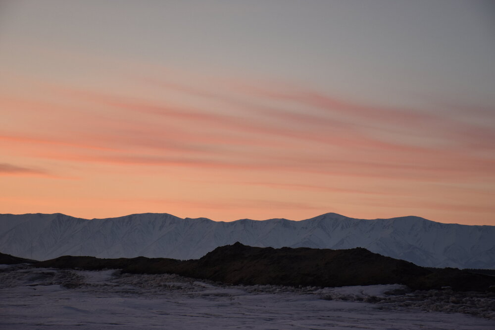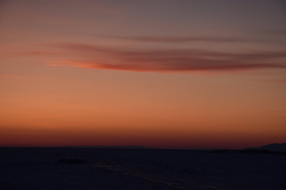 Лед Байкала здесь тоже можно увидеть, только придется поискать. Мы шли по дороге и находили куски без снега. И собака с нами гуляла. В поселке Усть-Баргузин также много собак, которые к нам прибивались. «Местный житель» провел нам экскурсию и показал красивый закат.