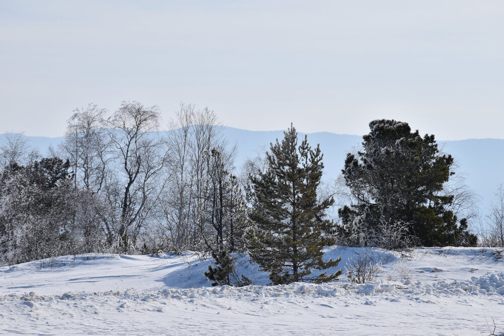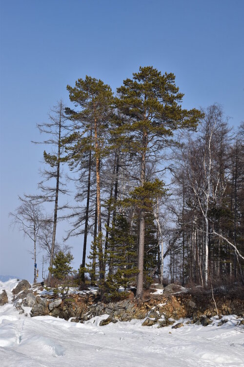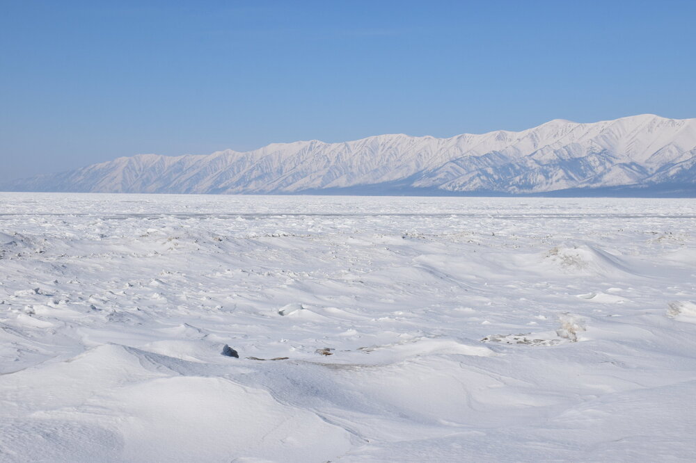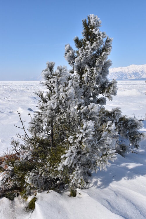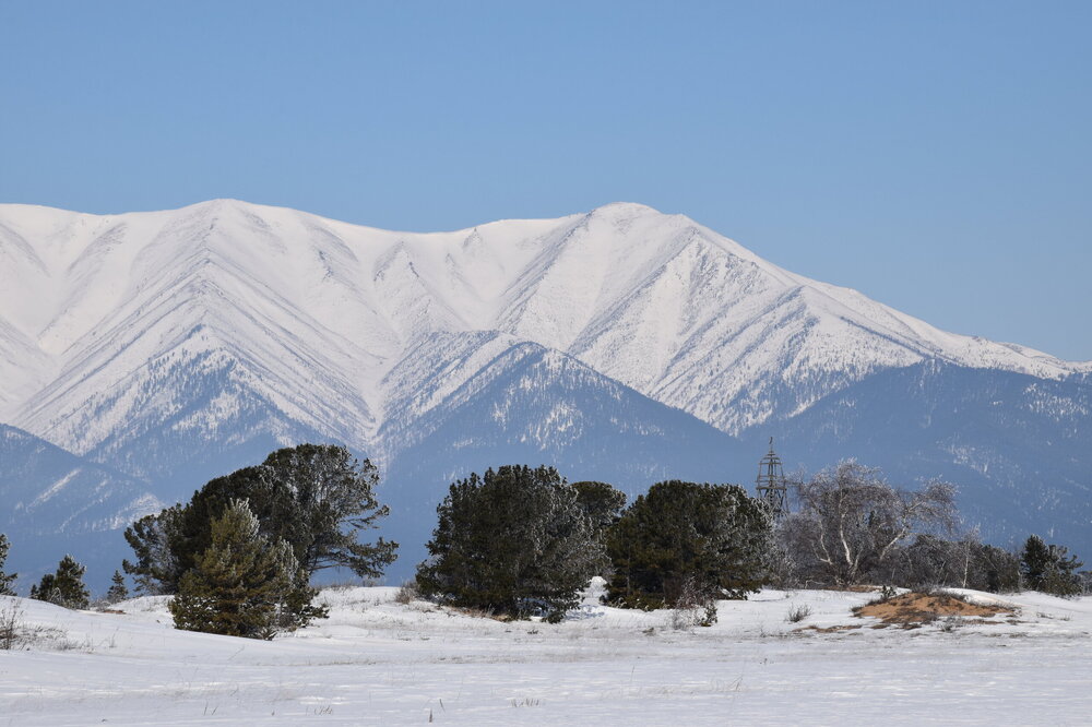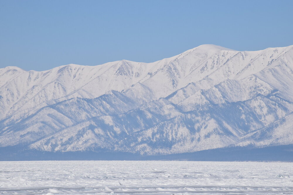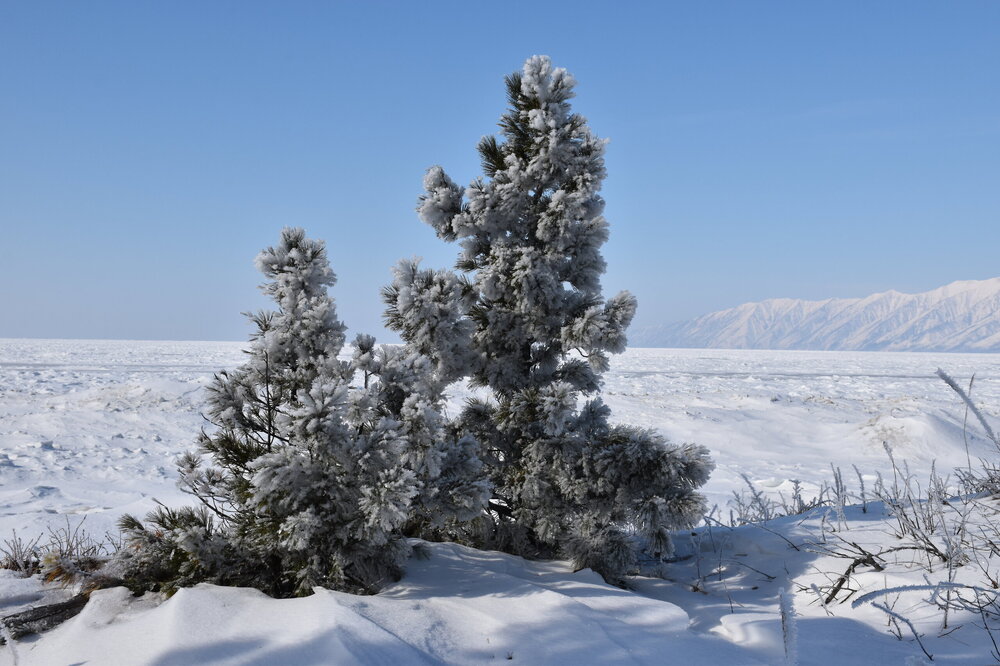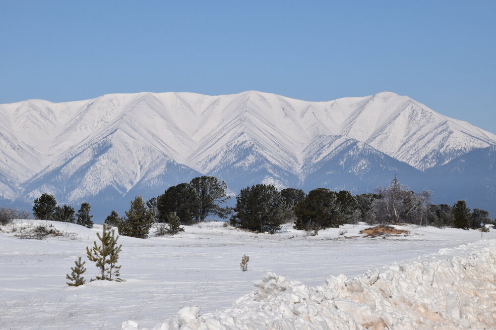 Удивительно, восточное побережье Байкала совершенно другое! Пару дней назад передо мной была зеркальная гладь льда с красивыми узорами, а сейчас – белое полотно озера и отовсюду видны горные цепи, вершины которых покрыты вечными снегами. А еще потрясающие сосны!