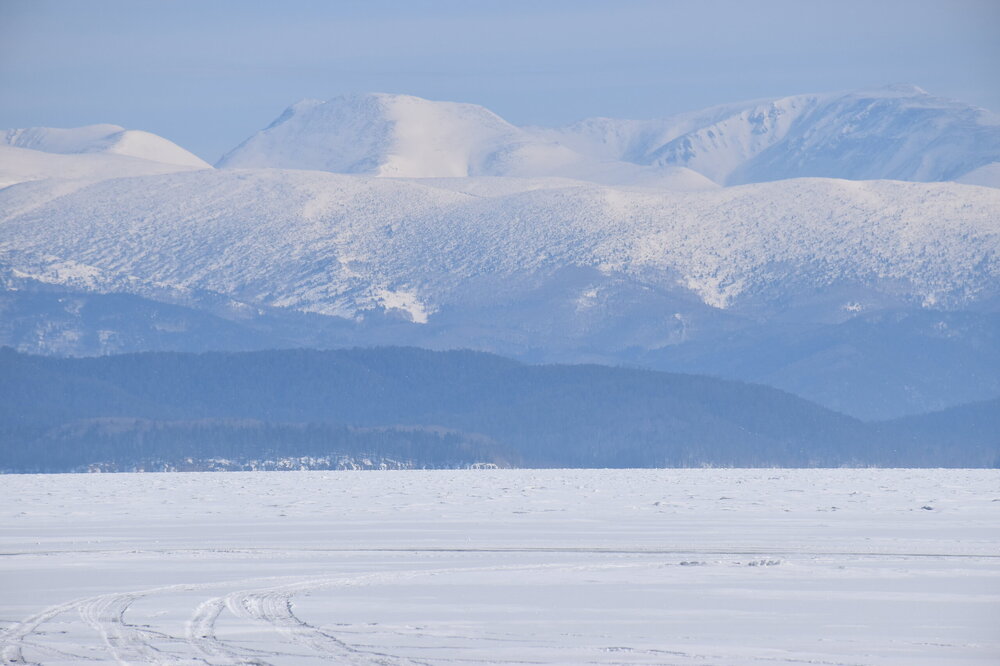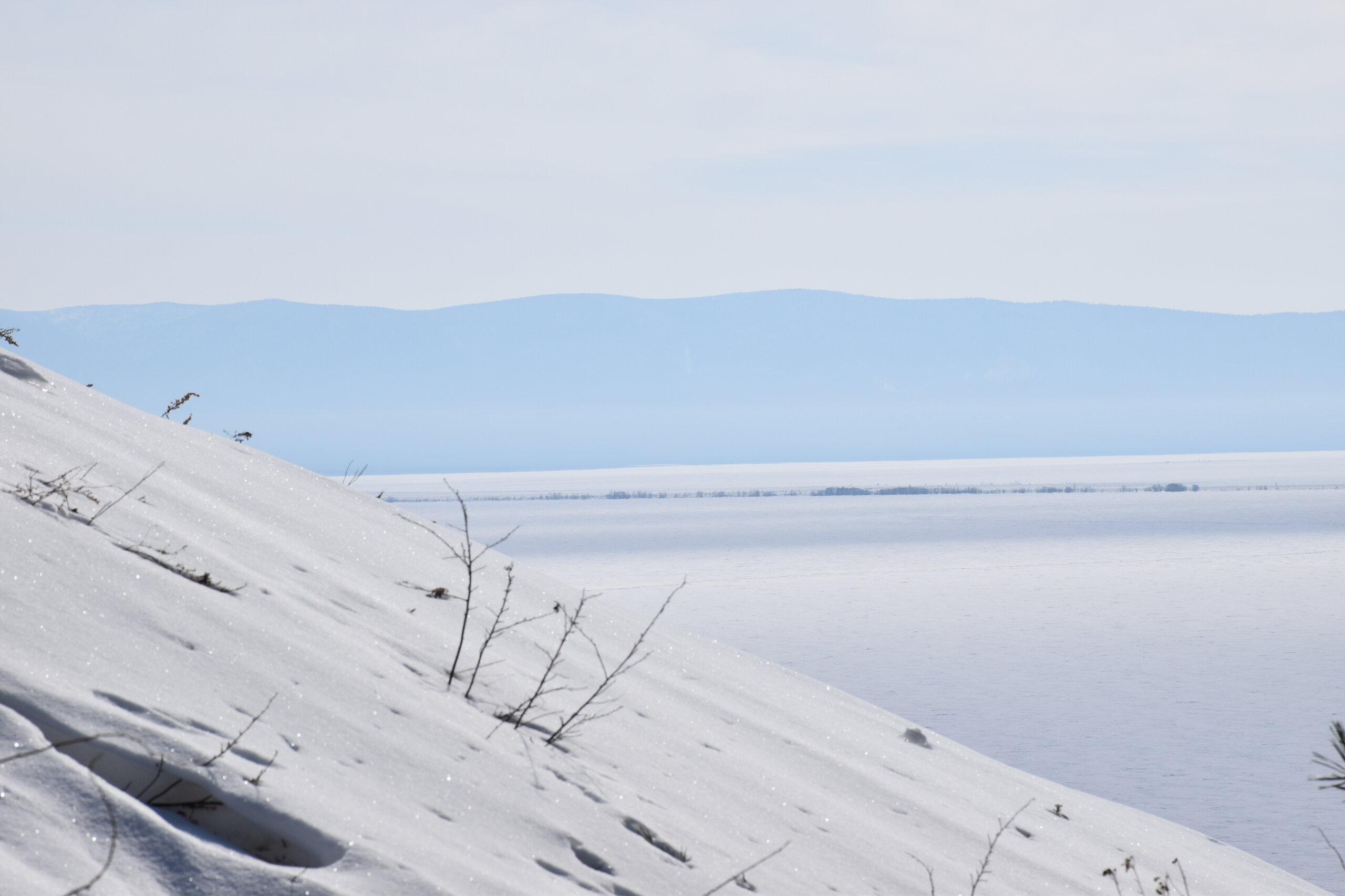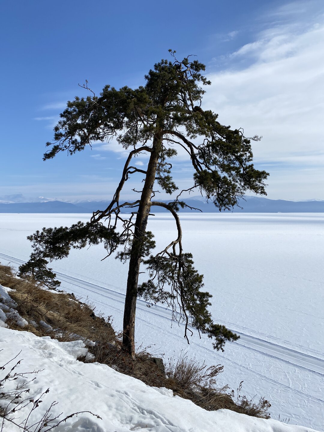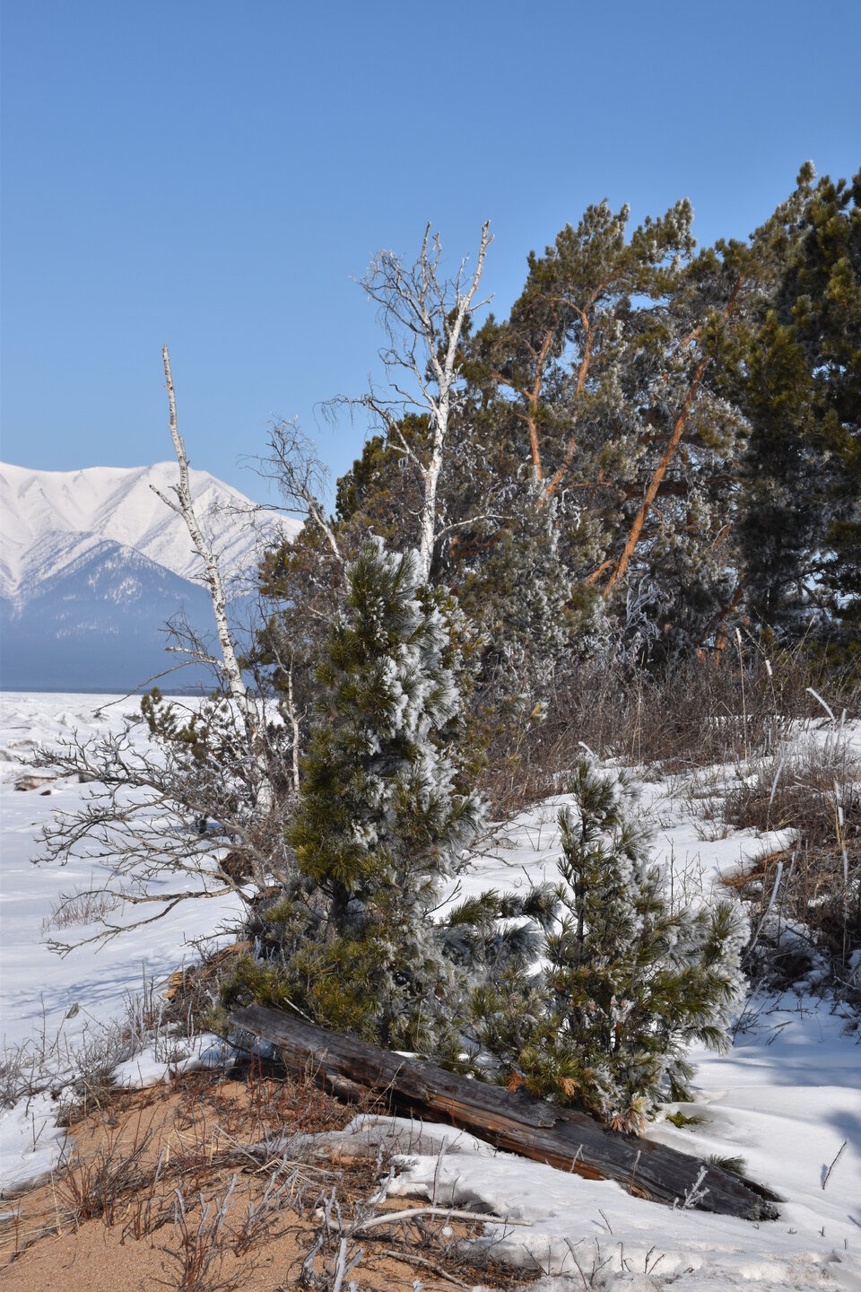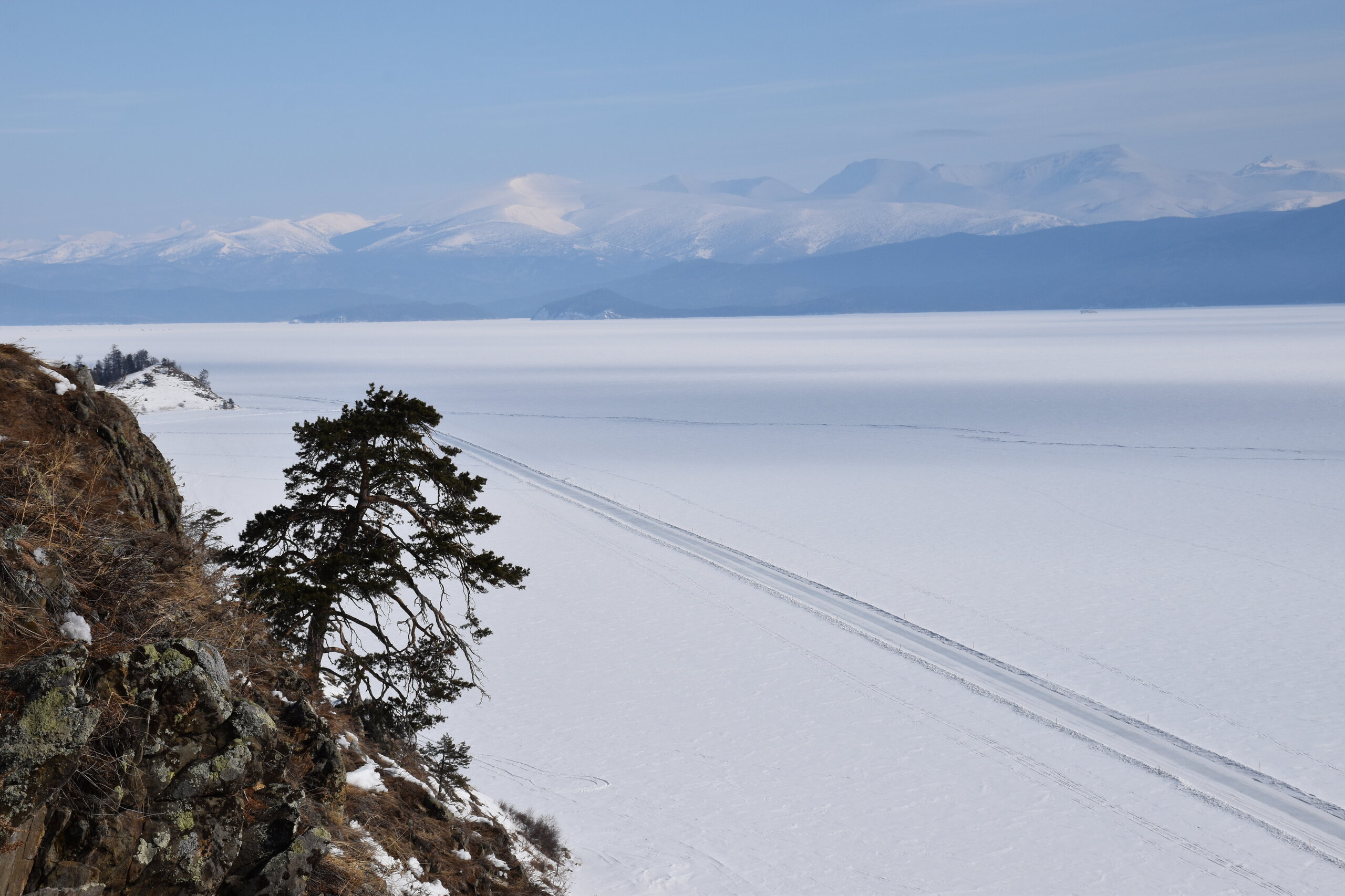Удивительно, восточное побережье Байкала совершенно другое! Пару дней назад передо мной была зеркальная гладь льда с красивыми узорами, а сейчас – белое полотно озера и отовсюду видны горные цепи, вершины которых покрыты вечными снегами. А еще потрясающие сосны!