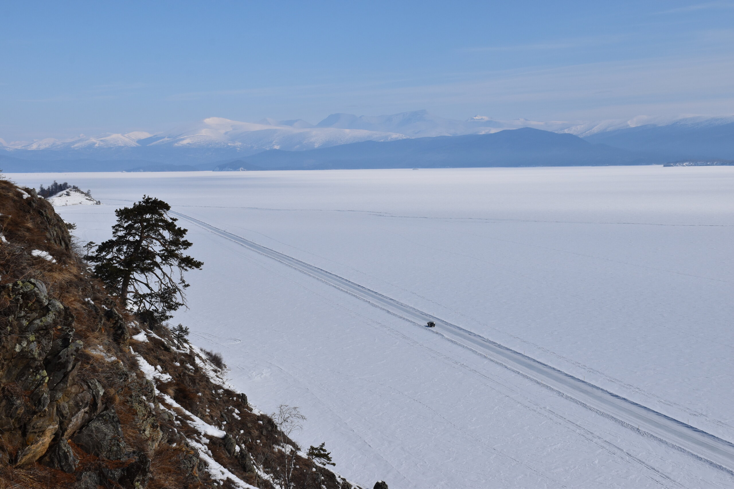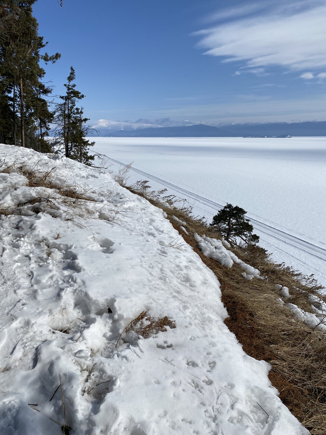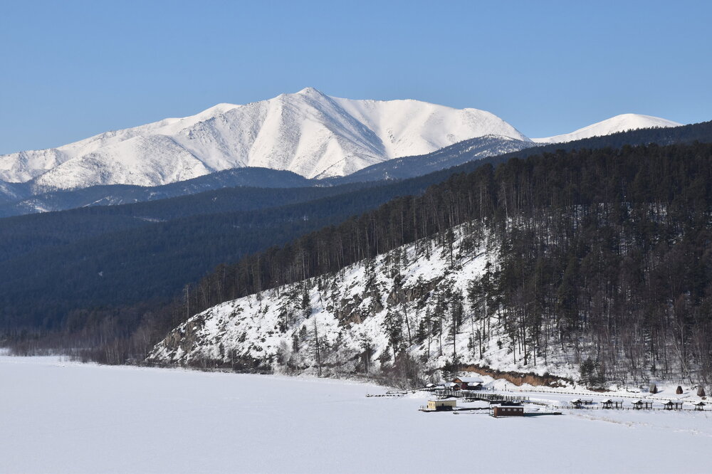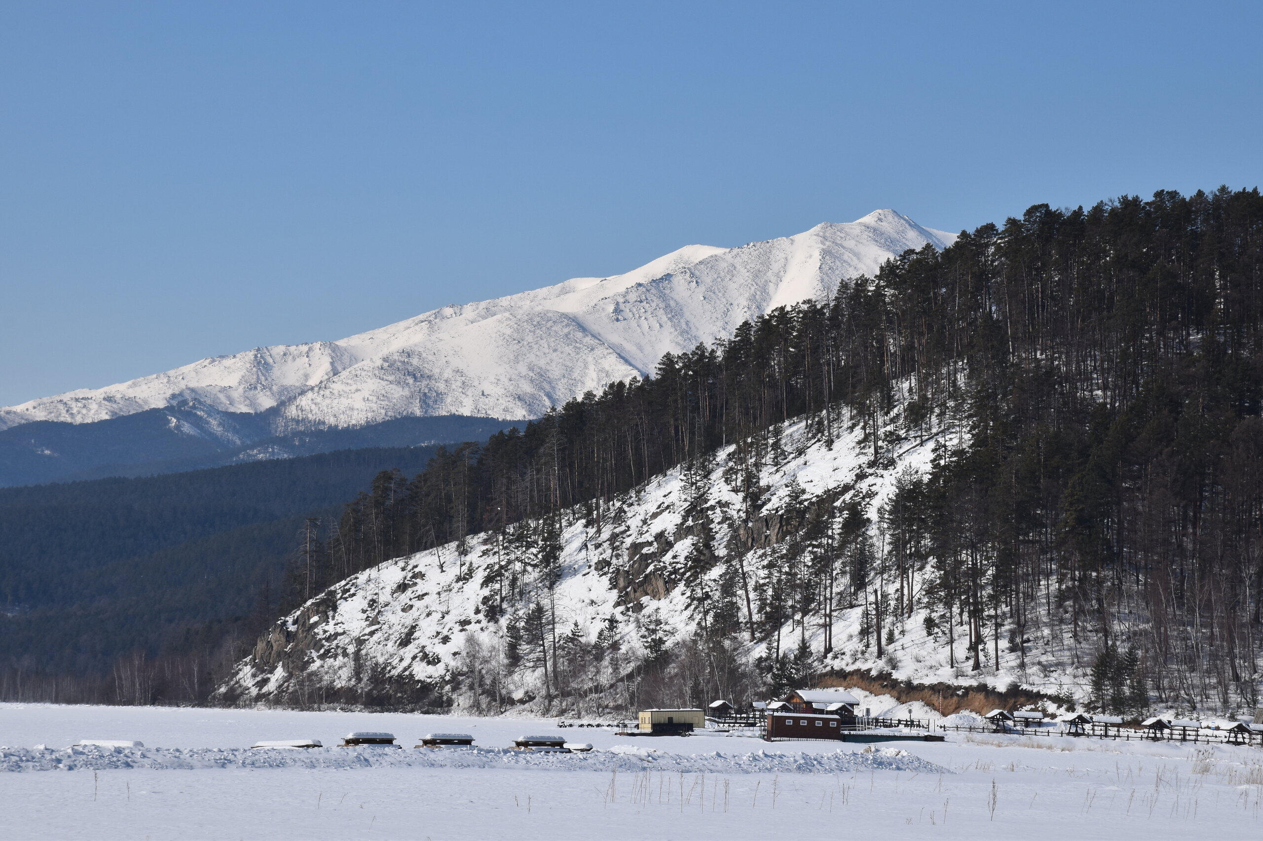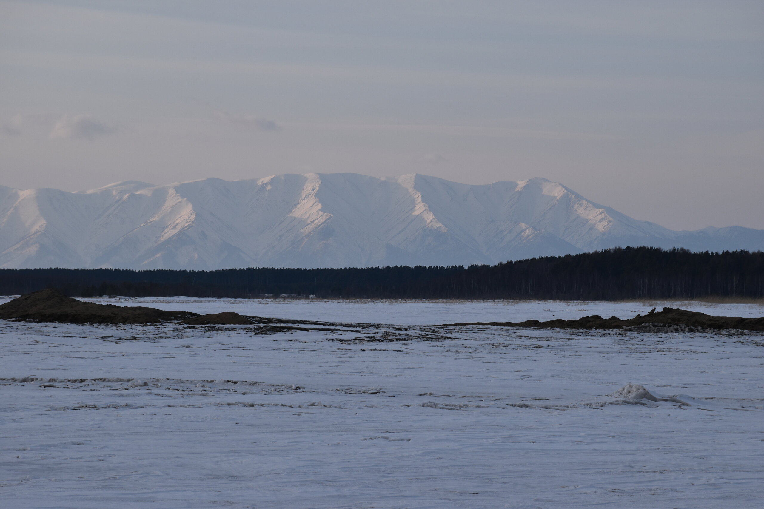 Удивительно, восточное побережье Байкала совершенно другое! Пару дней назад передо мной была зеркальная гладь льда с красивыми узорами, а сейчас – белое полотно озера и отовсюду видны горные цепи, вершины которых покрыты вечными снегами. А еще потрясающие сосны!