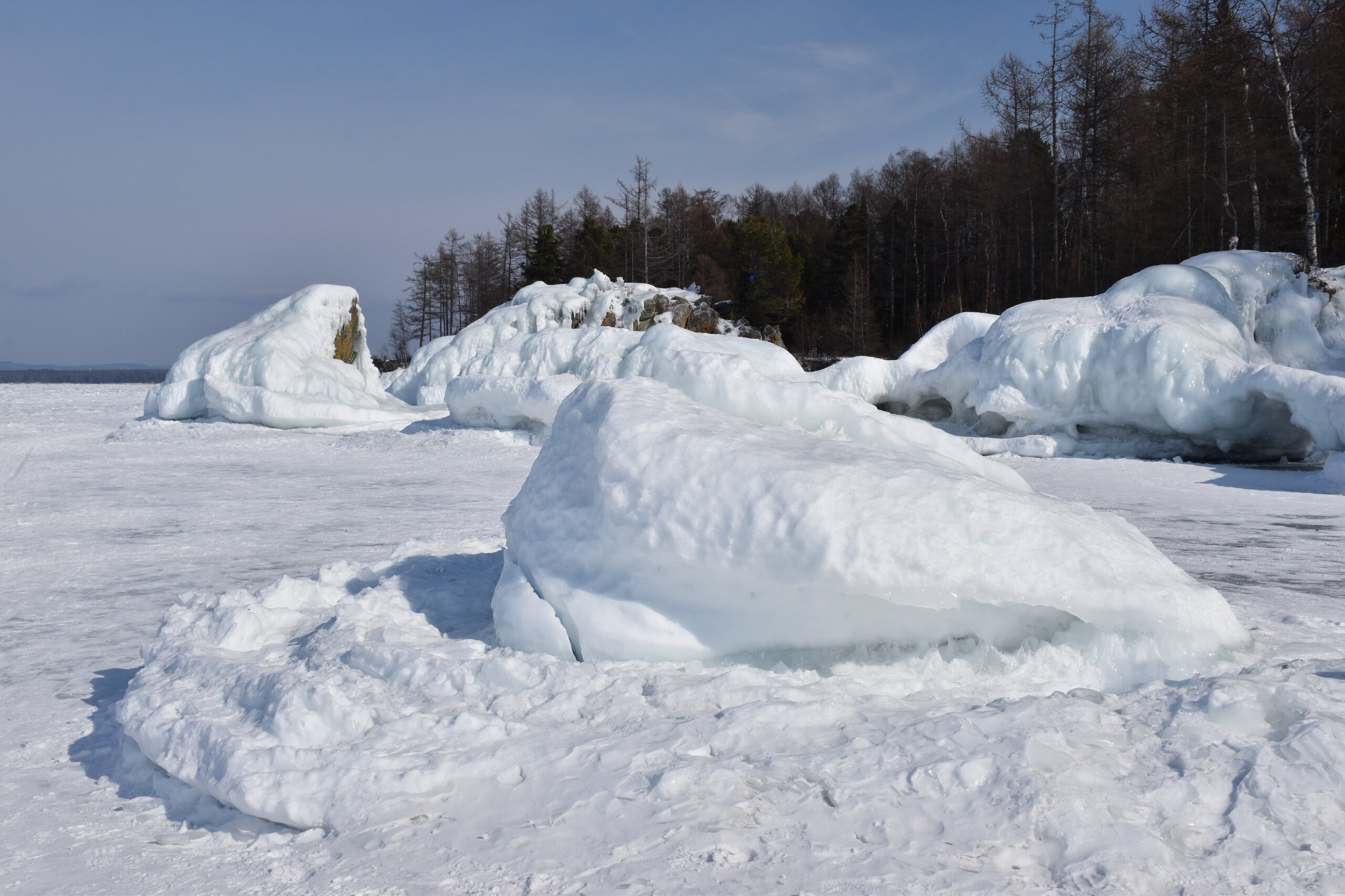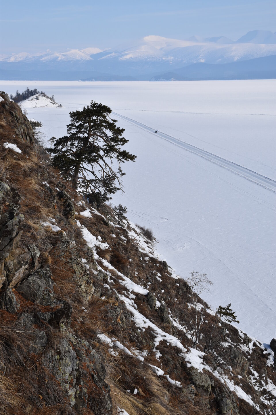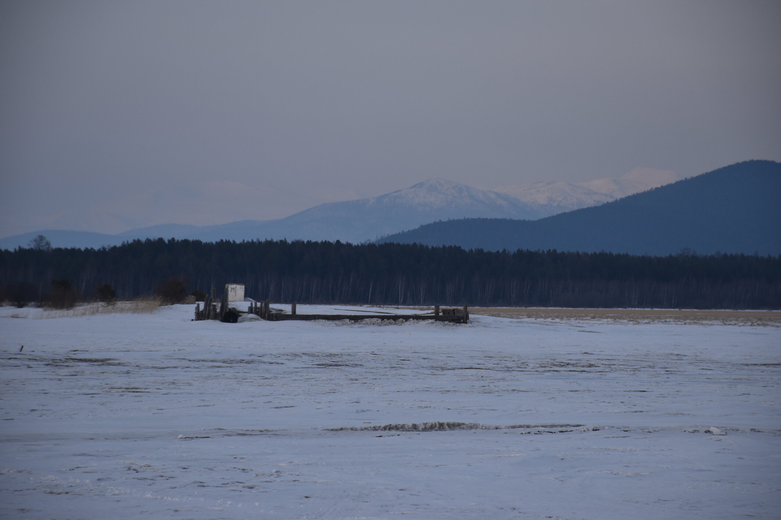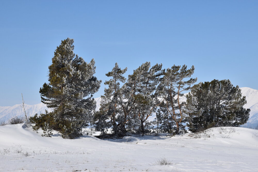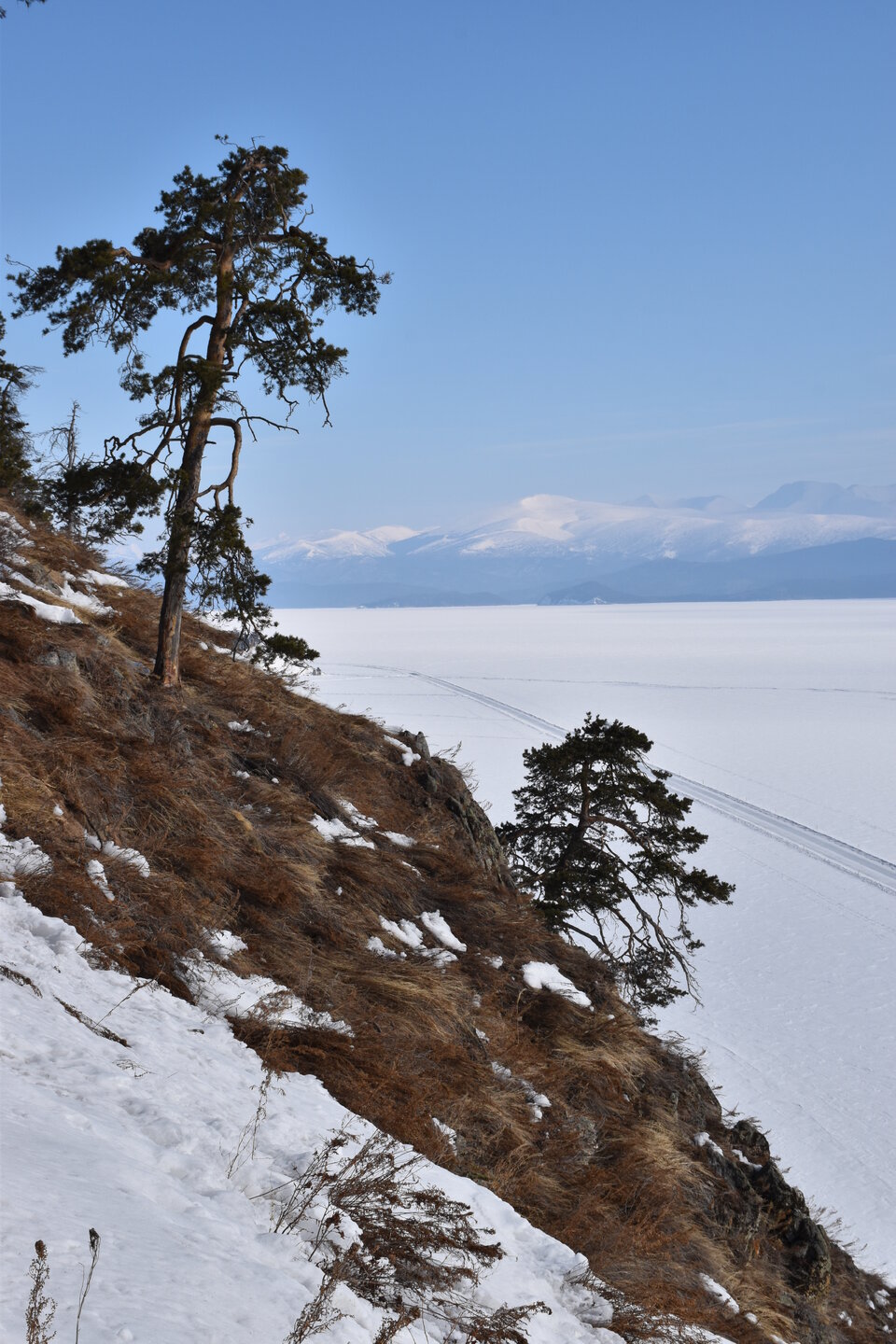 Удивительно, восточное побережье Байкала совершенно другое! Пару дней назад передо мной была зеркальная гладь льда с красивыми узорами, а сейчас – белое полотно озера и отовсюду видны горные цепи, вершины которых покрыты вечными снегами. А еще потрясающие сосны!