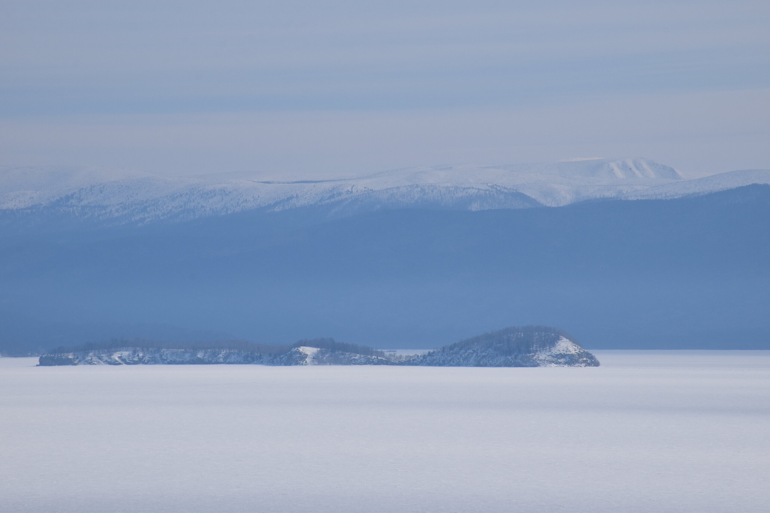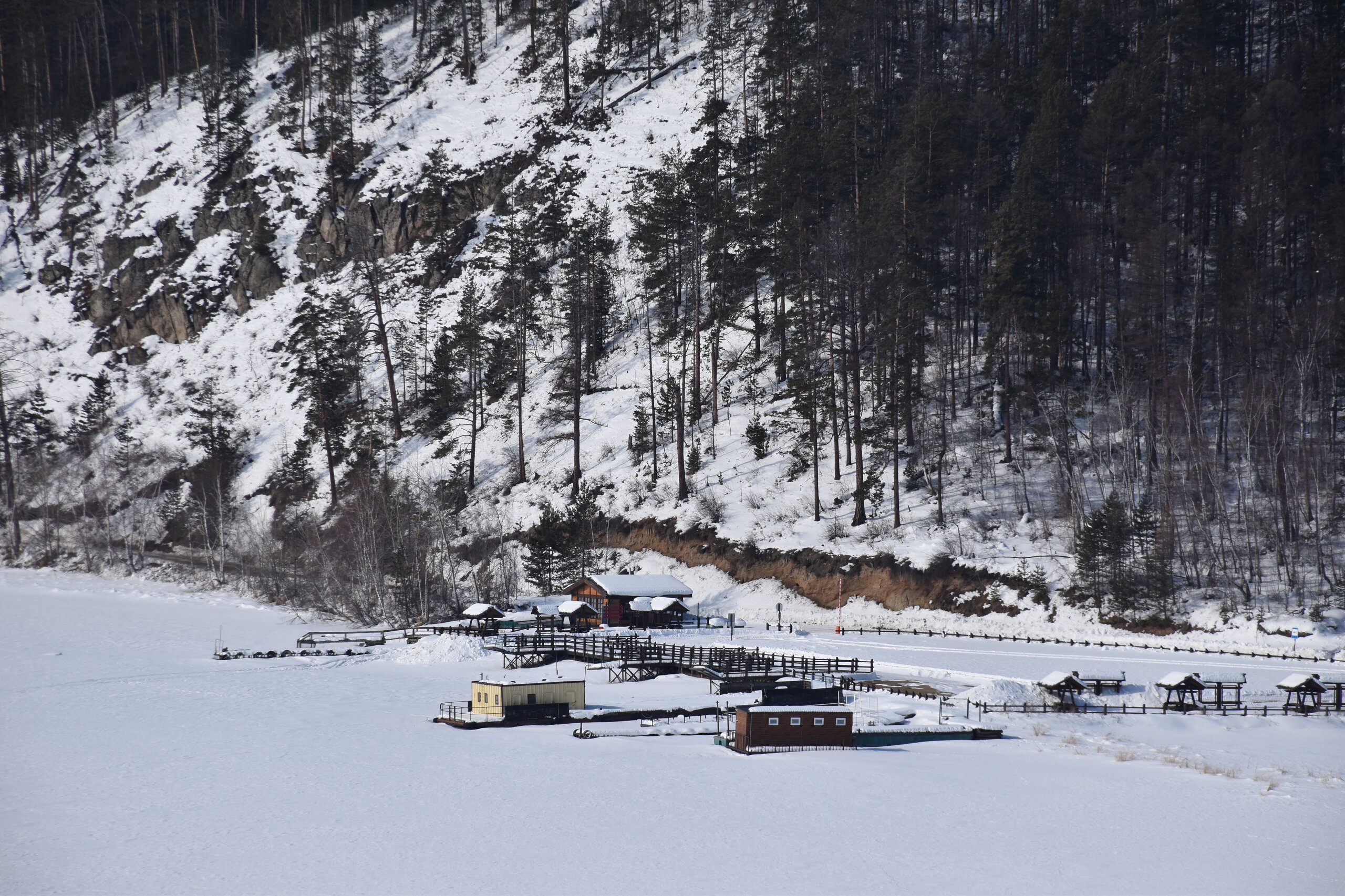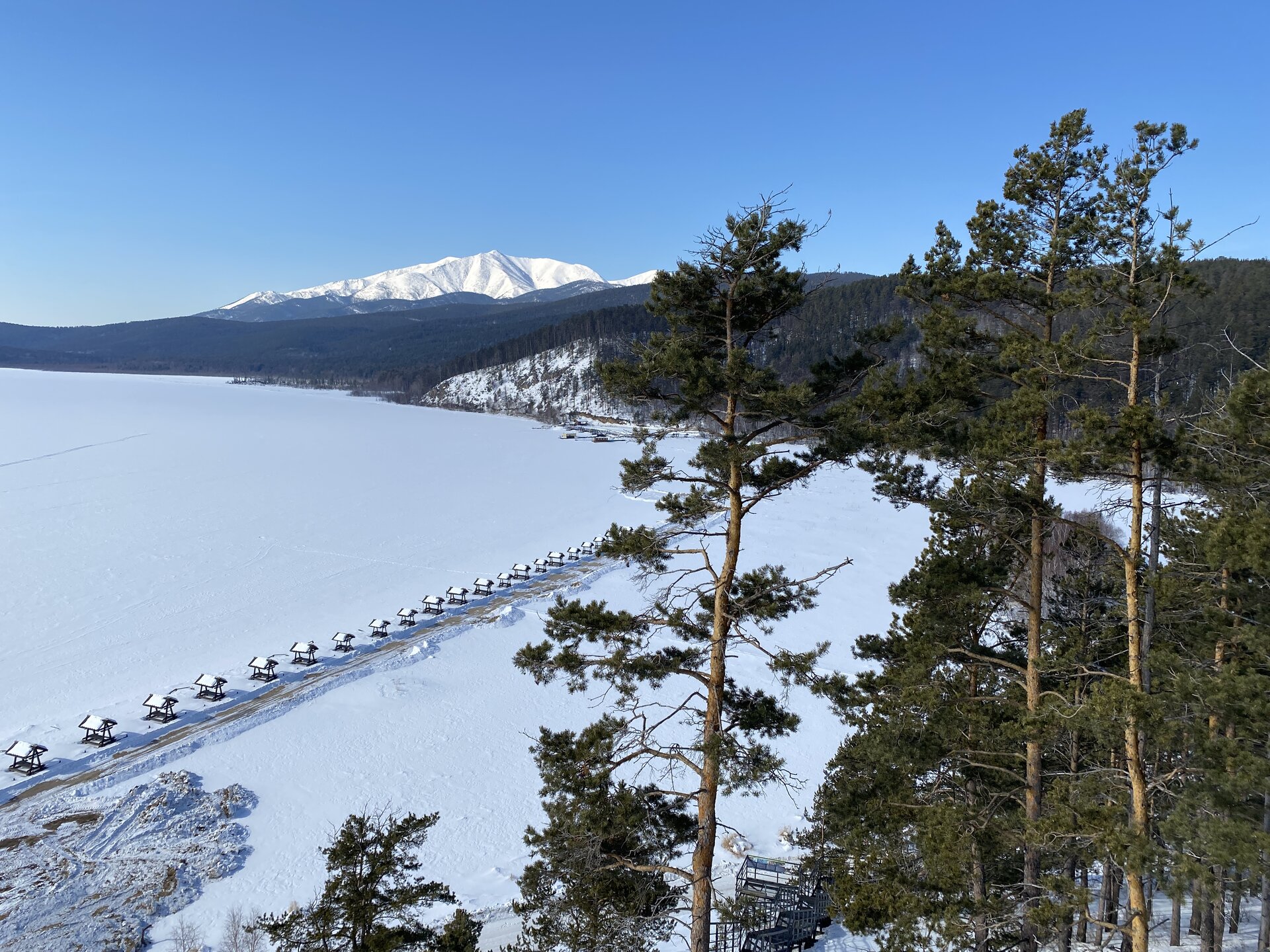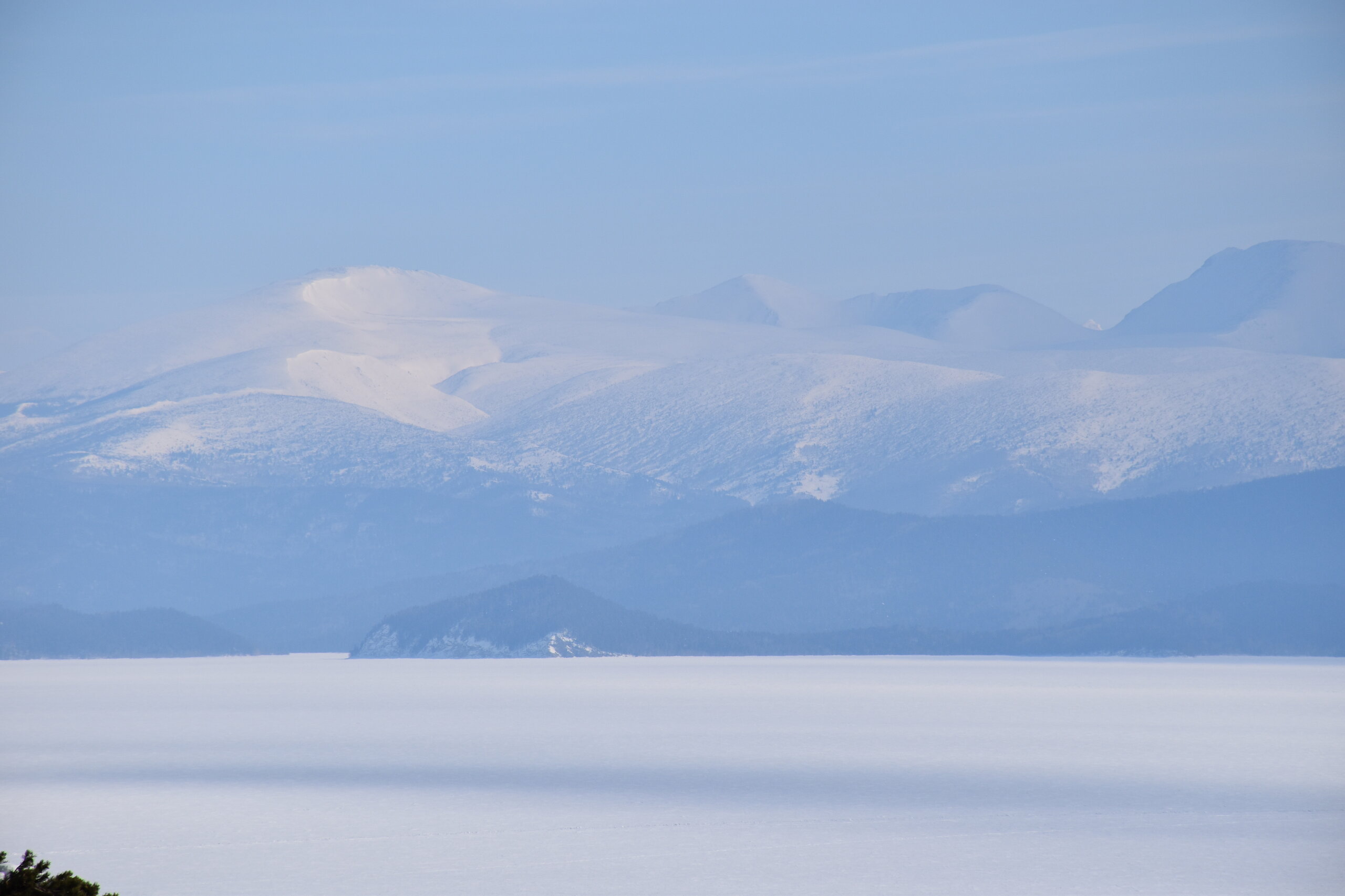 Удивительно, восточное побережье Байкала совершенно другое! Пару дней назад передо мной была зеркальная гладь льда с красивыми узорами, а сейчас – белое полотно озера и отовсюду видны горные цепи, вершины которых покрыты вечными снегами. А еще потрясающие сосны!