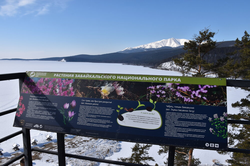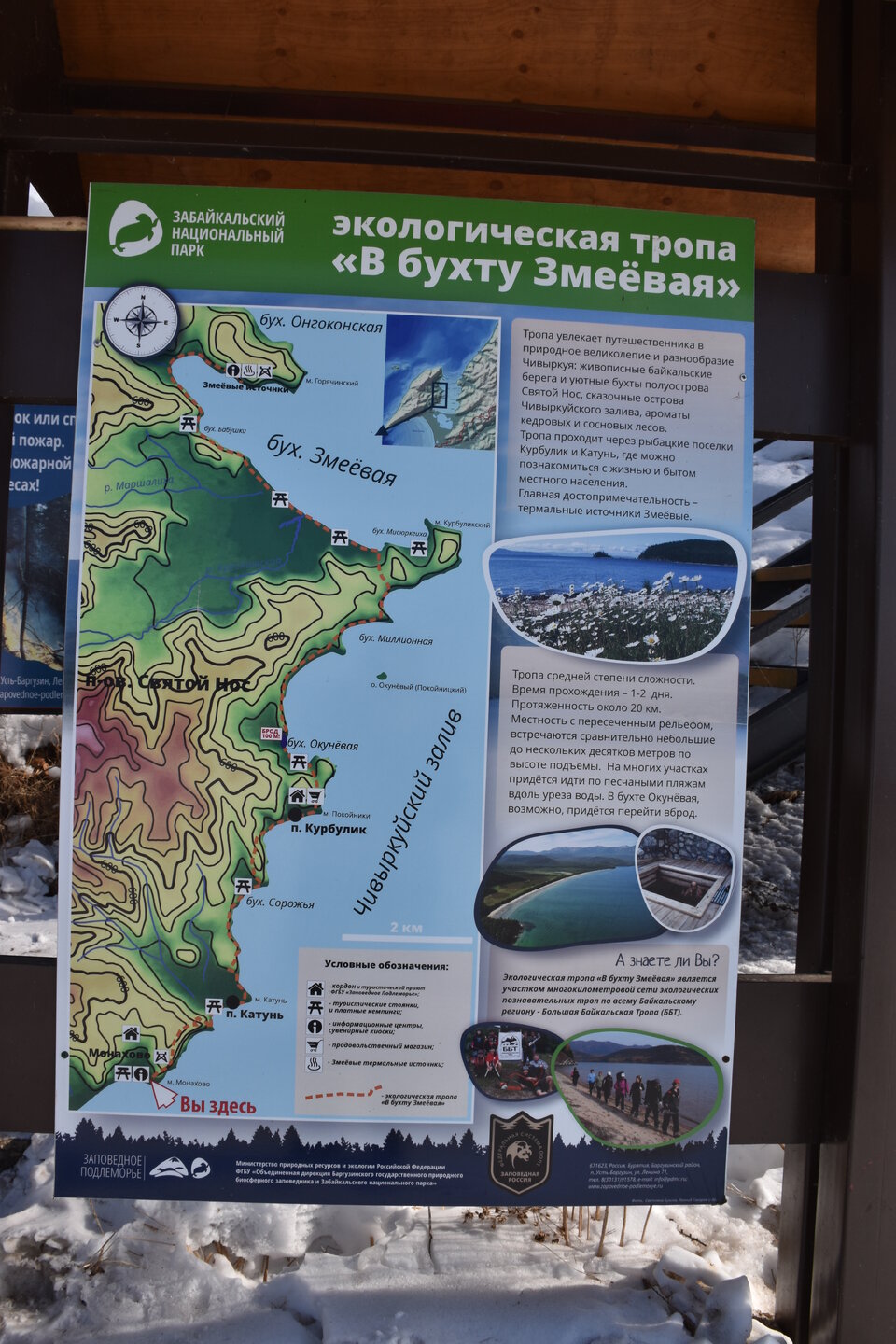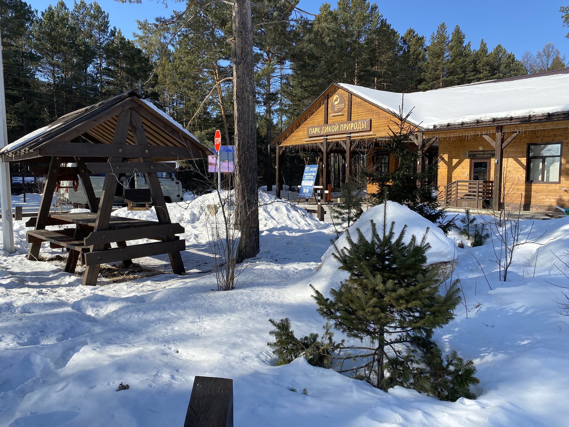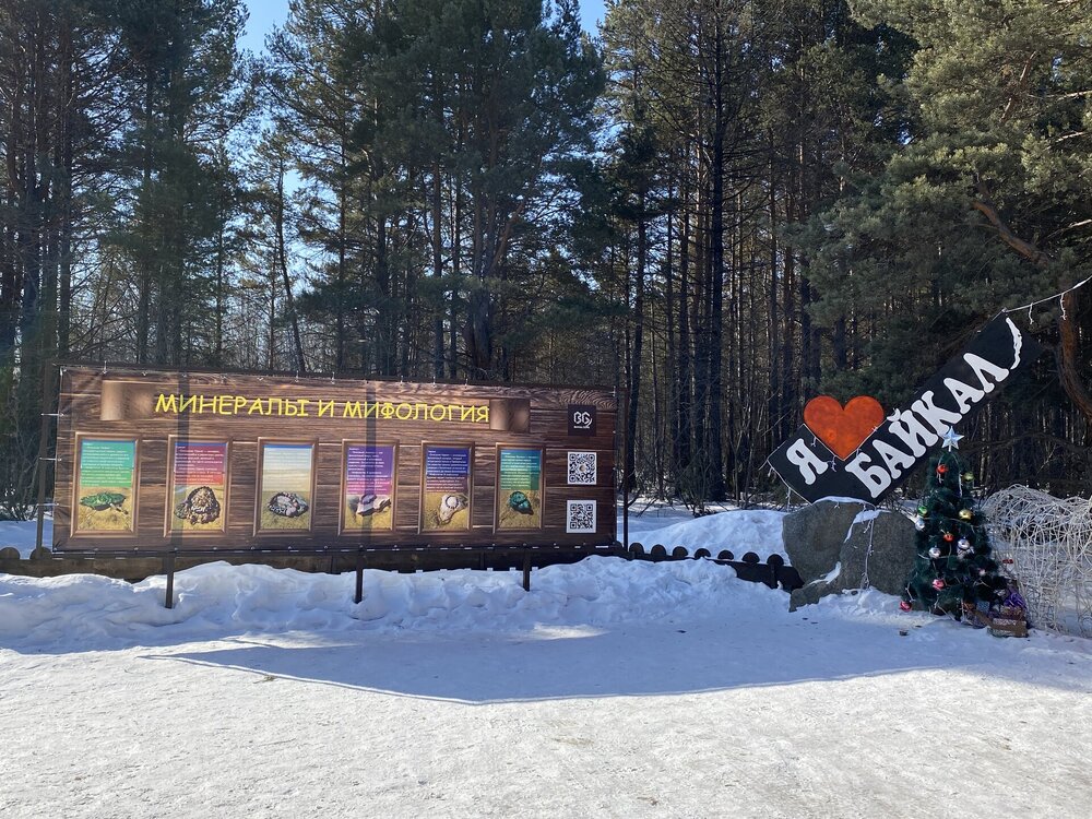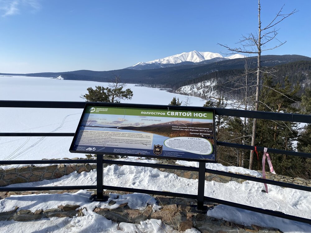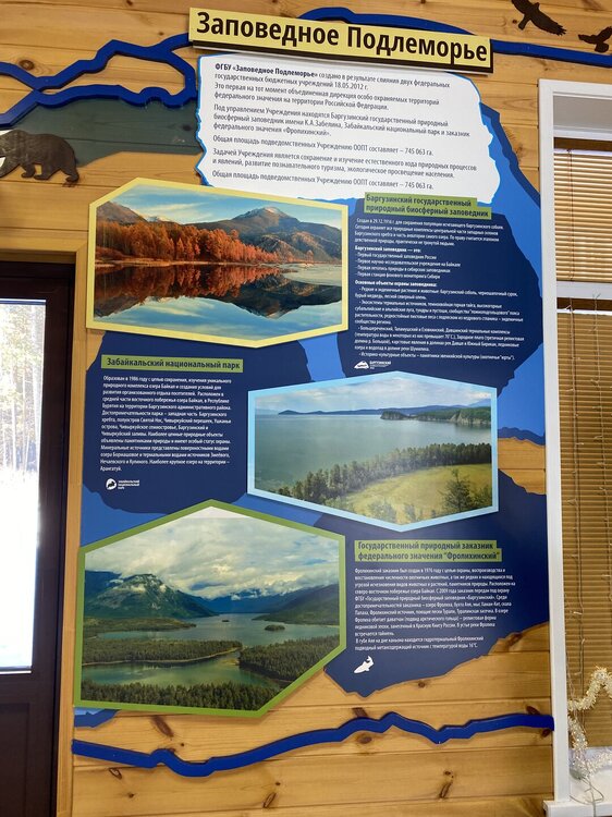 День 9. 17.03.2025 Первый день на восточном побережье Байкала – один из самых ярких и запоминающихся! Мы едем в Забайкальский национальный парк. Эта территория очень живописна, поэтому ее тщательно оберегают! В программе: полуостров Святой нос, Чивыркуйский залив, термальный источник Змеёвый. Активная часть тура: 6,7 км, продолжительность маршрута 7-8 часов. Едем снова на буханке. Забайкальский национальный парк. Территорией в миллион квадратных километров располагают такие крупные страны как Колумбия и Венесуэла. А в России такую площадь имеет относительно небольшая географическая единица, которую называют Забайкальем. Она имеет размеры 1000х1000 км и действительно находится за Байкалом. Забайкалье включает сразу три российских региона — Иркутскую область, Бурятию и Забайкальский край. С точки зрения физической географии всё это — Восточная Сибирь. Значительная часть территории Забайкалья представляет собой безбрежное море первозданной тайги, обрамляющее живописные горы. Населённые пункты здесь можно пересчитать по пальцам. Зато благодаря малолюдности прекрасно сохранилось всё многообразие фауны и флоры. К редким сёлам выходят непуганые медведи. В тайге можно повстречать даже тигра! Для охраны всей этой первозданной природной роскоши был создан Забайкальский национальный парк. Среди природных раритетов парка стоит отметить водопад на реке Шумилиха, три живописных горных озера, мыс Валукан, реку Южный Бирикан, Баргузинский залив, термальные источники в бухте Змеиной и многие-многие другие. В парке проложено несколько экологических троп — в бухту Змеиную, к лежбищу байкальской нерпы, к озеру Фролиха и другие. Для продвинутых туристов есть «Тропа испытаний» повышенной сложности. Пока Илья получает пропуска для посещения парка, мы заглянули в сувенирную лавку (я купила здесь небольшие книжки), посмотрели на входную группу в парк.