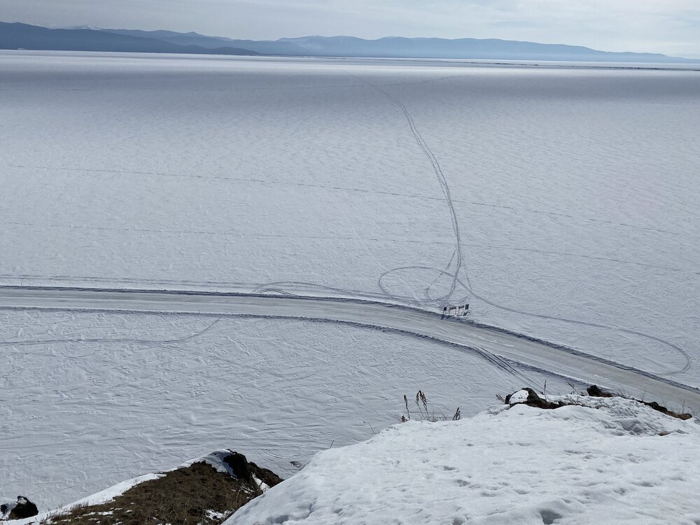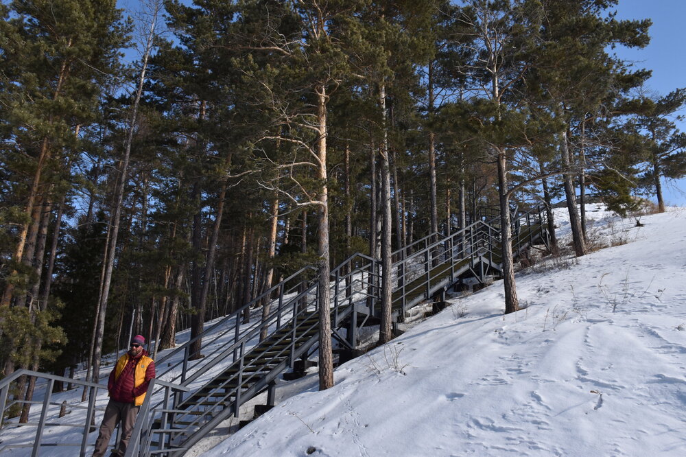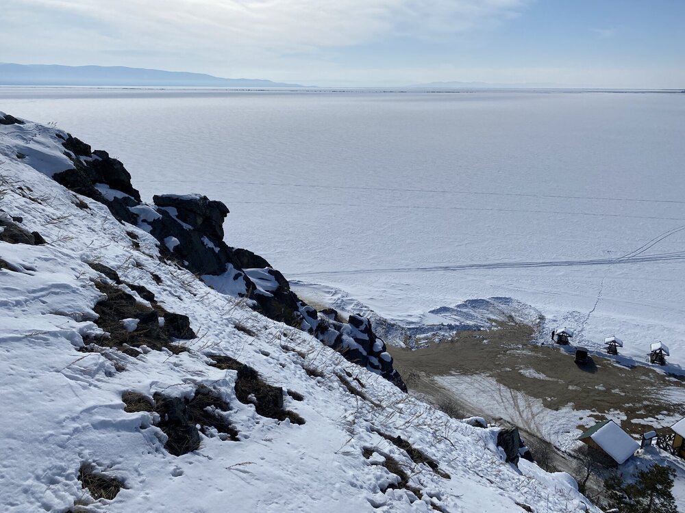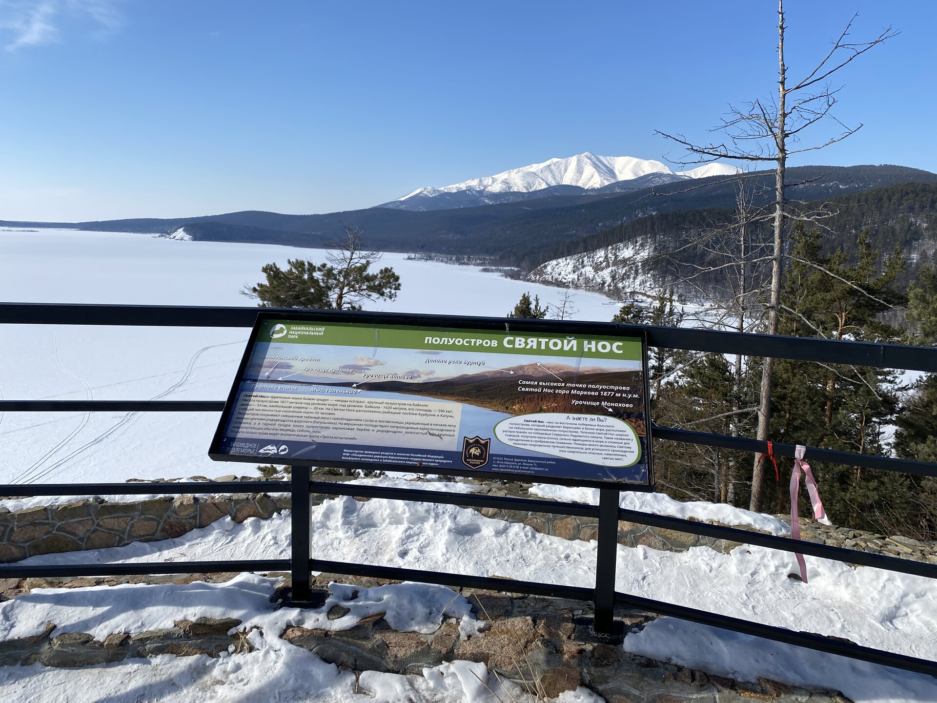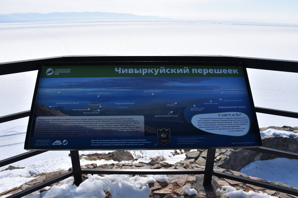 Полуостров Святой Нос по-другому называется «морда осетра». Наименование прижилось благодаря удивительной форме этого природного образования. Он разъединяет Баргузинский и Чивыркуйский залив. Площадь Святого Носа – около 600 квадратных километров, а длина – немного больше 50 км. Давным-давно географический объект был в статусе острова, но процессы выветривания и вымывания способствовали нанесению песчаной косы – Чивыркуйского перешейка, навсегда изменившего очертание Святого Носа. Спровоцировали появление косы реки Баргузин и Малый Чивыркуй. Ширина полуострова 20 км, и это в самой толстой его части. На территории Святого Носа есть населённый пункт Курбулик – крупнейший, но не единственный посёлок в данной локации. Также на полуострове имеется гора высотой 1878м. Её название – Маркова. Климатическая зона, к которой относится полуостров – высокогорная тундра. Святой Нос тянется параллельно Академическому хребту. По большей части это подводное образование нельзя увидеть, поскольку его скрывают волны Байкала, только иногда оно выступает над толщей воды в виде островов – представляете, насколько велико само озеро, если в нём легко прячется горная цепь! Посёлок Курбулик, расположенный на острове Святой Нос, состоит всего из четырёх улиц и живут в нём около 100 человек. Естественно основой местной экономики является туризм. Возле Курбулика отличные песчаные пляжи, в летний период притягивающие множество отдыхающих. Также большой популярностью пользуется зона отдыха поселок Катунь неподалеку от Курбулика. Другие места на побережье Байкала отличаются крупной галькой. Единственный минус полуострова – грунтовые и песчаные дороги, по которым очень трудно проехать после дождя. Перешеек Чивыркуйский разделяет два залива – одноимённый с косой и Баргузинский. Природа здесь тяготеет к региону высокогорной тундры, особенно в центре полуострова. С самой высокой точки Святого Носа видны знаменитые Ушканьи острова, на которых нежатся неповоротливые нерпы, а также неприступная стена Баргузинского хребта. Полуостров издавна считается средоточием мощнейшей энергетики, недаром местные шаманы неоднократно проводили здесь свои обряды, задабривая духов природы. Восхождение на Святой Нос – ответственное мероприятие. Тропа называется «дорога испытаний», а её протяжённость – 24 км. Начинается она от урочища Глинка, причем тропа часто петляет сквозь густой лес. Если вы увидели деревянный крест, значит, 2/3 пути уже пройдены. По дороге туристам встретится легендарный кедровый стланик, неоднократно упомянутый писателями, рассказывающими о быте заключённых сталинских лагерей. Из этого растения нередко варили зелье, которое считалось полезным и защищало от цинги, хотя доказательной базы по этому вопросу нет. Когда туристы, наконец, поднимаются на вершину каменного плато, то отсюда открывается великолепный вид на оба залива – Чивыркуйский и Баргузинский. Спуск к водам Байкала ещё более сложен, чем подъём на Святой Нос. Меня заинтересовал такой трек, но это возможно только летом. А у нас пока зима, да такая красивая и ослепительно белая!!! Следующая остановка у мыса Монахово, поднимаемся по лестнице на смотровую площадку.