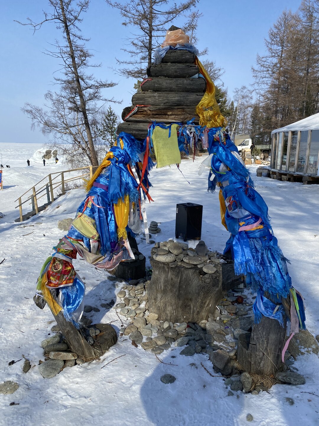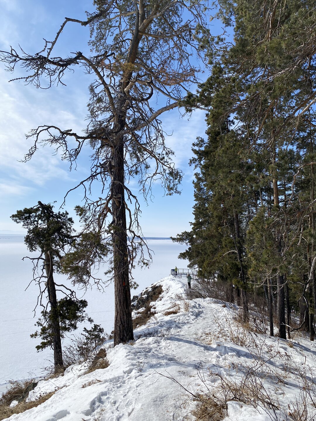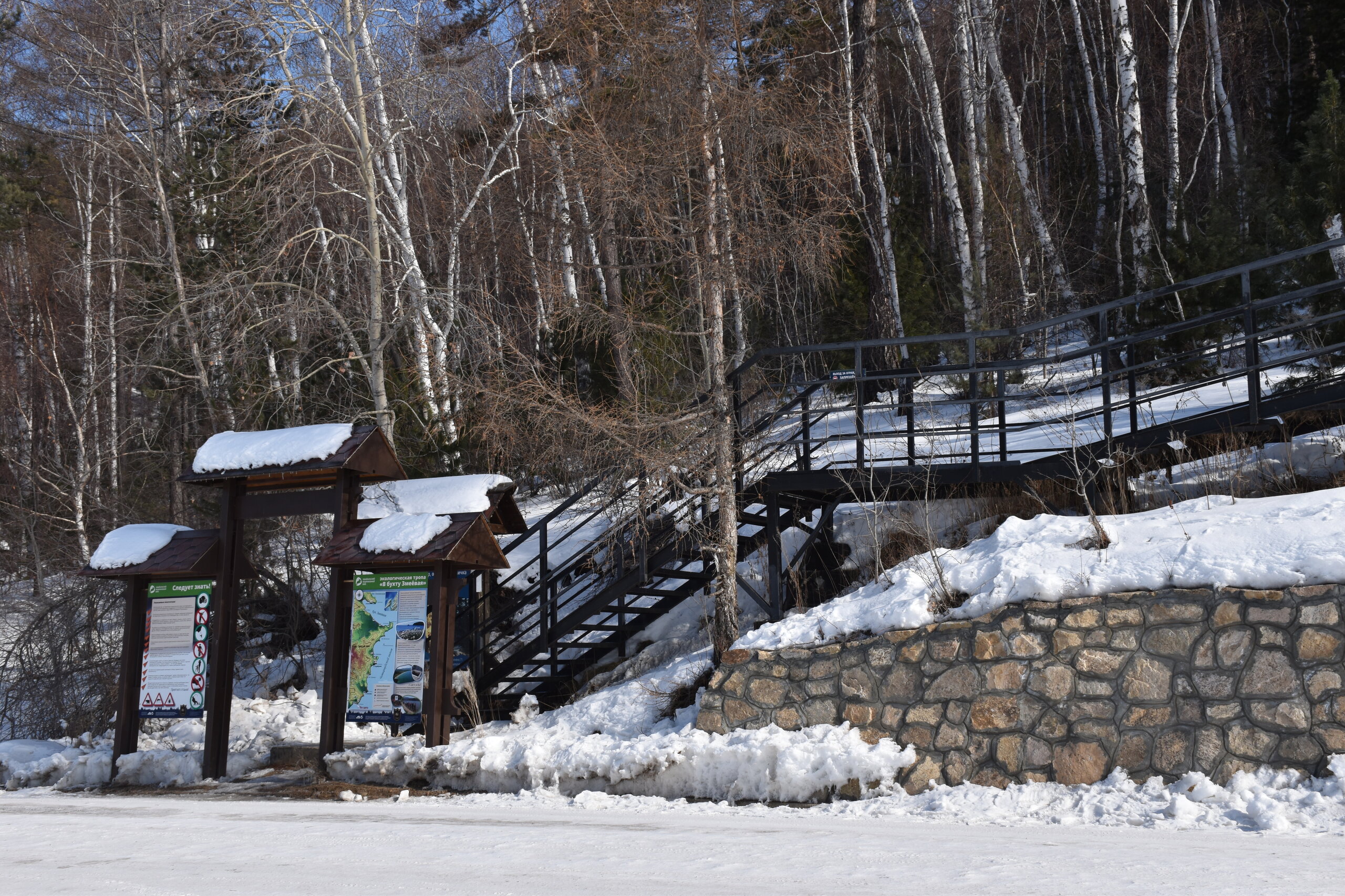 Полуостров Святой Нос по-другому называется «морда осетра». Наименование прижилось благодаря удивительной форме этого природного образования. Он разъединяет Баргузинский и Чивыркуйский залив. Площадь Святого Носа – около 600 квадратных километров, а длина – немного больше 50 км. Давным-давно географический объект был в статусе острова, но процессы выветривания и вымывания способствовали нанесению песчаной косы – Чивыркуйского перешейка, навсегда изменившего очертание Святого Носа. Спровоцировали появление косы реки Баргузин и Малый Чивыркуй. Ширина полуострова 20 км, и это в самой толстой его части. На территории Святого Носа есть населённый пункт Курбулик – крупнейший, но не единственный посёлок в данной локации. Также на полуострове имеется гора высотой 1878м. Её название – Маркова. Климатическая зона, к которой относится полуостров – высокогорная тундра. Святой Нос тянется параллельно Академическому хребту. По большей части это подводное образование нельзя увидеть, поскольку его скрывают волны Байкала, только иногда оно выступает над толщей воды в виде островов – представляете, насколько велико само озеро, если в нём легко прячется горная цепь! Посёлок Курбулик, расположенный на острове Святой Нос, состоит всего из четырёх улиц и живут в нём около 100 человек. Естественно основой местной экономики является туризм. Возле Курбулика отличные песчаные пляжи, в летний период притягивающие множество отдыхающих. Также большой популярностью пользуется зона отдыха поселок Катунь неподалеку от Курбулика. Другие места на побережье Байкала отличаются крупной галькой. Единственный минус полуострова – грунтовые и песчаные дороги, по которым очень трудно проехать после дождя. Перешеек Чивыркуйский разделяет два залива – одноимённый с косой и Баргузинский. Природа здесь тяготеет к региону высокогорной тундры, особенно в центре полуострова. С самой высокой точки Святого Носа видны знаменитые Ушканьи острова, на которых нежатся неповоротливые нерпы, а также неприступная стена Баргузинского хребта. Полуостров издавна считается средоточием мощнейшей энергетики, недаром местные шаманы неоднократно проводили здесь свои обряды, задабривая духов природы. Восхождение на Святой Нос – ответственное мероприятие. Тропа называется «дорога испытаний», а её протяжённость – 24 км. Начинается она от урочища Глинка, причем тропа часто петляет сквозь густой лес. Если вы увидели деревянный крест, значит, 2/3 пути уже пройдены. По дороге туристам встретится легендарный кедровый стланик, неоднократно упомянутый писателями, рассказывающими о быте заключённых сталинских лагерей. Из этого растения нередко варили зелье, которое считалось полезным и защищало от цинги, хотя доказательной базы по этому вопросу нет. Когда туристы, наконец, поднимаются на вершину каменного плато, то отсюда открывается великолепный вид на оба залива – Чивыркуйский и Баргузинский. Спуск к водам Байкала ещё более сложен, чем подъём на Святой Нос. Меня заинтересовал такой трек, но это возможно только летом. А у нас пока зима, да такая красивая и ослепительно белая!!! Следующая остановка у мыса Монахово, поднимаемся по лестнице на смотровую площадку.