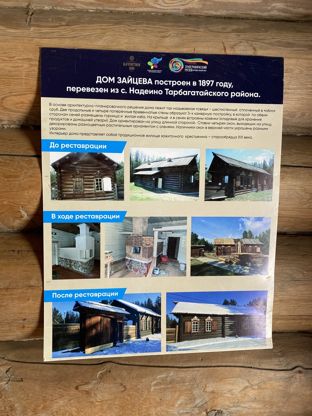 Жилой дом зажиточного крестьянина М.Л. Зайцева – «связь» – трехкамерное жилище, состоящее из горницы и жилой избы, разделенной холодными сенями. Горница считалась парадной частью дома, здесь принимали гостей, совершали религиозные обряды. Жилая изба внутри условно делилась на три части: передний угол, печь и запечье. В переднем (красном) углу стоял стол, над ним помещалась божница. Вдоль стен стояли широкие деревянные лавки, недалеко от входа расписная кровать, под потолком устраивали полати. Широкая глинобитная, реже кирпичная, русская печь являлась главной частью интерьера горницы и избы. Много места в доме занимают предметы домашнего женского ремесла – ткацкие станки для изготовления грубого холста и поясов, гребни, чесалки, прялки. Никольская церковь перевезена в 1971 году из с. Никольск Мухоршибирского района Бурятии по решению схода села. Это единственная сохранившаяся бревенчатая церковь, срубленная в начале XX века, а также единственное хорошо сохранившееся до наших дней в Республике Бурятия деревянное старообрядческое культовое сооружение. Церковь была построена в 1910 году бригадой плотников из центральной губернии России. Церковь строили всем миром: каждая семья отдавала на постройку храма средства. Каждой семье было необходимо отдать 12 рублей на строительство церкви, а также 15 рублей на приобретение церковной утвари. С каждого двора было решено привезти по два бревна для строительства церкви, а также было написано послание в г. Вехнеудинск с просьбой предоставить бригаду специалистов для постройки. Иконописцы, прибывшие из Иркутска, делали роспись внутри храма и использовали для красок природный материал. А иконостас и иконы были заказаны в селе Палех Ивановской области. Иконописцы из Палеха славились своими династиями, секреты мастерства сохраняли и передавали из поколения в поколение. Палехскими иконами восхищались многие известные писатели Николай Некрасов, Антон Чехов, Николай Лесков и другие. Известно, что для написания икон также приглашались иконописцы из Москвы, так как заказ был крупным.