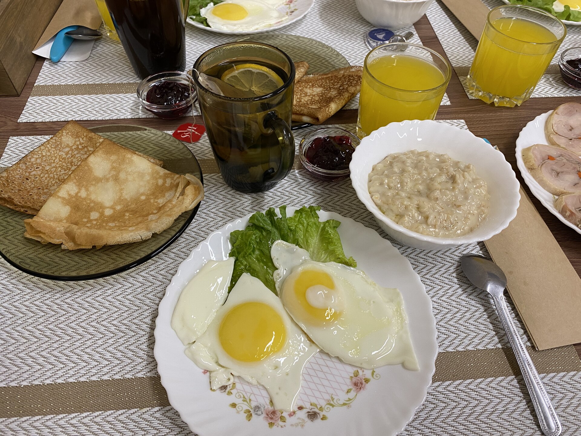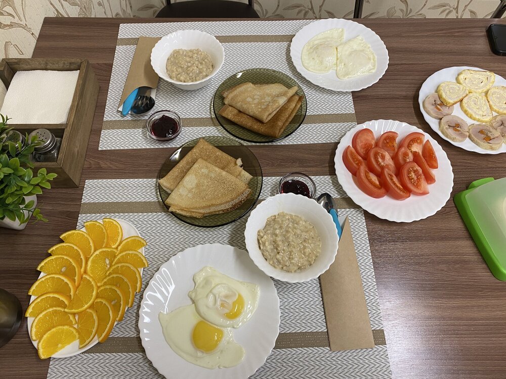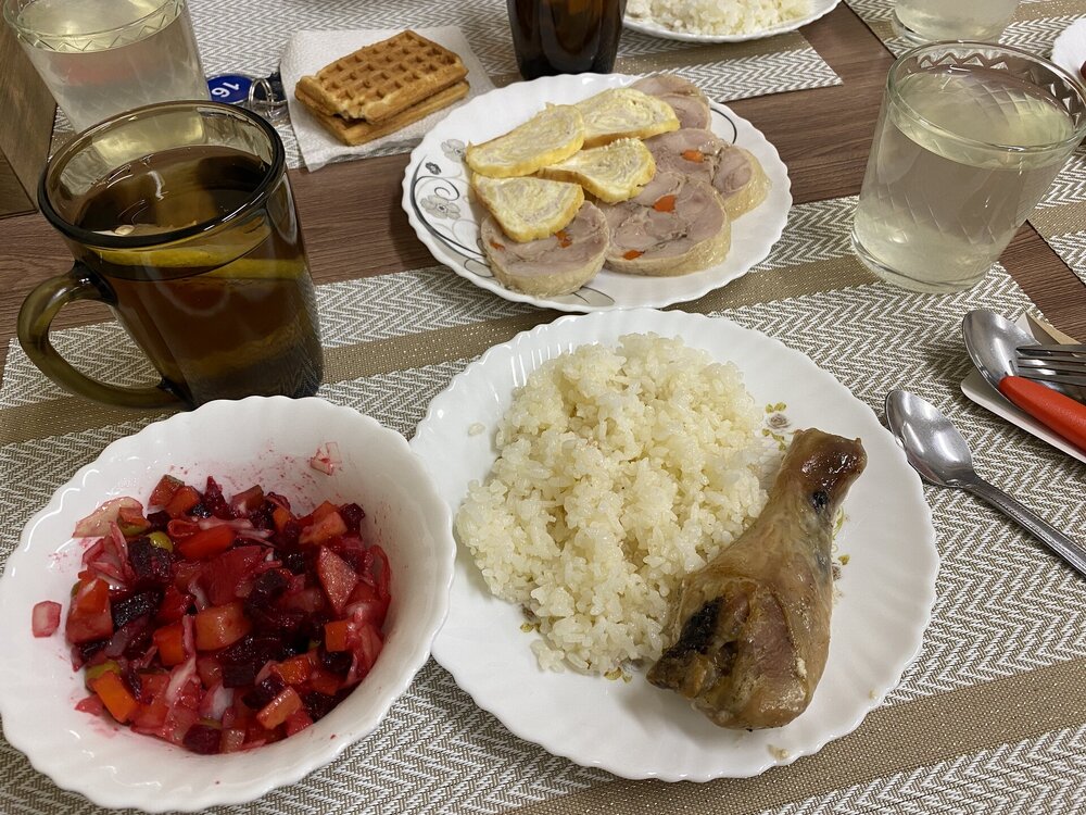 Наша столовая и завтраки, ужины. Кормили вкусно, разнообразно. Закуски, которые не съедали за ужином, нам на следующий день ставили на стол. Омуля мы заказывали за доп.деньги (сагудай и холодного копчения). В день выезда мы еще взяли обед (500 руб.). Нам сварили суп, нарезали наши запасы с обедов-перекусов (колбаса, сало, сладости к чаю), что-то из остатков ужина.