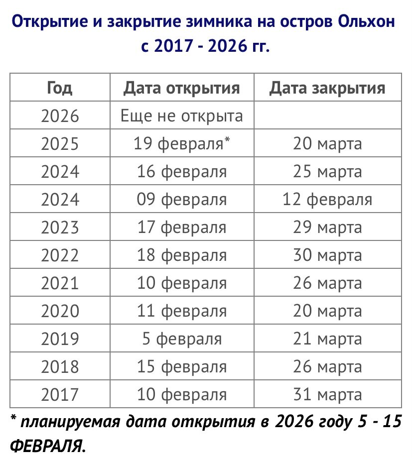 Лучшее время для поездки на зимний Байкал Чтобы увидеть лед Байкала во всем великолепии, планировать путешествие нужно с февраля до конца марта, когда на озере устанавливается прочный лёд. В это время, как правило, функционируют ледовые переправы и зимники, поэтому добраться до основных достопримечательностей можно быстро и в сопровождении невероятных видов. К тому же в высокий сезон можно увидеть сразу несколько разновидностей байкальского льда и попробовать практически все зимние развлечения. Ещё один плюс поездки в феврале или марте — комфортная погода. В феврале температура воздуха в среднем колеблется от −10 до −14°C, но в первой половине месяца ещё довольно ветрено. А вот в марте воздух прогревается до комфортной отметки в −3°C, уже пригревает весеннее солнышко, а лёд всё ещё остаётся достаточно крепким для различных активностей. Конец зимы и начало весны – это лучшее время для путешествий по Байкалу. В этот период погода становится благоприятной, солнце светит ярче и стихают ветра. Главная зимняя достопримечательность Байкала – это его лёд! В 2025 году на Байкале была очень теплая зима, да и лето 2024 года было необычно теплым. Весь январь «интернетовские эксперты» спорили: замерзнет лед на Байкале в 2025 году или нет, будет ли ледовый сезон или пора сдавать билеты. И знаете, реально многие не поехали на Байкал поверив таким статейкам. Я выбрала для поездки март (если быть точным, то это 8-22 марта 2025), хотелось более теплой погоды и больше солнца. В предыдущие годы февраль был достаточно морозным, я же теплолюбивая. Но в этом году и февраль был комфортным для прогулок по льду. Также стоит учесть, что в марте световой день становится более длинным и можно успеть больше увидеть. Многие недооценивают продолжительность светлого времени суток, и очень зря. Ведь в феврале солнце встаёт в девять утра, а садится в четыре дня или даже чуть раньше. И когда ты хочешь увидеть все запланированные места, этого времени очень и очень мало. Байкал замерзает лишь к концу зимы, в начале февраля. А иногда и только к концу месяца. Только когда ледовый покров наберет толщину больше 70 сантиметров, МЧС и ГИБДД открывают ледовые дороги: после этого по замерзшему озеру можно ездить на транспорте. Только с этого момента по Байкалу начинают сновать сотни «Хивусов» и «Буханок» с туристами, которые приехали увидеть обледеневшие гроты, пузырьки на льду и скалу Шаманку в снегу. Ледовая переправа на Ольхон - важное событие байкальской зимы. Ежегодно она организуется в одном и том же месте от Куркутской бухты до Иркутской губы. Точные даты открытия и закрытия определяют исходя из состояния льда, его толщины и температуры воздуха. Работы по обустройству ледовой дороги на остров Ольхон начинают проводить, как только лед набирает необходимую мощность. Это конец января — начало февраля. Дорога включает две полосы для движения. Расстояние между полосами составляет около 100 метров. Перед открытием зимника комиссия в составе сотрудников ДЭП, ГИМС, ГИБДД и администрации Ольхонского района обследуют участок ледового покрова, производят необходимые замеры, устанавливают вешки, дорожные знаки и аварийно-спасательный инвентарь. После всех необходимых мероприятий дорога подготовлена к эксплуатации. Спасатели советуют не выезжать за пределы разметки из-за трещин, пропа