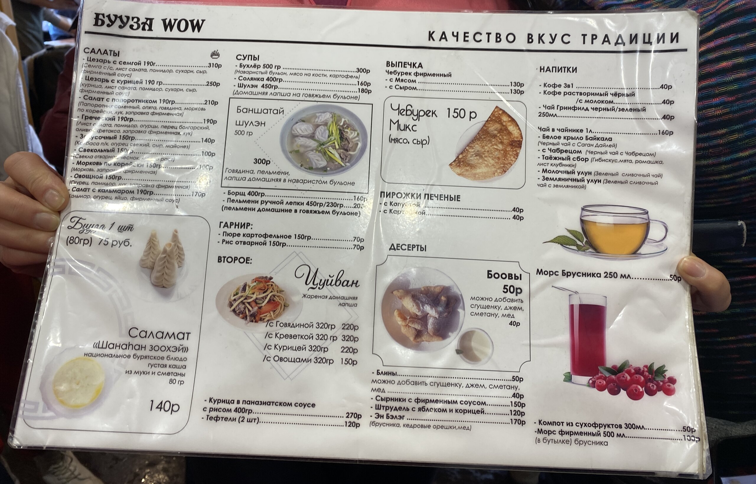 День 1. 09.03.2025 В Иркутск я прилетела прямым рейсом из Уфы накануне тура 8 марта 2025г. Рейс у нас дневной, лететь 4 часа 20 минут (меньше чем из Москвы), плюс 3 часа смены часового пояса, так что можно считать, что прибыла я уже 9 марта. Забронировала отель «Воздушная гавань» (г. Иркутск, ул.Ширямова, 6) рядом с аэропортом, идти пешком около 5 минут. Заселилась в 23.15, перекусила в номере и легла спать. В отеле имеется круглосуточный ресторан «Курица или рыба». Меню неплохое, но полноценно ужинать ночью мне не хотелось. Отель мне понравился, номер со всем необходимым, утром хороший завтрак (шведский стол) с 06.00 до 10.00. Аэропорт в Иркутске находится на окраине города, рядом несколько отелей и жилые дома. Кстати, здесь сверяют бирки от багажа у всех! Давно такого не видела. Вид из окна: Мой ужин, отметила начало отпуска) Встреча с гидом и группой у аэропорта в 11:00 по местному времени (МСК+5). Я прекрасно выспалась, вкусно позавтракала, довезла свой чемодан до места встречи. Все собрались – 8 девчонок и наш гид-инструктор Илья. Сегодня у нас в программе переезд на микроавтобусе в село Сахюрта (около 4-5 часов), обед по дороге, заселение в отель в селе Сахюрта и небольшая прогулка – знакомство с Байкалом! Обед в кафе "Бууза Wow" (д. Люры, ул. Горького, 20А). Это популярное место по дороге на Ольхон, народу много, заказы принимают быстро и также быстро все разносят по столикам. Я заказала бузы (3 шт.) со сметаной, морс брусничный и десерт Эн Балэг (замороженная брусника, мед и кедровые орешки). Чек – 485 руб. Недорого и очень вкусно! Как показала дальнейшая история, это были самые вкусные бузы на Байкале. Можно было взять и 5 штук! Из Иркутска мы выехали в снежную погоду, часть пути был буран, кругом много снега, по ближе к Ольхону снега почти нет. В Сахюрте днем тоже шел снег, но через день местный ветер Сарма выдул его со льда залива, так что увидеть всю красоту Байкальского льда мы смогли.