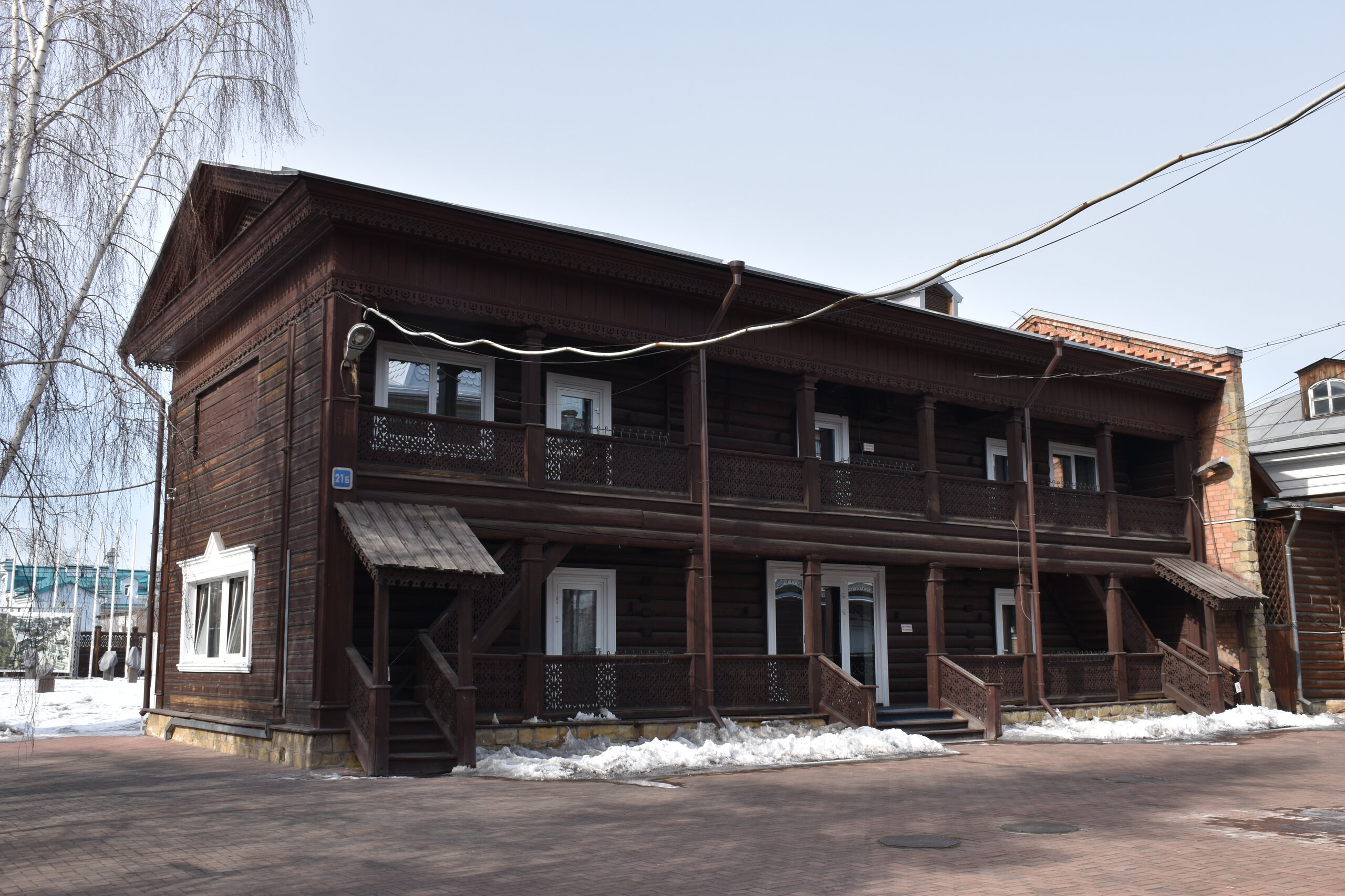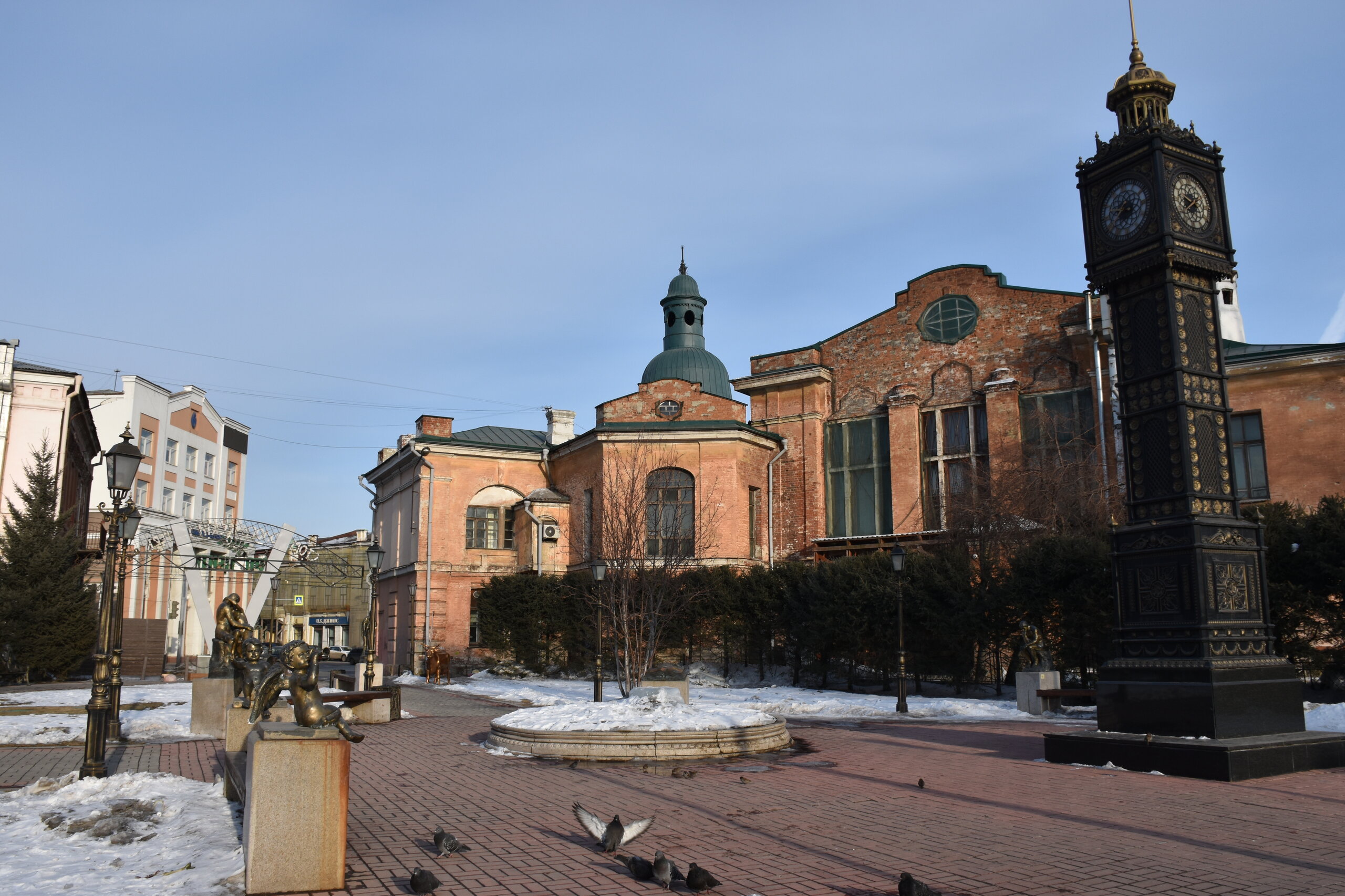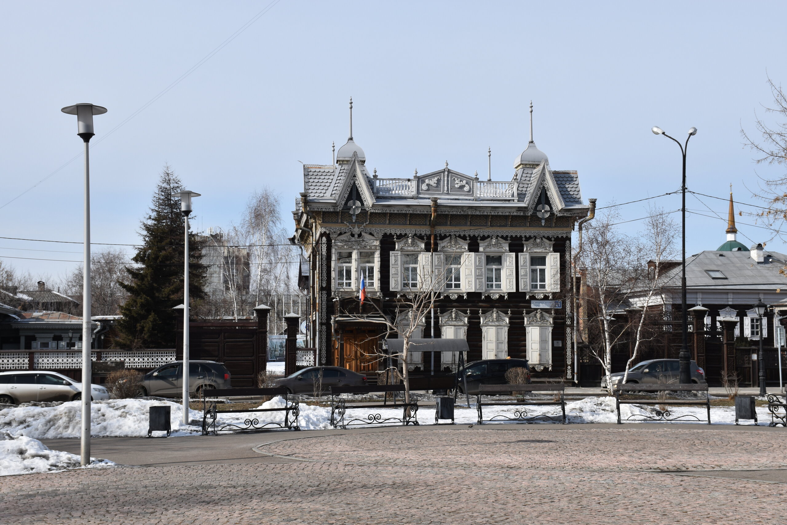 Иду по улице Декабрьских событий. Следующая остановка у Купеческого сквера. Здесь целый комплекс красивых деревянных домов, а также офис Инфоцентра. В одном из домиков я набрала кучу макулатуры) Купеческий сквер — сквер в Иркутске, расположенный на пересечении улиц Декабрьских Событий и Фридриха Энгельса, напротив Дома Европы. Современная благоустроенная территория. Дом купцов Шастиных (ул. Фридриха Энгельса, 21) - также известен под названием «кружевной дом». Построен в XIX веке в стиле русского барокко. Большая часть украшений дома появилась в 1907 году, когда владельцем дома стал купец Шастов. Кровля дома имеет сложные очертания с башенками, фасад украшен декоративными фигурами и резными деревянными столбиками. Оконные наличники имеют уникальную рельефную «кружевную» резьбу и изящный орнамент. В период советской власти уход за домом не осуществлялся, и он утратил свой нарядный внешний вид, однако в 1997 году было принято решение отреставрировать здание. Задача была трудной — необходимо было сохранить уникальность резных наличников и фасадных узоров. Сегодня усадьба представляет собой архитектурный комплекс, который позволяет зрительно воссоздать облик Иркутска 18-19 столетий.