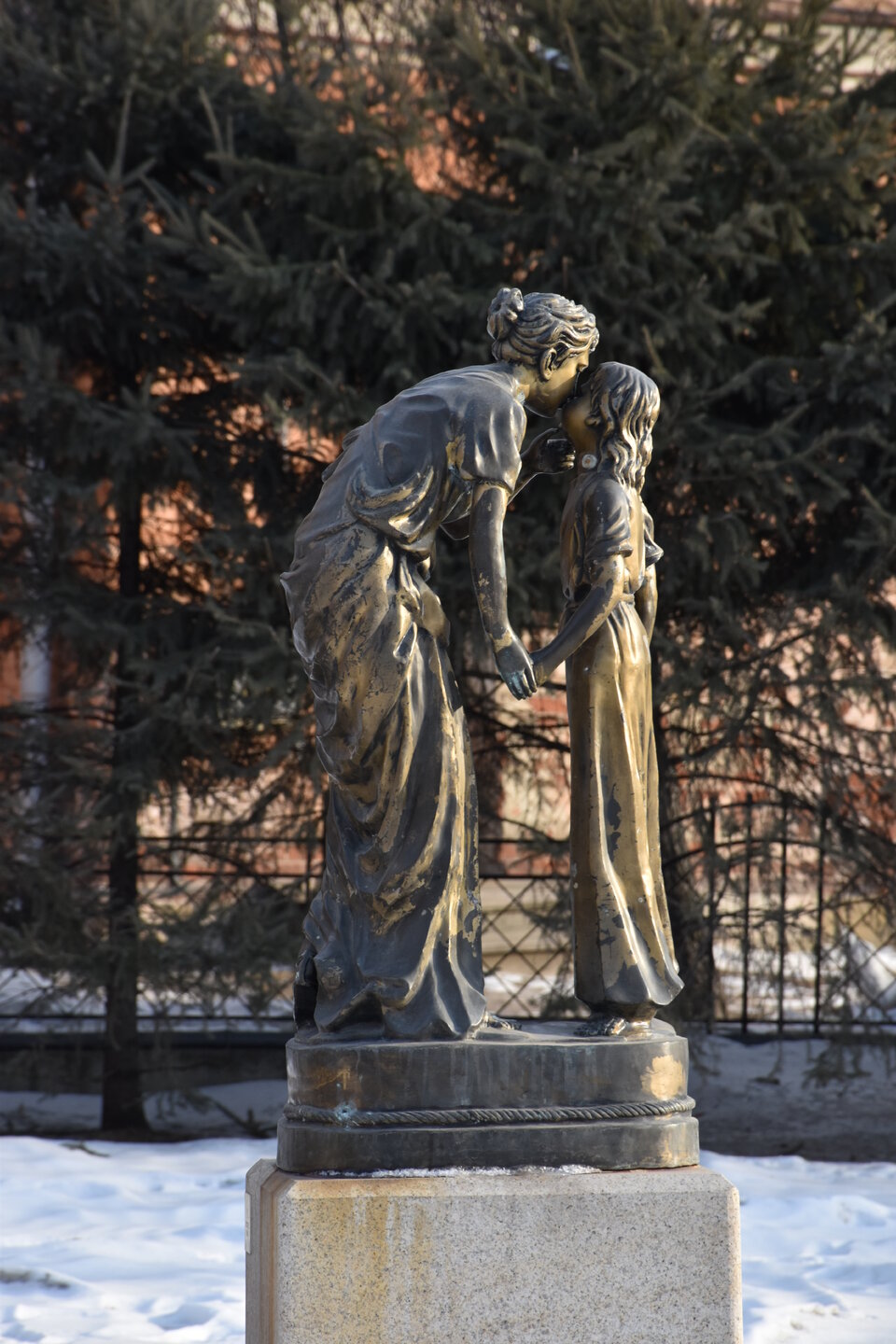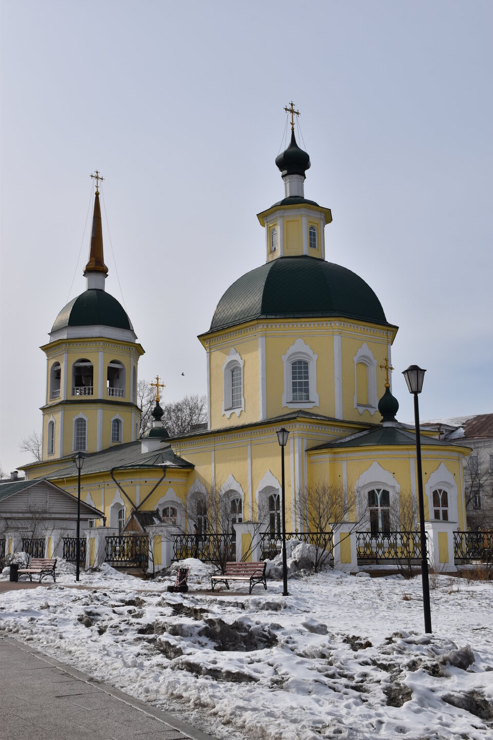 Этот Архитектурный комплекс мне очень понравился. Особенно впечатлили ажурные окна деревянных домов! Далее я отправилась к усадьбе Волконских. За перекрестком с улицей Тимирязева находится сквер Волконских, где стоит «Памятник женам декабристов». Это памятник всем русским женщинам, приехавшим в Сибирь вслед за мужьями, высланными после восстания на Сенатской площади. Скульптура изображает княгиню Марию Николаевну Волконскую — жену декабриста Сергея Григорьевича Волконского. Памятник установили к 350-летию Иркутска. Скульптор Михаил Переяславец, архитектор Юрий Волчек. Слева — тропинка, ведущая к Дому-музею Волконских. Преображенская церковь (пер. Волконского, 1). Заложена в 1795 году на средства иркутских купцов Стефана Игнатьева и Ивана Сухих. Предполагается, что проект церкви был выполнен иркутским архитектором Антоном Лосевым. 6 августа 1811 года был освящён главный храм. В 1848–1849 годах на средства иркутского почётного гражданина статского советника Ефимия Кузнецова вокруг церкви была возведена каменная ограда с чугунными решётками, деревянная крыша заменена на металлическую. С 1846 по 1855 год в приходе церкви жила семья декабриста С. Г. Волконского.